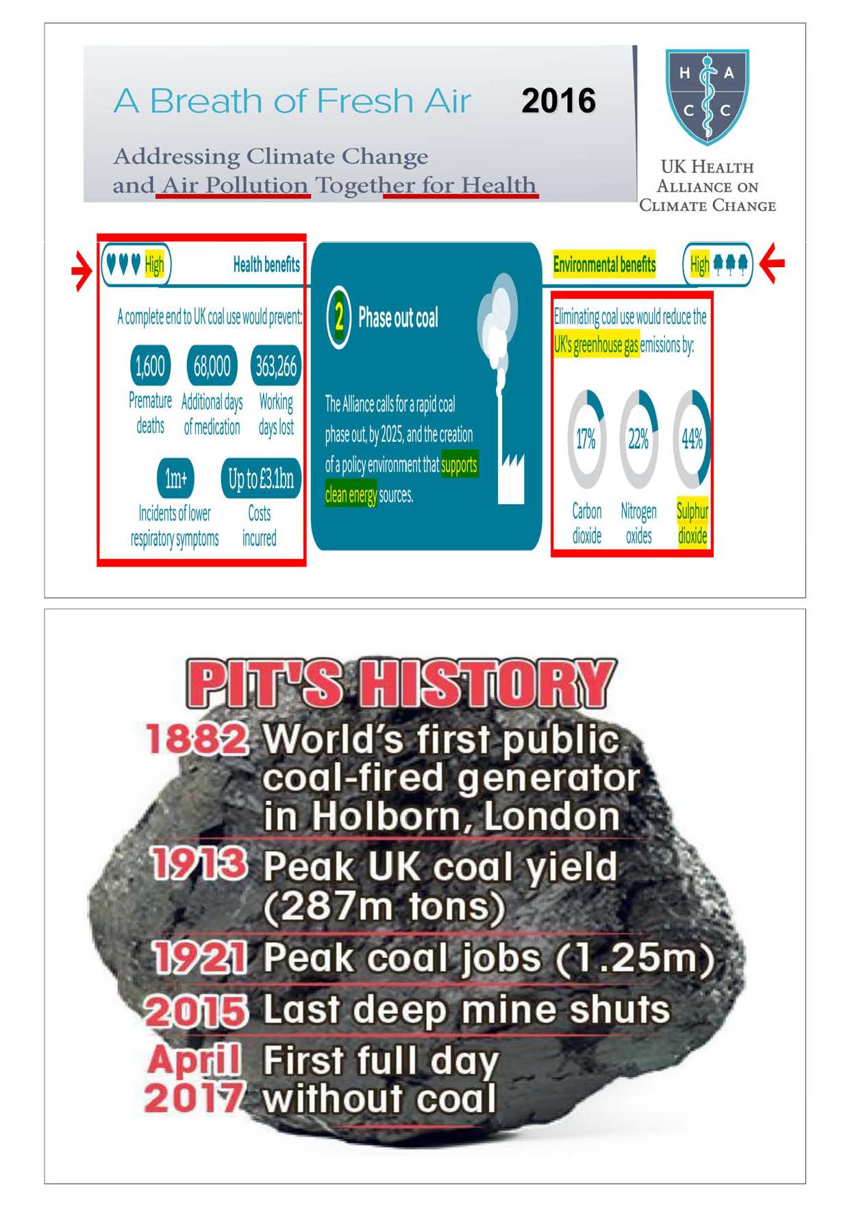 他們用三顆星、三棵樹表示對健康和環境的影響,只有把燃煤拿掉才能達到滿顆星、滿顆樹的最佳狀態,因為這個問題對環境和健康的影響最大,我這些話是說給經濟部聽的,但是你們聽得懂嗎?另外,衛福部也要注意,請看下一張簡報,英國是全世界第一個燃煤的國家,當時帶動了工業革命,但是他們已經規劃要在2017年達到全國無煤,現在他們的燃煤量已經降到很低了。