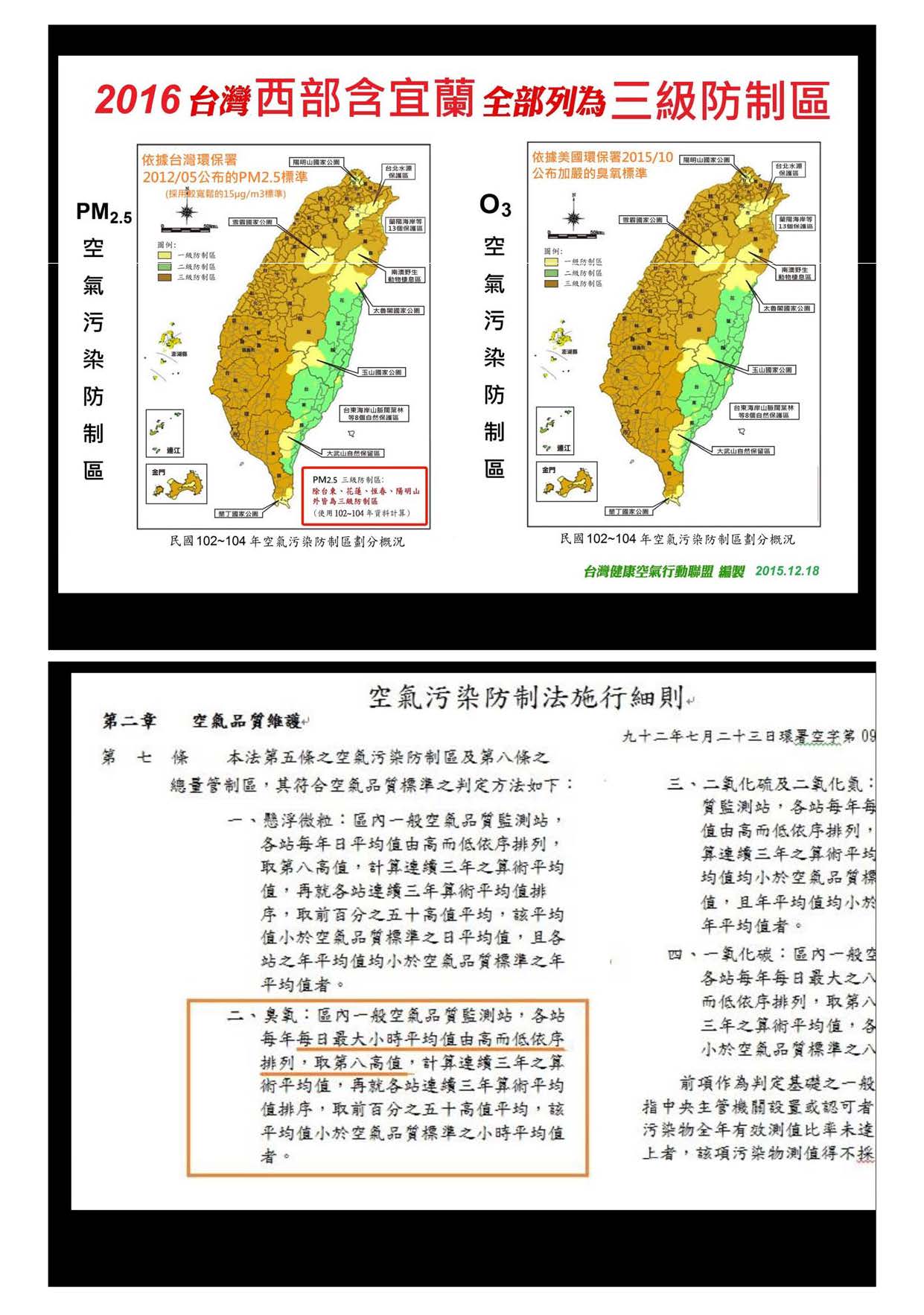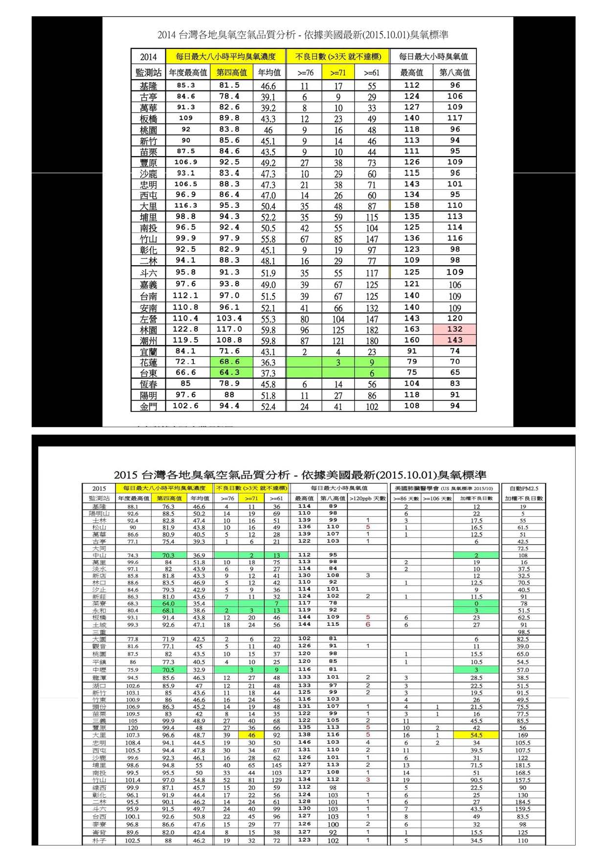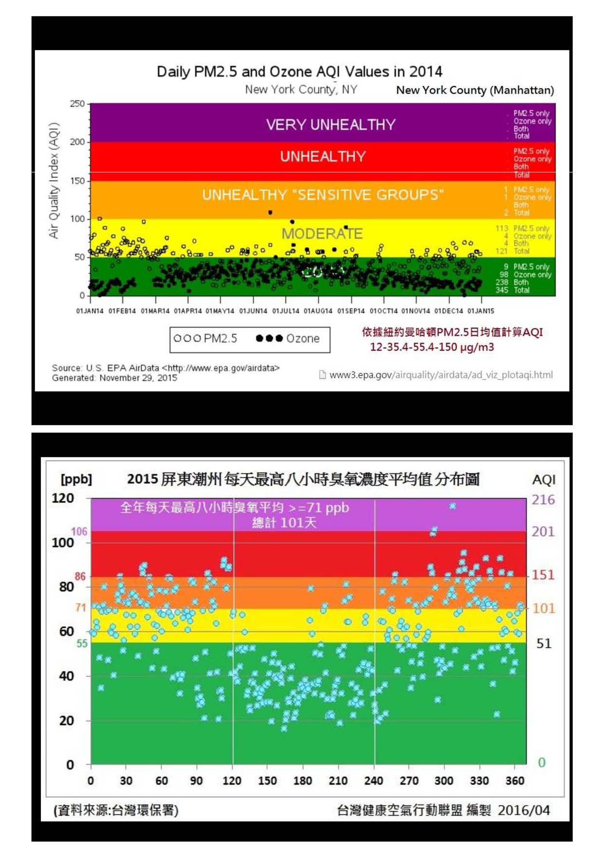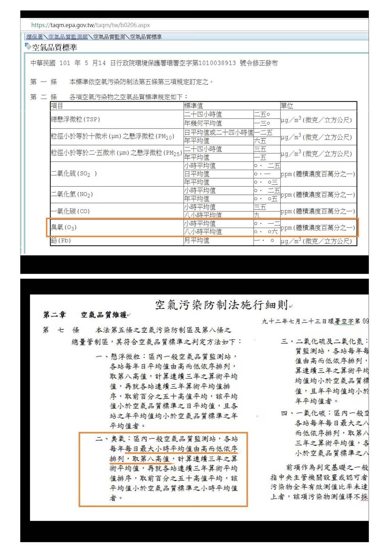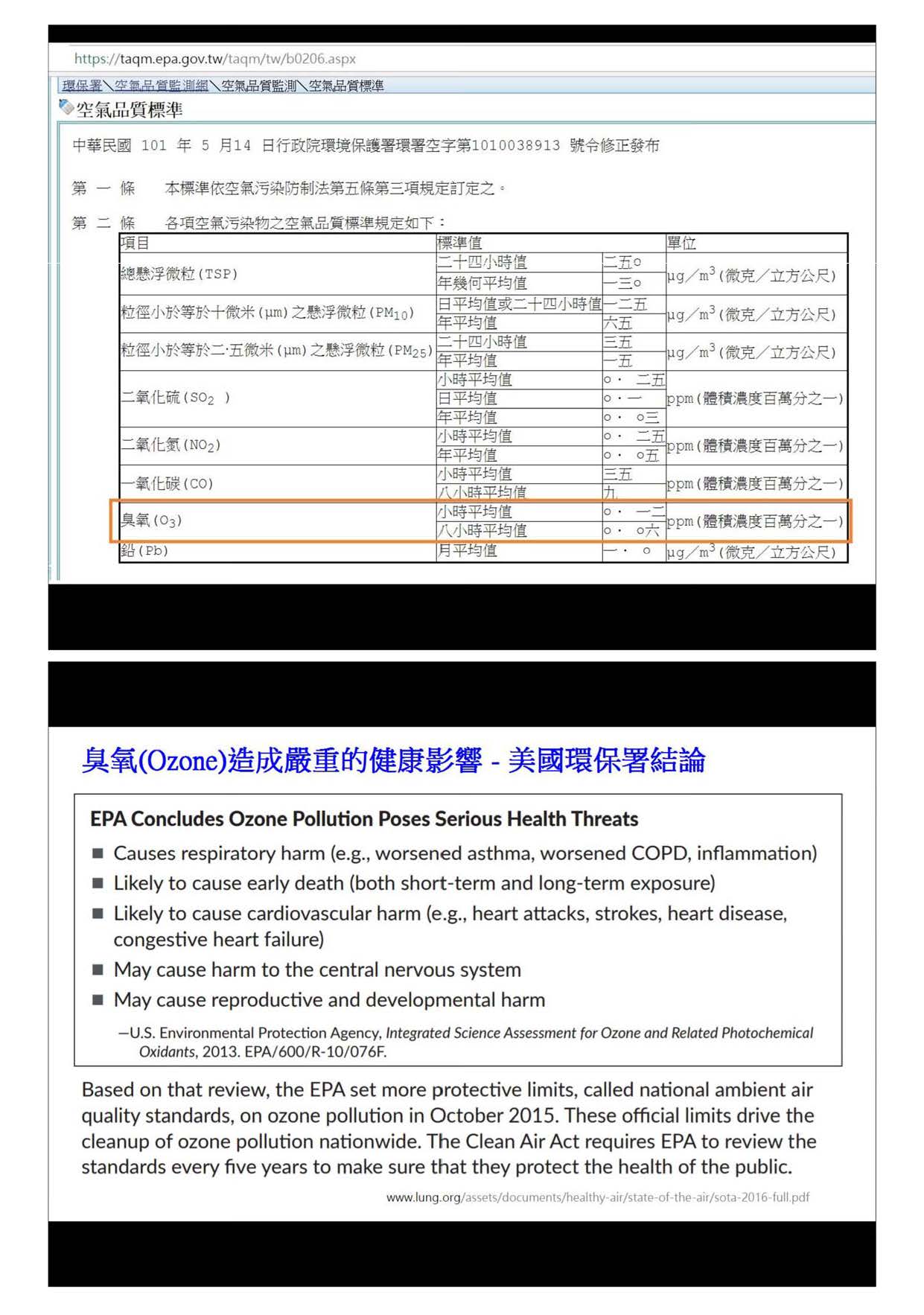關於臺灣的臭氧標準,今天副處長在場,我要向他道歉,因為昨天他和我當場就吵起來了,他認定臺灣的標準比美國還要嚴,文字的敘述就是這樣子。那臺灣的標準是什麼?在現行的空氣品質標準裡面,該怎麼做、該怎麼判定PM2.5不符合標準都寫得很清楚,但是PM10、臭氧和一氧化碳都是規定在細則裡面,臭氧的部分就只有一項:每年每日最大小時平均值由高到低依序排列,第八高值不得超過120ppb。我相信這位副處長是要和我爭辯,臺灣8小時平均值的標準60ppb比美國的標準70ppb還要嚴格,不得了!那個文字敘述是正確的,了不起!臺灣的官員和我公開辯論半天,我的問題是:臺灣的空氣品質標準比美國還要嚴嗎?幾次以來,他都跟我講:「確定,臺灣的臭氧標準比美國還要嚴。」,不得了!文字敘述是這樣認定的。