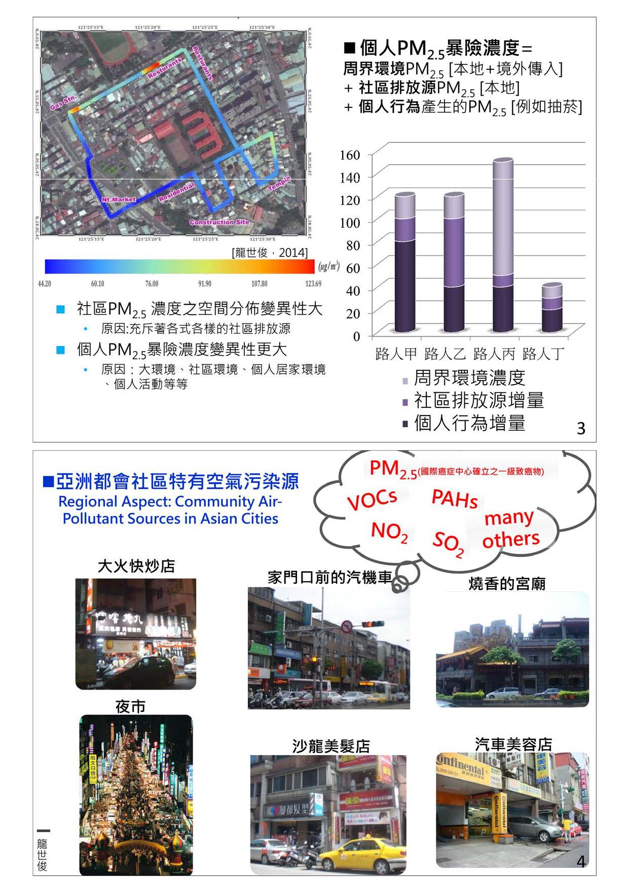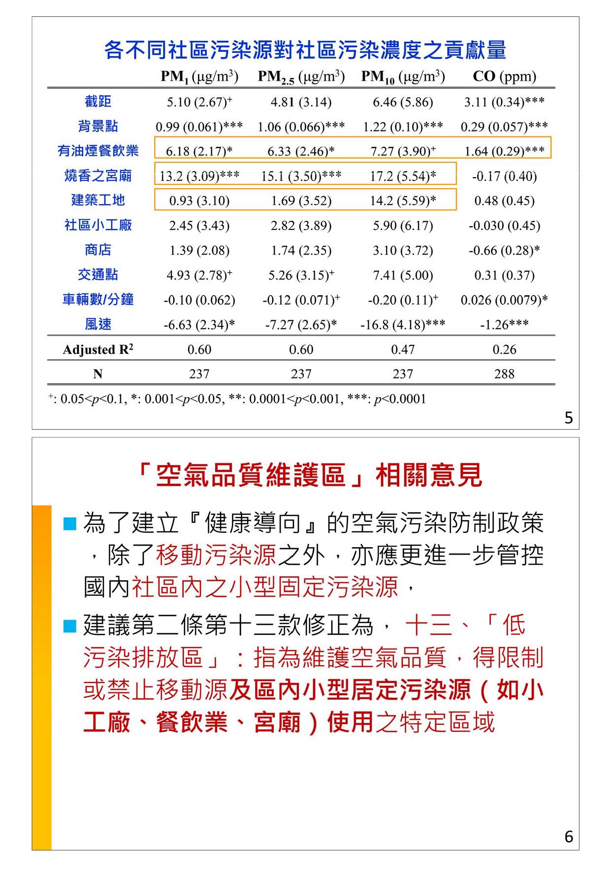 這是我在台灣社區測的,我們用精密儀器在1個小時之內走完這個社區,只要在餐飲業、寺廟或者是夜市所在地,濃度都會高起來。環保署的測站設在10公尺以上,測到的是均勻混合的大氣,不會測量到人體直接呼吸進來、直接暴露以及真的會影響到人體健康的污染物,但實質會影響個人健康的暴露濃度是環保署測量的周界環境PM2.5濃度,再加上社區排放源的PM2.5濃度,然後才是個人抽菸造成的。所以我們可以看到社區影響個人的暴露濃度很高,有時甚至會達到環境周界品質的1倍、2倍、3倍以上。這就是大家耳熟能詳住家門口的汽機車、燒香的宮廟、大火快炒店等等。我們這是用這科學數據做出來的,我再強調一下,在3公尺之外有油煙的餐飲業對PM2.5的貢獻大概是每立方公尺6微克,燒香的宮廟是15微克,如果環境空氣品質也是15的話,站在一間燒香宮廟的門口,暴露濃度其實是背景濃度的1倍,這些都是要管制的,建築工地也是,對PM10的貢獻量是15左右,這些都是需要管控,而且實際會影響居民健康的。為什麼空氣品質下降民眾沒有感?那是因為社區污染源一直存在,而且是目前抱怨最大的,打電話到環保署、環保局抱怨最多的都是這些社區裡的污染源。所以在法裡面我們需要有一些具體的條文,使民眾或環保單位有工具可以列入管制,所以我建議針對區內小型固定污染源要加以管制。