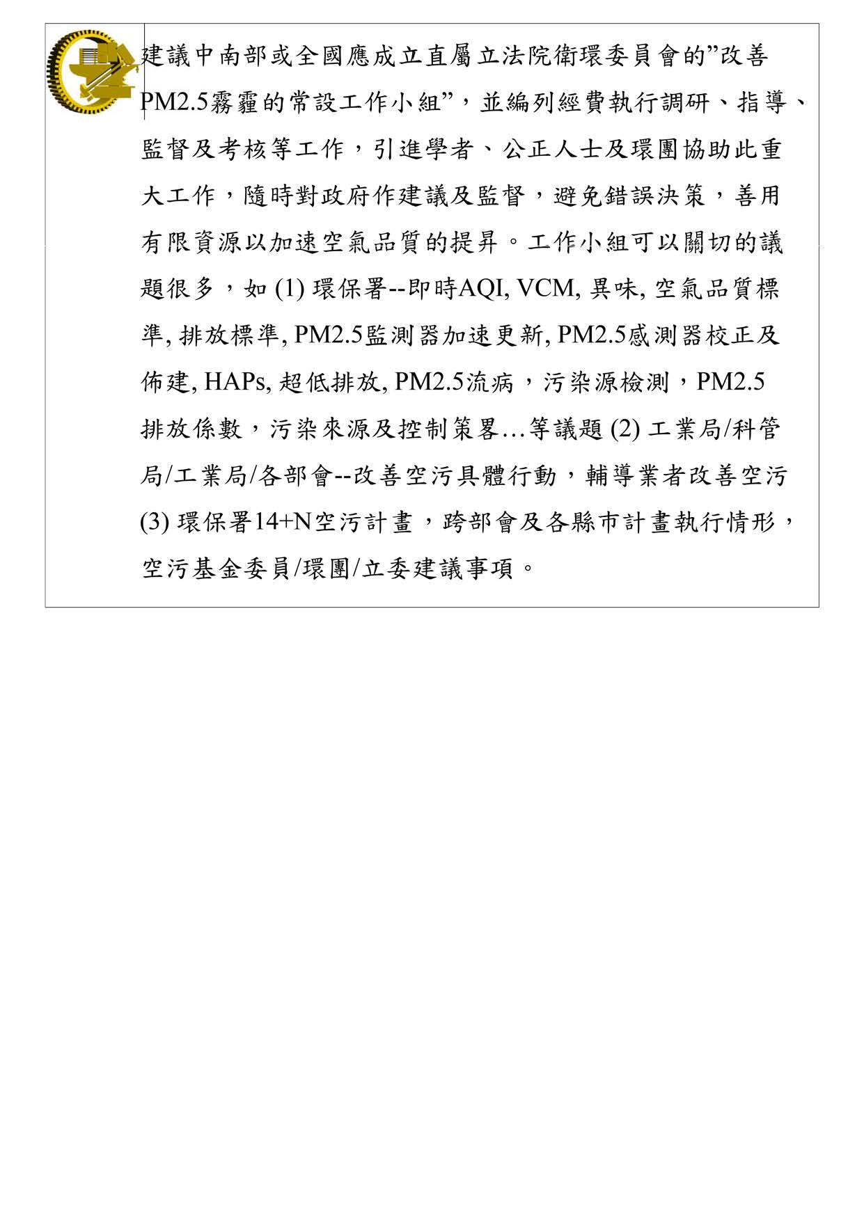 其次,第二個比較具體的建議是我們的空污預算都是環保署編列的,最近他們也提出14+N,並經常舉辦研討會,可是到最後還是由地方執行,因此誰來監督、指導?因為空污的問題畢竟比較複雜,所以我具體建議要以總統或衛環委員會的層級來成立一個專案小組以進行調研的工作,因為有很多事情如果只提表面而沒有實際解決問題也是不行的,針對許多數據,甚至中央、地方的計畫,我們委員也提出很多意見,而這些意見是否可行?加上現在環保署的資訊非常公開,在詹副署長領導之下完全改觀,他跟我們可以多做溝通,但我覺得這樣還是不夠,因為有很多工作還是要有科學根據,很多數字與技術需要發展,甚至PM2.5監測設備也需要馬上更新,可是相關單位卻還在那裡慢慢比,實在讓我無法了解,PM10已經更新,PM2.5產生很多問題與奇怪的數據,導致AQI無法及時發布,我們都進行8小時長時間的平均,但它卻無法及時反應。