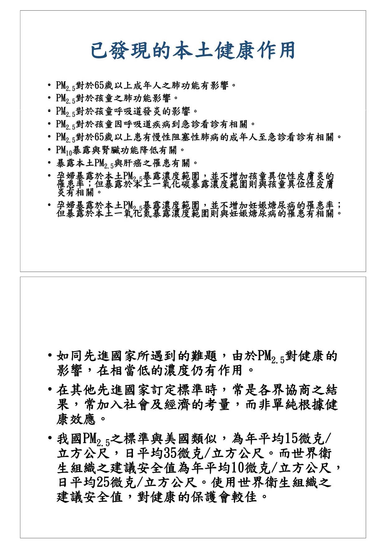 已發現的本土健康作用包括對成年人、孩童之肺功能、孩童呼吸道發炎、孩童呼吸道疾病急診、慢性阻塞性肺病、腎臟功能降低、肝癌及對孕婦等都有影響。而我們最大的困擾是如同先進國家所遇到的難題,由於PM2.5對健康的影響,在相當低的濃度仍有作用,而其他先進國家訂定標準時,常是各界協商之後的結果,並加入社會及經濟的考量,而非單純根據健康效應。