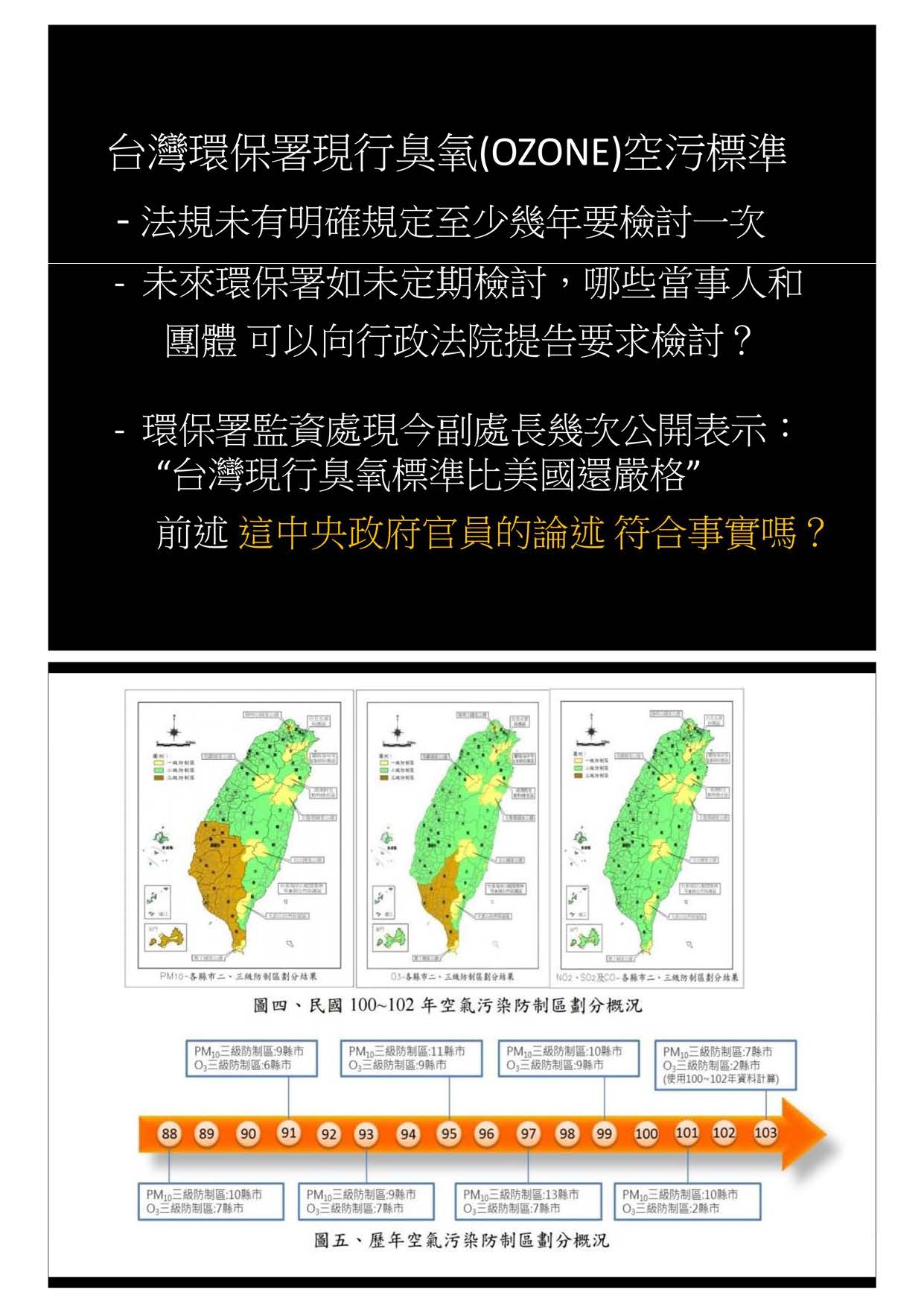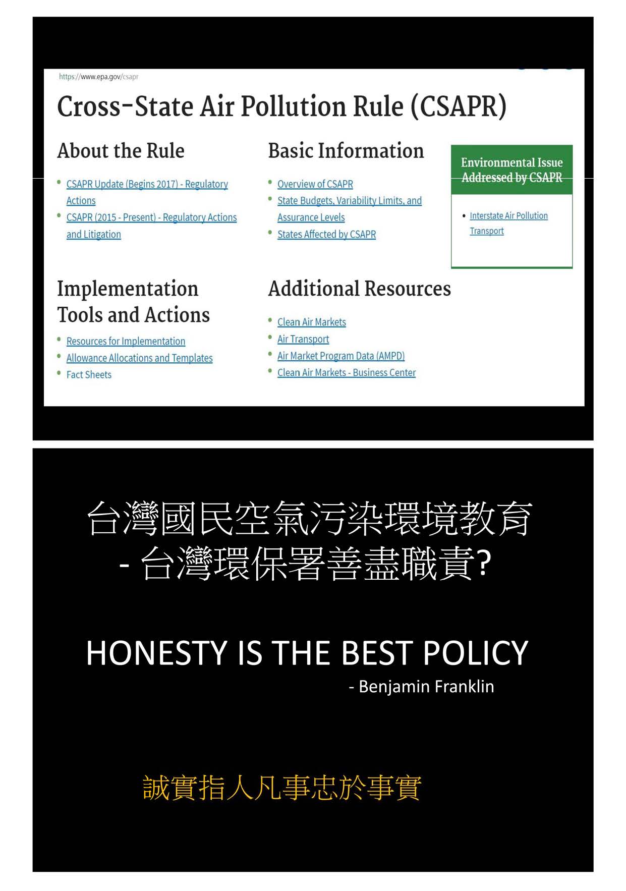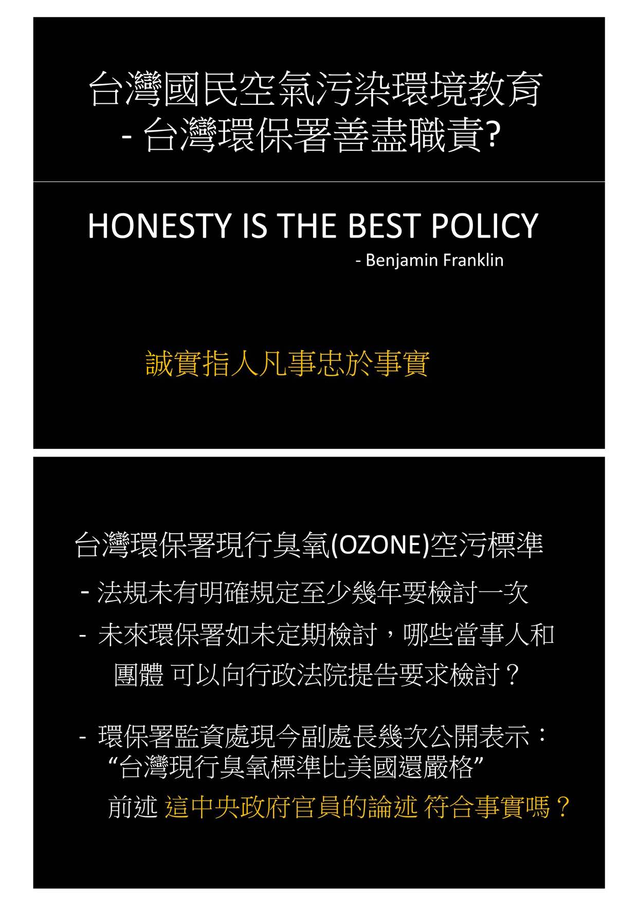 我還是認為環保署應該善盡環境教育的責任,譬如大家都在談減量和缺電,不努力做環境教育和空污教育,要怎麼推動呢?Benjamin Franklin在300年前就說:「Honesty is the best policy.」,這句話我不用翻譯了。而誠實只是指人忠於事實。我用臭氧做案例,臺灣的法規沒有明確規定幾年要檢討一次,但是美國有,他們每5年或幾年就要檢討一次。如果未來環保署新的法規未定期檢討,哪些當事人和團體可以提告要求檢討?現任監資處副處長幾次公開表示:「臺灣現行臭氧標準比美國還嚴格」,這符合事實嗎?