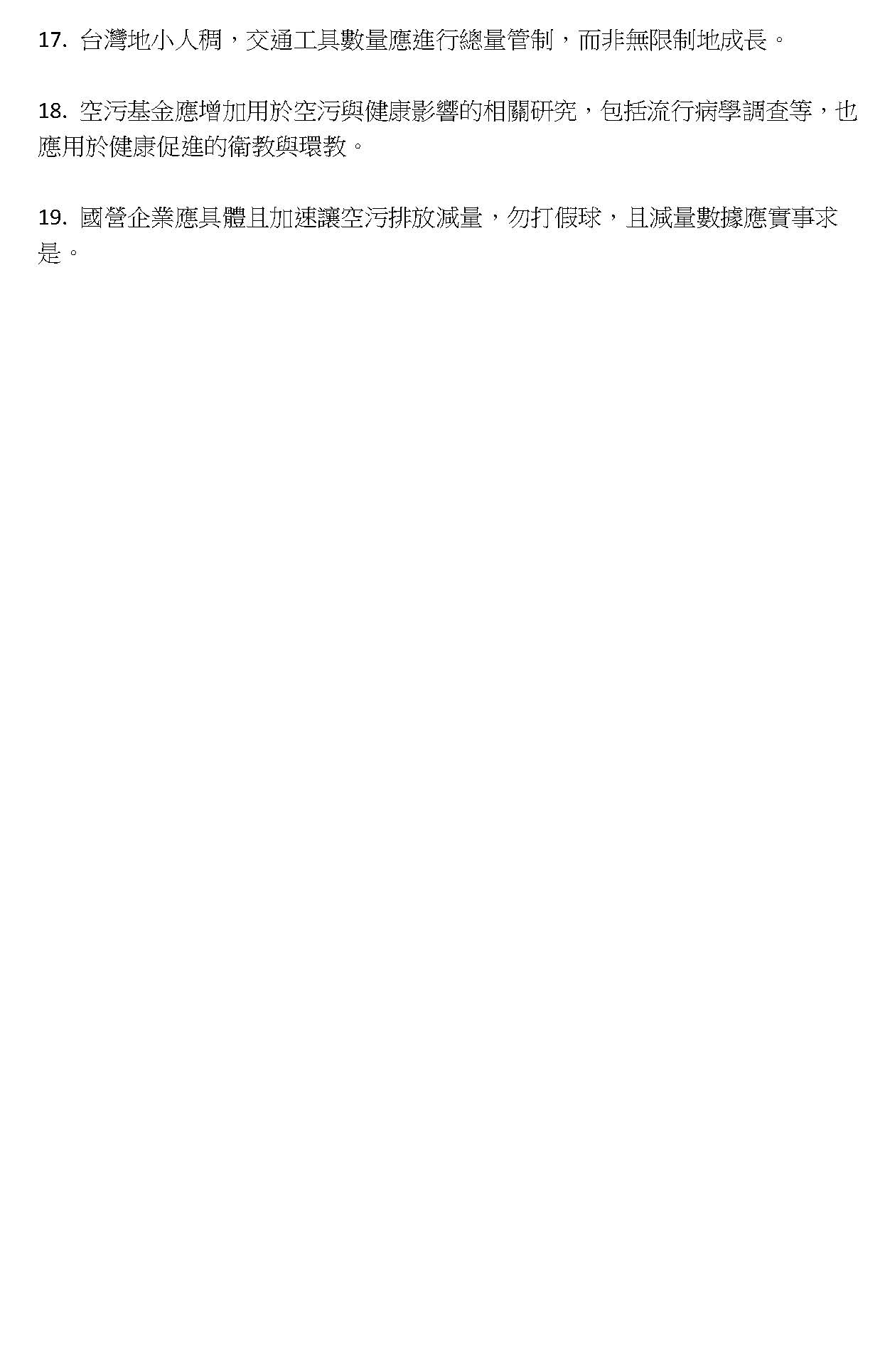 最後是關於第十八條的空污費使用原則,目前收的空污費其實滿低的,在固定污染源方面一年只收了二十幾億元,但我們知道這麼低的空污費不足以產生經濟誘因,也沒有足夠的錢照顧諸如肺腺癌的健康篩選,因此建議要增加空污費的使用原則,像是增加潔淨車輛的使用、推廣及研發,或是增加空污相關疾病的防制與治療。以上幾點,謝謝。