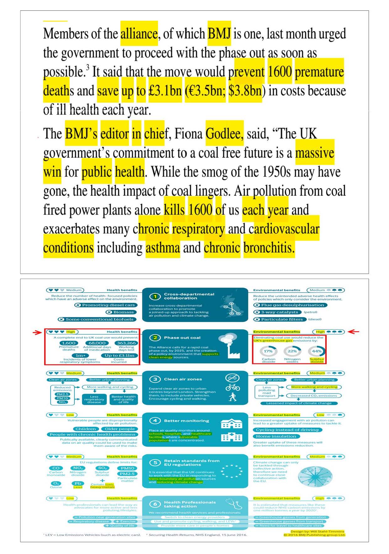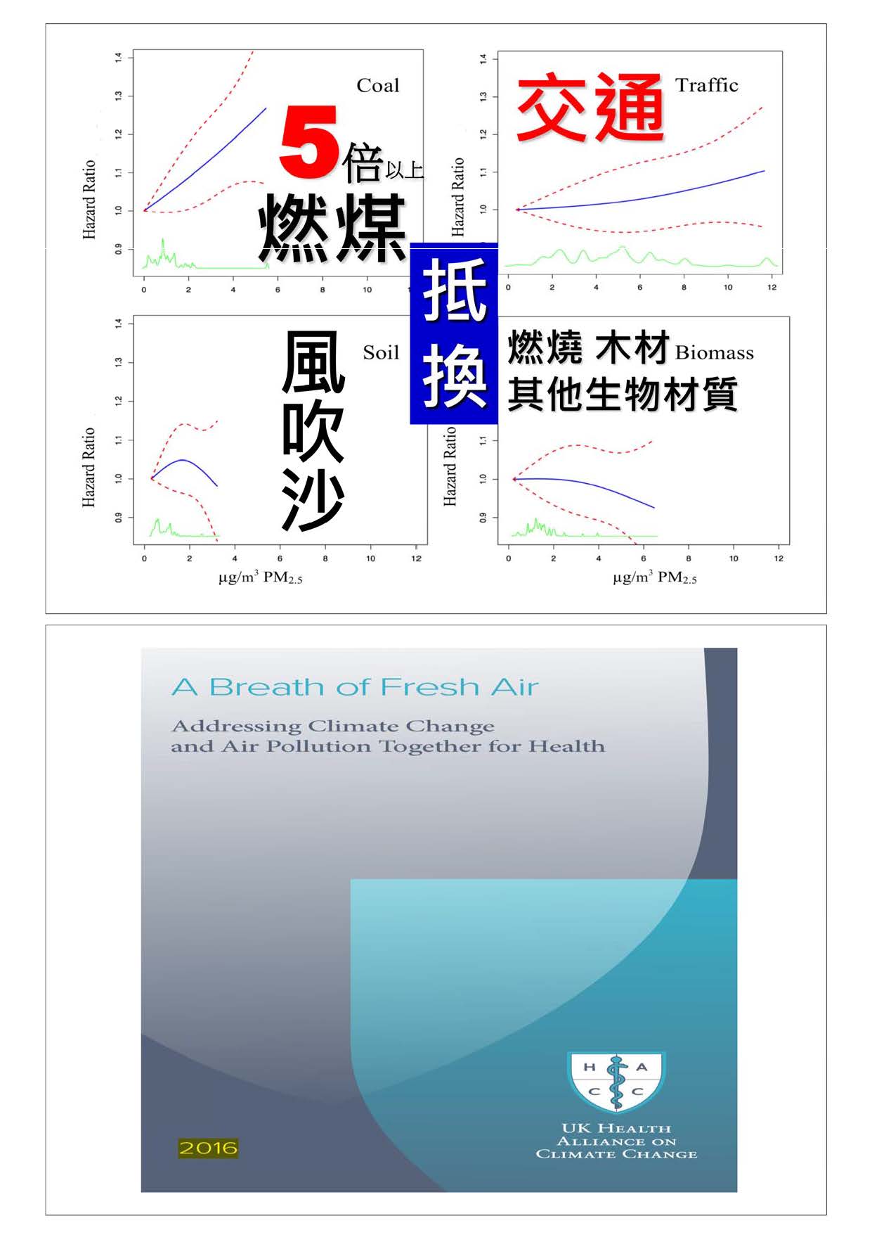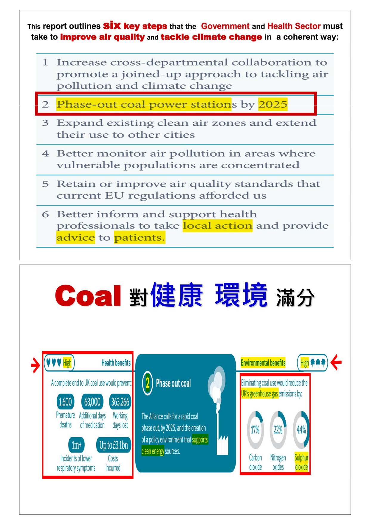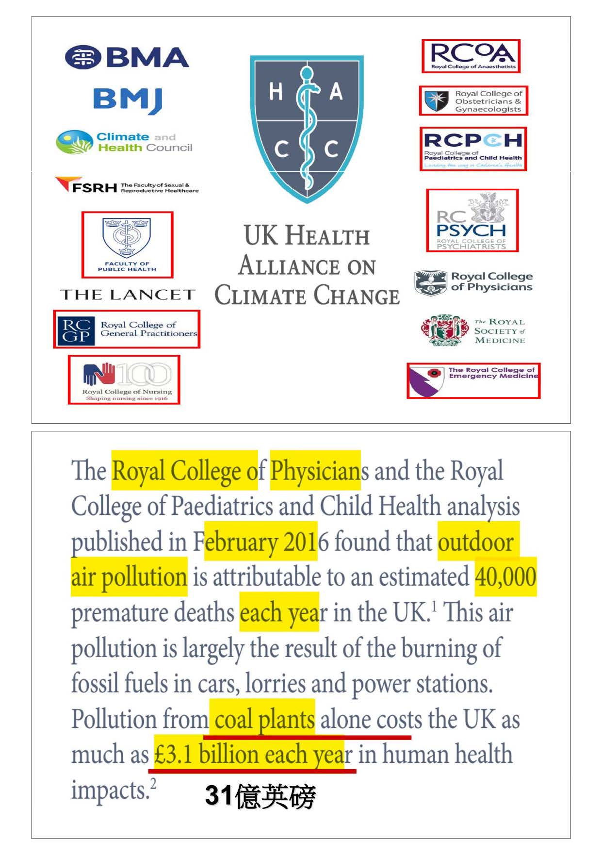 請大家看下一張簡報,這是英國醫學會的報告,請大家看一下這個團體有多大,這是英國醫學會和很多團體一起提出的報告,他們認為光是燃煤就會造成經濟損失31億元英鎊,這件事有很多種解決方法,例如交通方面等等,但那些都不是最好的方法,最好的方法就是禁燒燃煤。這件事也不需要跨部門處理,他們提出六種方法,第二個方法就是把燃煤拿掉,因為這對健康的影響是最大的。