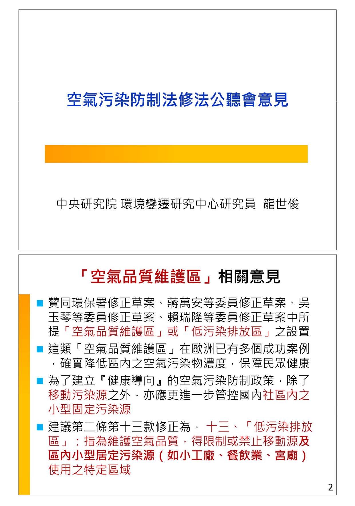 龍世俊研究員:主席、各位委員。很高興環保署提出修法,也很謝謝立法院的委員們這麼重視,這是全民都非常重視的議題。為什麼民眾不喜歡空氣污染?因為這對健康有影響,所以此次修法一定要把以健康為導向的空氣污染防制方法這個概念列入。