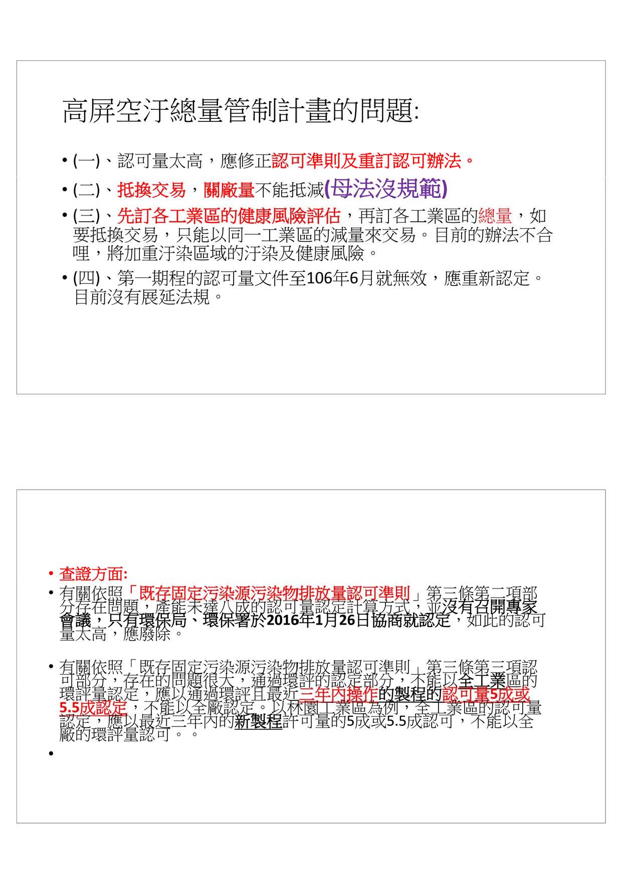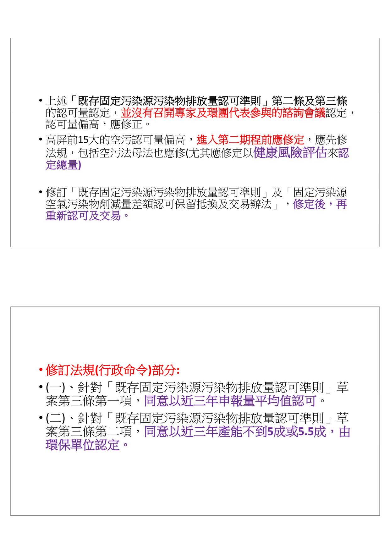 行政命令的部分就是關廠量不能抵減,因為空污法並沒有規範關廠量可以做抵減交換;然後是認可準則和抵減辦法都應該要修。目前在查證的部分,認可準則是同意採用3年平均為認可量,如果產能沒有到3年,就是用認可量的5成或5.5成來認定。我們知道上述舊的法規當中,有很多行政命令是民國100年甚至二十幾年前訂定的,現在被套在高屏來實施,因此我們發現很多相關條文並沒有規定要召開比較嚴謹的、由專家或環團代表參與的諮詢會議,所以我們建議要修。其中行政命令的部分我們已經跟環保署講了總量的問題,然後就是配合流行病學的研究,尤其是林園、小港這邊,都沒有流行病學的調查。