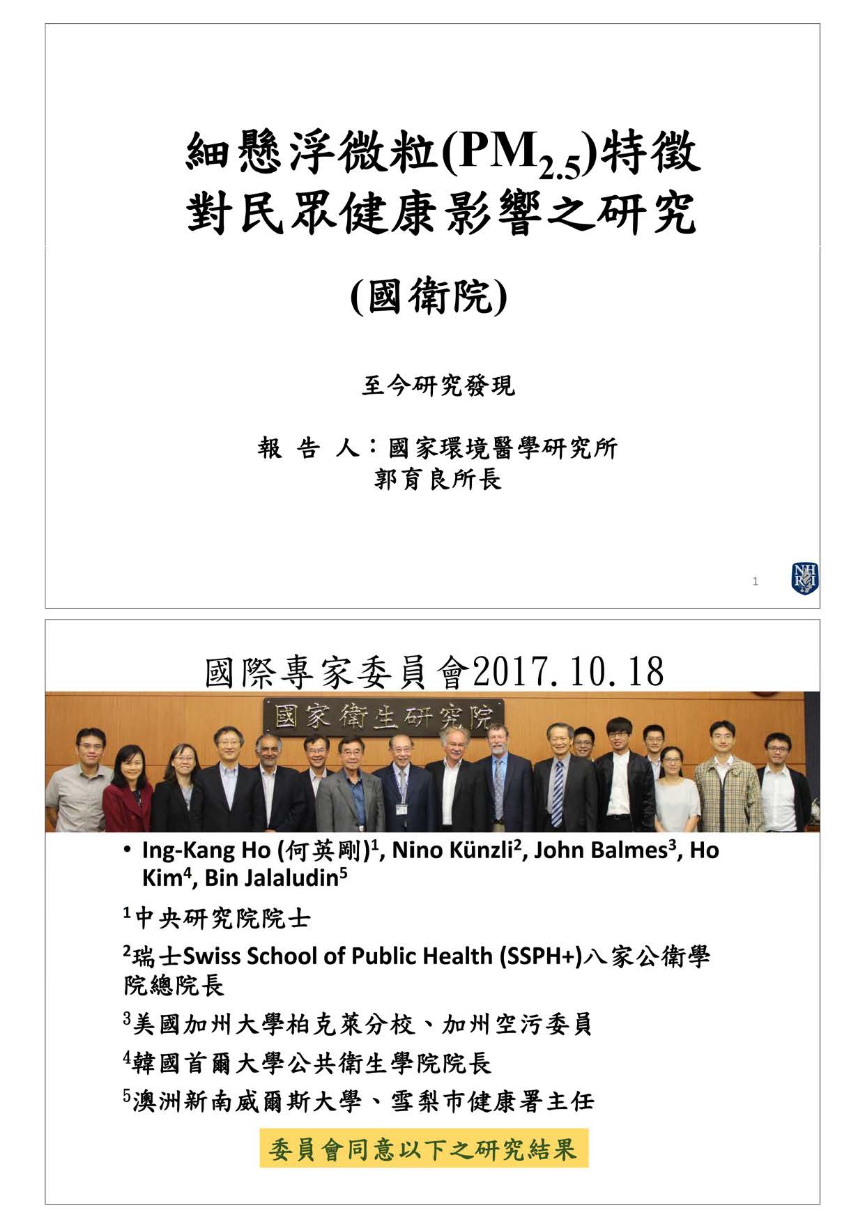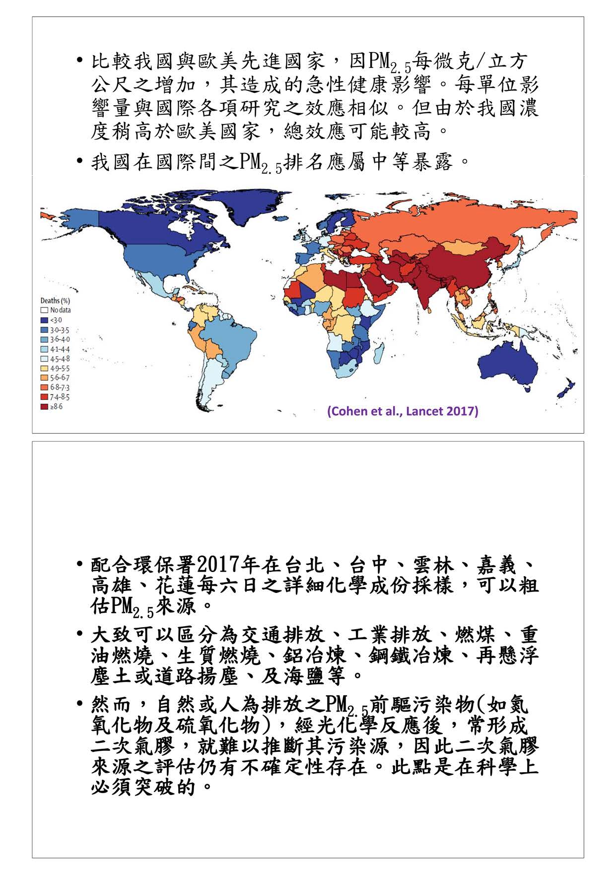 郭育良所長:主席、各位委員。國衛院在過去兩年多一直都對空污的議題有很大的興趣並加以探討,並進行一項科技計畫以探討PM2.5的健康效應,最近我們還辦理一場審查會,我們邀請專家前來審查的目的是審核我們所做的研究是否符合國際的水準與符合事實,我們所邀請的專家包括中央研究院院士、瑞士八家公衛學院總院長、美國加州大學柏克萊分校空污委員、首爾大學公共衛生學院院長、澳洲新南威爾斯大學雪梨巿健康署主任,以下是委員會所同意的研究結果:1、比較我國與歐美先進國家,因PM2.5每微克/立方公尺之增加,其造成的急性健康影響。每單位影響量與國際各項研究之效應相似,但由於我國濃度稍高於歐美國家,總效應可能較高。2、我國在國際間之PM2.5排名應屬中等暴露。現在看到的這張圖是在Lancet發表的,圖示中顯現出橘紅色,所以我國屬於中等暴露。