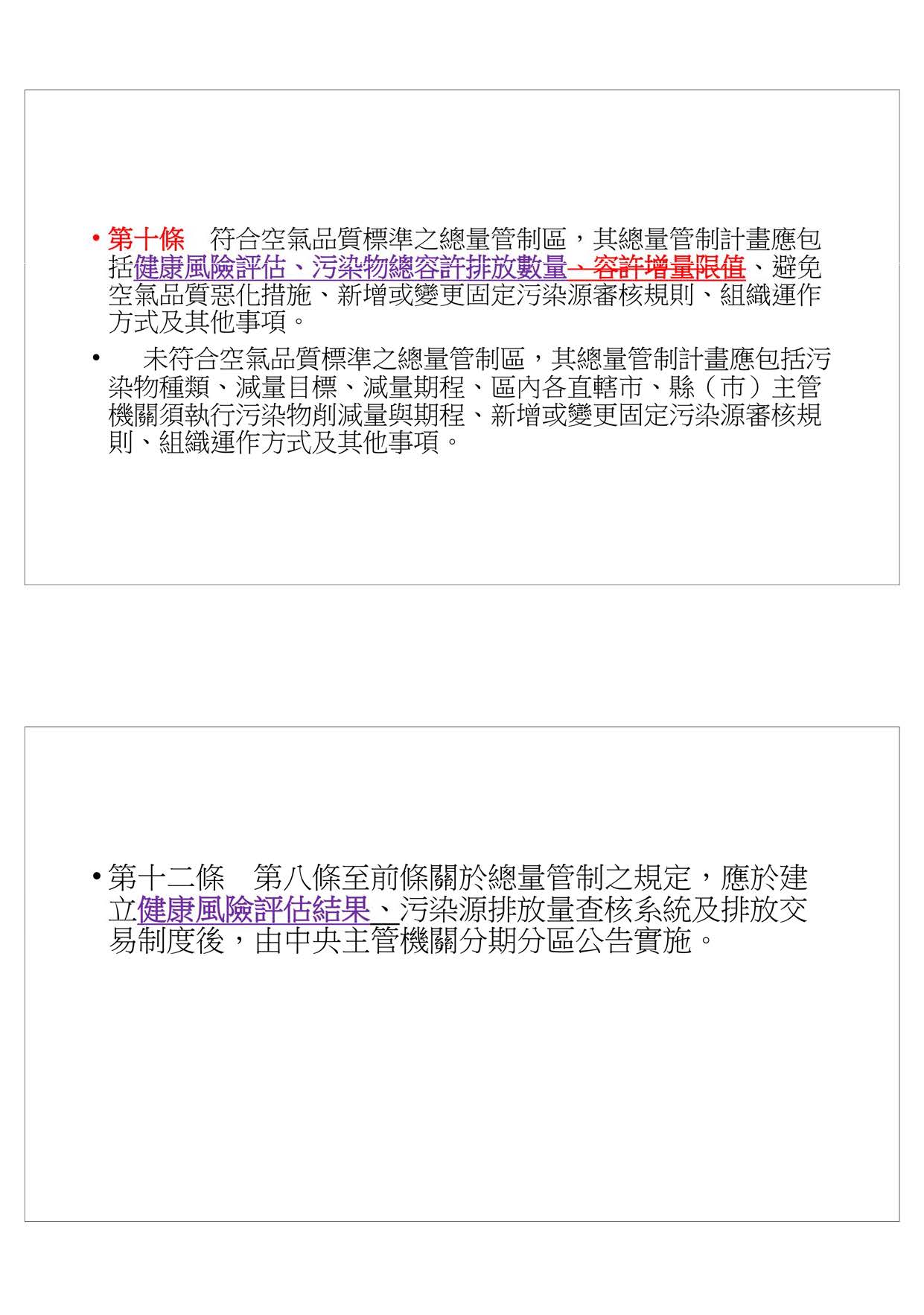 再來就是針對空污法有關總量管制規定的修訂,我們是建議第二條總量管制區的部分要用健康風險評估的量來制定總量。第六條的部分,我們建議刪除「模式模擬」,用健康風險評估來訂定這個量,而且是總容許排放數量;三級空品區的部分也一樣刪除模式模擬,而且不能容許增量限值,這都是不合理的,以上是第二項和第三項。第八條也是一樣,要依健康風險評估來訂定容許量。第九條的部分,我們建議將第一項第二款到第五款全部刪除,因為這樣規定不合理,在空污嚴重的三級空品區,不應該採用目前尚未嚴謹訂定的移動污染源或掃街來減量。第十條的部分,總量管制計畫裡面的量也是要根據健康風險評估來訂定。第十二條也是一樣。