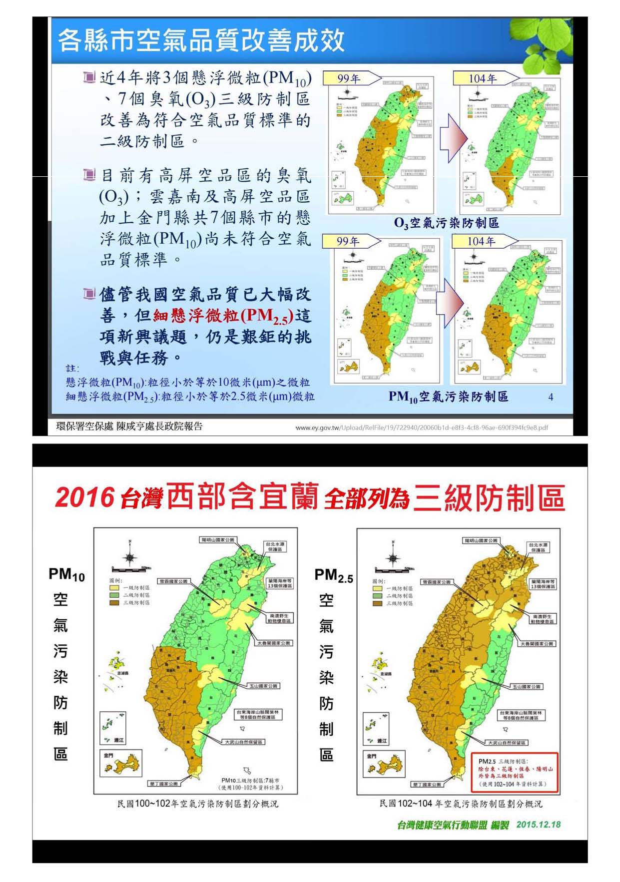 根據環保署的資料,只剩下高屏的臭氧是不符合空氣品質標準的;最近陳咸亨處長也向行政院報告,臭氧只剩下高屏不符標準。根據2016年的數據,PM10和PM2.5的劃分概況就有不一致了,現行PM2.5的標準顯然相當嚴格,所以只剩下花蓮和臺東符合標準。