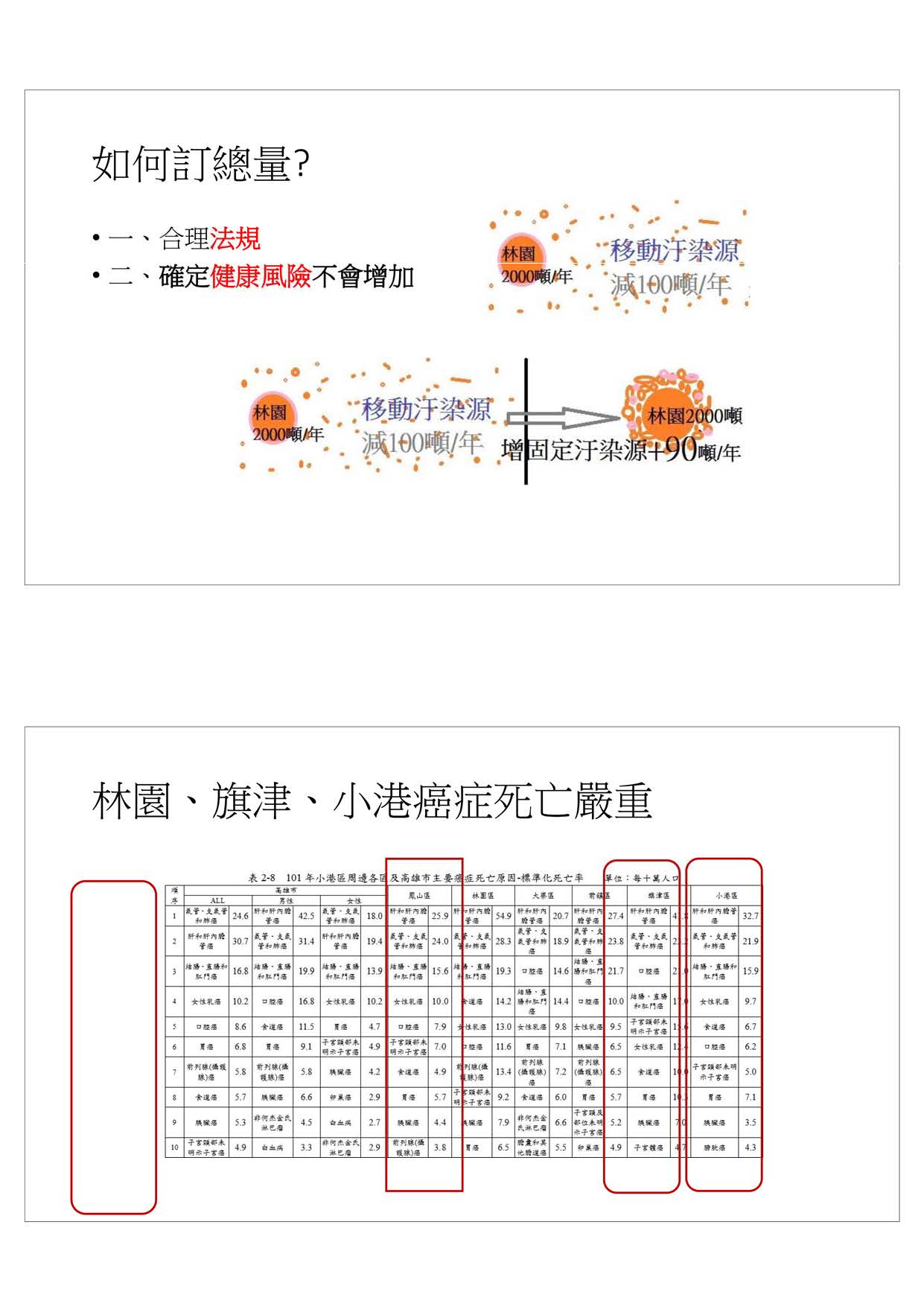 長久以來,林園飽受空污影響,除了健康風險評估之外,政府到現在都沒有做過流行病學調查。我再強調一次,我做田野調查,發現肺腺癌、肝癌、口腔癌的比例非常高。剛才椒華老師有秀一張資料,那個是臨海工業區做的,我們林園工業區根本都沒有做,非常可憐。