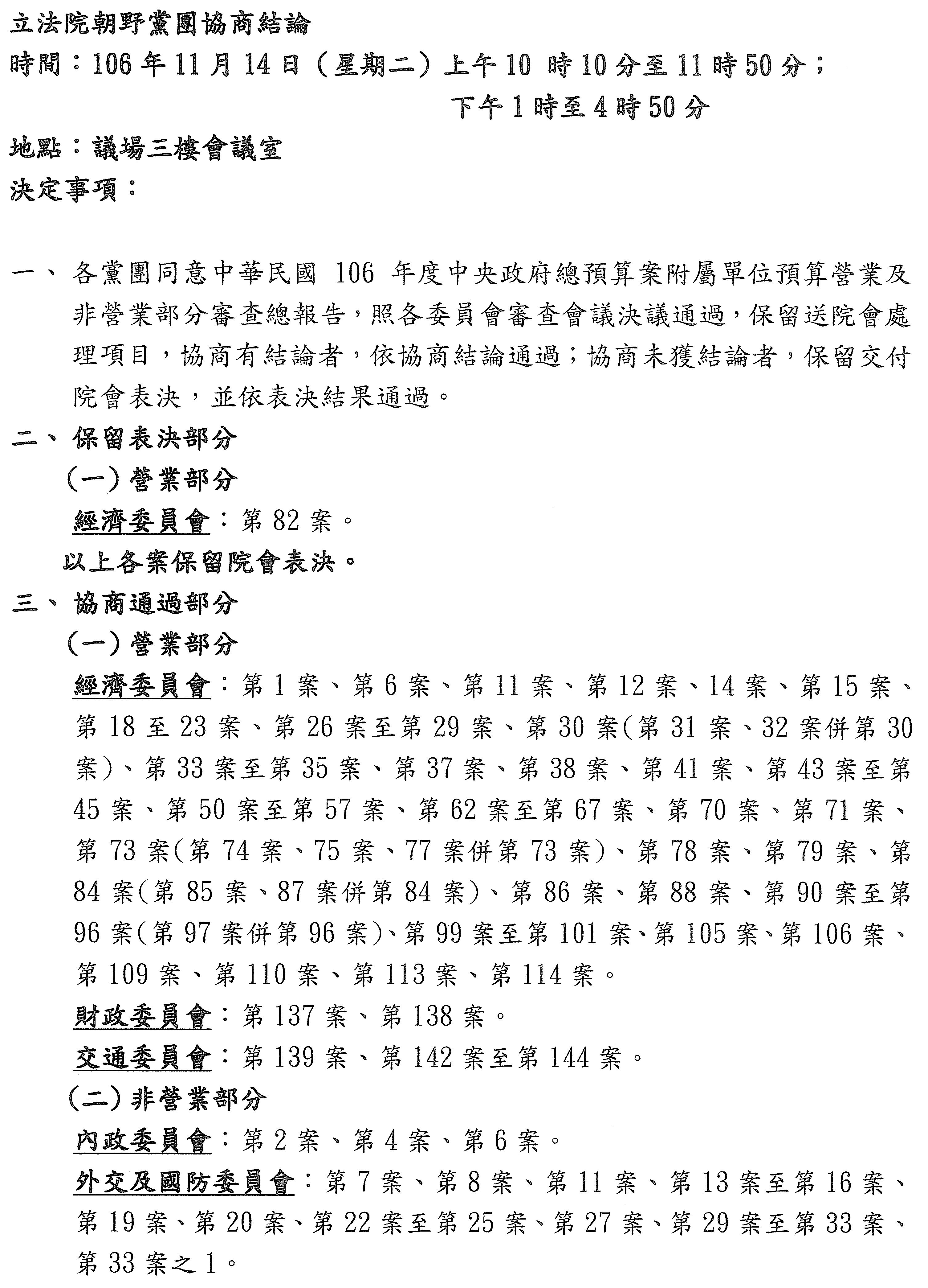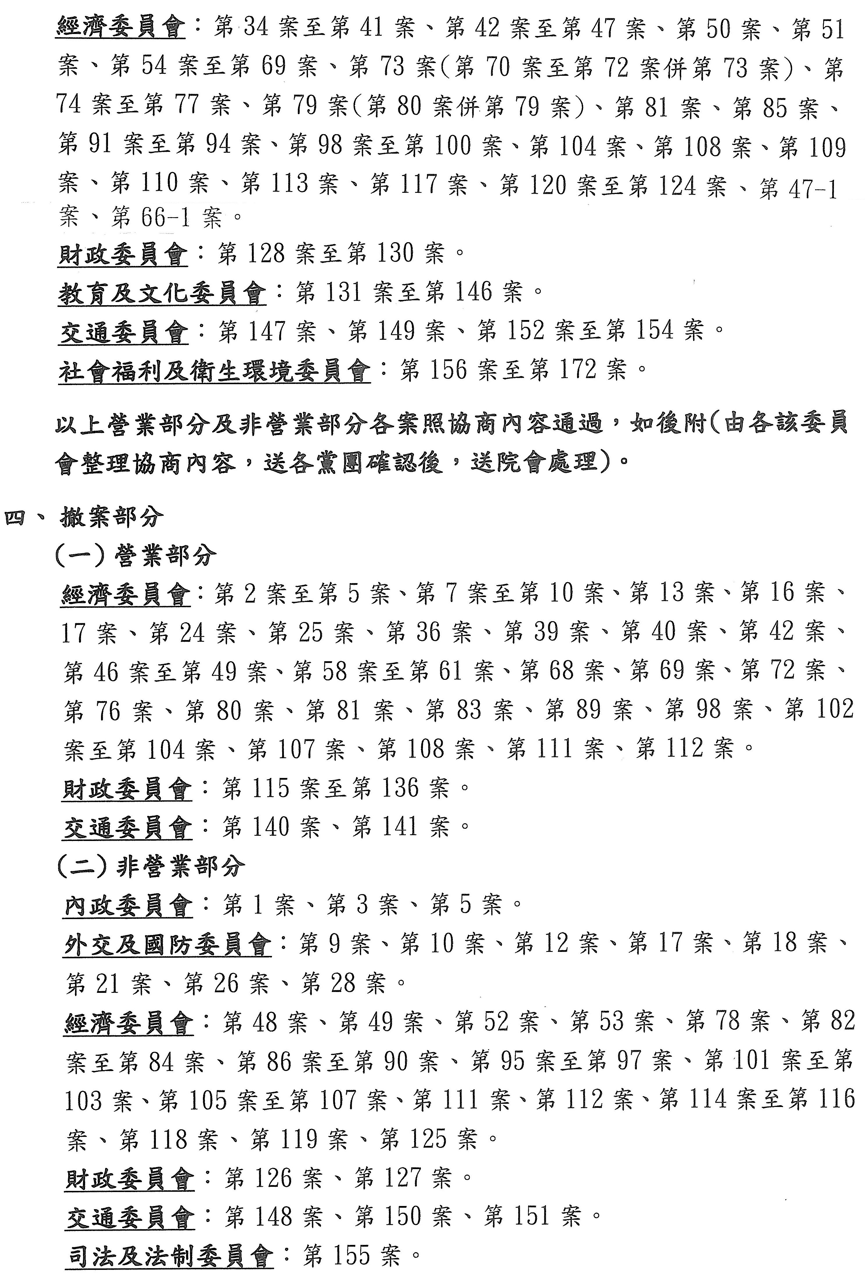 以上營業部分及非營業部分各案照協商內容通過,如後附(由各該委員會整理協商內容,送各黨團確認後,送院會處理)。