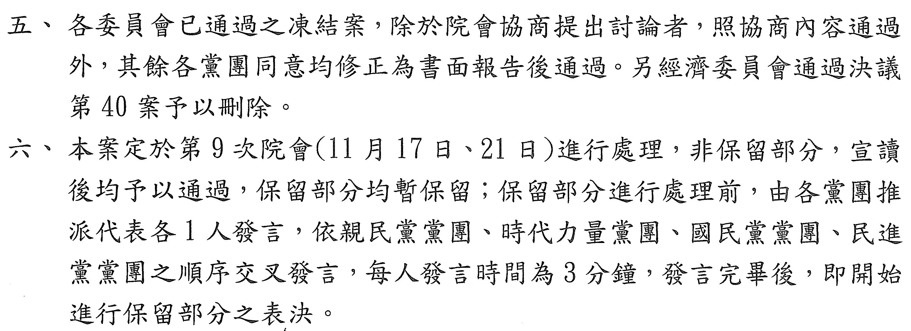 六、本案定於第9次院會(11月17日、21日)進行處理,非保留部分,宣讀後均予以通過,保留部分均暫保留;保留部分進行處理前,由各黨團推派代表各1人發言,依親民黨黨團、時代力量黨團、國民黨黨團、民進黨黨團之順序輪流發言,每人發言時間為3分鐘,發言完畢後,即開始進行保留部分之表決。
