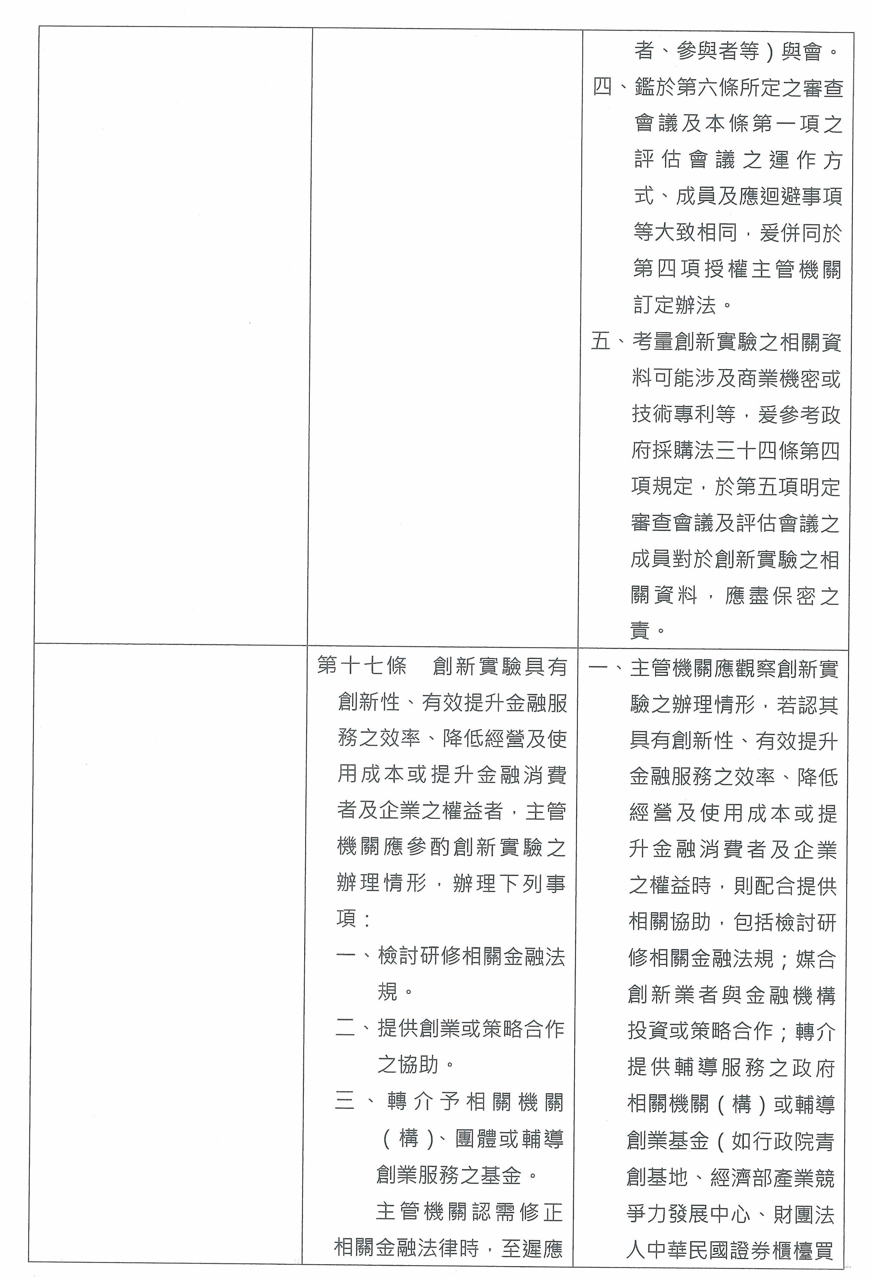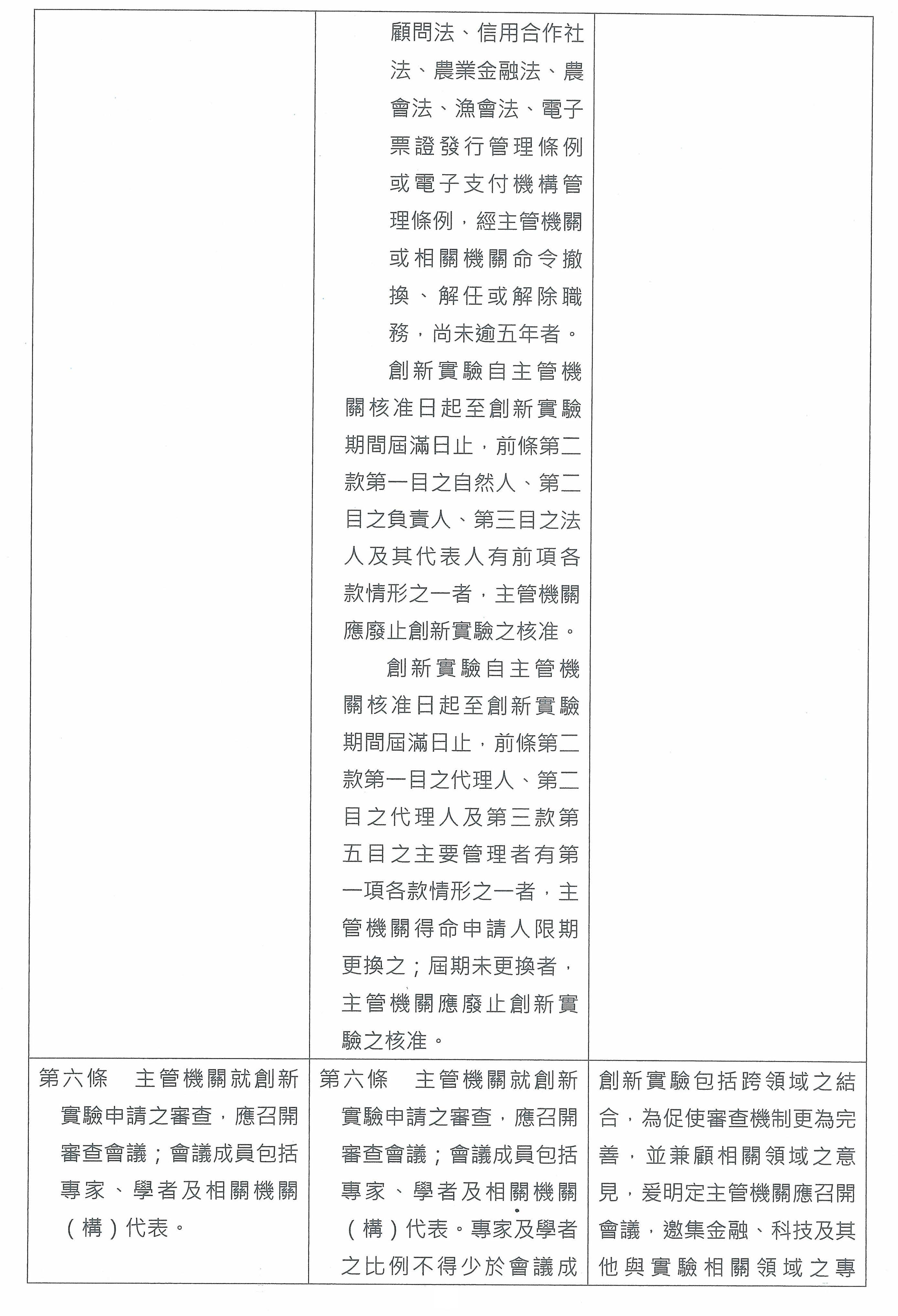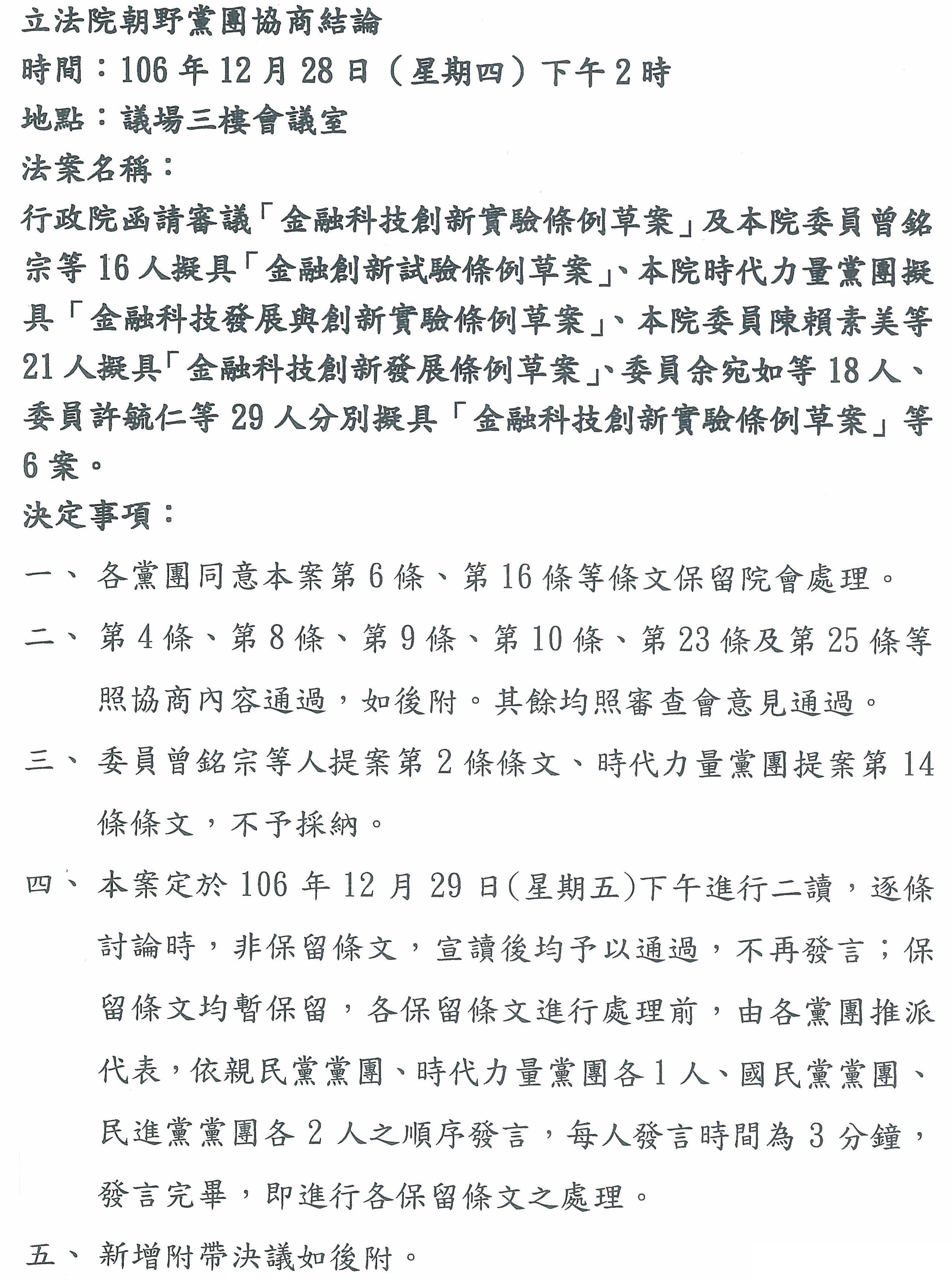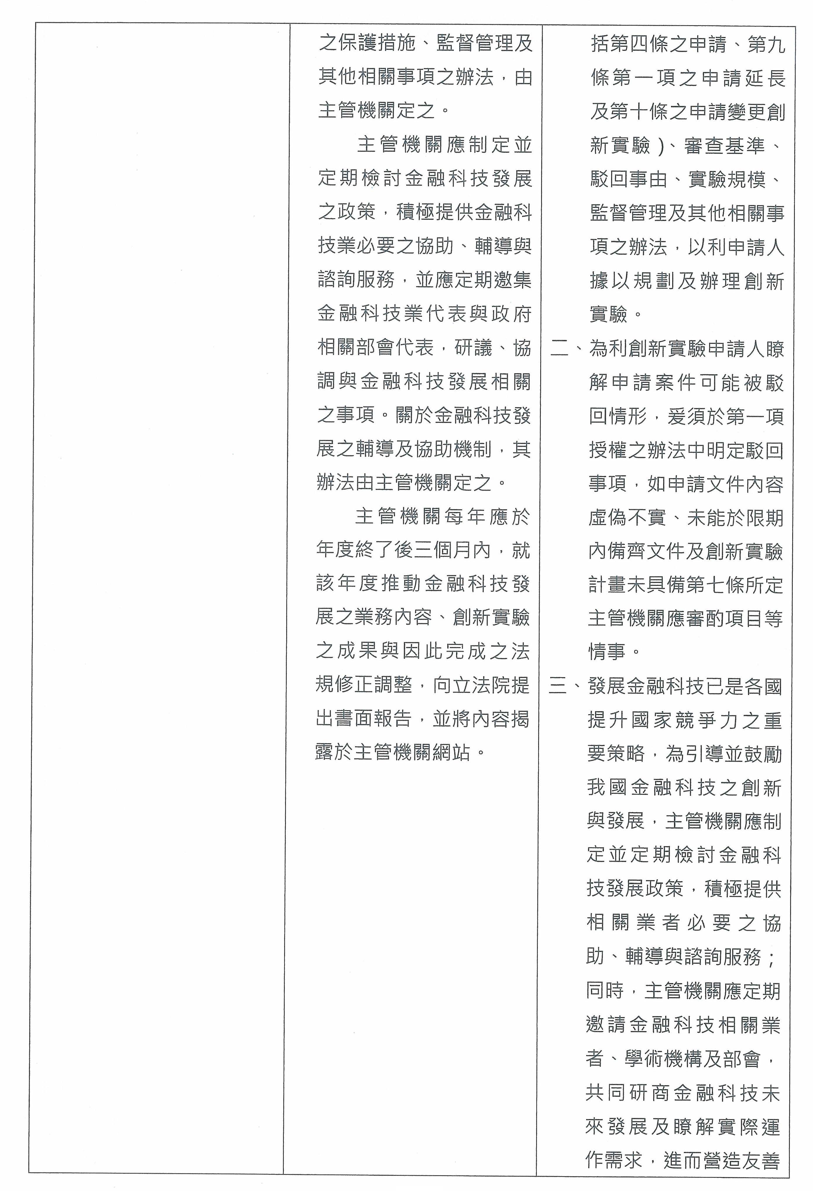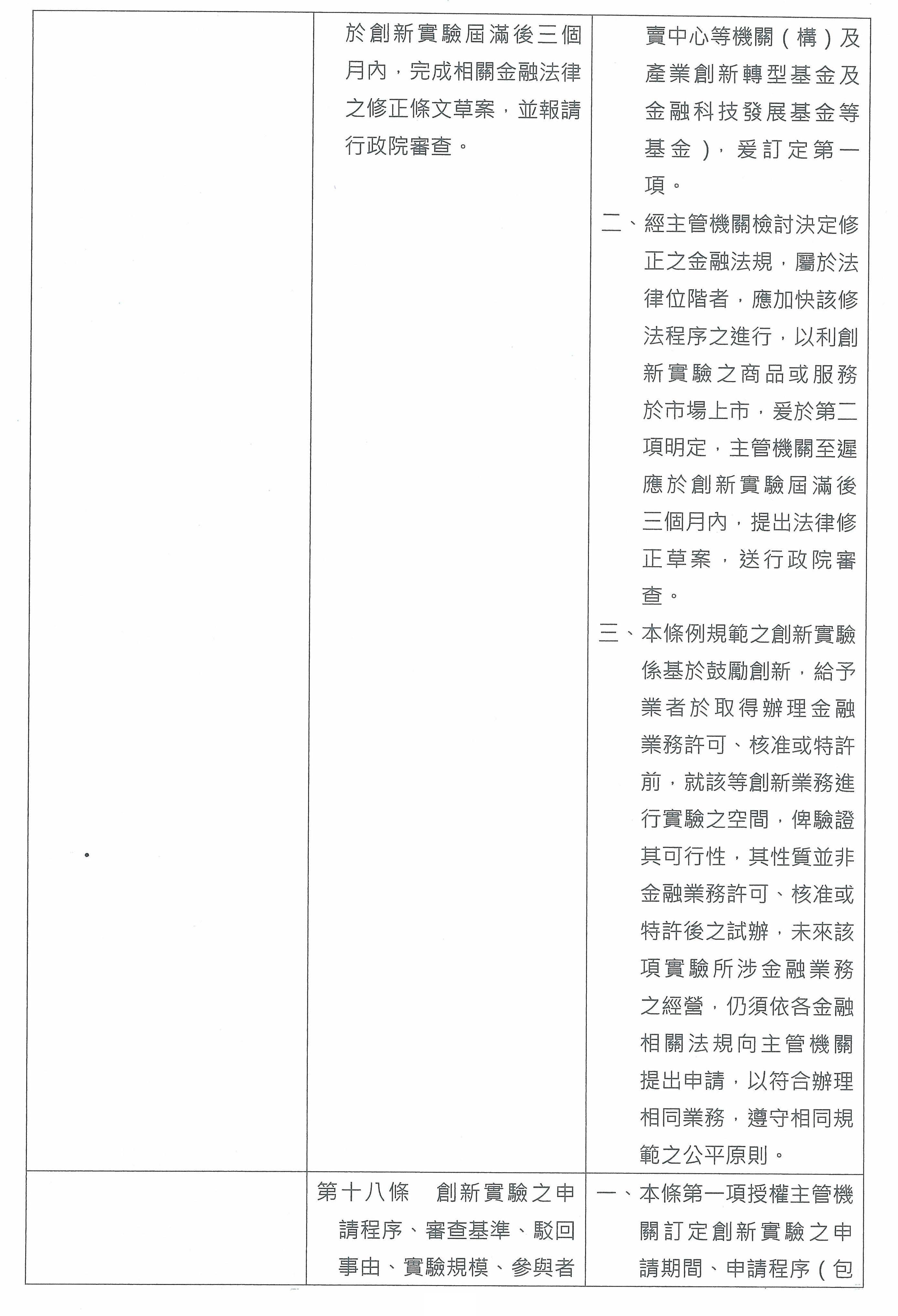 本院財政委員會報告併案審查行政院函請審議「金融科技創新實驗條例草案」及本院委員曾銘宗等16人擬具「金融創新試驗條例草案」、本院時代力量黨團擬具「金融科技發展與創新實驗條例草案」、本院委員陳賴素美等21人擬具「金融科技創新發展條例草案」、委員余宛如等18人、委員許毓仁等29人分別擬具「金融科技創新實驗條例草案」案 | |