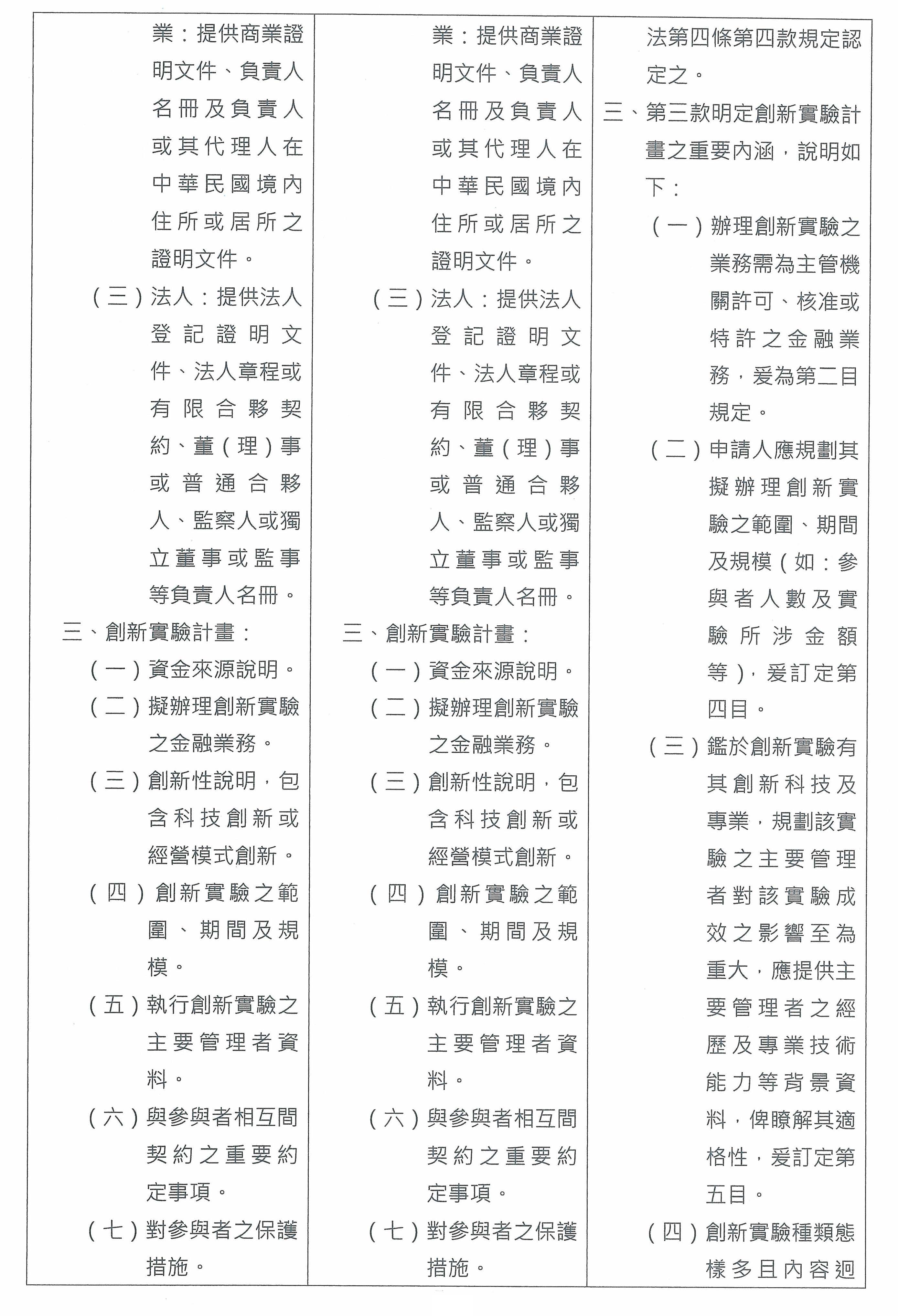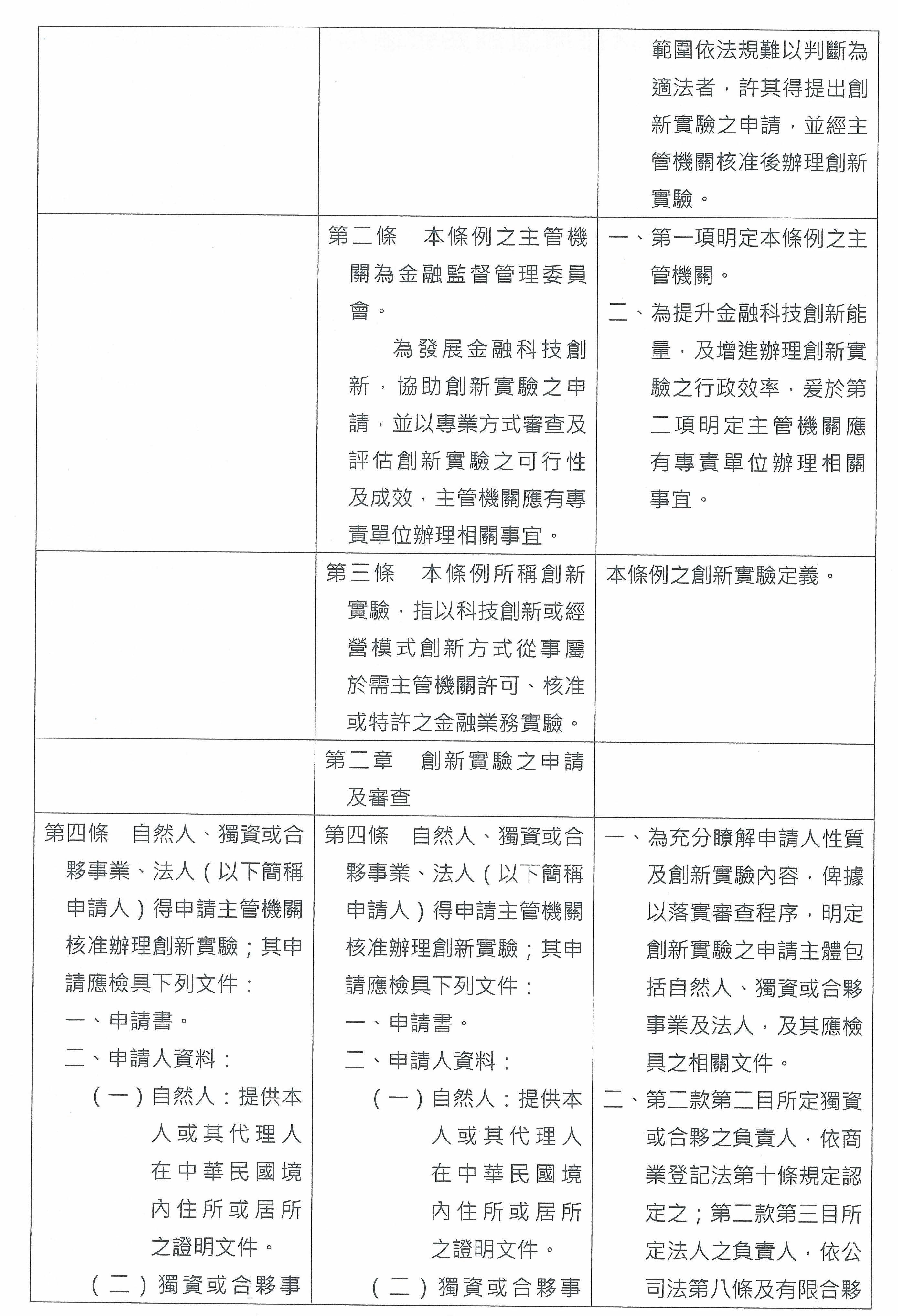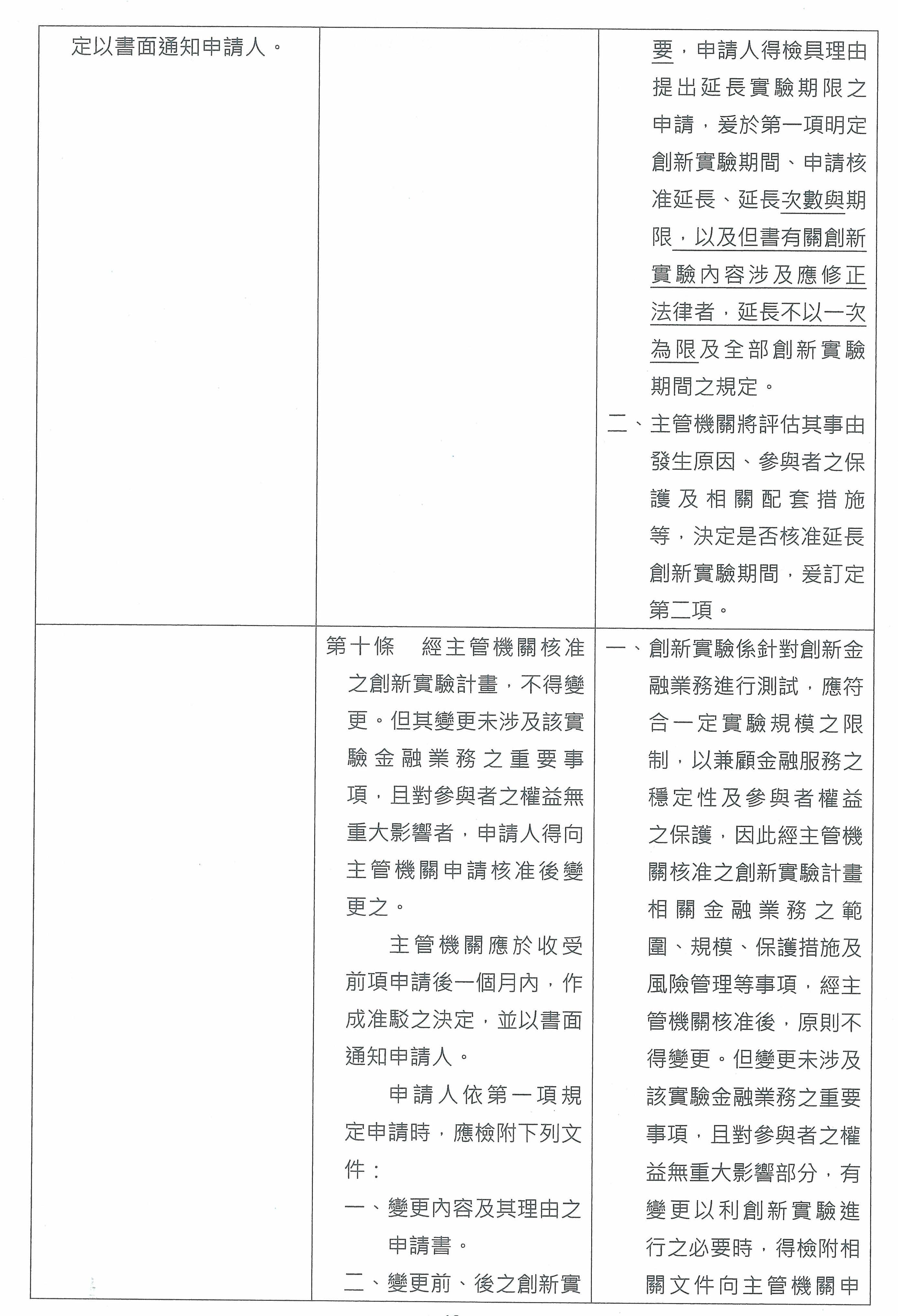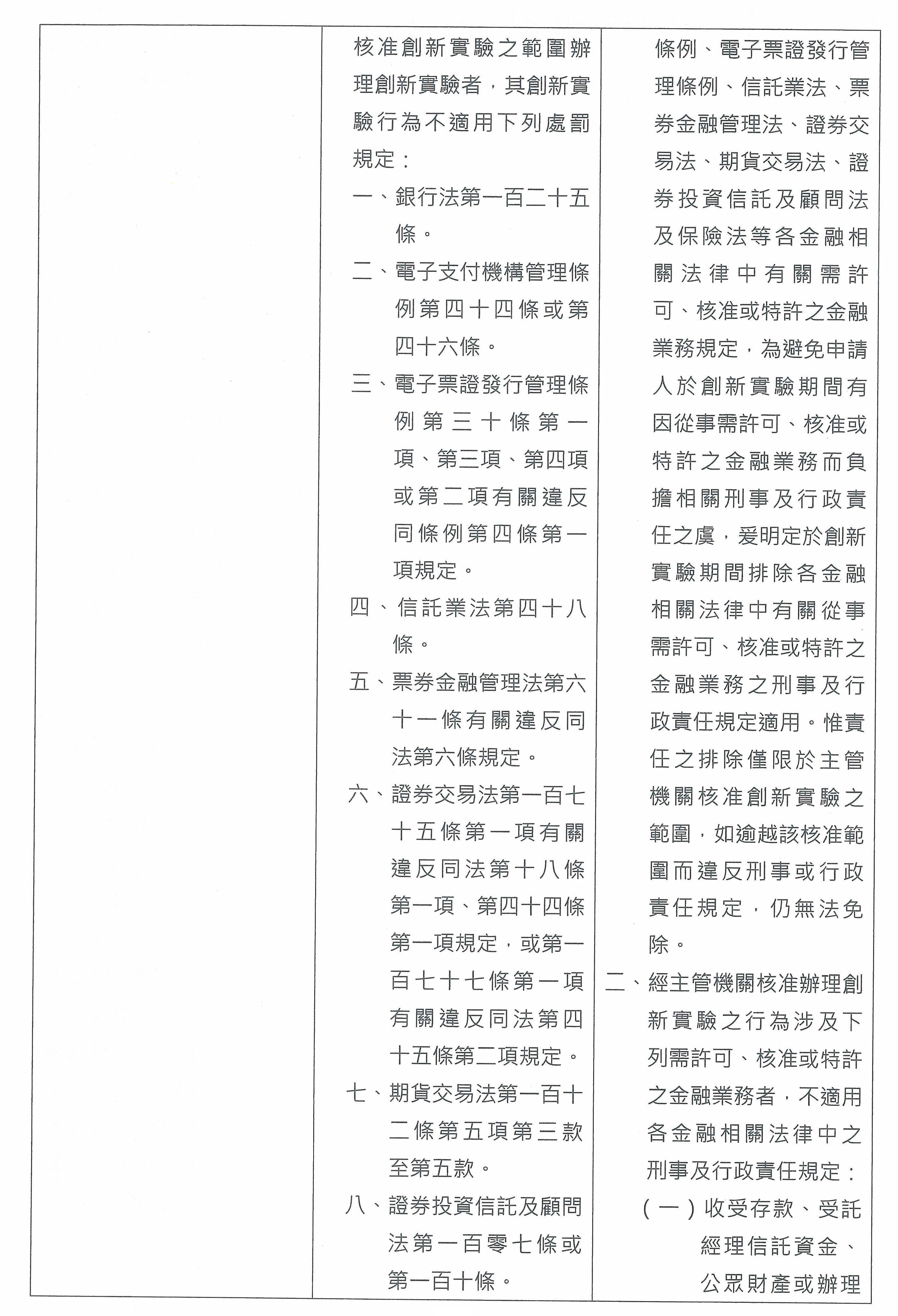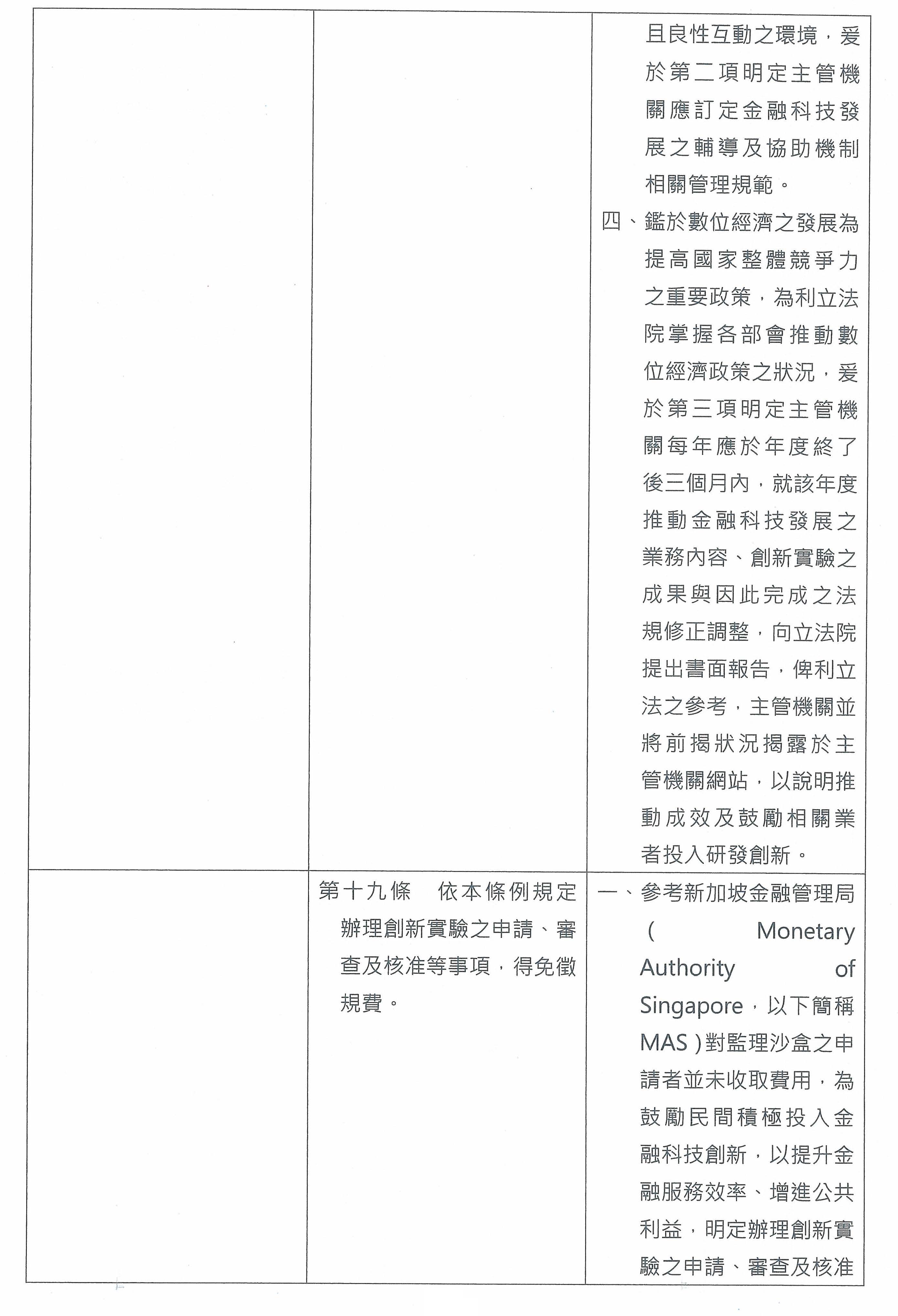 本院財政委員會報告併案審查行政院函請審議「金融科技創新實驗條例草案」及本院委員曾銘宗等16人擬具「金融創新試驗條例草案」、本院時代力量黨團擬具「金融科技發展與創新實驗條例草案」、本院委員陳賴素美等21人擬具「金融科技創新發展條例草案」、委員余宛如等18人、委員許毓仁等29人分別擬具「金融科技創新實驗條例草案」案 | |