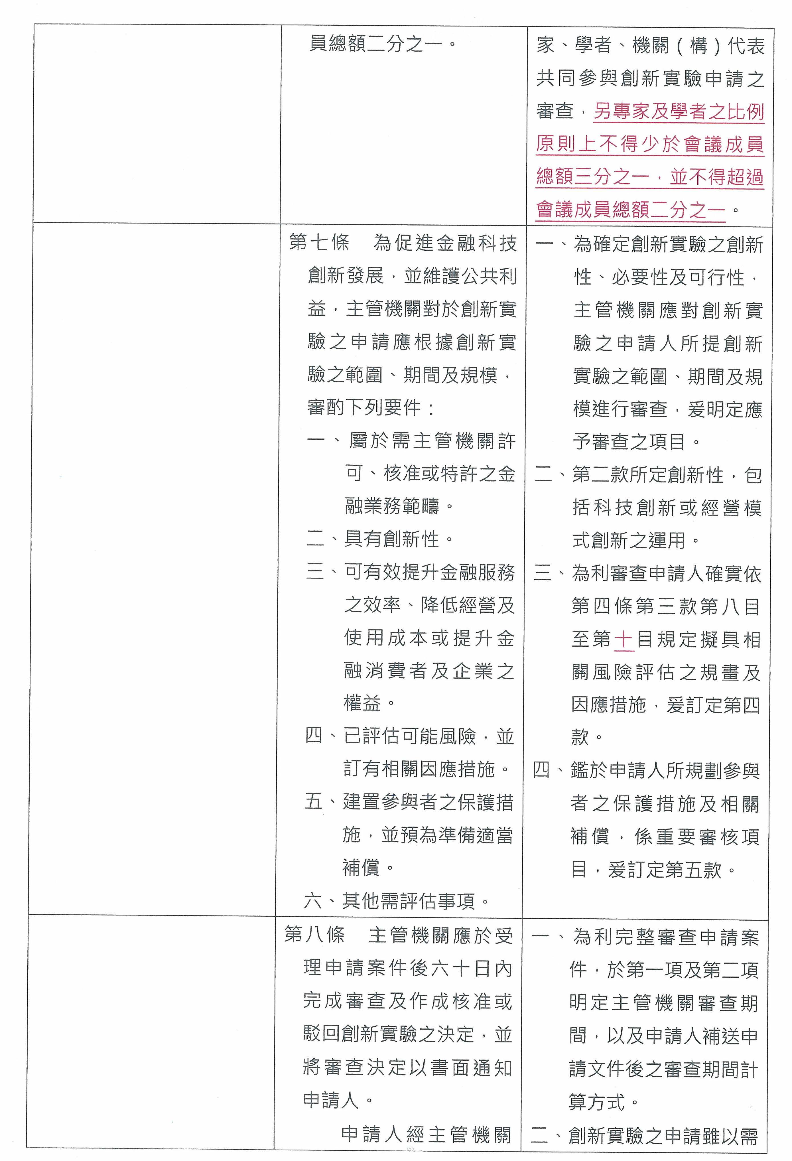 柯委員建銘:基本上金融沙盒裡面有兩個機制是非常重要的,將來這個法通過以後,行政院金管會無可避免地要擔負起所有責任,會成立專責辦公室嘛!這個專責辦公室裡面的成員等一下再講,我們用附帶決議來處理,這只是第一個機制嘛!第二個機制,最重要的在於,所有送進來的案子是由誰審查?假如是由外部委員審查,基於責任政治,我們認為應該回復到行政院的版本。曾銘宗委員的版本裡面是寫外部委員要超過二分之一,我們改為外部委員不得超過二分之一,但至少要達三分之一,為什麼是這樣子呢?坦白講,假如從金管會的角度來看,事實上金融科技在改變,必須要有科技人才,各方面的專業人才也要進來,當然在委員裡面也可以讓金管會有處理的空間,我們不希望只是站在單一行政部門的角度來看待這個事情,因為整個型態在改變,外界要有學者專家進來,我想這方面的學者專家大家也統統都認識。要用這樣的機制,基於責任政治,我們認為這是很重要的,也不要說都是外面的人在審,萬一出事了誰要負責?