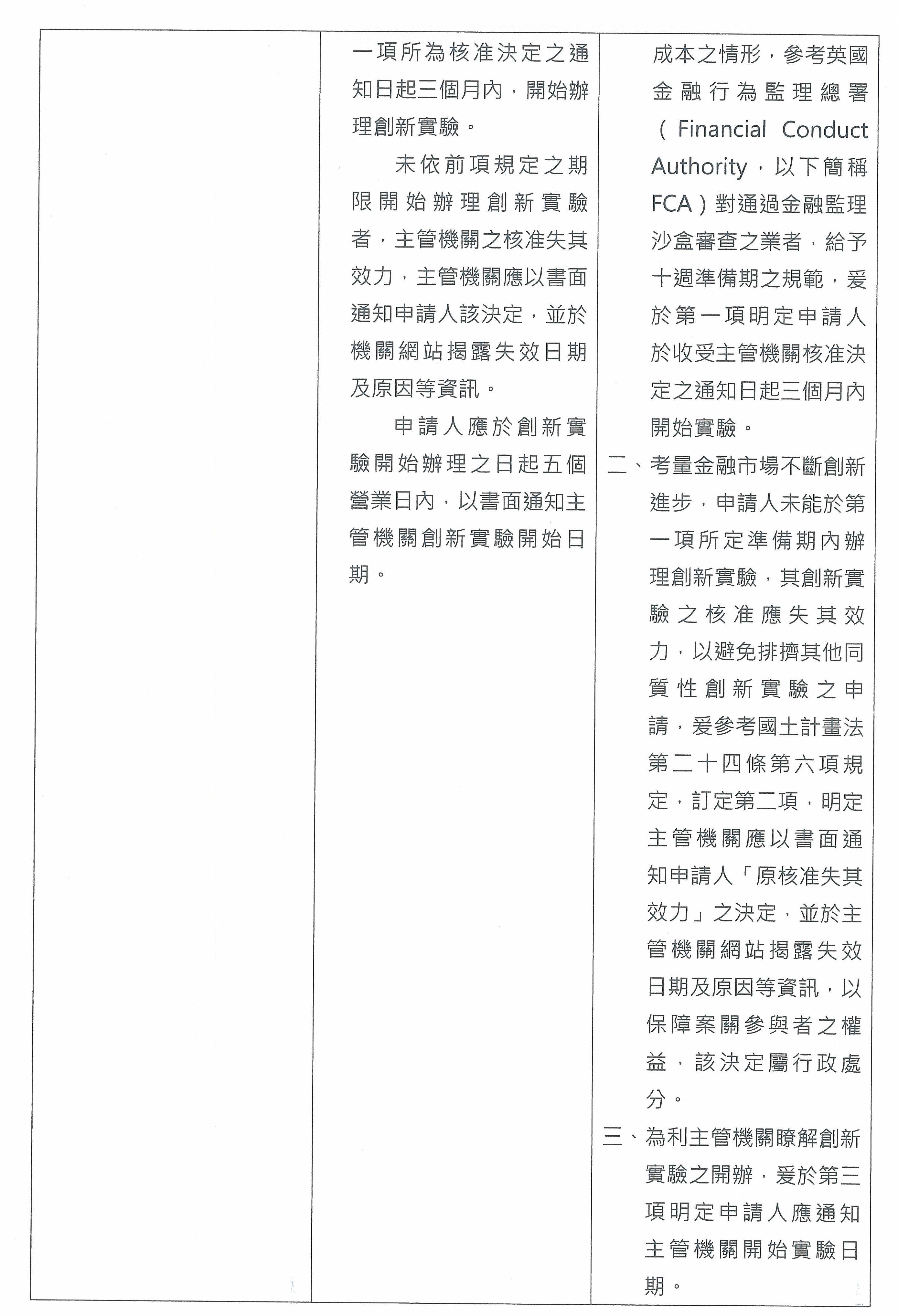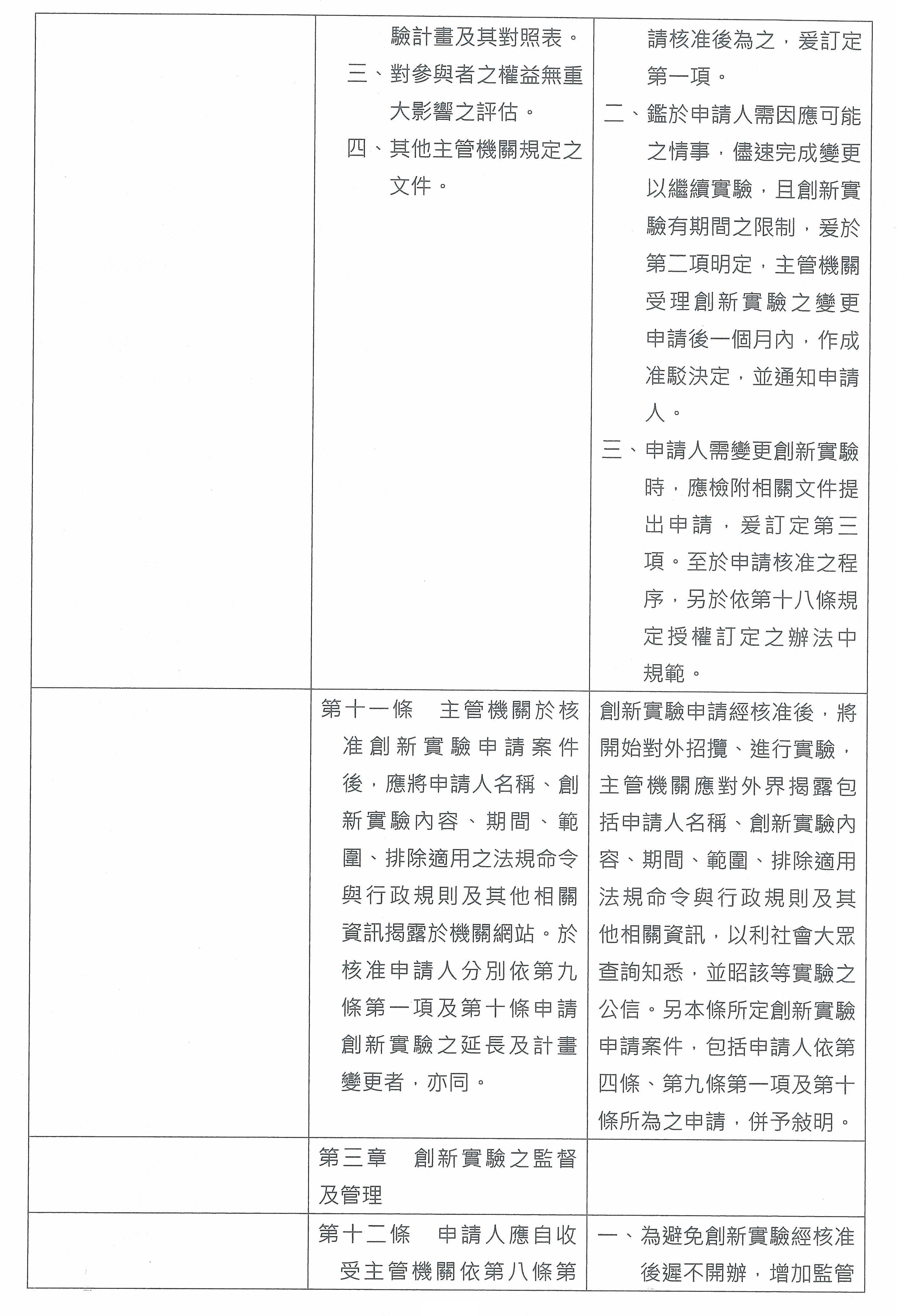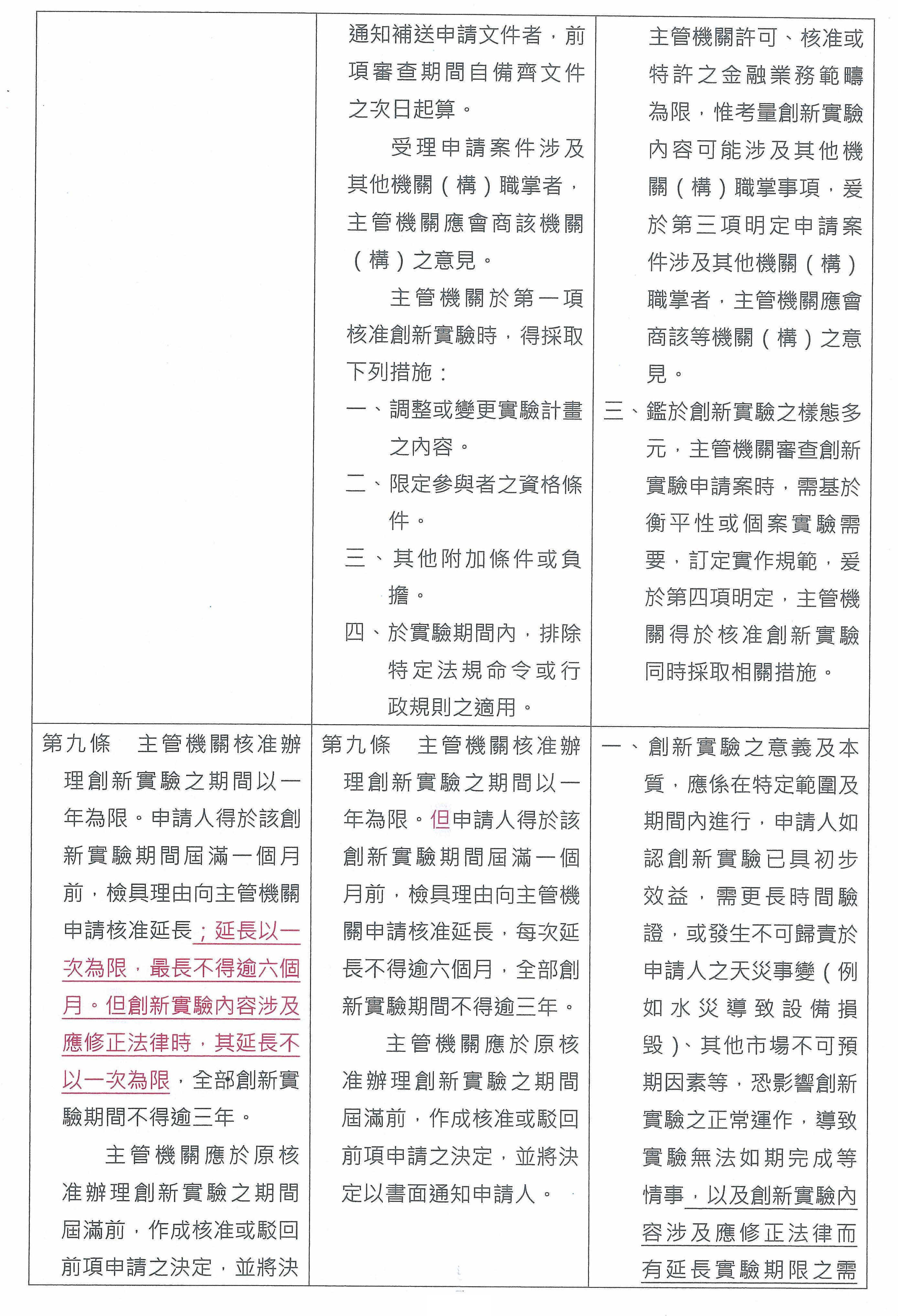 第三、有關實驗時間方面,其實全世界最長的實驗時間就是發生在臺灣,依照英國的規定是半年,而我國卻訂定實驗時間為3年,這實在是世界創舉。行政院版本提出實驗時間的規定是一年半,本席認為,大家之所以會希望實驗時間為3年的顧慮是,因為這個牽涉到法律調整的問題,如果實驗時間為3年的話,就要有但書,必須要有法律調整的問題,否則實驗時間就規定為3年,以上是第九條的部分。