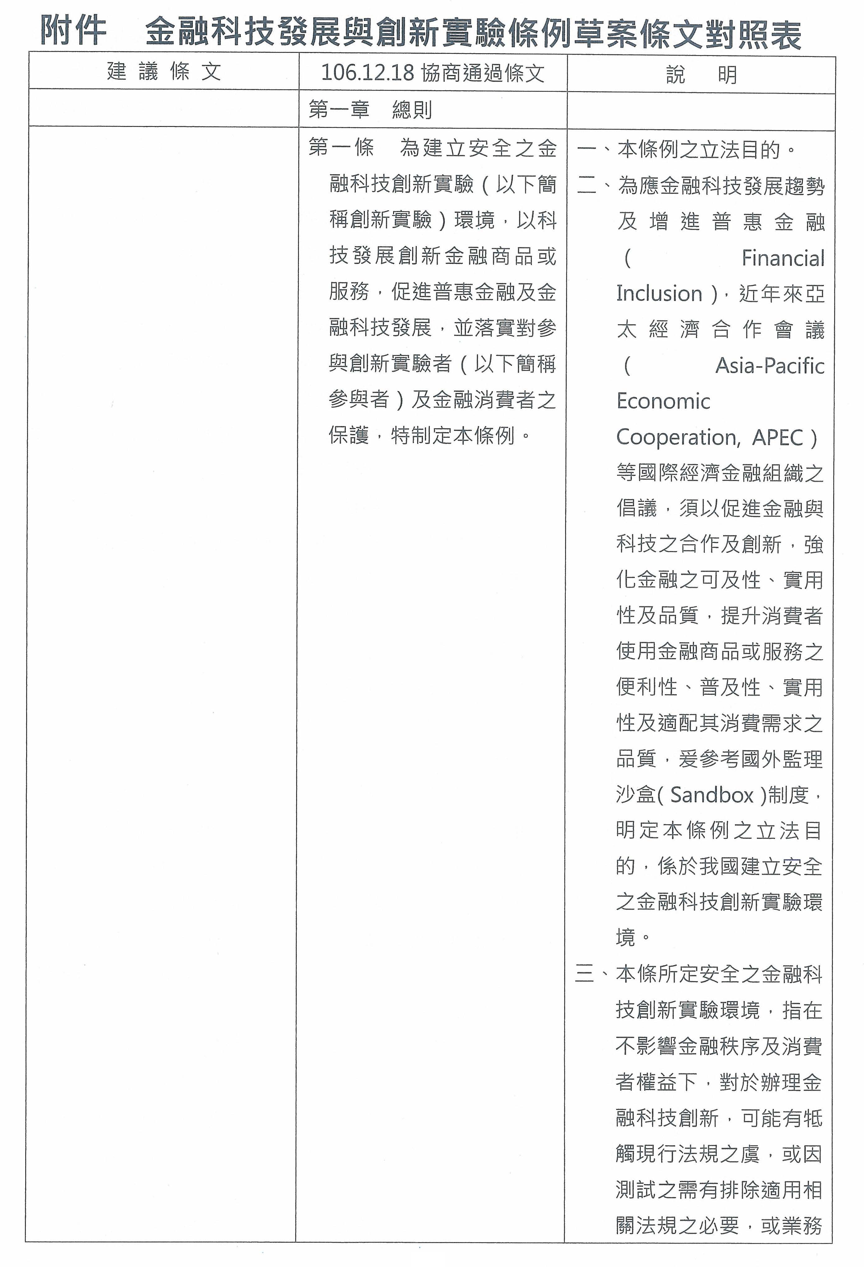 對於行政院版監理沙盒法案,我們黨團看了以後,有找法務部、金管會重新看待出委員會的版本,出委員會的版本各黨團黨鞭都還沒有簽字。我們瞭解立法院職權行使法的朝野協商分為兩個部分,第一個部分就是委員會先協商。委員會協商沒有結論時,就送院會做朝野協商。基本上,委員會的協商因為還沒有完全簽名,有關於金融監理沙盒方面,臺灣是大陸法系國家裡面第一個用法律條文來明訂的,金融監理沙盒在世界海洋法系的國家,包含英國、新加坡、馬來西亞以及香港等都有在處理,這跟FinTech有關係。所謂沙盒就是在現在法律條文以外,先做實驗的部分,所以我想所有的業界都很清楚,在金融監理沙盒中強調一個很重要觀念,即是負責的、安全的,以及對消費者與個資的保護。如果未來我國准許執行金融監理沙盒,譬如新加坡到目前為止只有一個案子可以申請金融監理沙盒,但根據副主委在接受媒體訪問時,未來我國可能會有10家提出金融監理沙盒之申請,無論會有多少家公司提出申請都無所謂,在面對如此新的環境時,我們希望FinTech除了在固有的法律基礎之下,能夠突破一些問題,這是大家共同的看法。