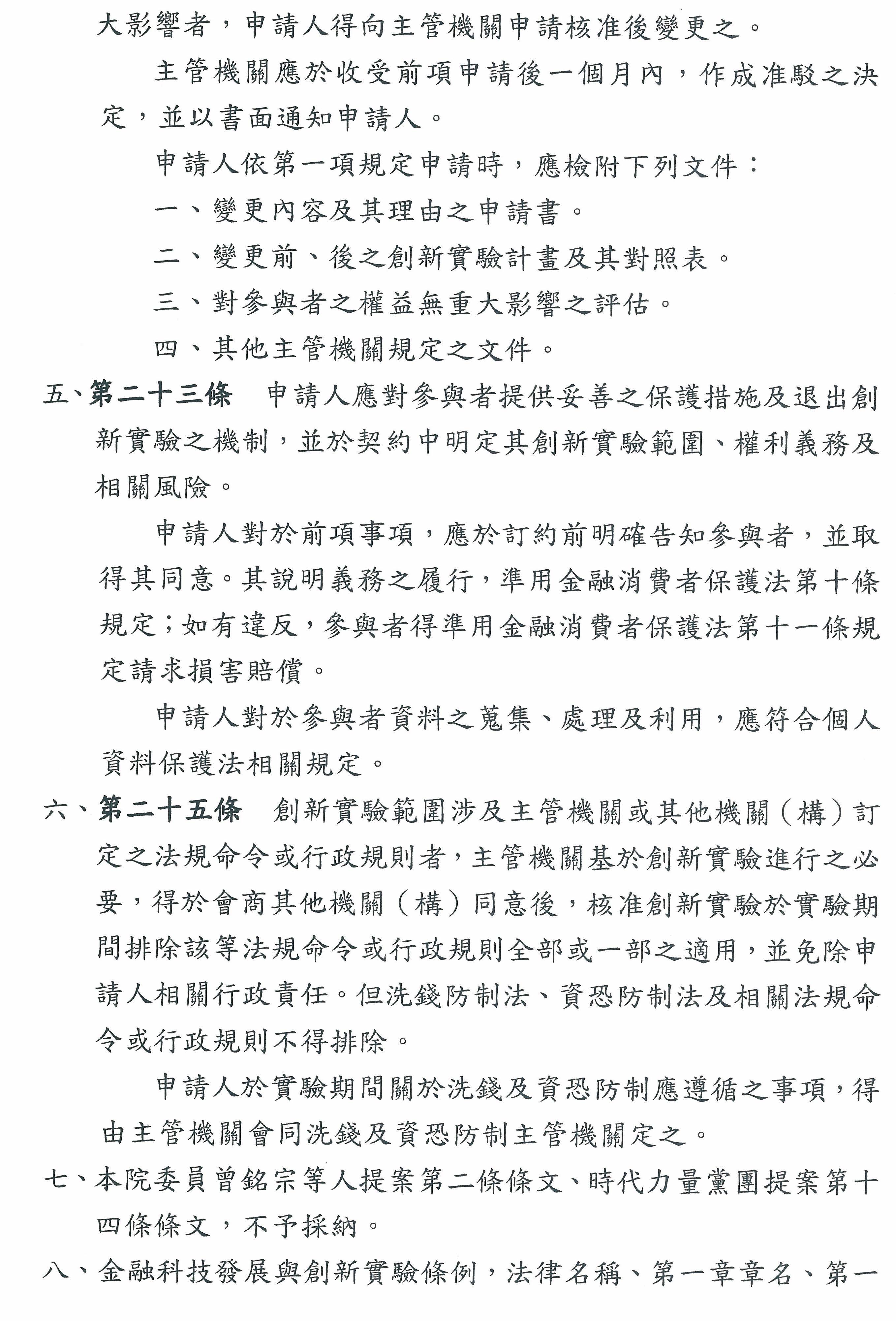 曾委員銘宗:謝謝剛才柯總召的說明,這個是在財委會審查的共識,這是第一點報告。第二點,其實外部的專家學者不得少於二分之一,審查過之後還要經過金管會的核准,如果實施後真的有狀況,第十五條有規定,是可以喊停的,所以基本上這個機制已經設計得很完整了。最後一點,專家學者不得少於二分之一的這一條很有象徵意義,就是要鼓勵創新,可是政府機關本來就不太想創新,如果能讓專家學者進來,就算進來還是可以把關。這種有象徵意義的條例是叫金融試驗條例啦!這是鼓勵金融業的創新啊!假設民進黨連這麼有象徵意義的條文都不願意過,也OK,我認為那就不要訂,因為這個條例意義就不大!你也講了,新加坡有一個了,我真的要跟你報告,要適用這個條例有什麼你知道嗎?存款、匯款和募資,項目非常少,假設連這種有象徵意義的,你們都不願意,那就不要訂,我的案子我撤回去,好不好?撤回去不要訂了?