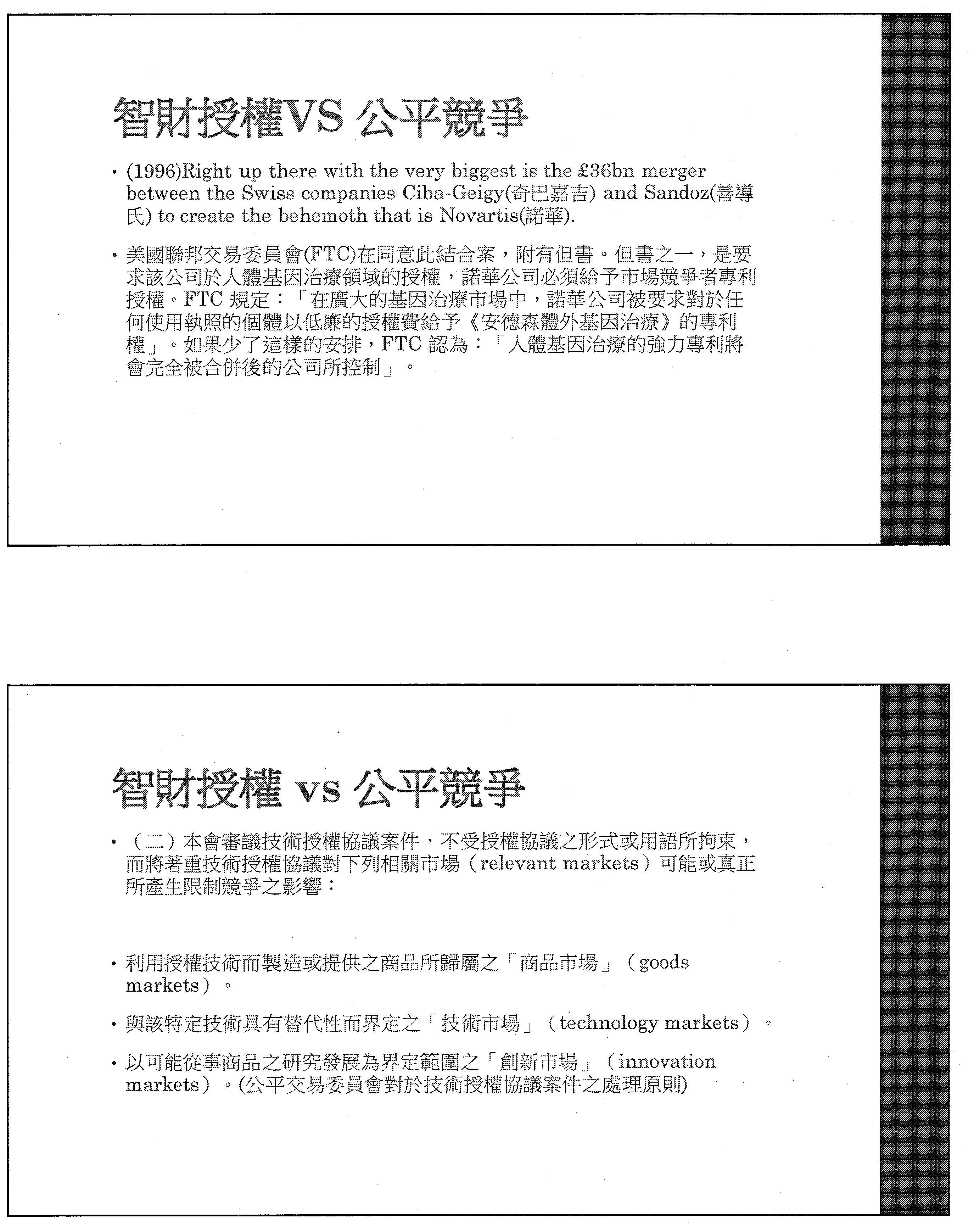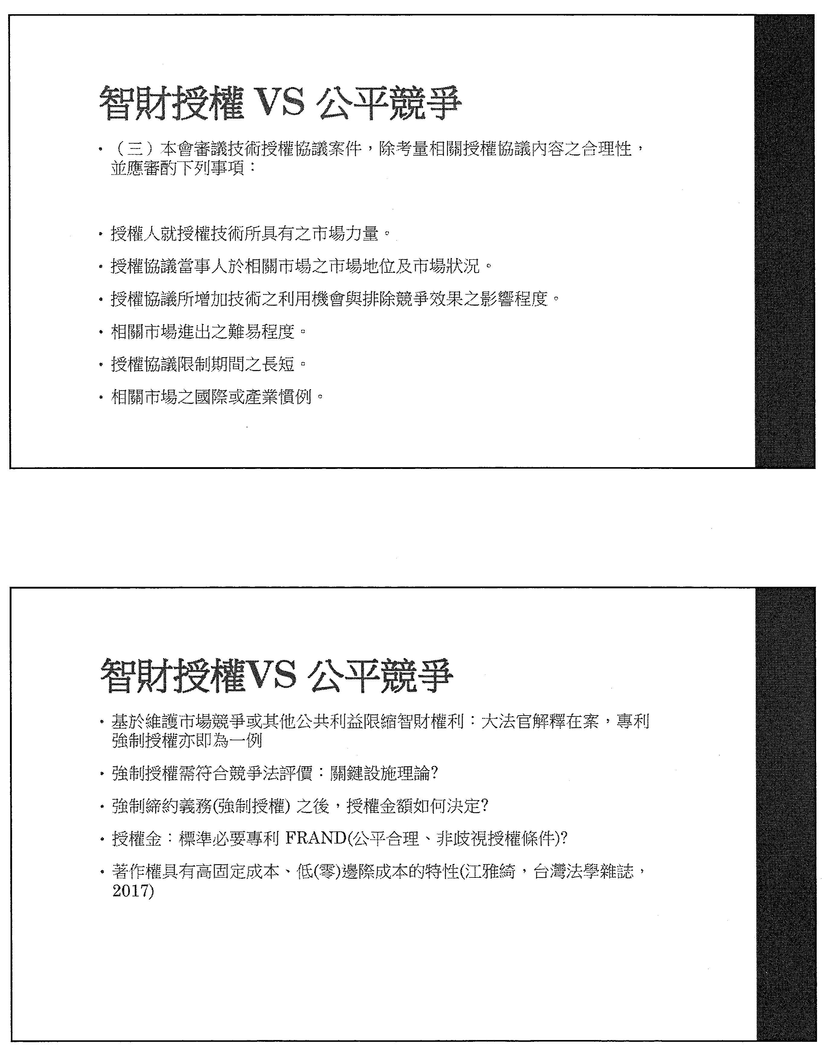 其次,近年來大家非常關心一個問題,就是智慧財產權授權跟公平交易競爭之間的關係。當然,最近大家都知道高通授權案,我相信之前先進也一定提出非常多觀點,我想另外提出的是,例如著作權授權和專利授權不一定是完全一樣的思考模式。我們發現公平交易競爭的很多觀點不見得只是單單鼓勵智慧財產權的保障,比如說,我們看到上個世紀美國的聯邦交易委員會曾同意兩家大藥廠的結合案,但是當時已經預見這一件結合案未來會帶來主導市場很大的效果,所以聯邦交議委員會在同意這個結合案的時候下了一個但書,就是未來在基因治療市場中,希望結合以後的公司必須授權給市場上的競爭者,一方面保護智慧財產權創新的效果,另外一方面希望能夠維持市場上的公平競爭。