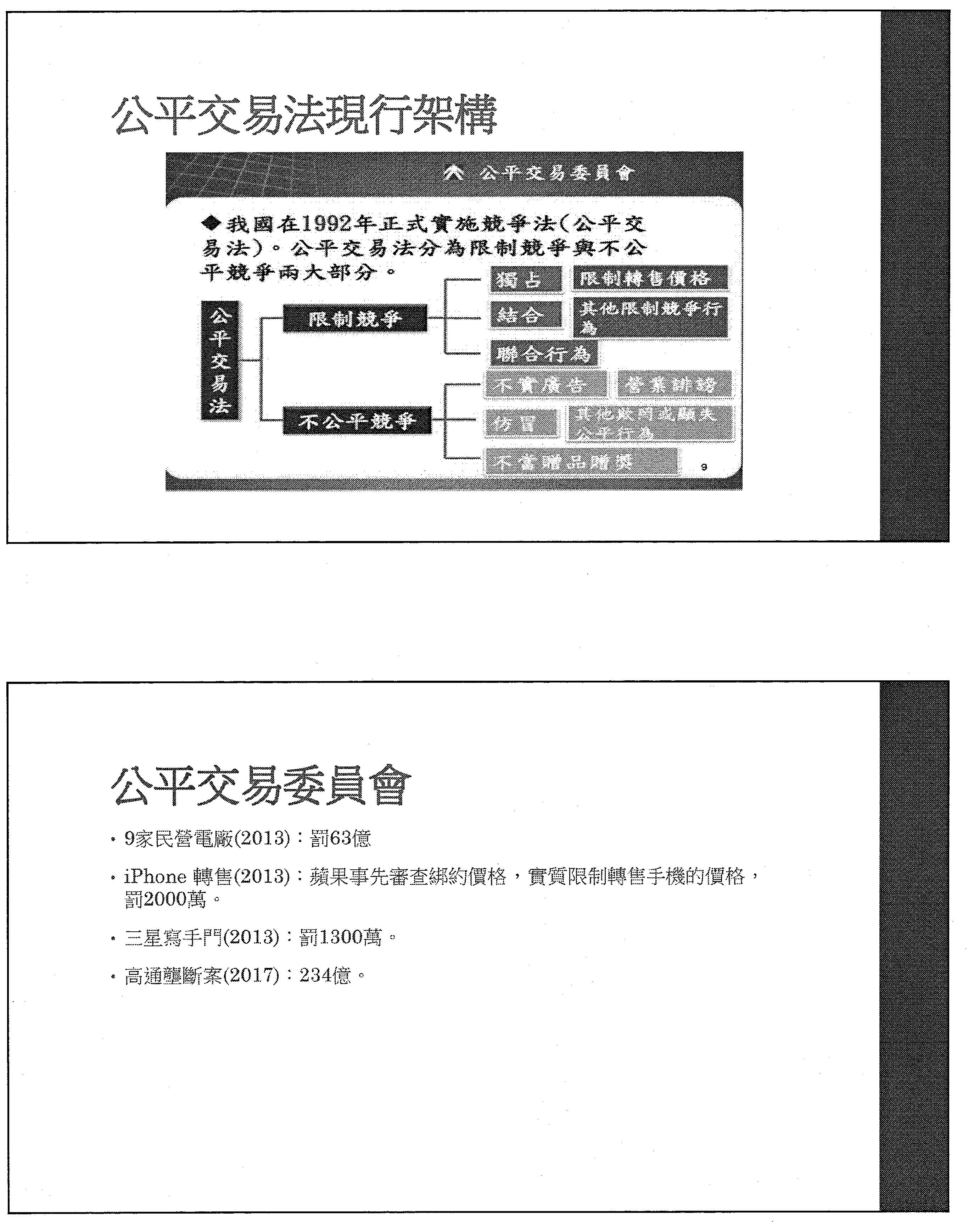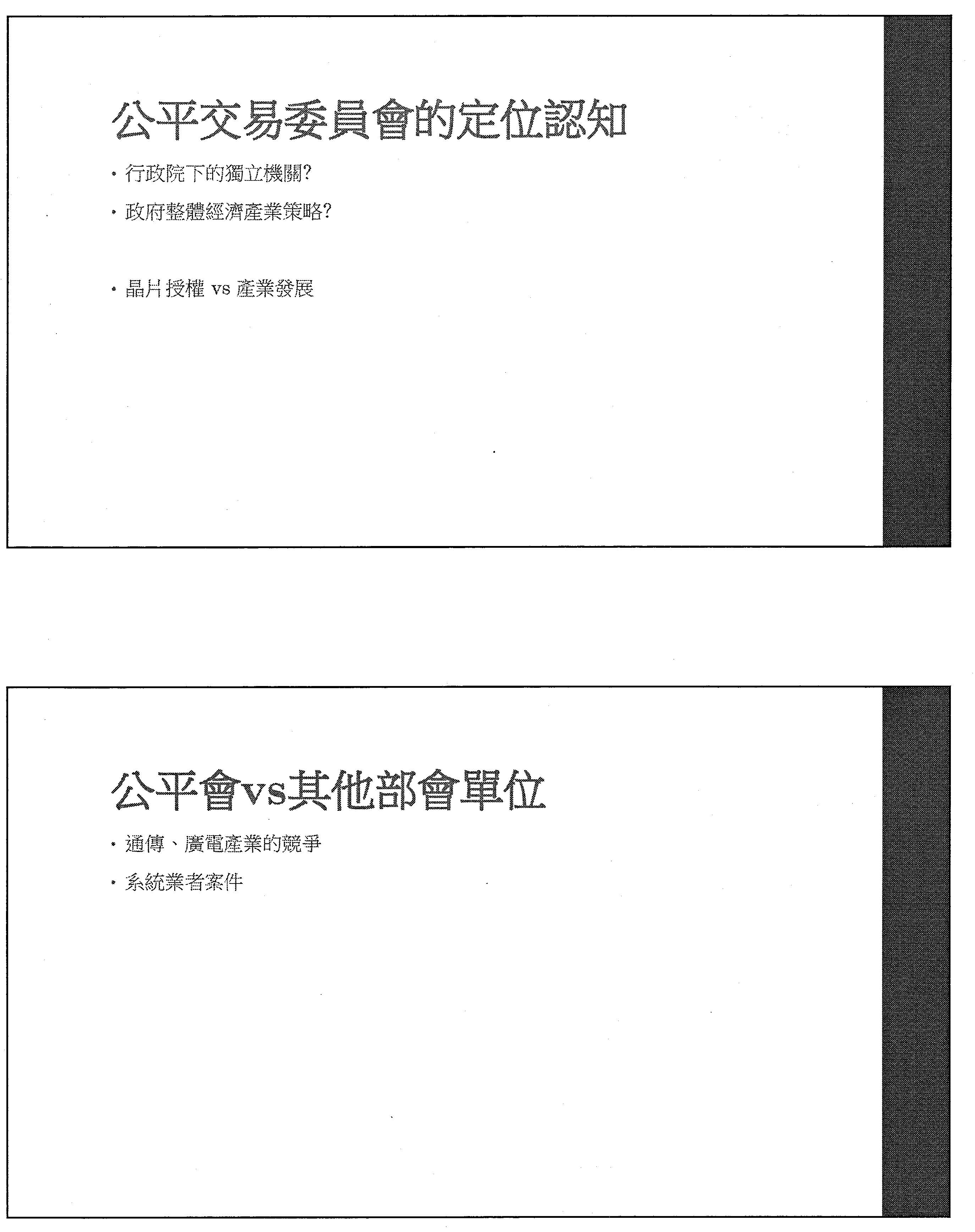 以下兩點是針對以前觀察公平交易委員會在執行職權上,作為一個行政單位在架構上需要思考和注意的地方。比如說,我們從高通案會發現,公平會的定義是在行政院下面的一個獨立機關,可是他同時也是行政院的一部分,所以在整體產業戰略上,公平交易法如同我一開始跟各位先進報告的,其實競爭政策本身就是國家整體經濟產業發展政策的一環,所以公平交易委員會要留意在未來的定位裡,是不是能夠更清楚的知道自己在獨立機關的架構下,其實也是整體產業跟經濟發展政策的一環。