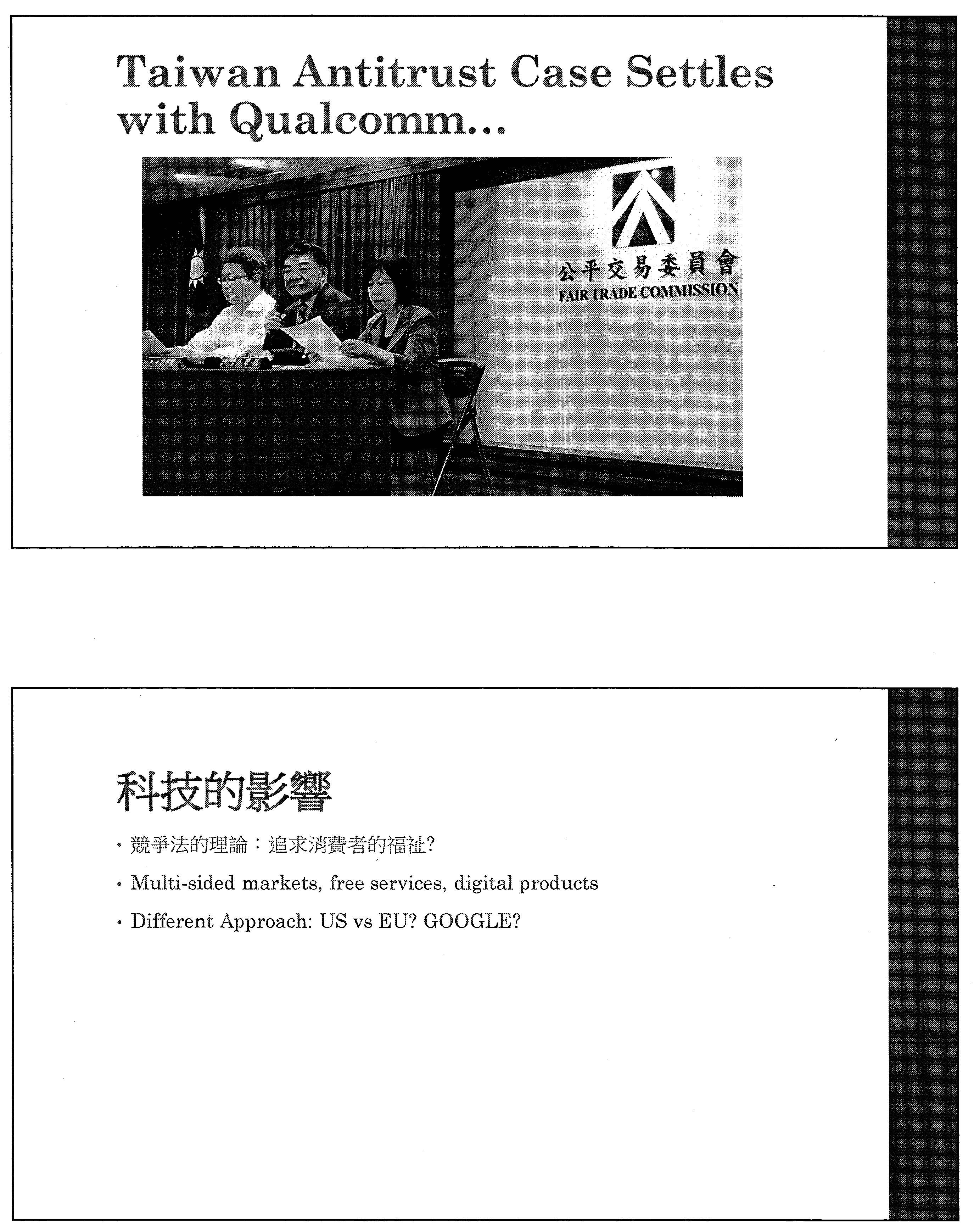 再就去年高通引起注目的案件之中,我們的公平交易委員會先通過高額的234億元的處分,但是最後又在訴訟的過程表示一些讓步。我注意到在這個過程之中,做出行政處分的時候,有幾位委員包含魏杏芳委員提出不同的意見書,在那個過程裡面,公平交易委員會對於高通原來就曾經提出來的和解要求,在做處分時認為可以不予理會,可是後來到行政訴訟的過程之中,又跟他們做出了和解,而且以產業的角度讓競爭法為了保護競爭秩序的機關似乎又扮演了經濟部應該有的角色。從這個過程,我個人認為也許我們看待未來的公平交易委員會在執行公平交易法的過程,尤其必須要去看待什麼時候該強硬、什麼時候該有必要的柔軟,讓柔軟的執法程序可以貫徹我們對於法律執行的意志,我覺得這非常重要。