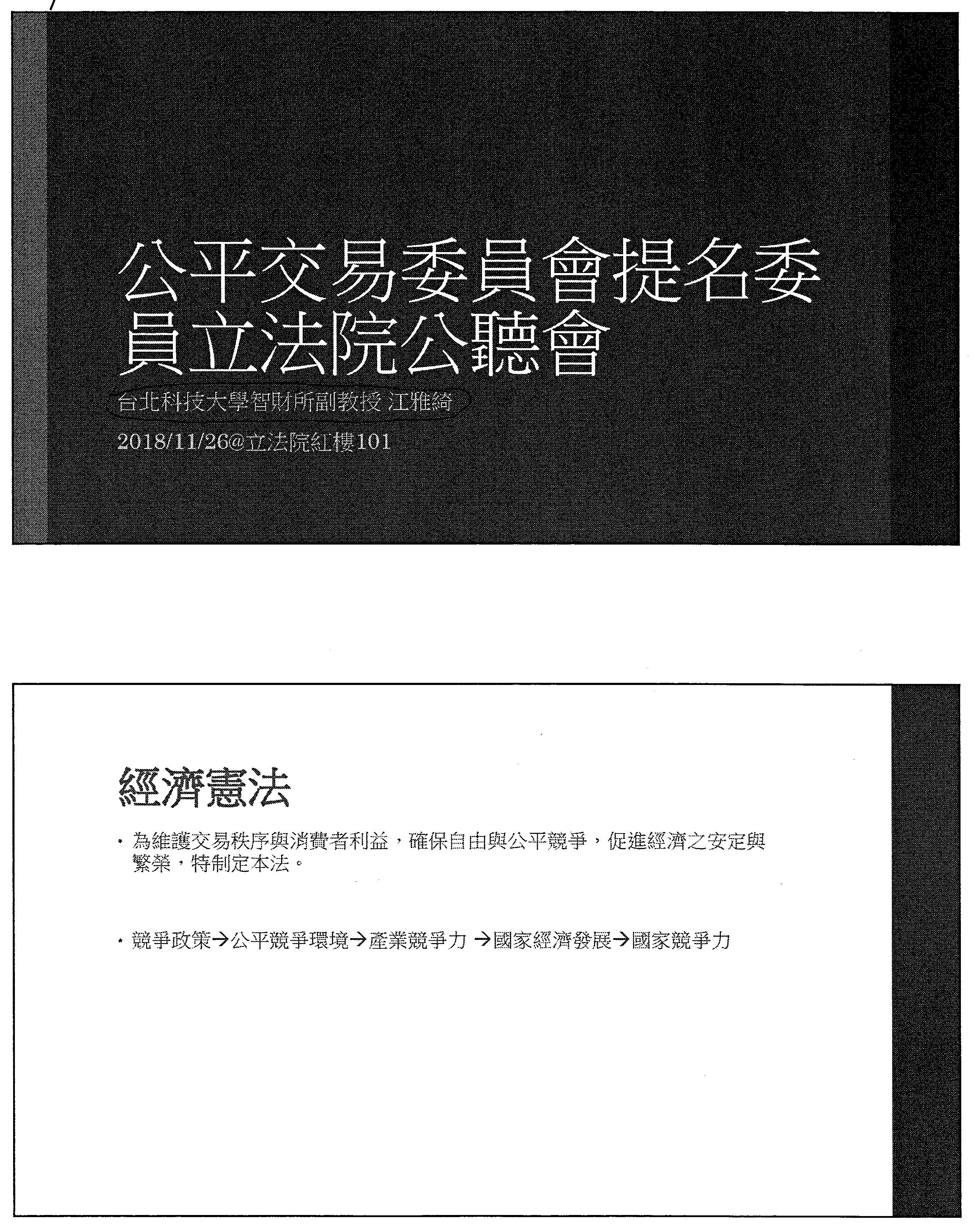 江雅綺副教授:主席、各位委員。今天非常榮幸可以參與審查公聽會。我們都知道公平交易法是經濟與法律的交界,號稱是經濟的憲法,所以作為法律的研究者以及人民,我認為公平交易法近年來在大家的生活裡扮演了愈來愈重要的角色,特別是一國公平交易法的競爭政策,能夠建立一個產業公平競爭的環境,一個公平的競爭環境是提升產業競爭力的基礎要素,產業的競爭力如果能夠提高,一個國家的經濟競爭力也必然因此而提高,所以我覺得公平交易法以及公平交易委員會站在經濟和法律的交界,在現代社會中扮演著非常重要的角色。