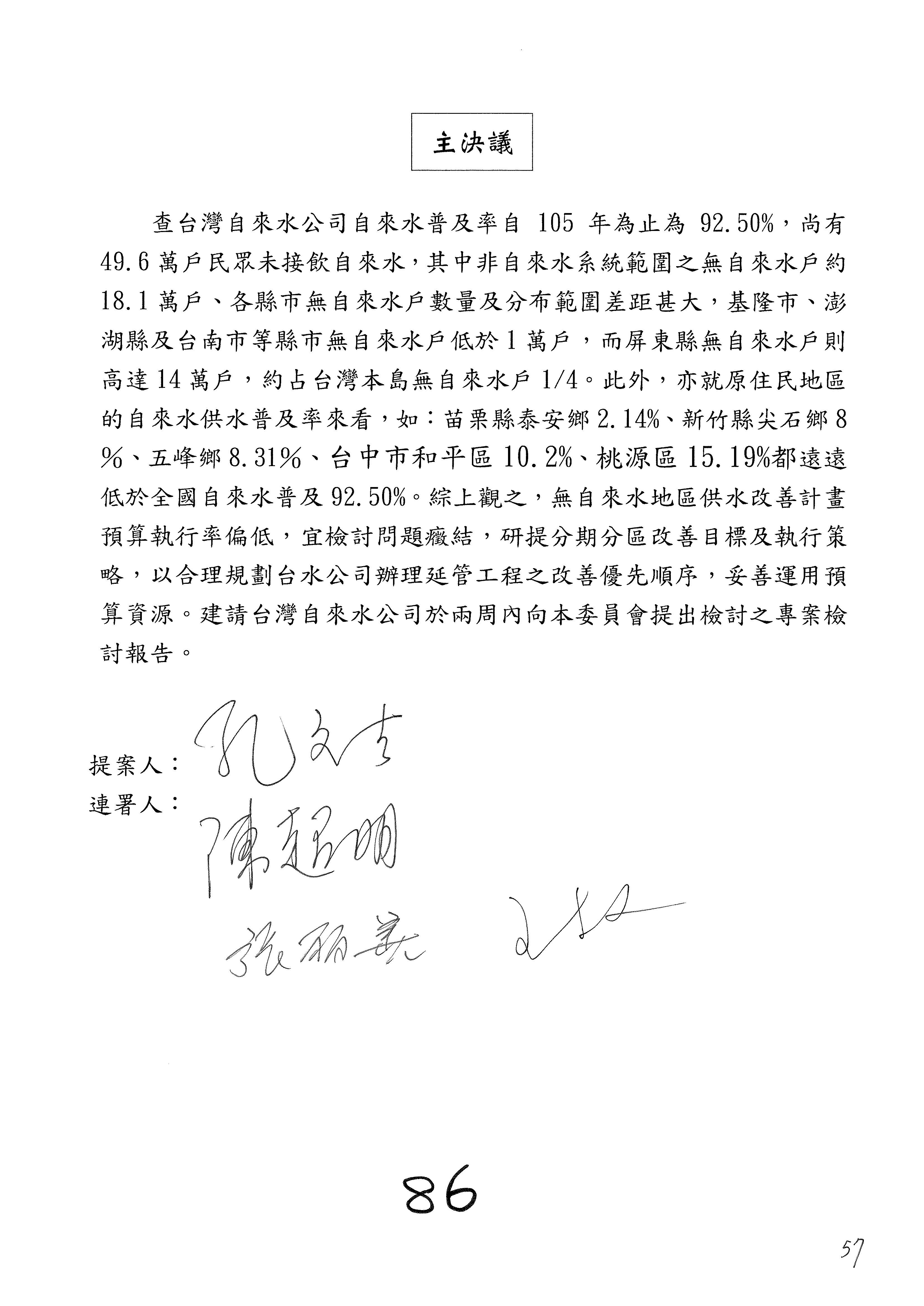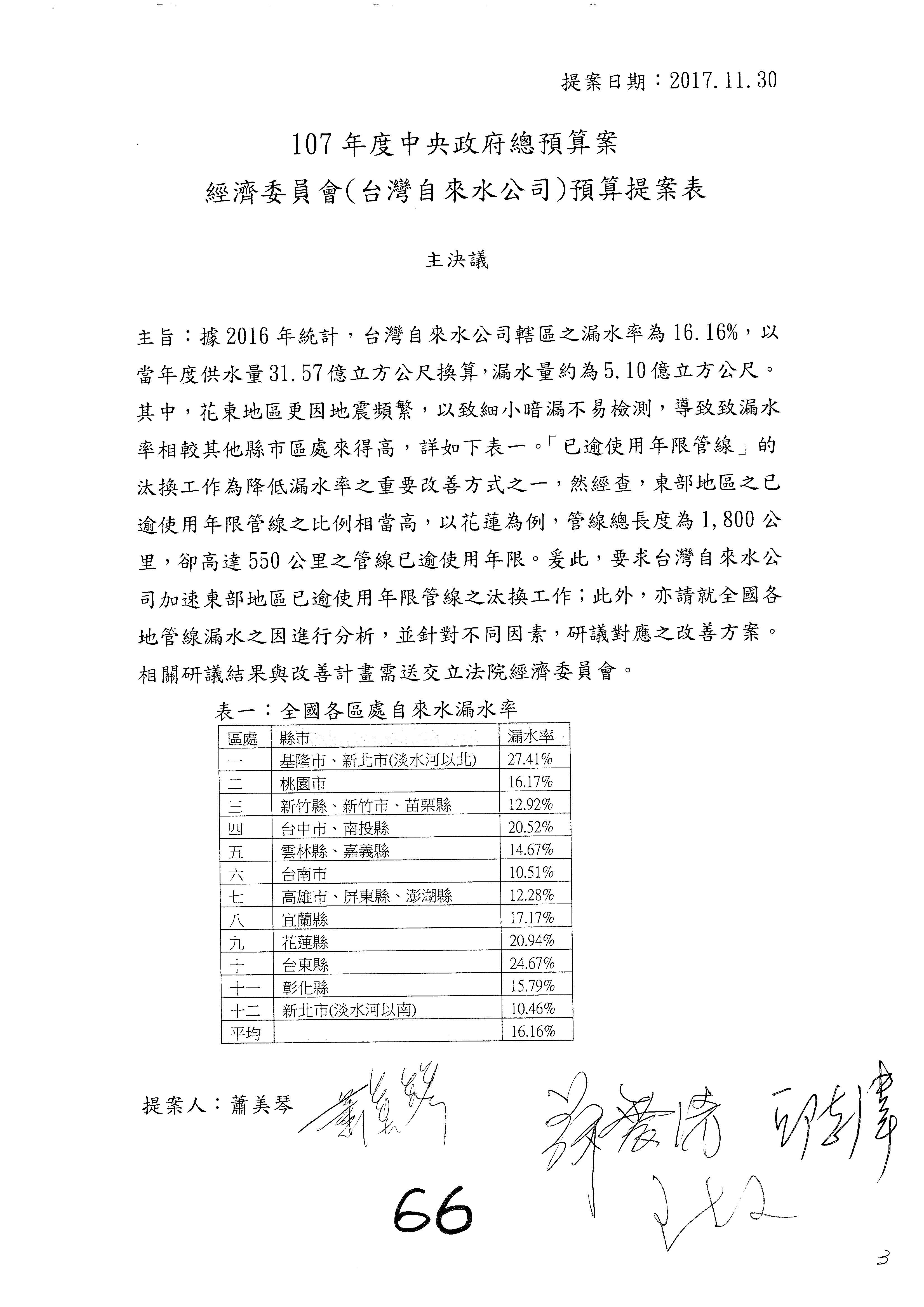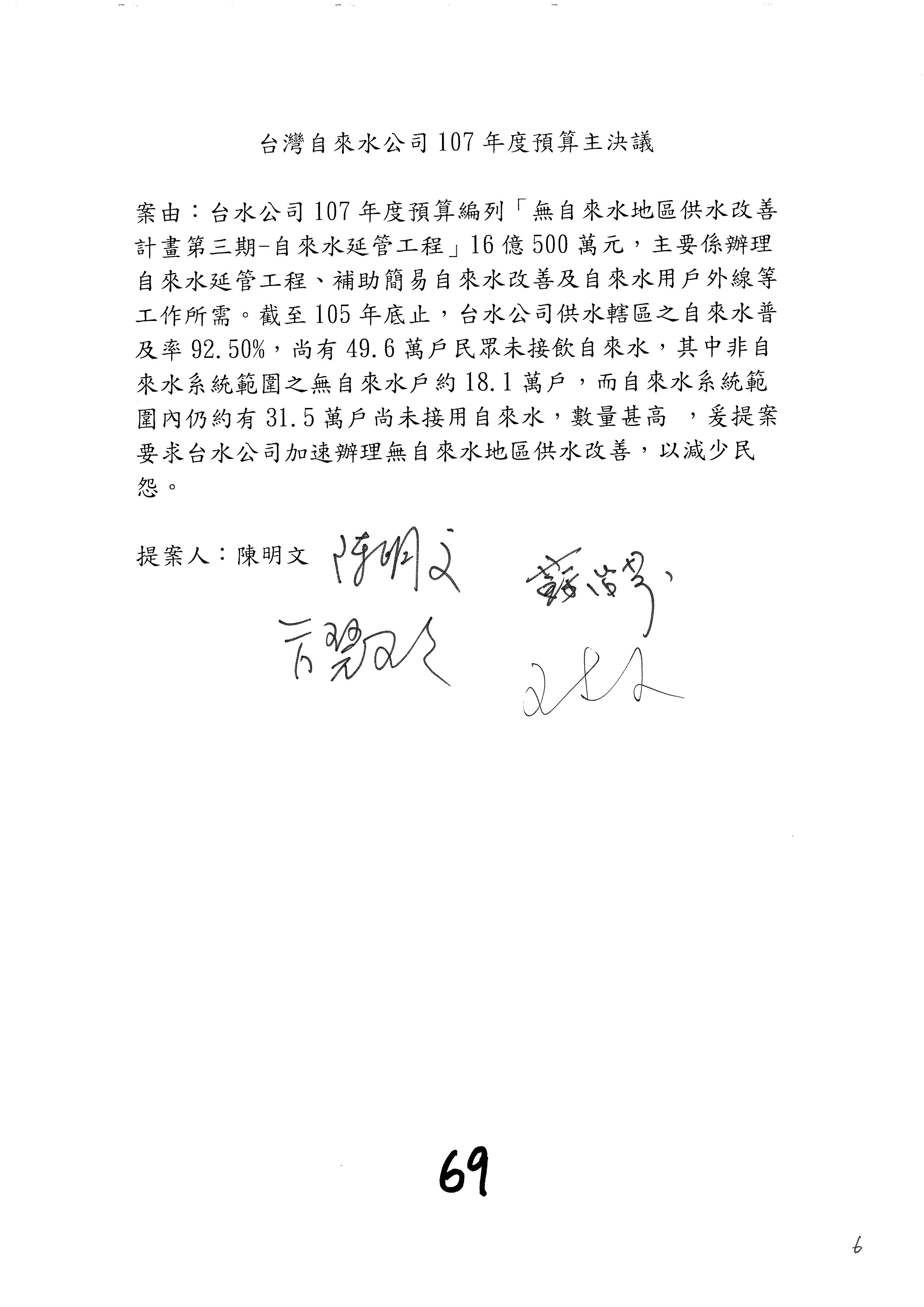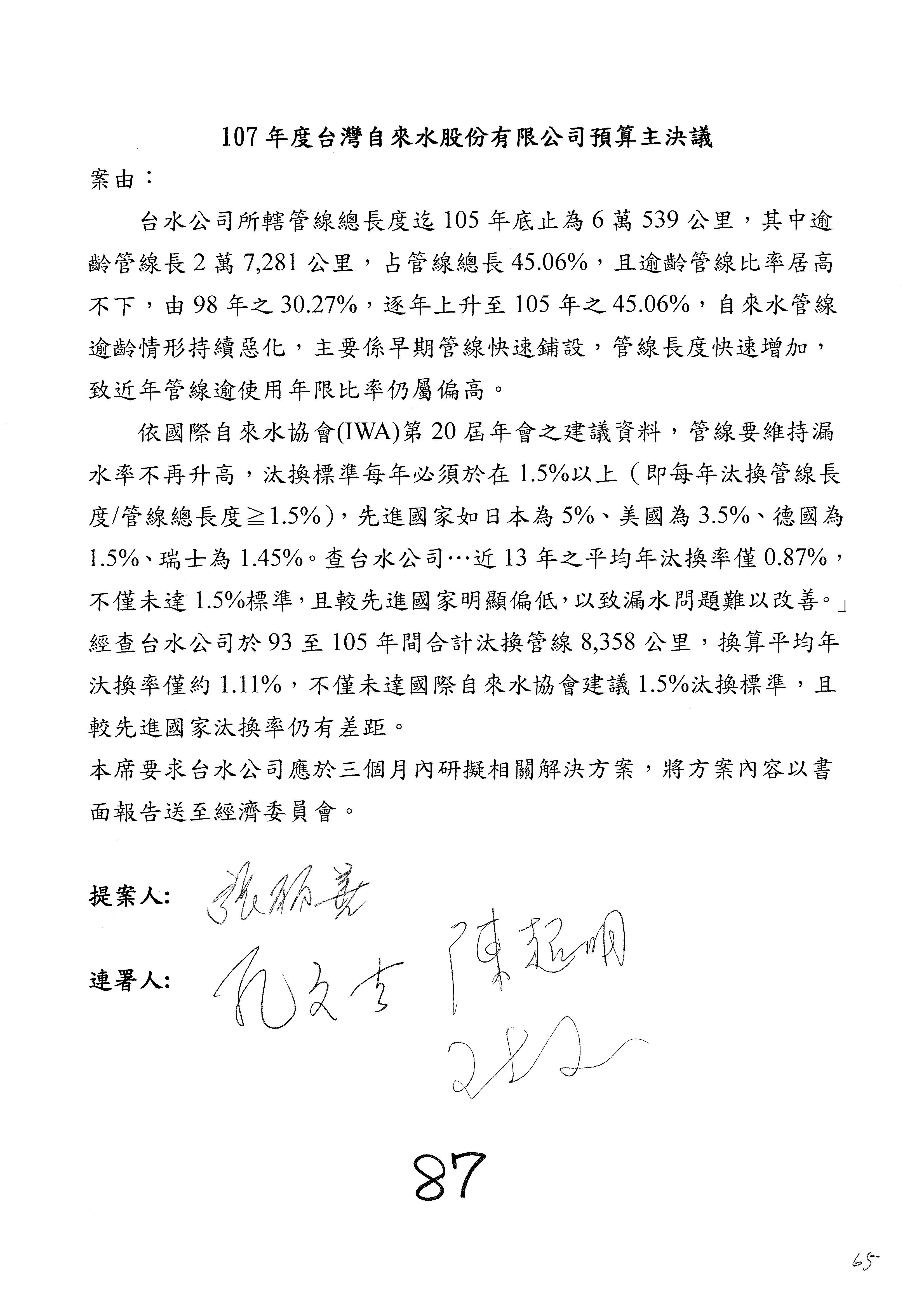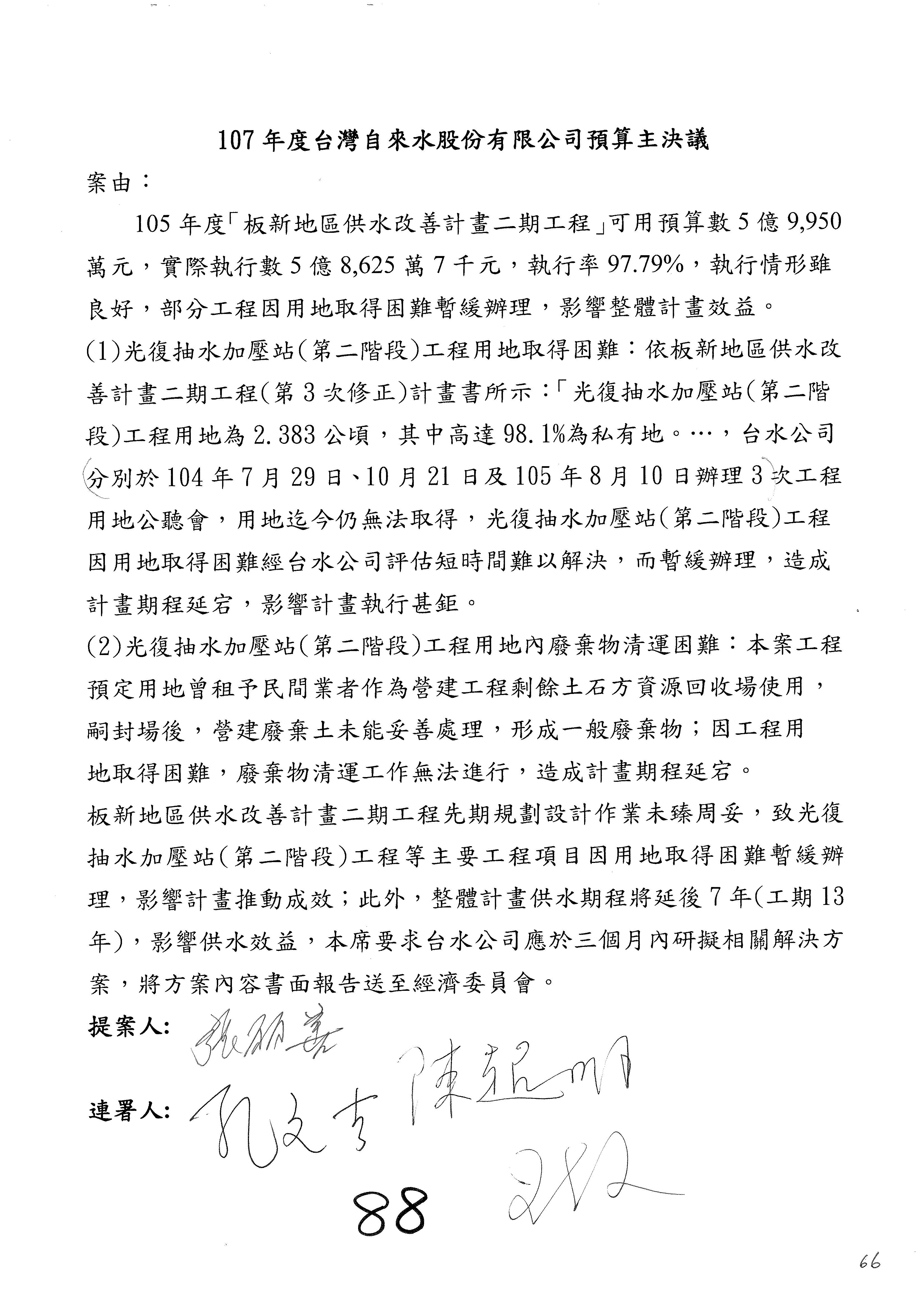 主席:我們繼續處理第66案的決議案。請問自來水公司的意見如何?