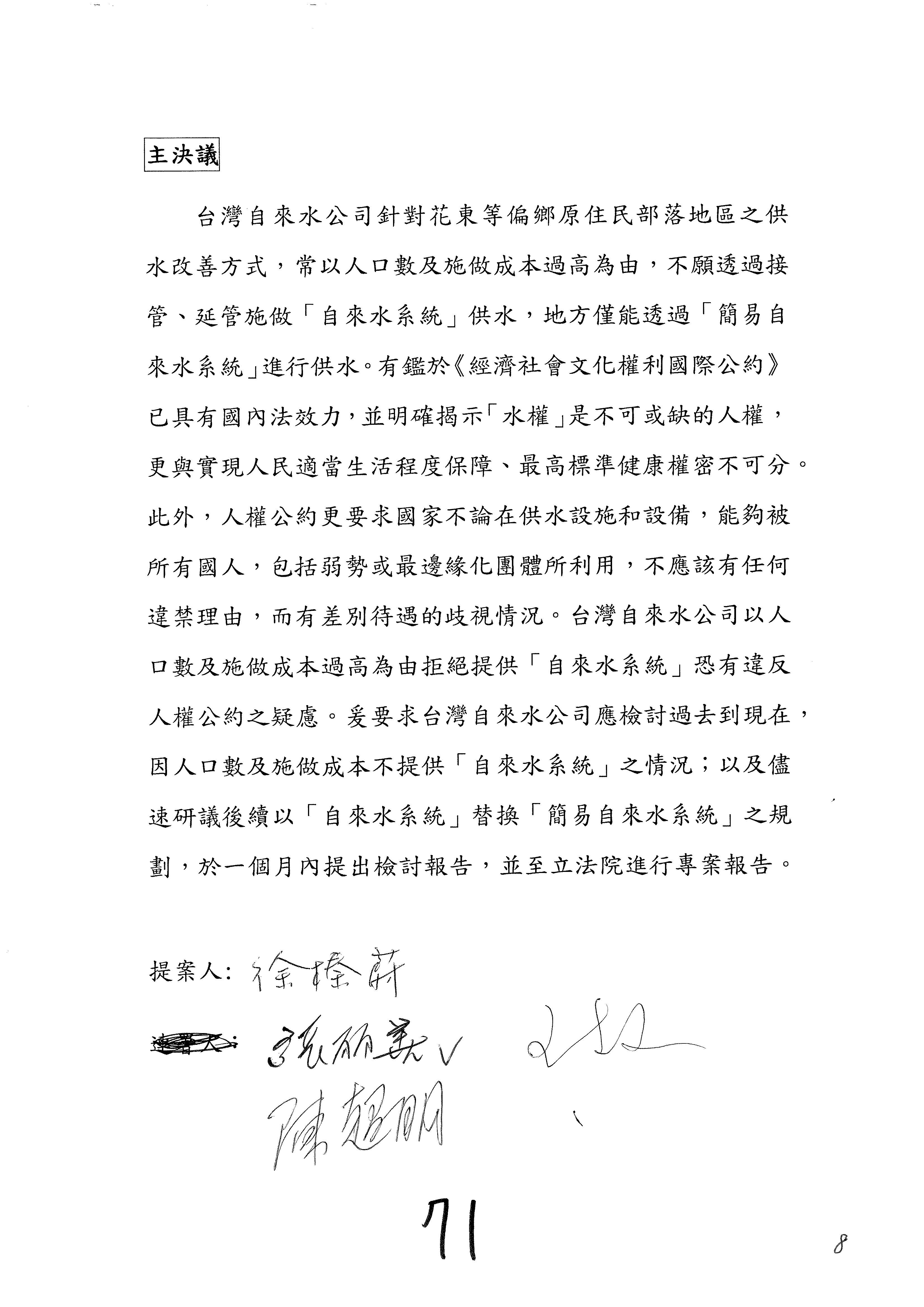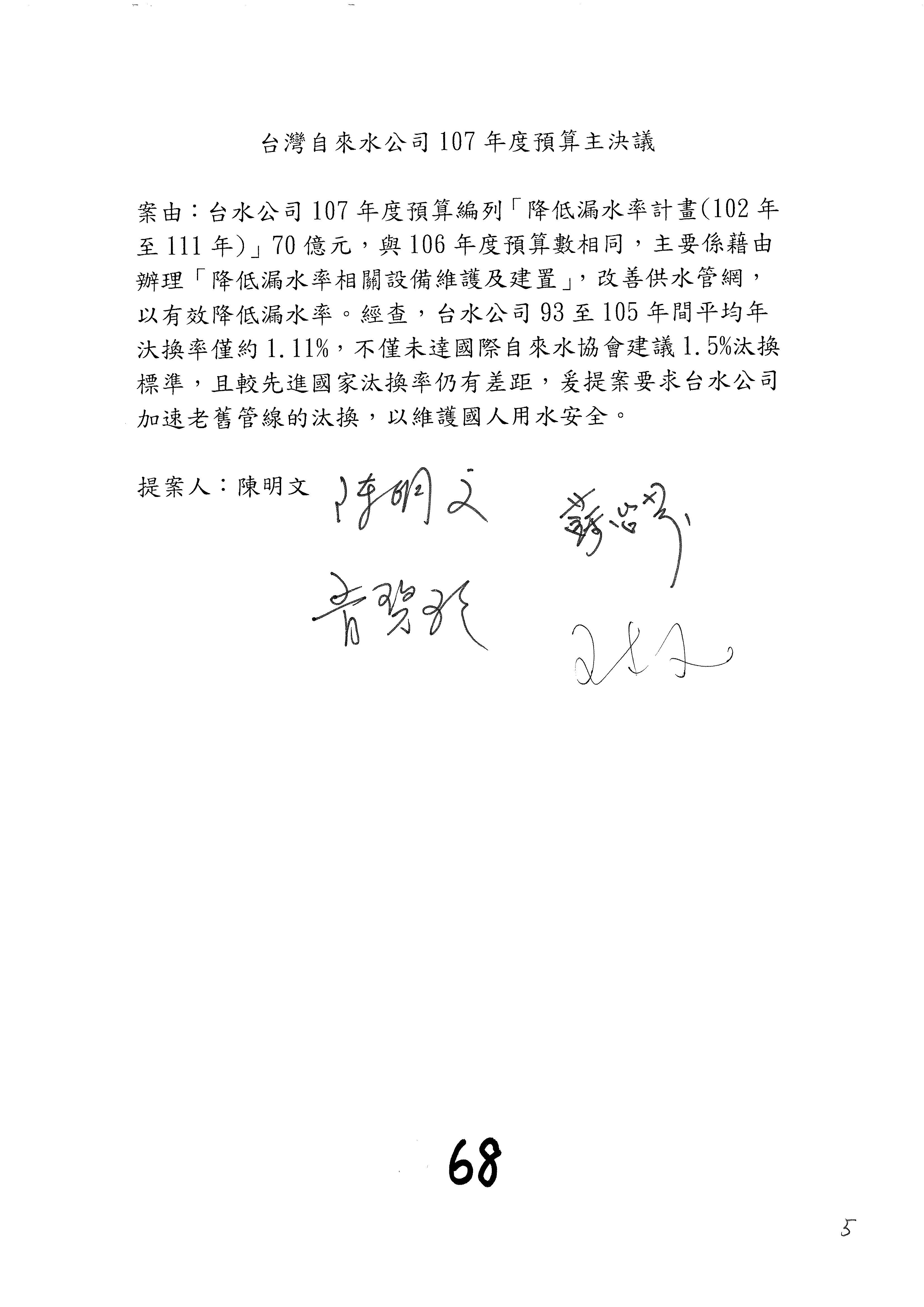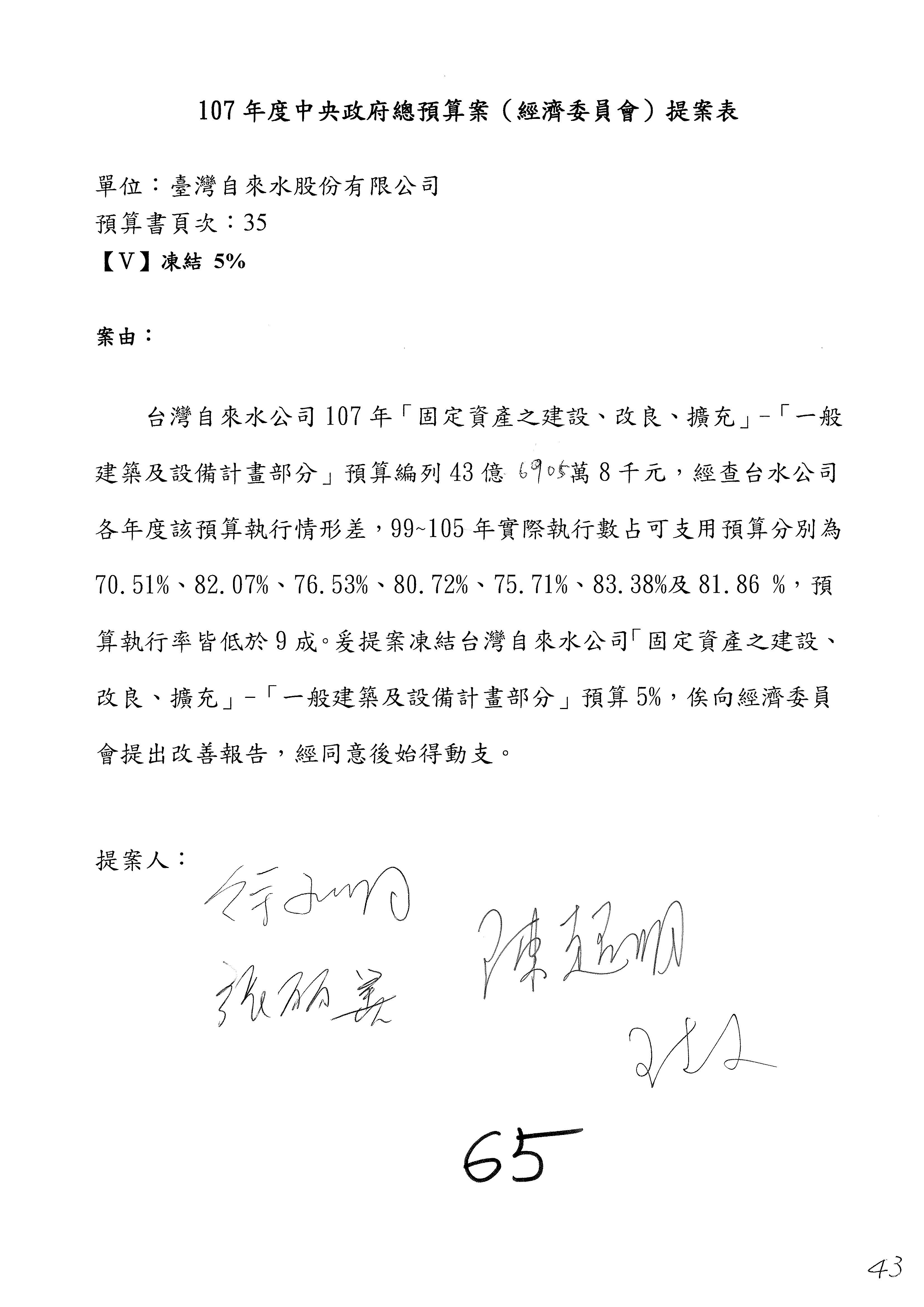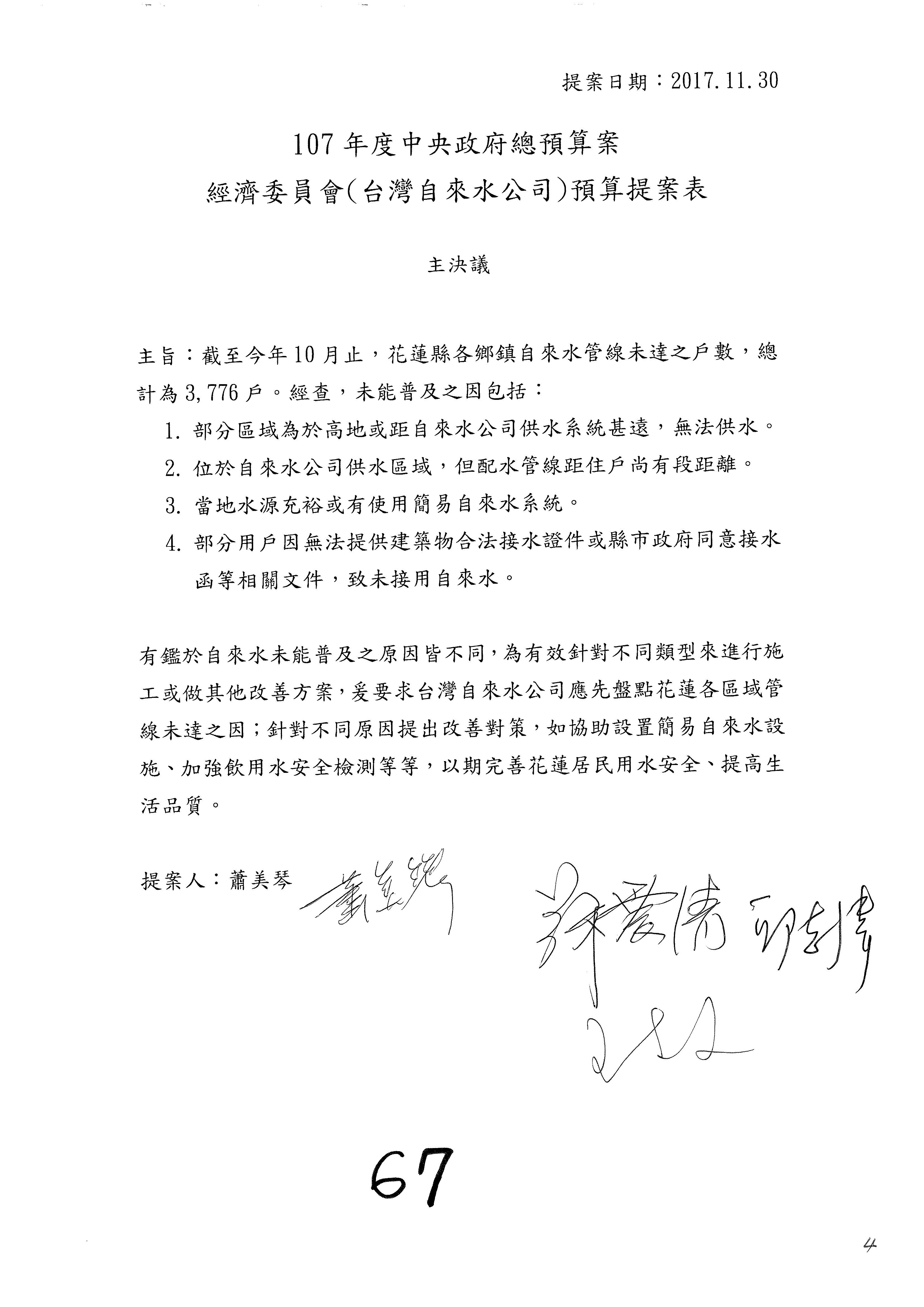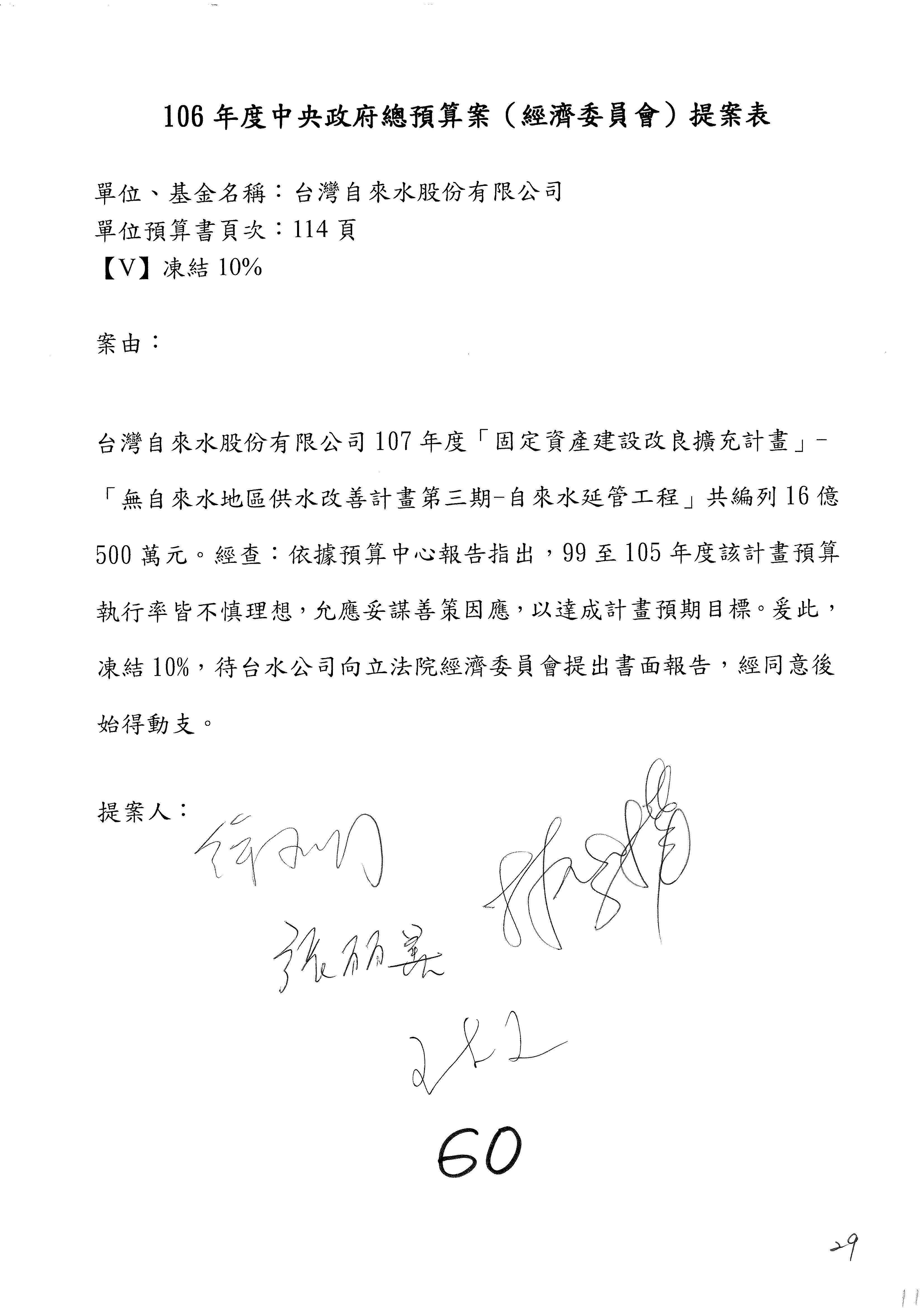 主席:我們繼續處理第66案的決議案。請問自來水公司的意見如何?