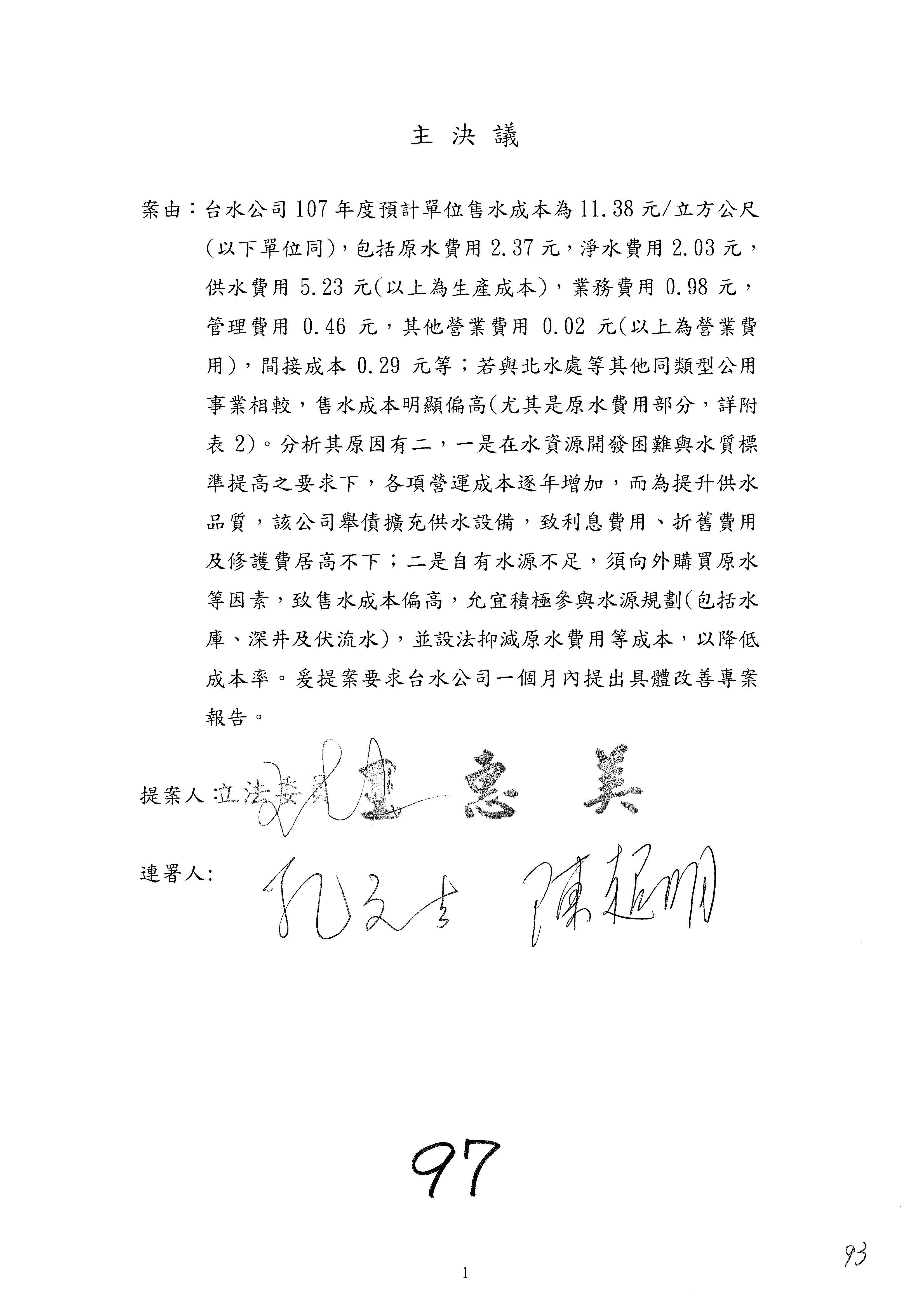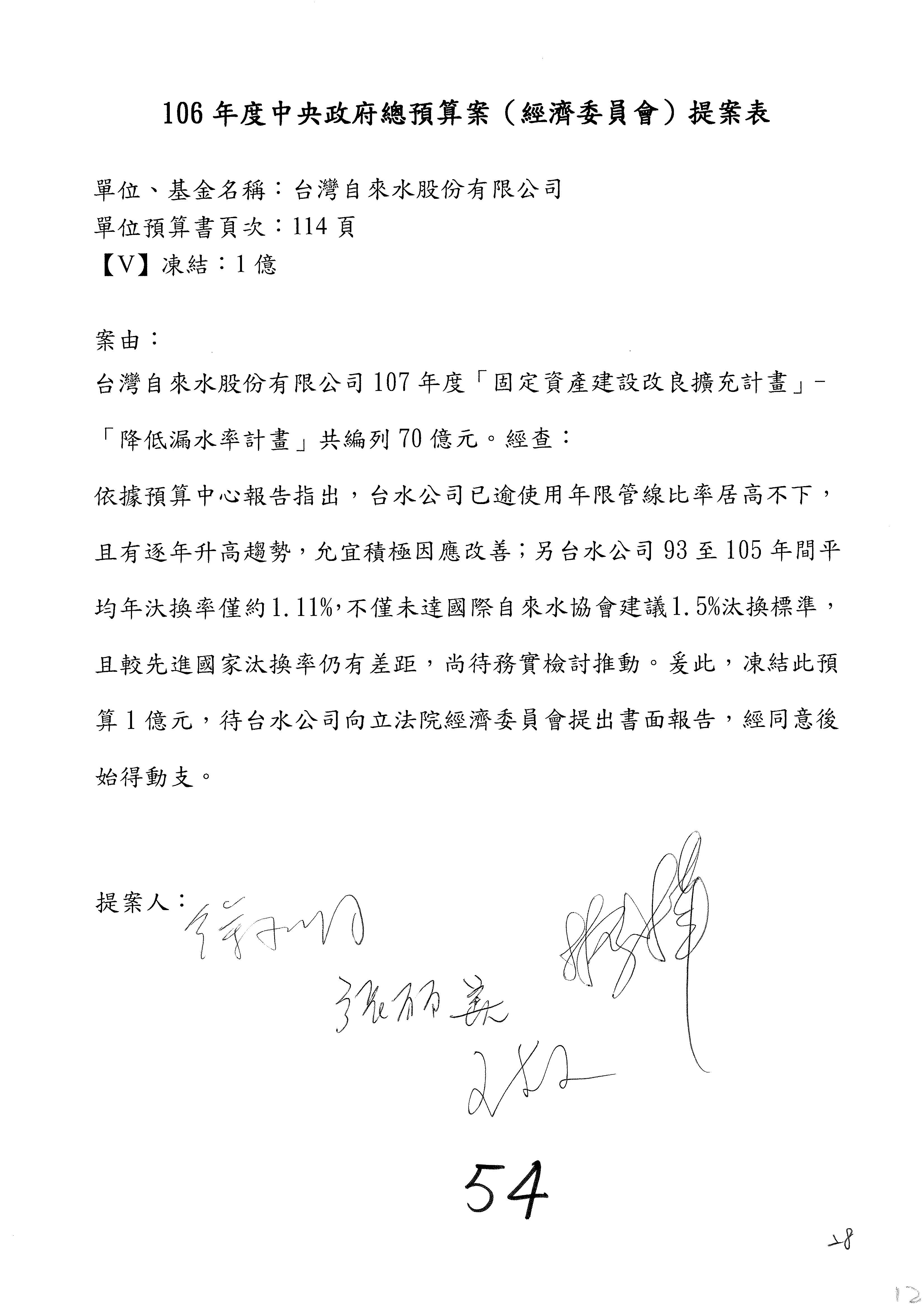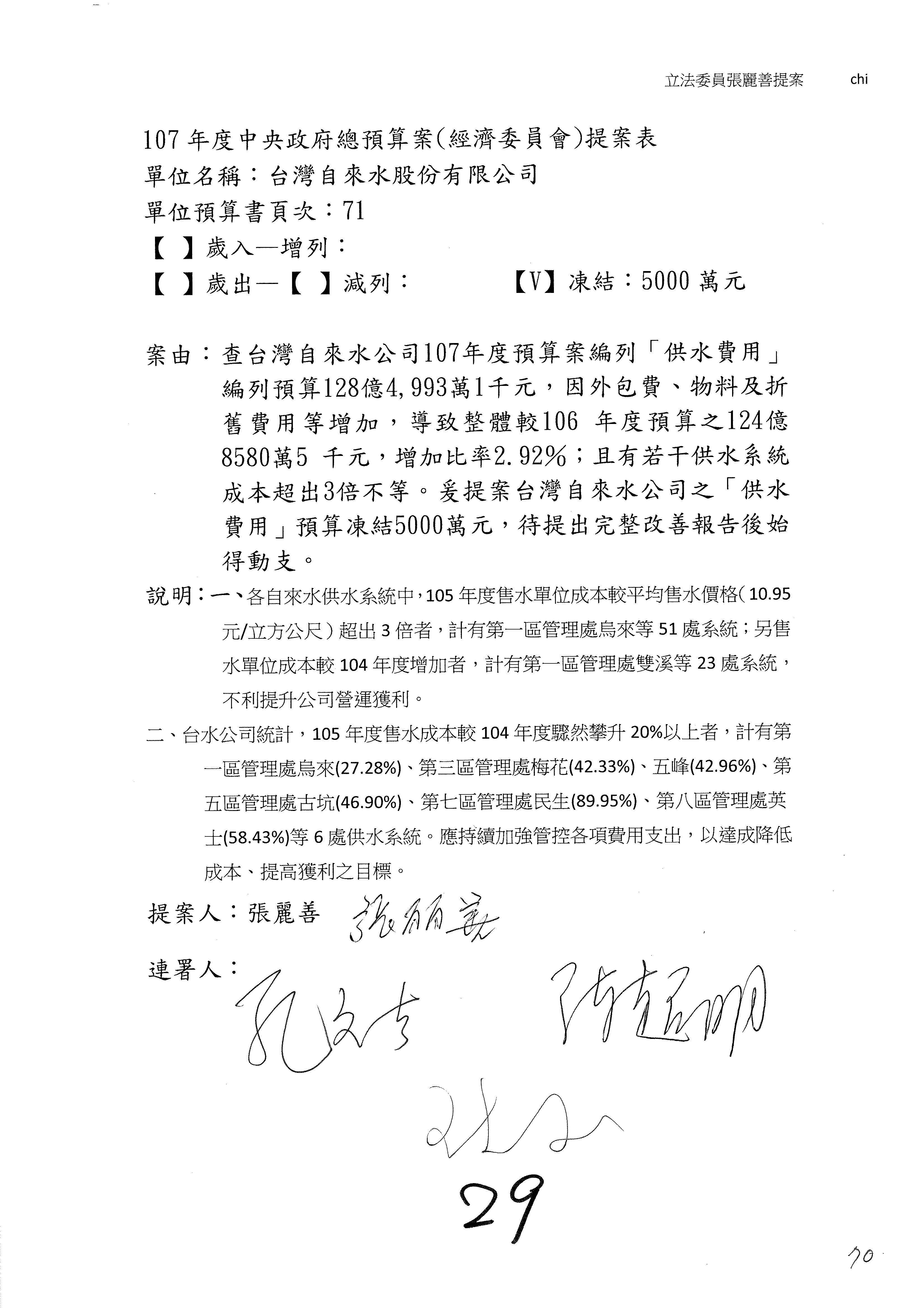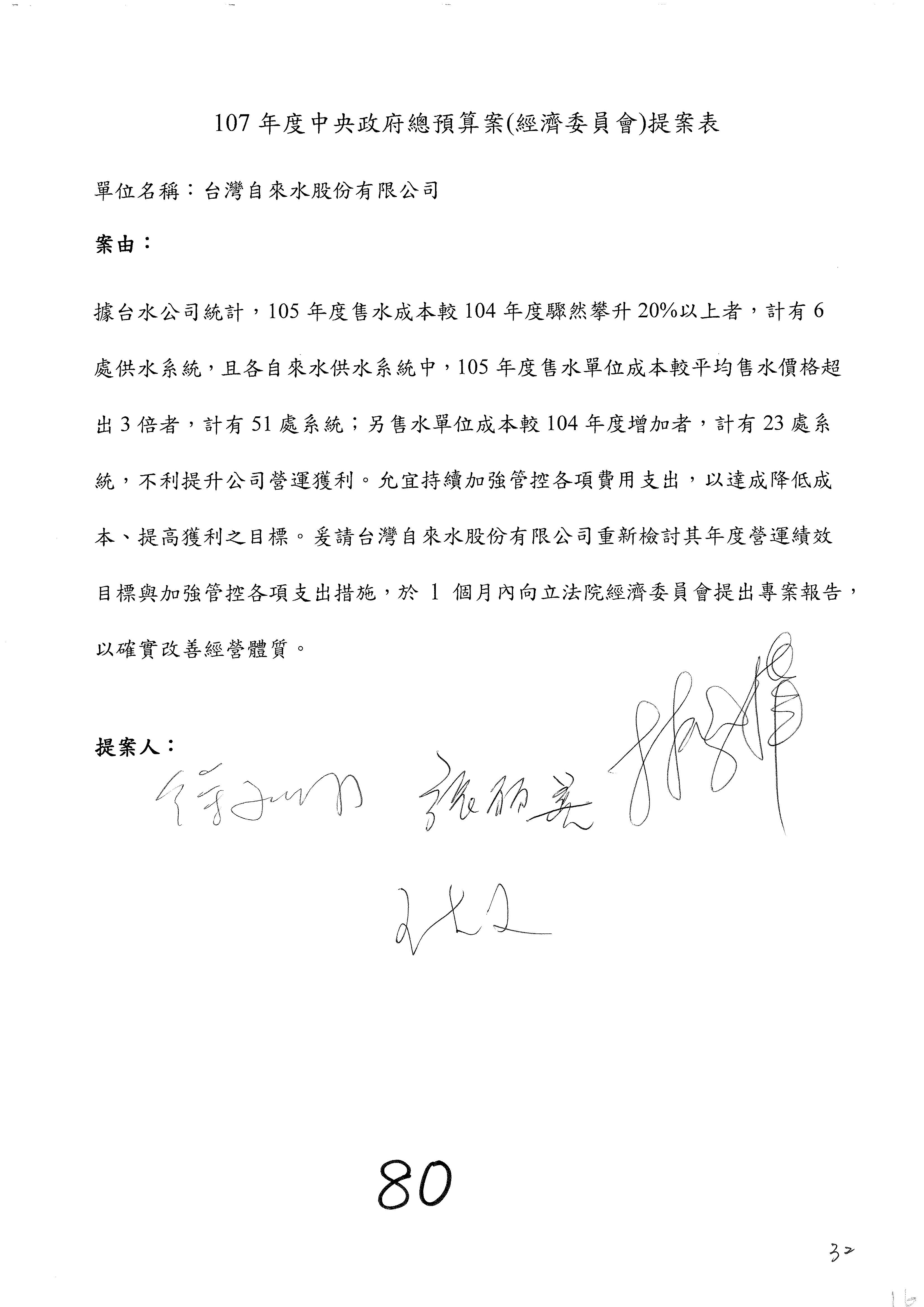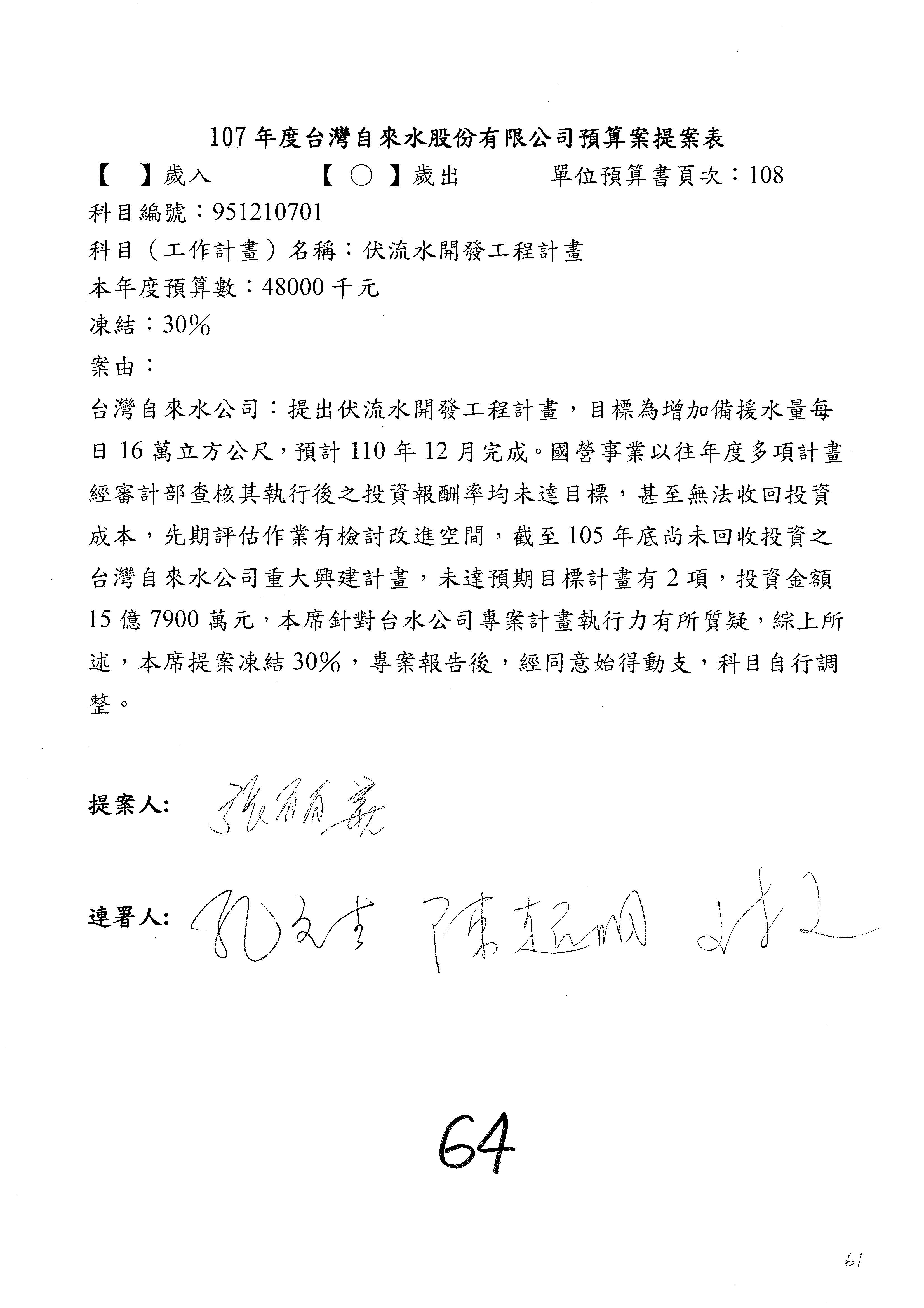 主席:我們繼續處理第66案的決議案。請問自來水公司的意見如何?