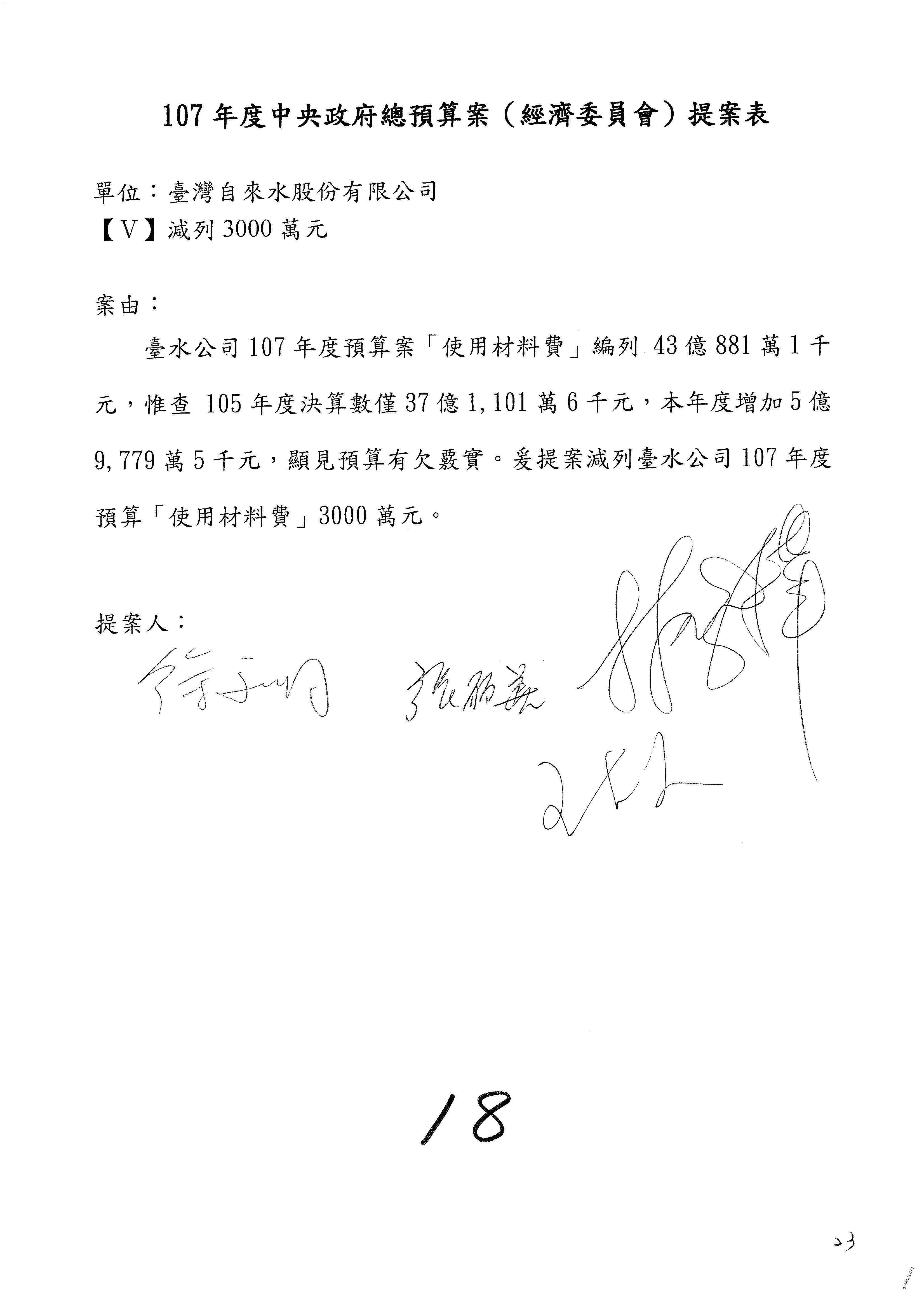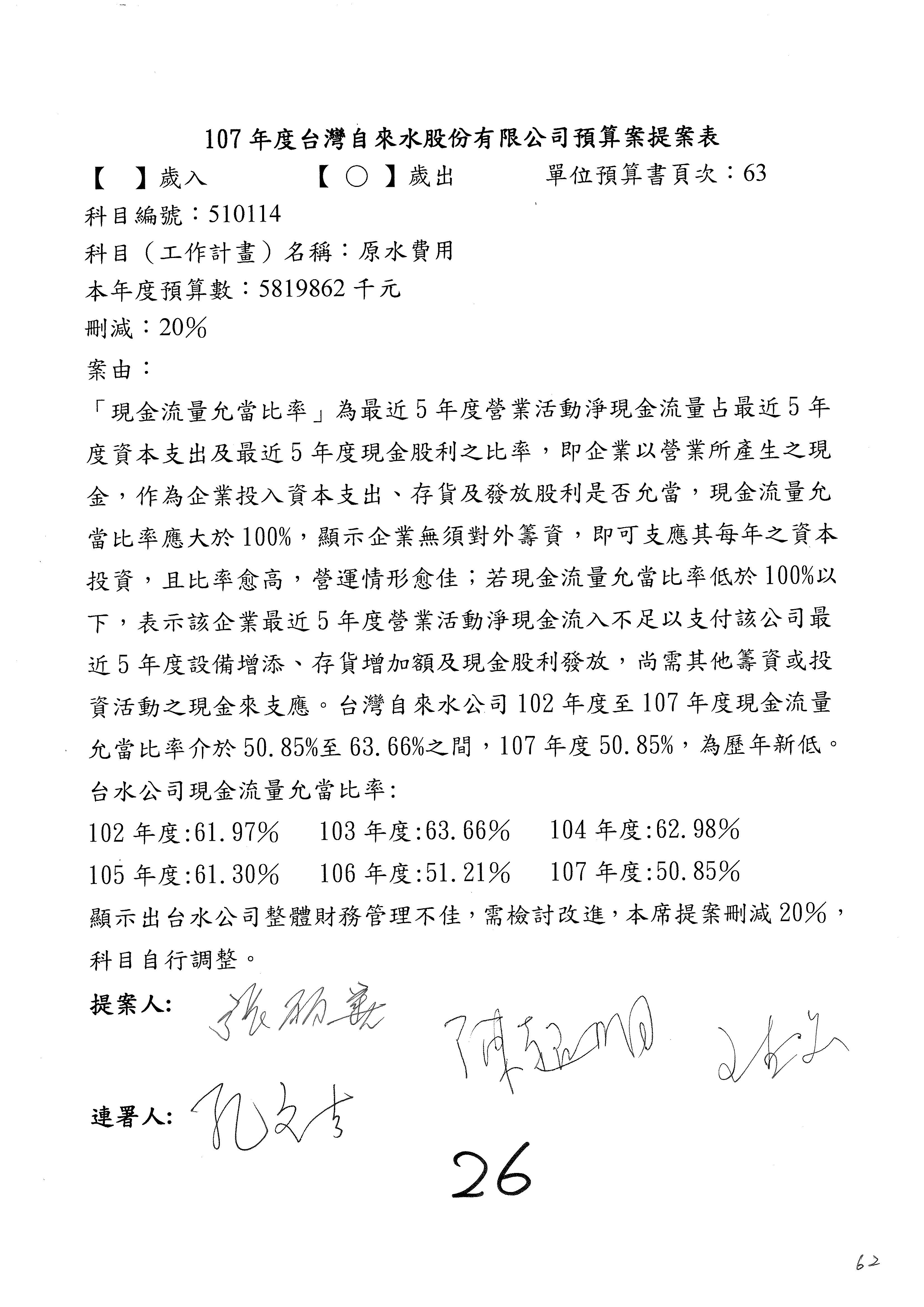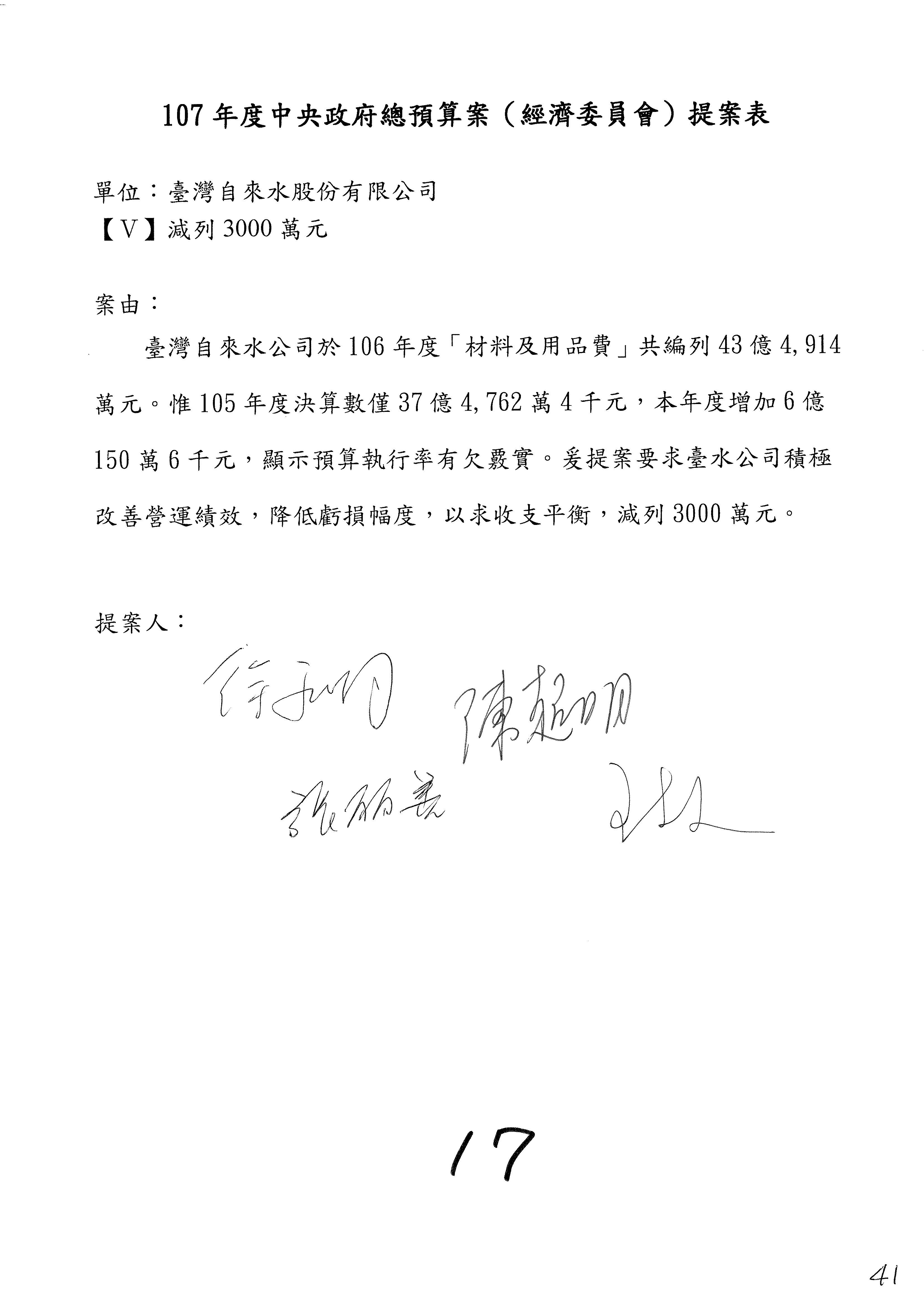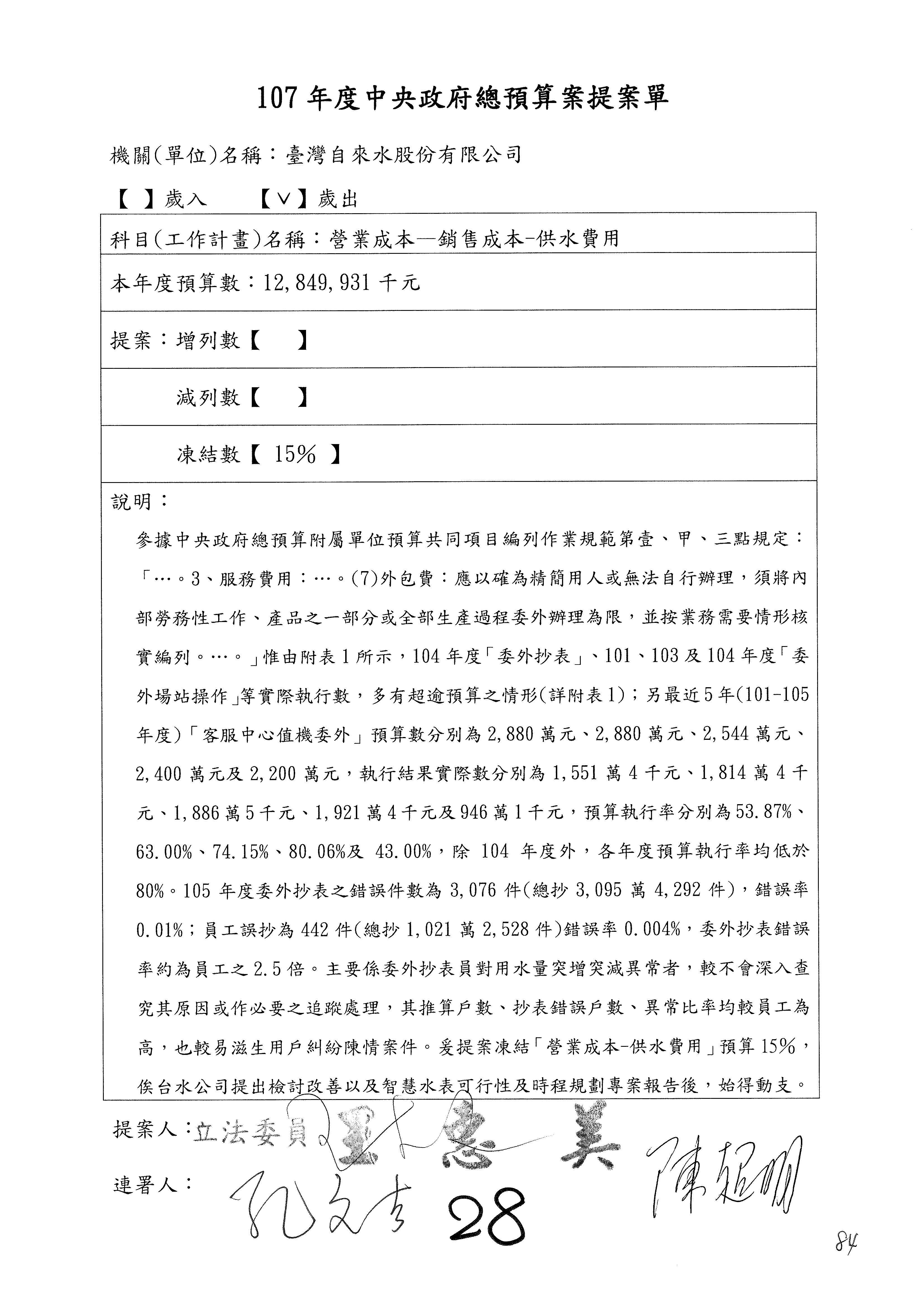 查台水公司107年度預算稅前淨損4億餘元,「材料及用品費」編列高達43億4,914萬元,為撙節支出,爰要求台水公司應積極與台北市政府協調,調降向台北市購水之費用。