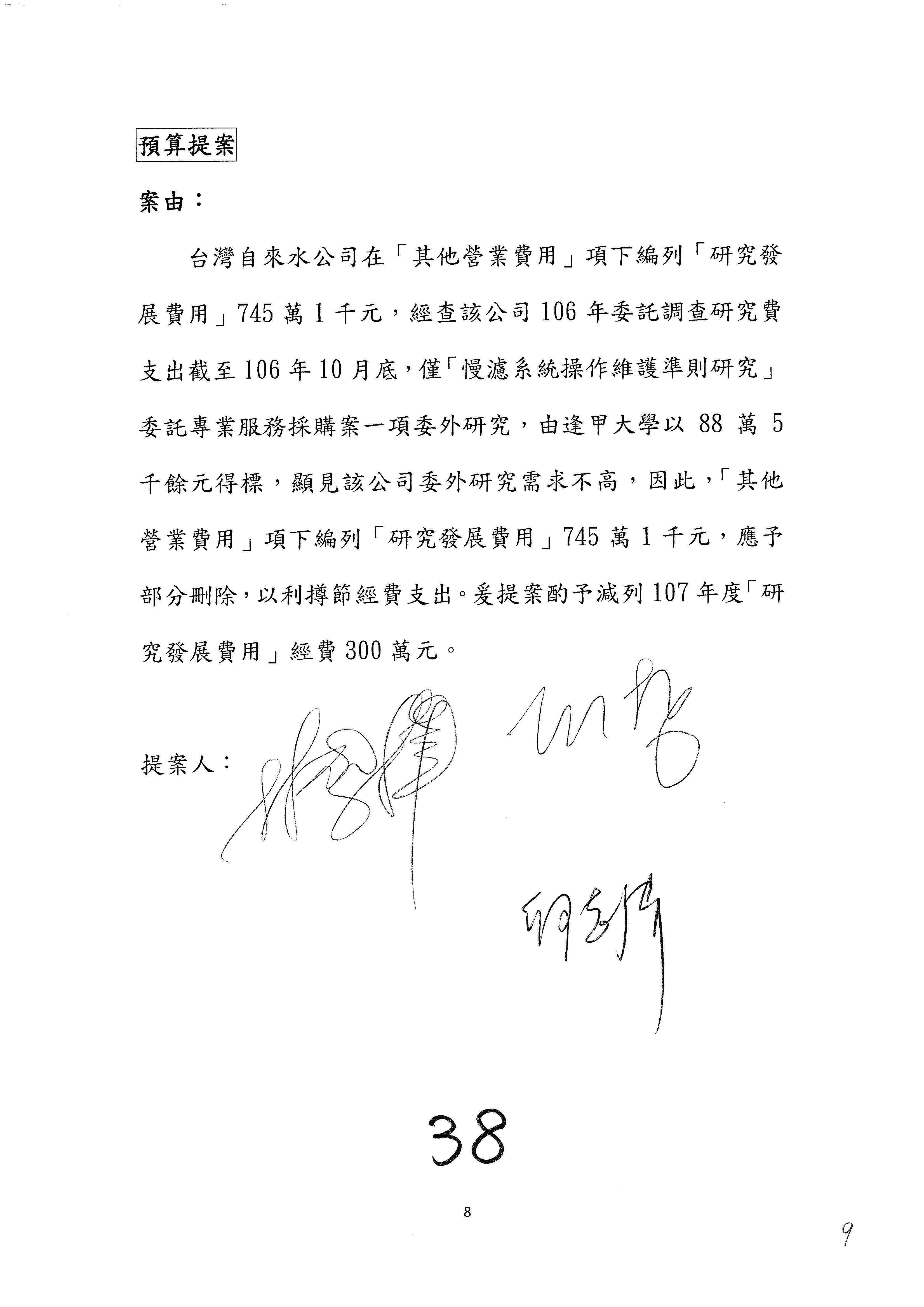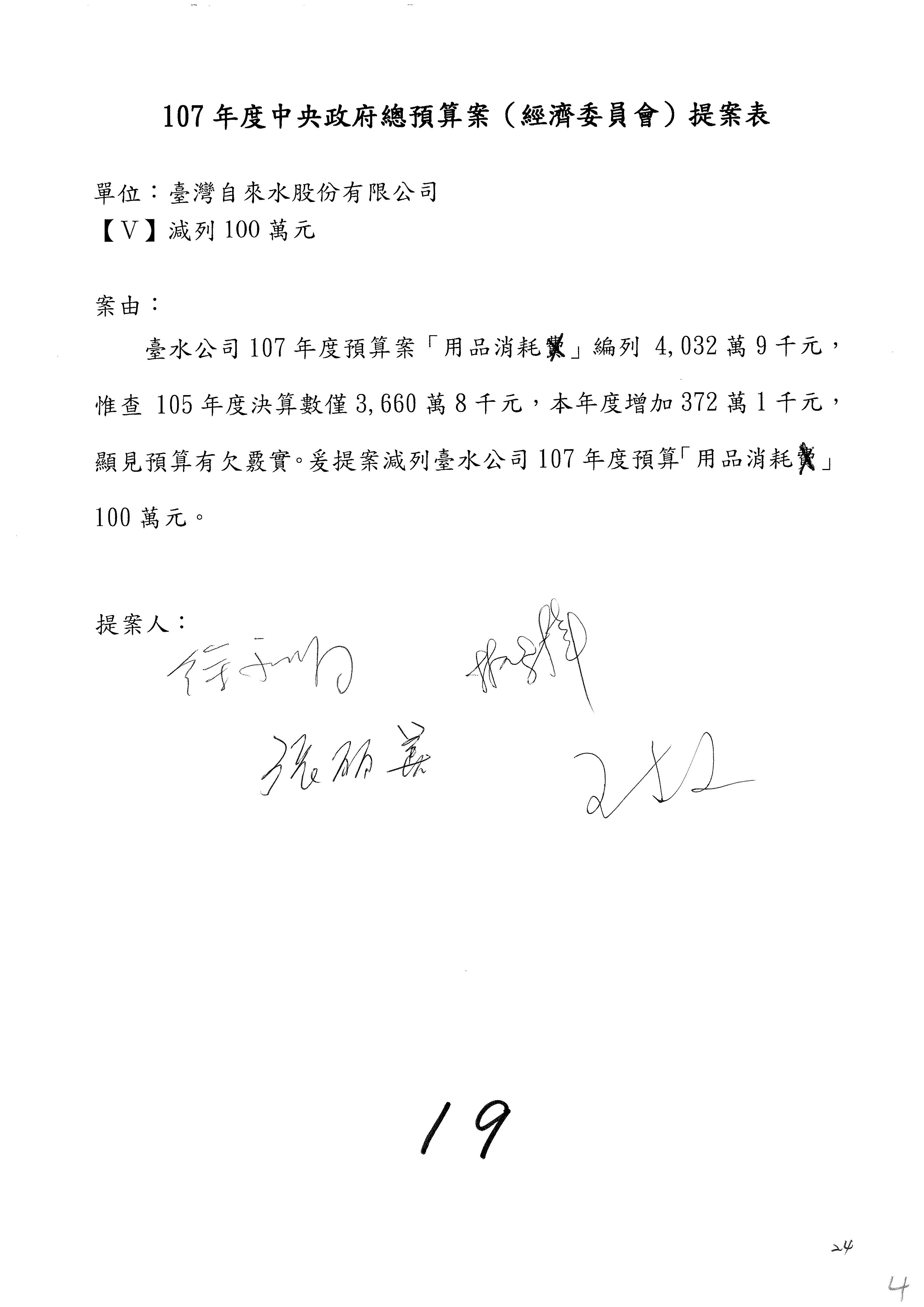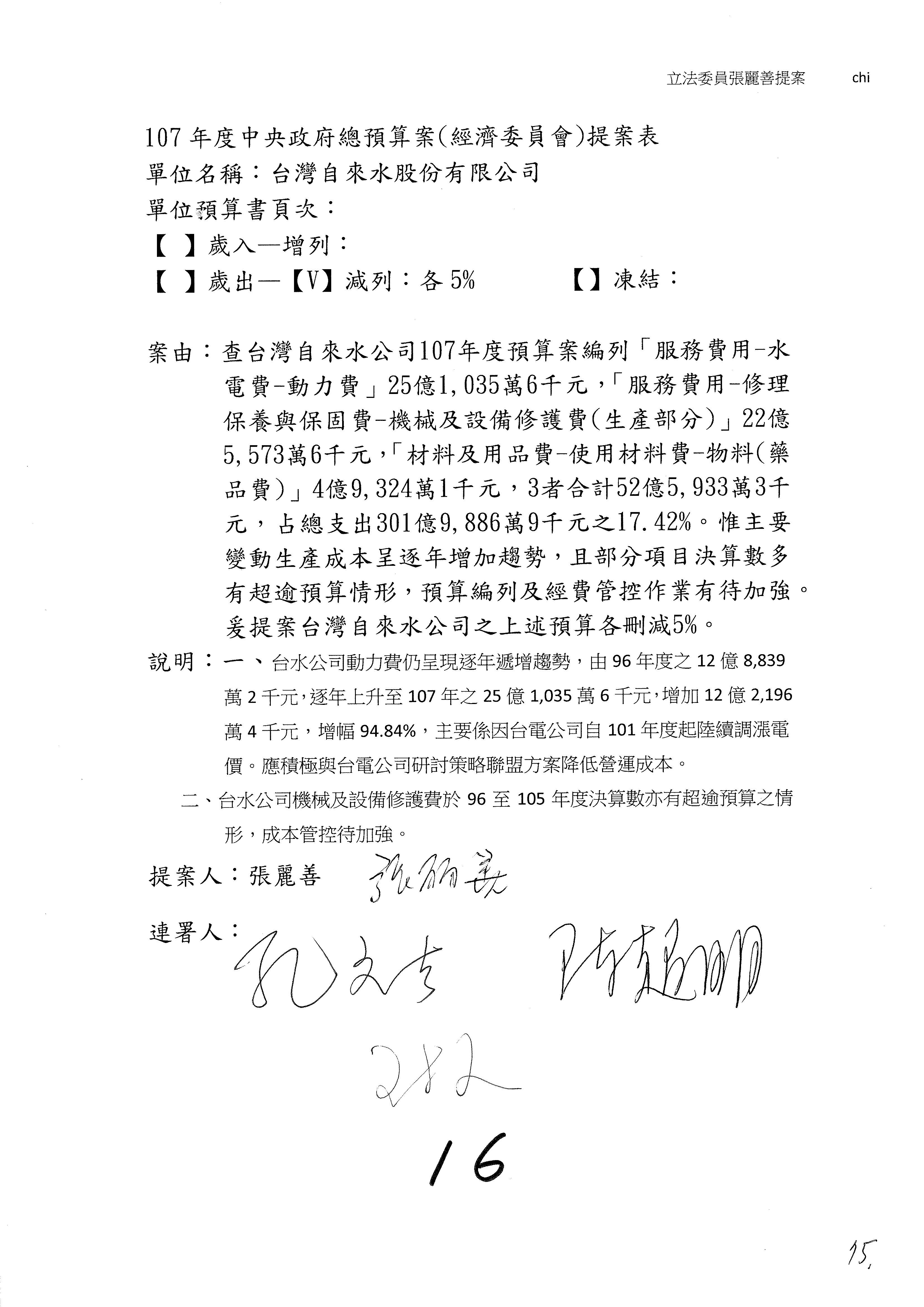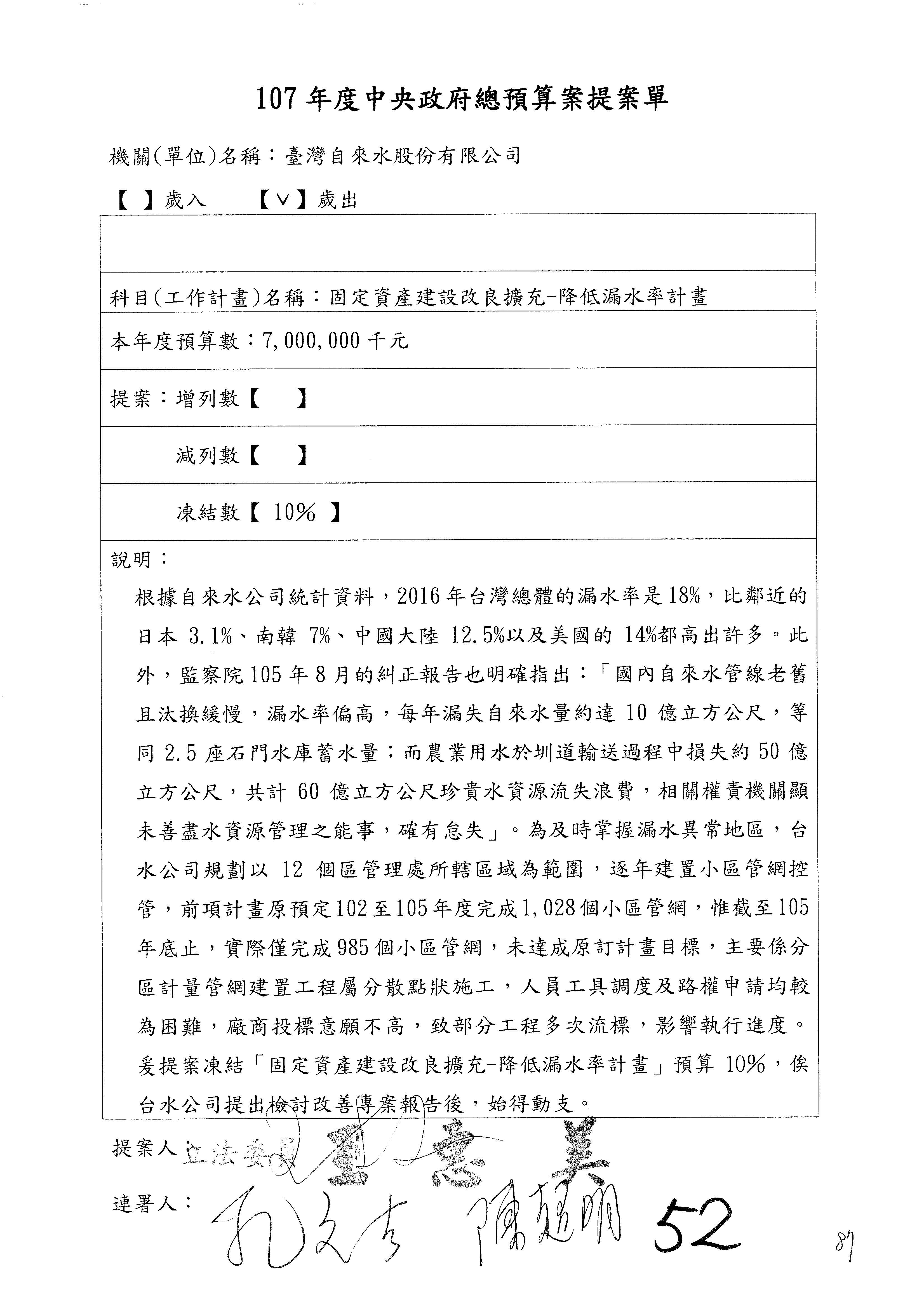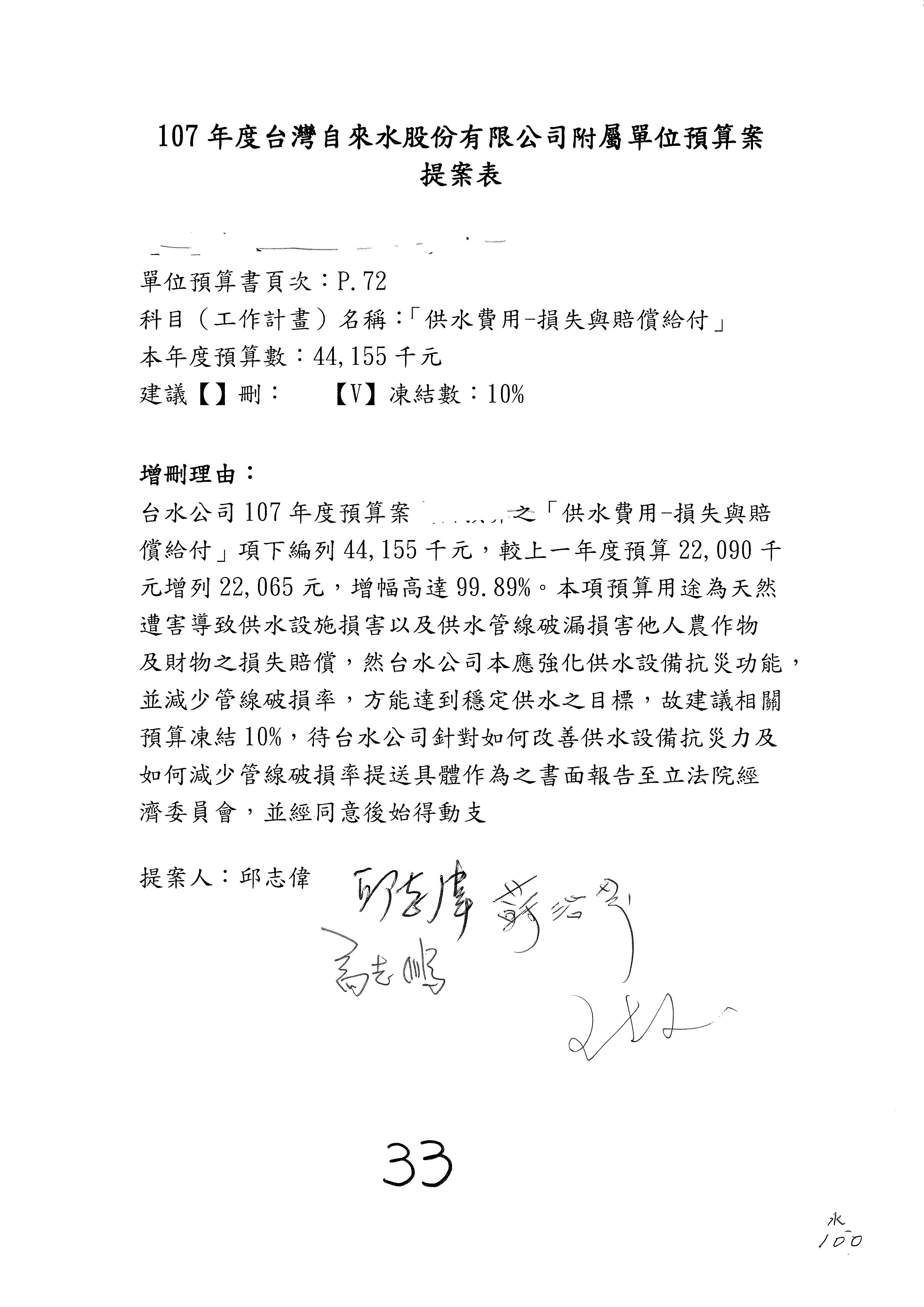 查台水公司107年度預算稅前淨損4億餘元,「材料及用品費」編列高達43億4,914萬元,為撙節支出,爰要求台水公司應積極與台北市政府協調,調降向台北市購水之費用。
