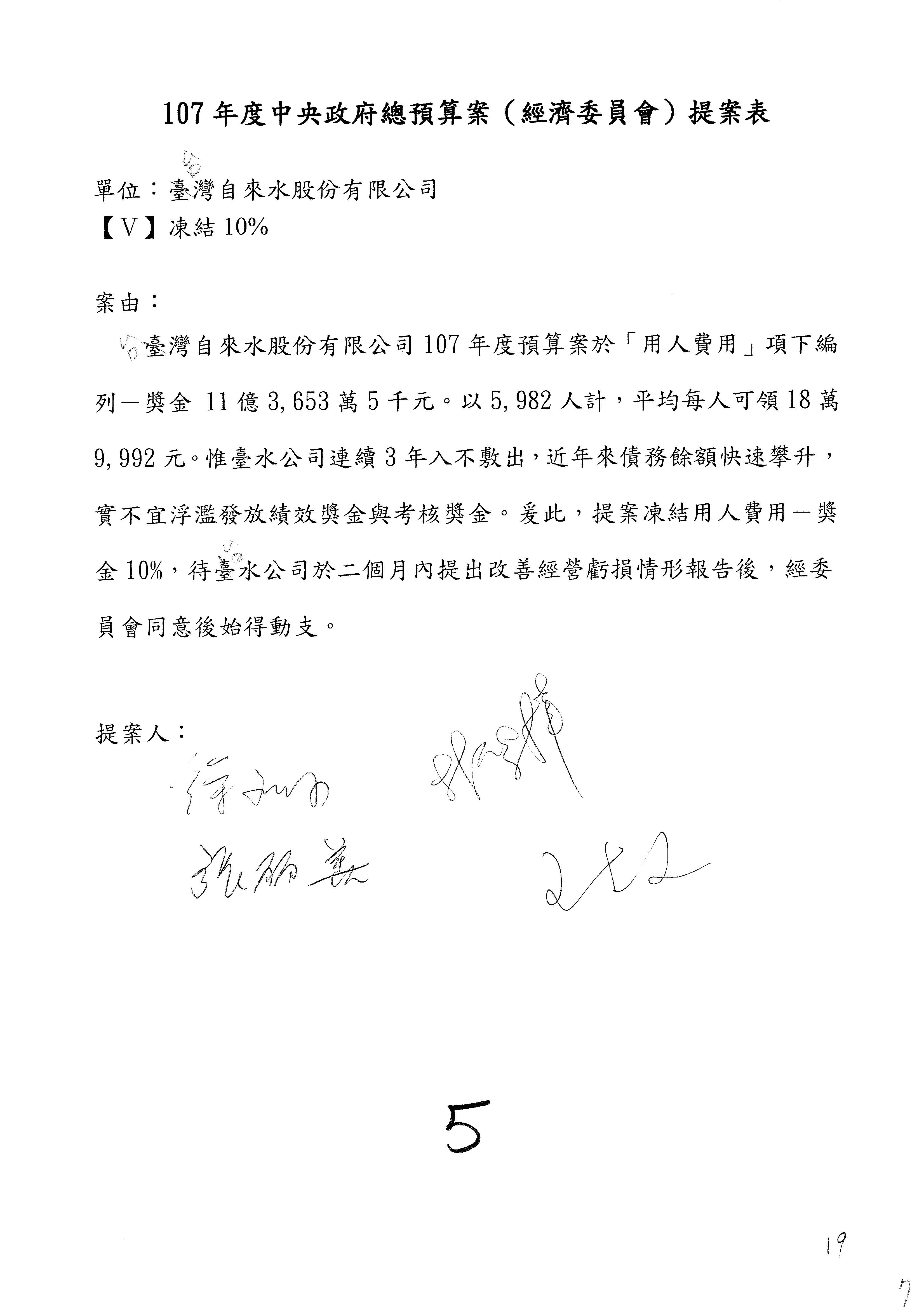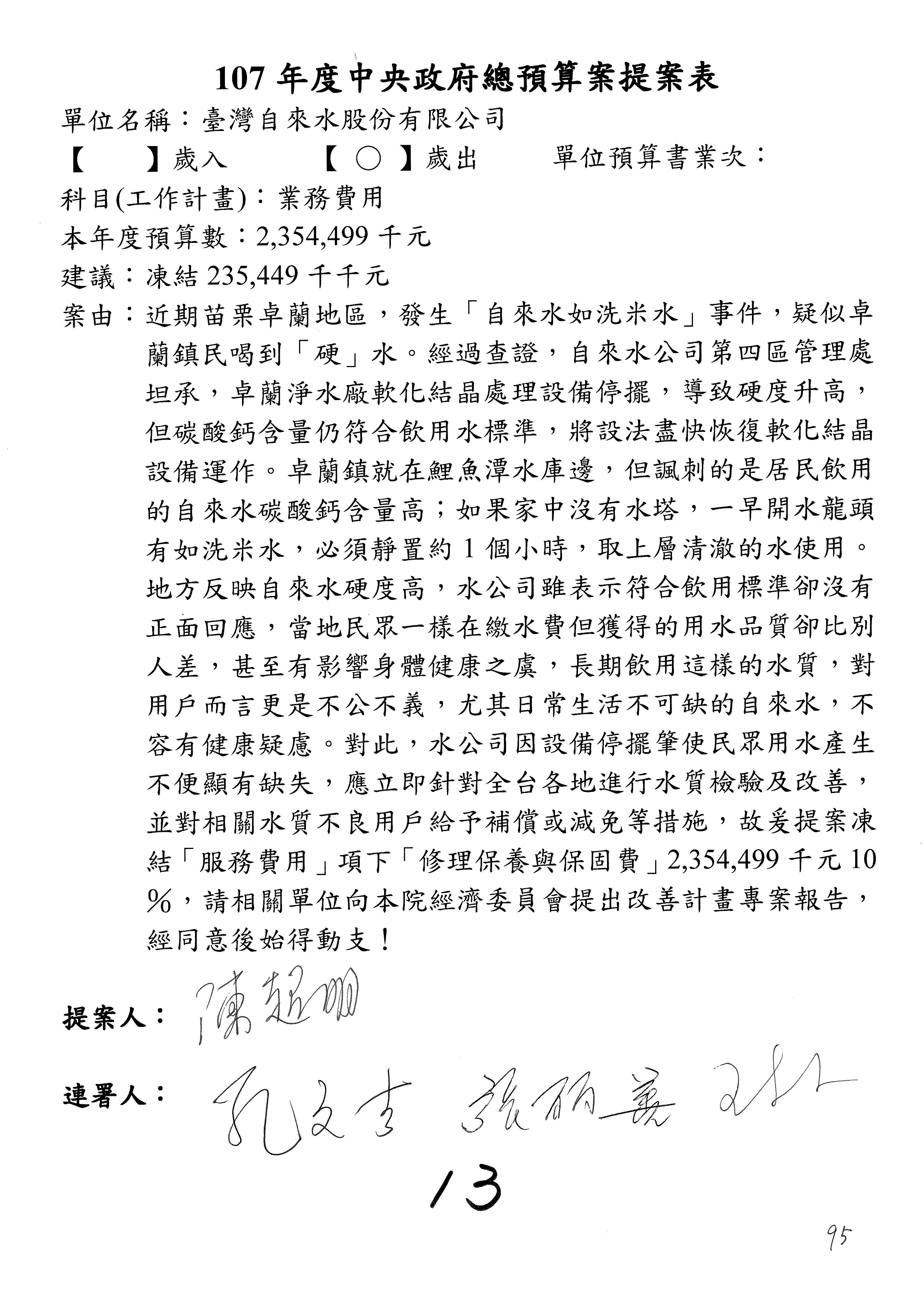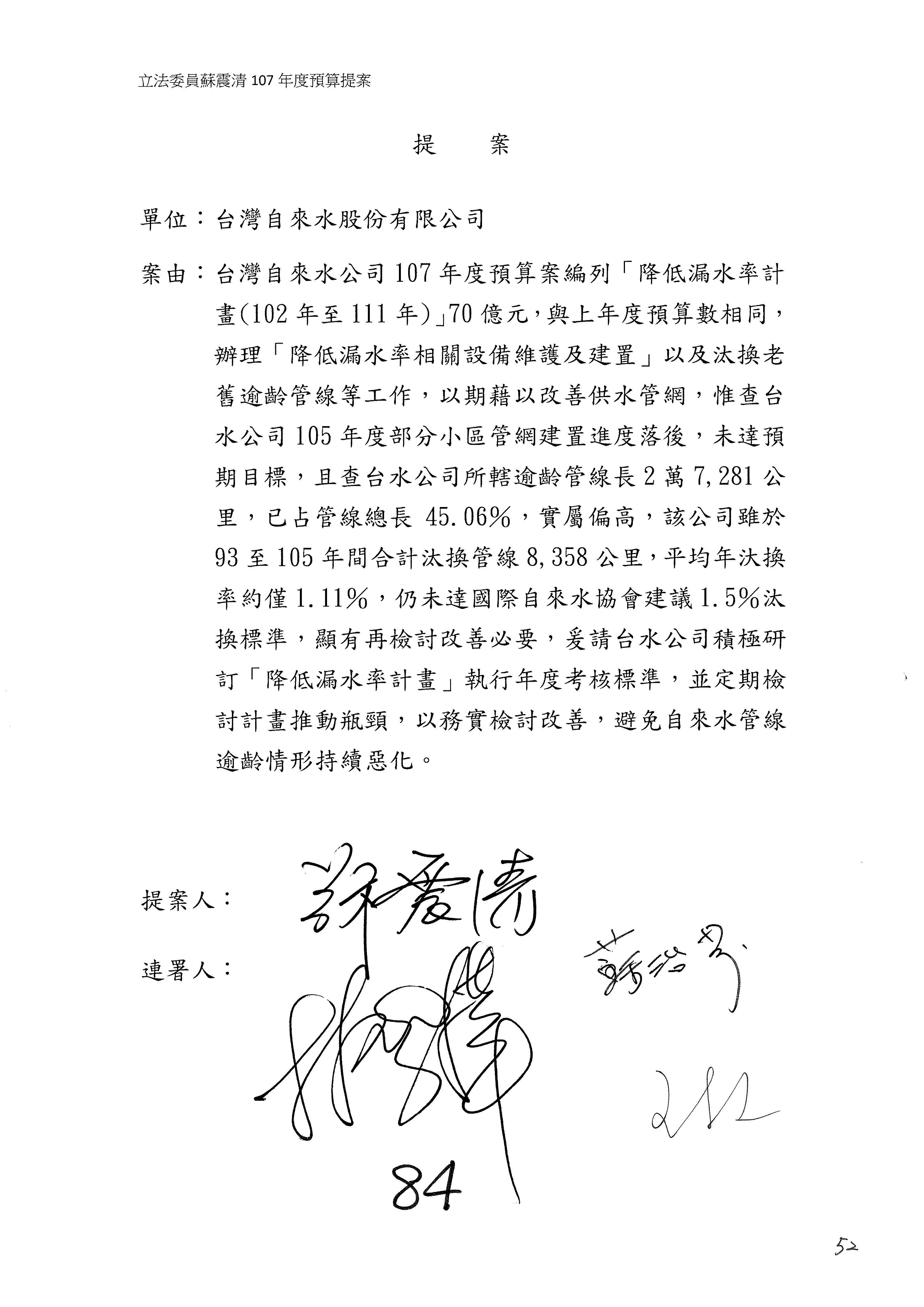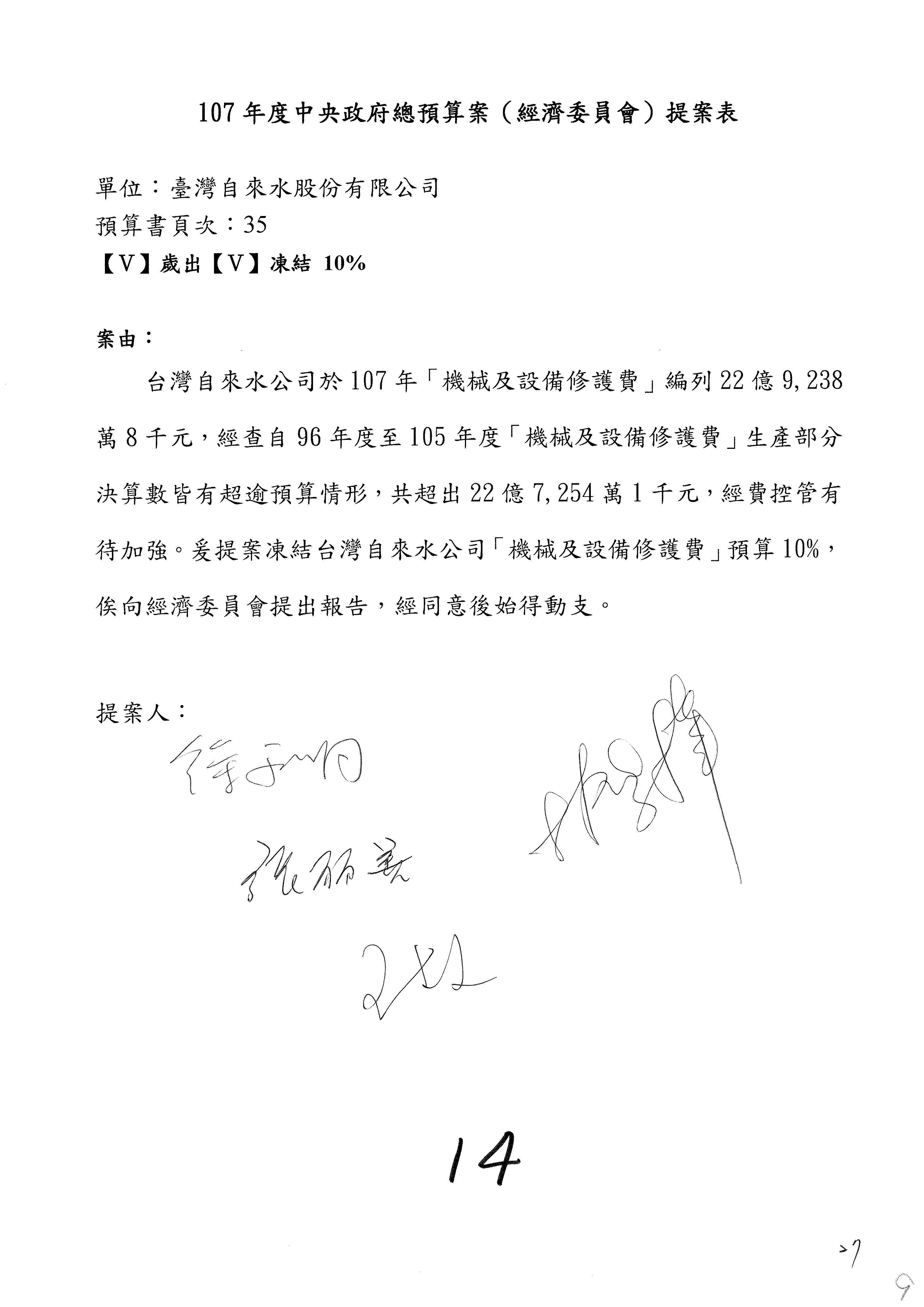 查台水公司107年度預算稅前淨損4億餘元,「材料及用品費」編列高達43億4,914萬元,為撙節支出,爰要求台水公司應積極與台北市政府協調,調降向台北市購水之費用。