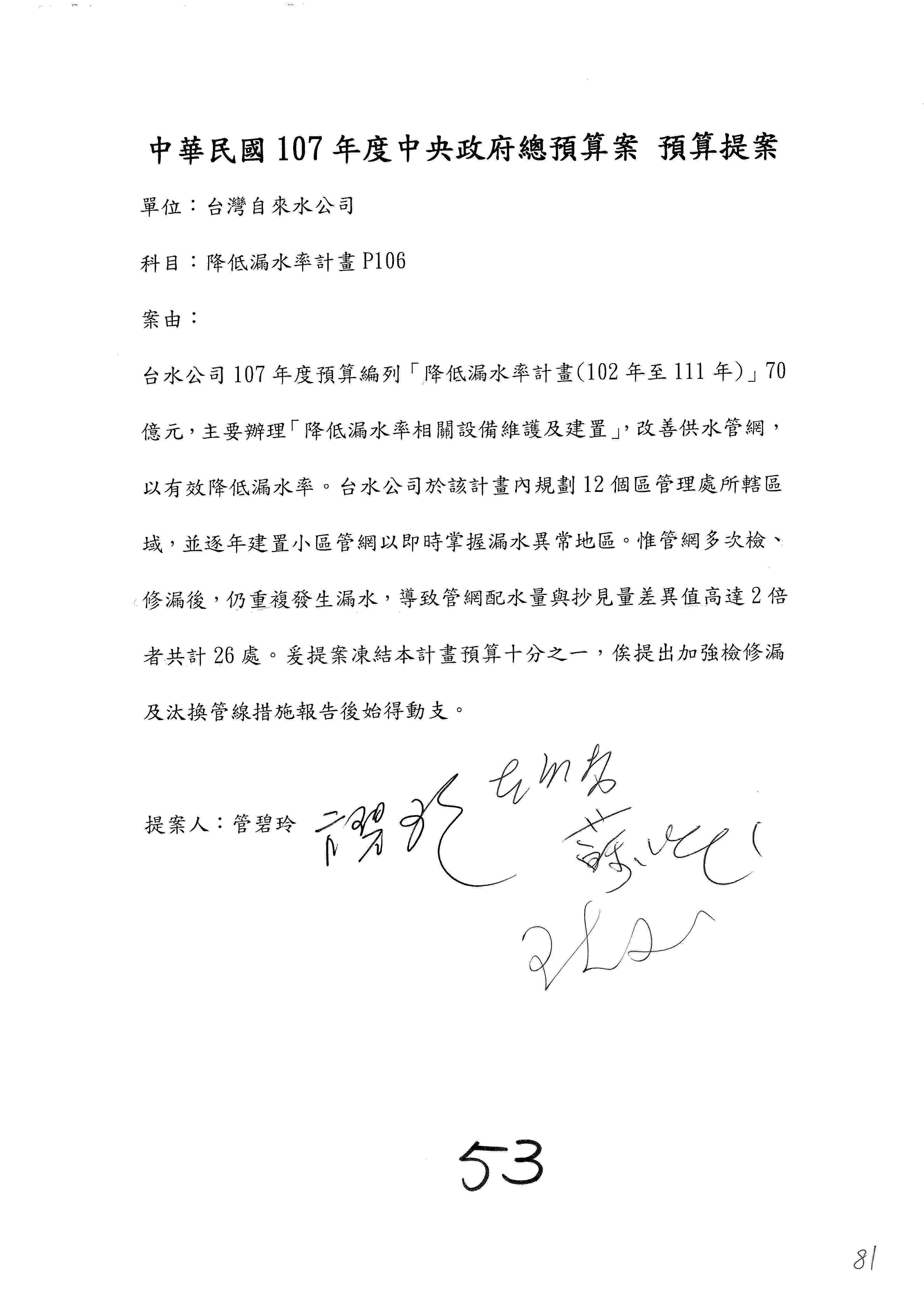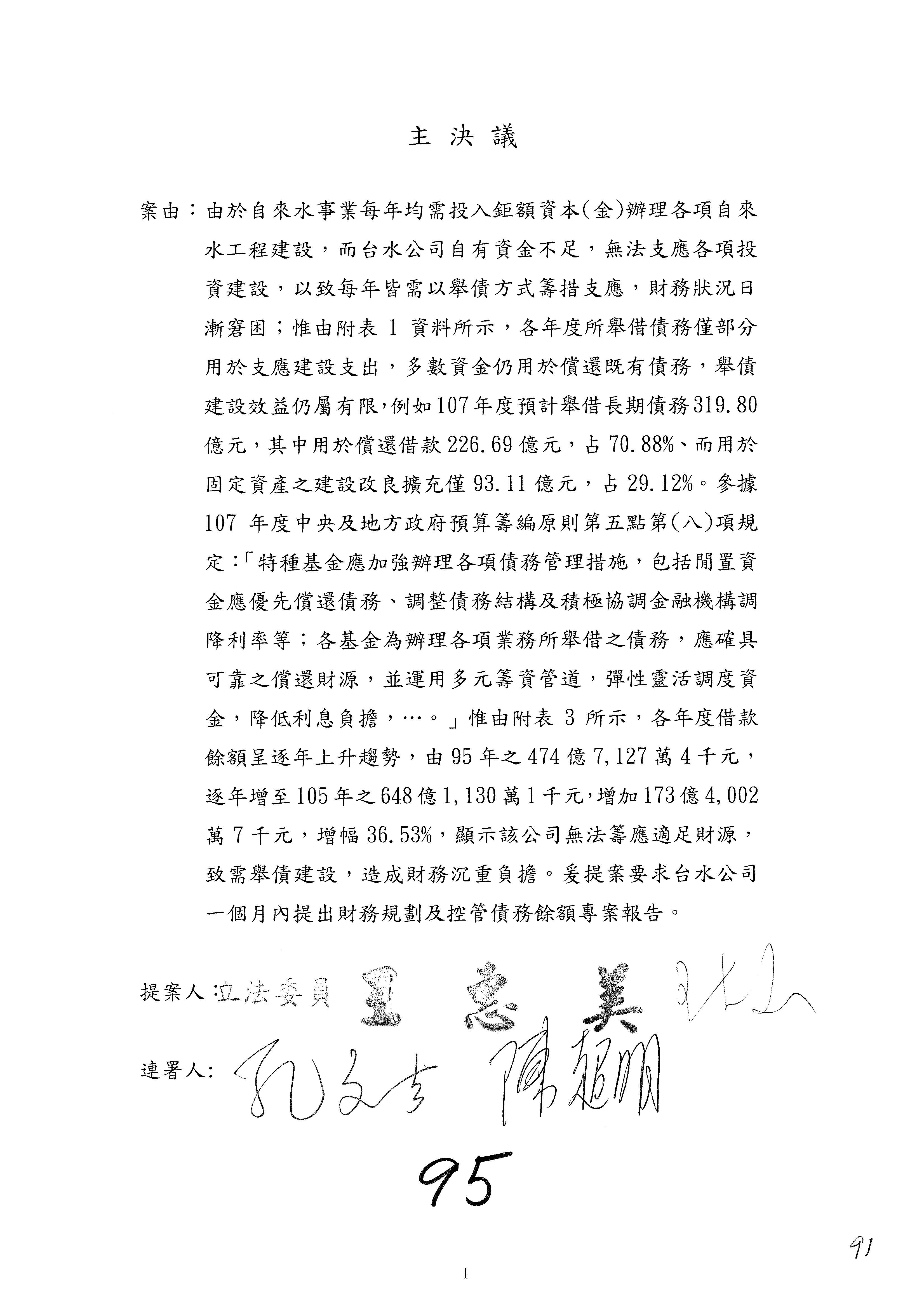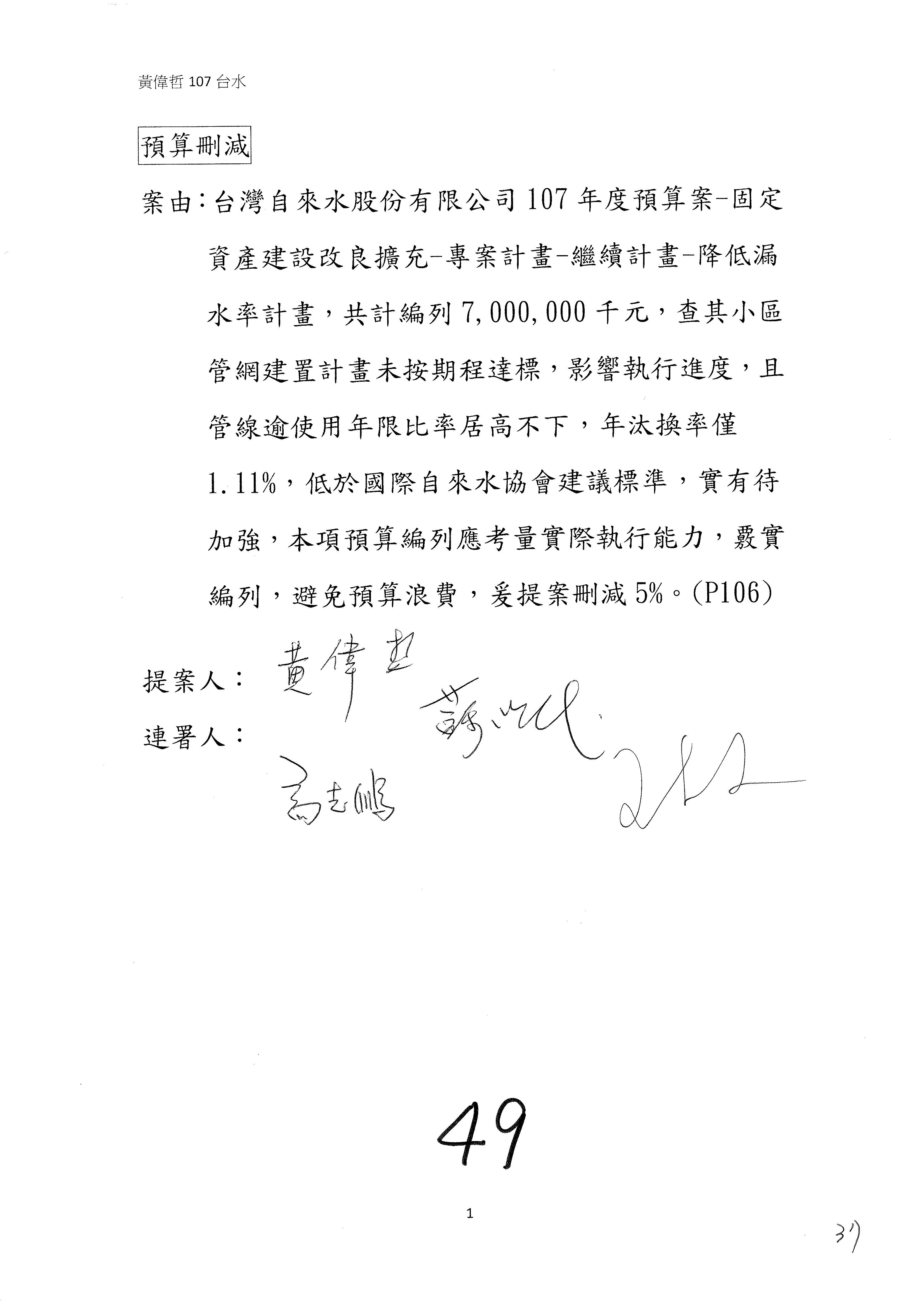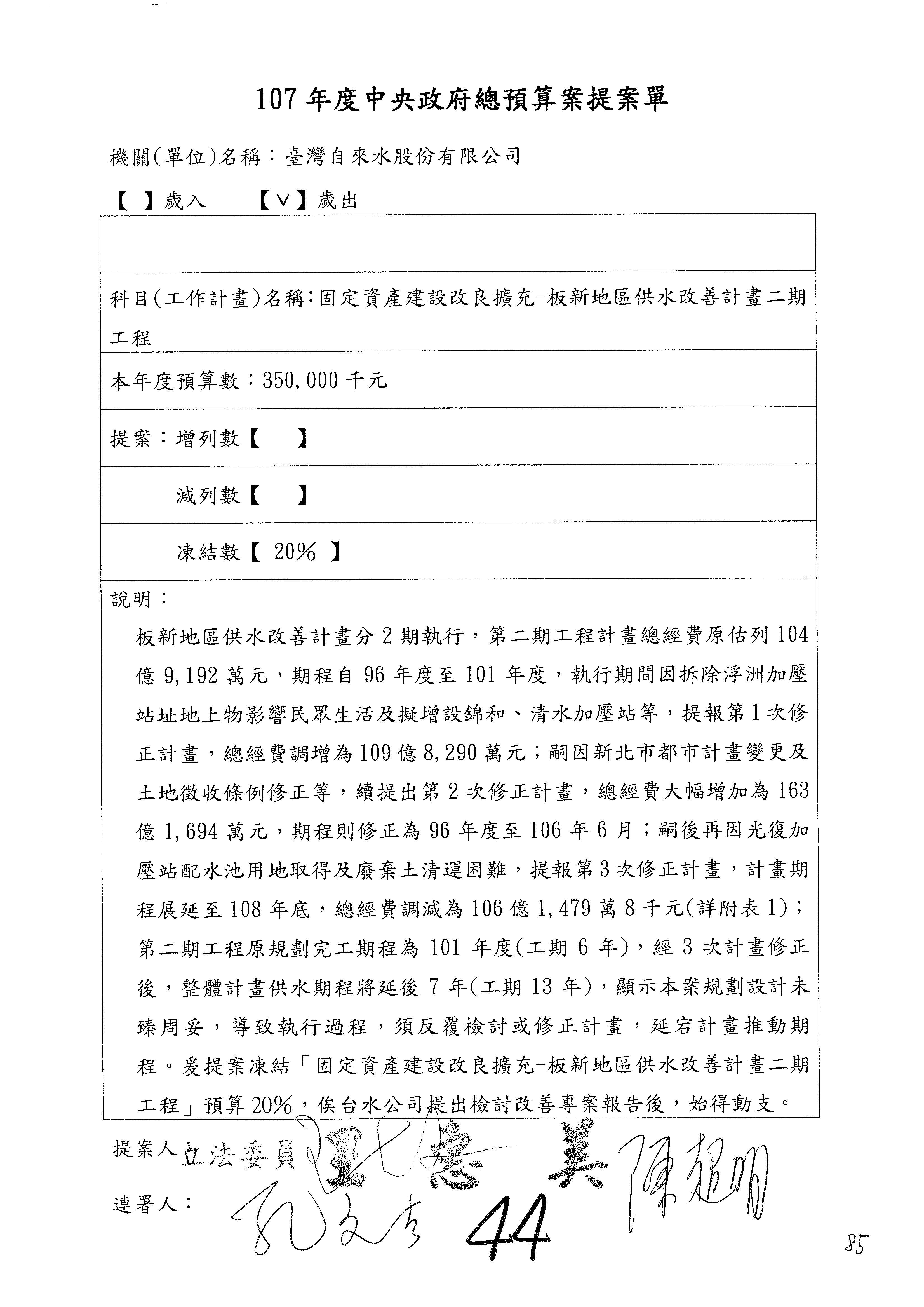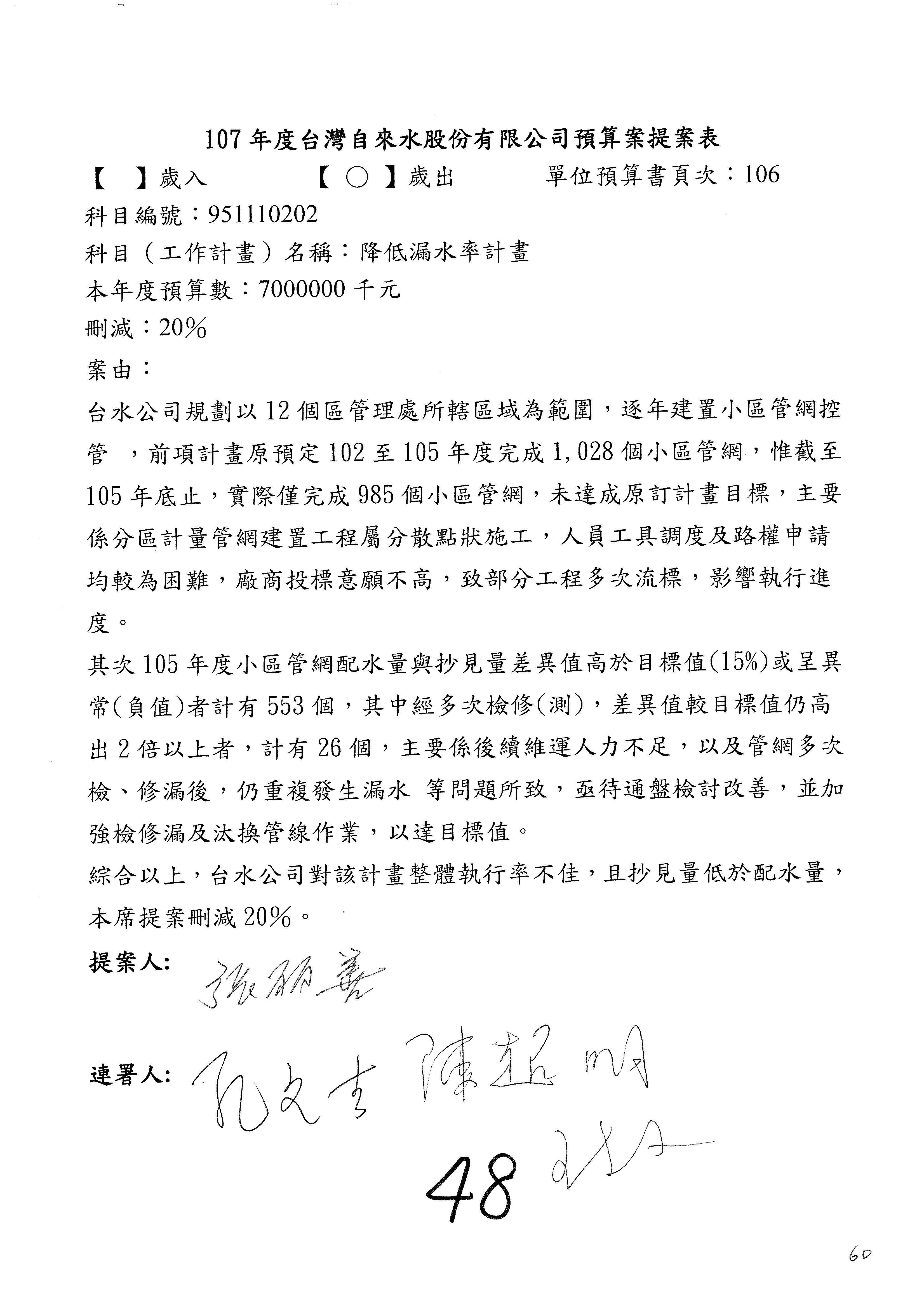 查台水公司107年度預算稅前淨損4億餘元,「材料及用品費」編列高達43億4,914萬元,為撙節支出,爰要求台水公司應積極與台北市政府協調,調降向台北市購水之費用。