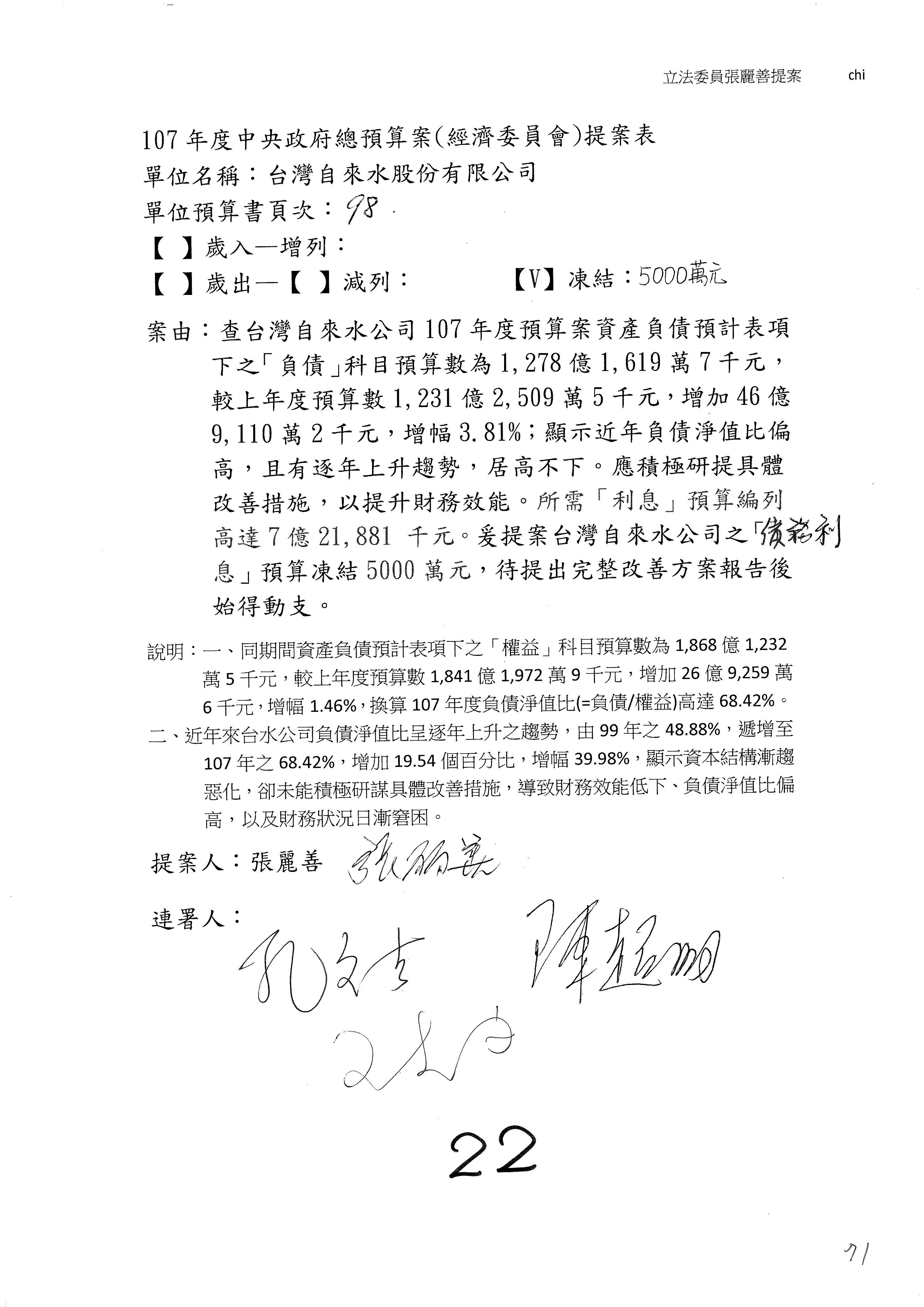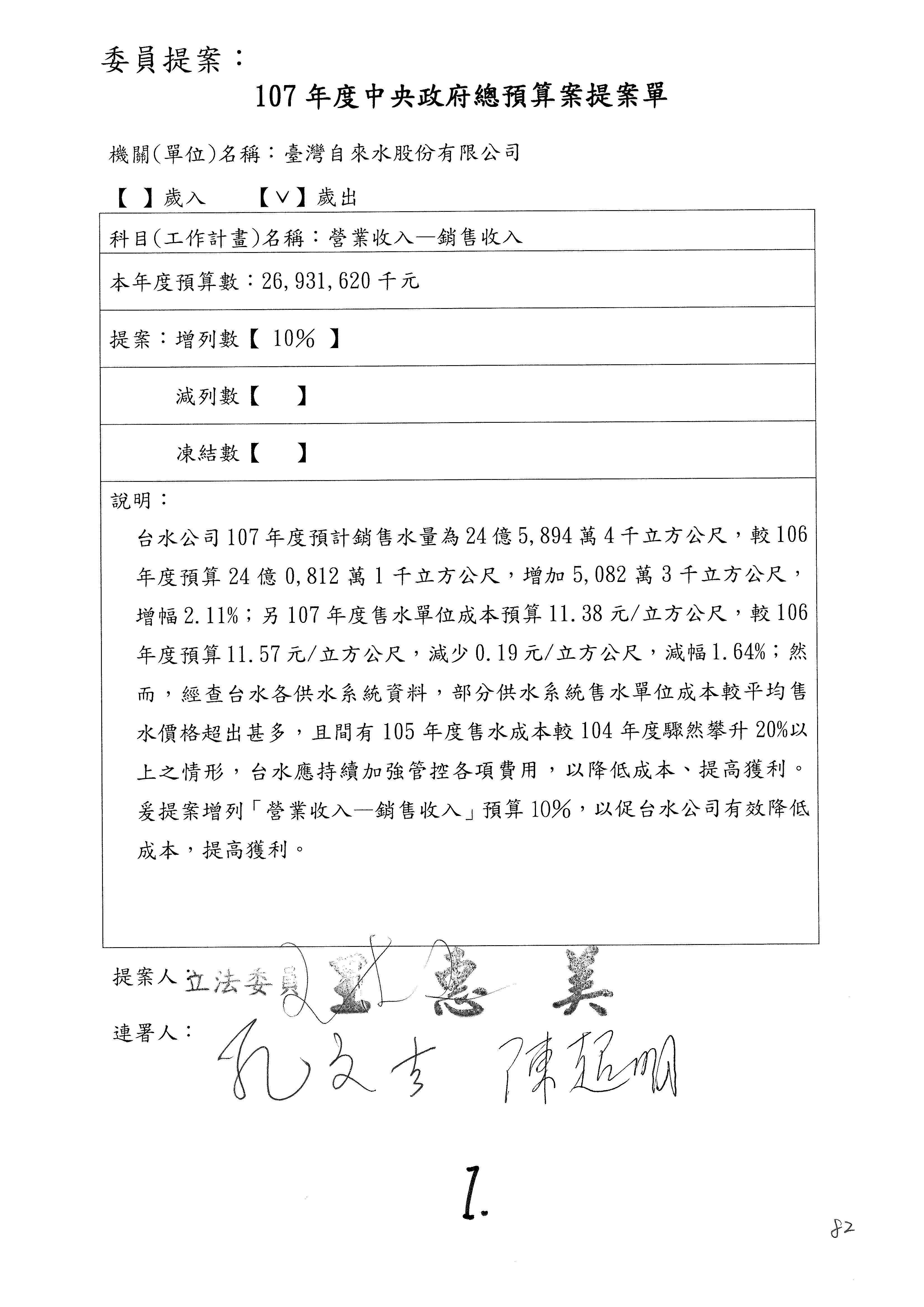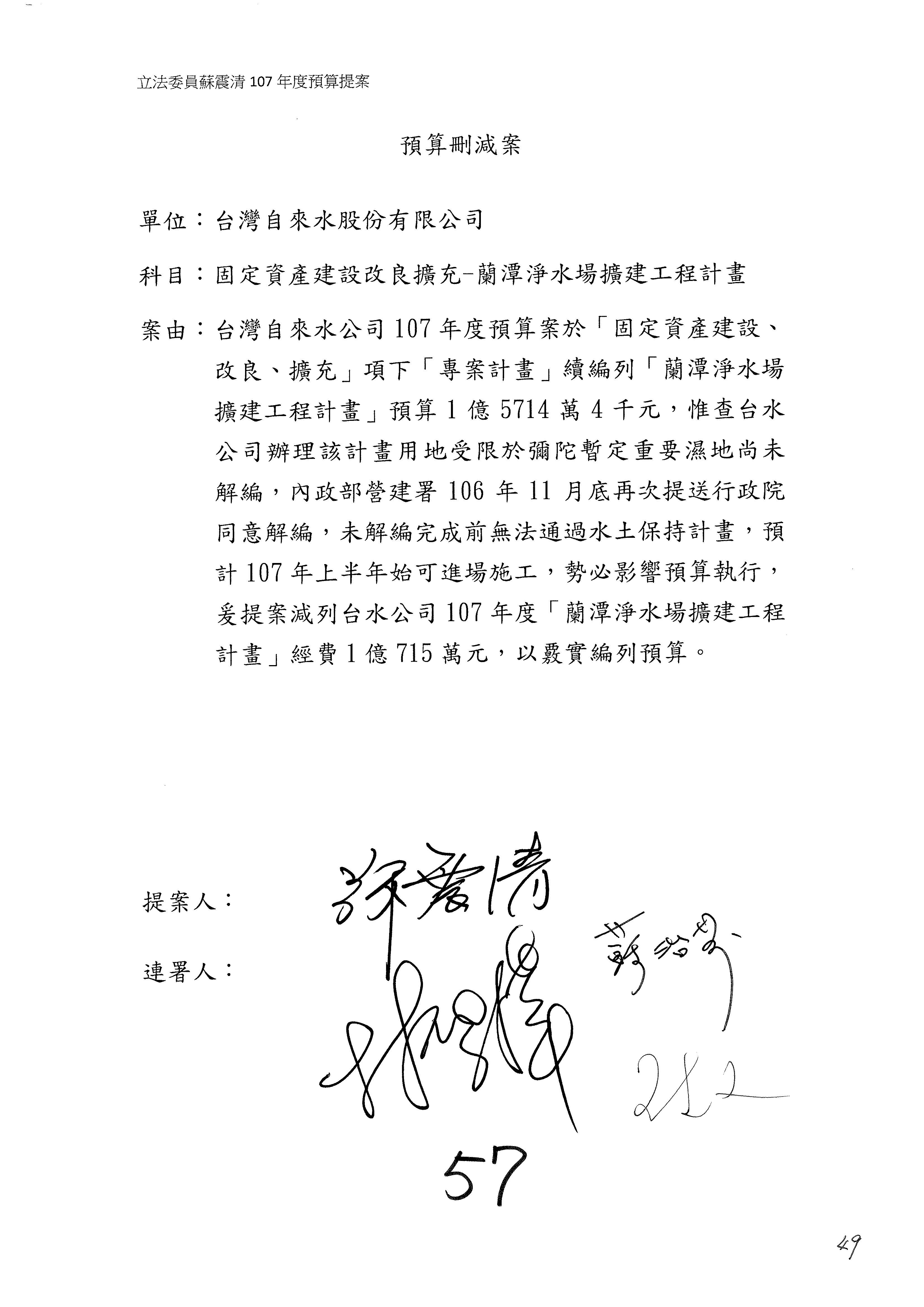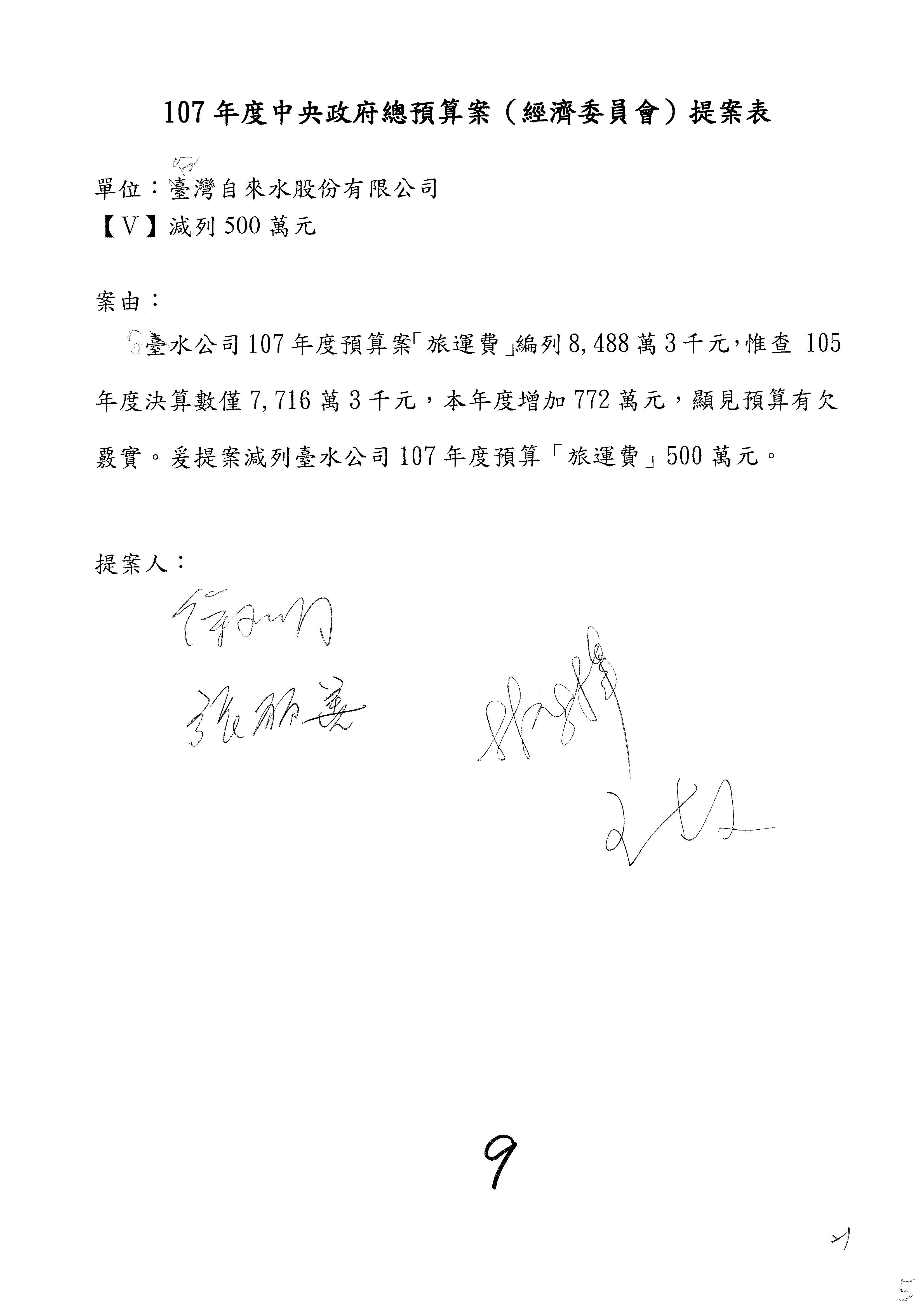 查台水公司107年度預算稅前淨損4億餘元,「材料及用品費」編列高達43億4,914萬元,為撙節支出,爰要求台水公司應積極與台北市政府協調,調降向台北市購水之費用。