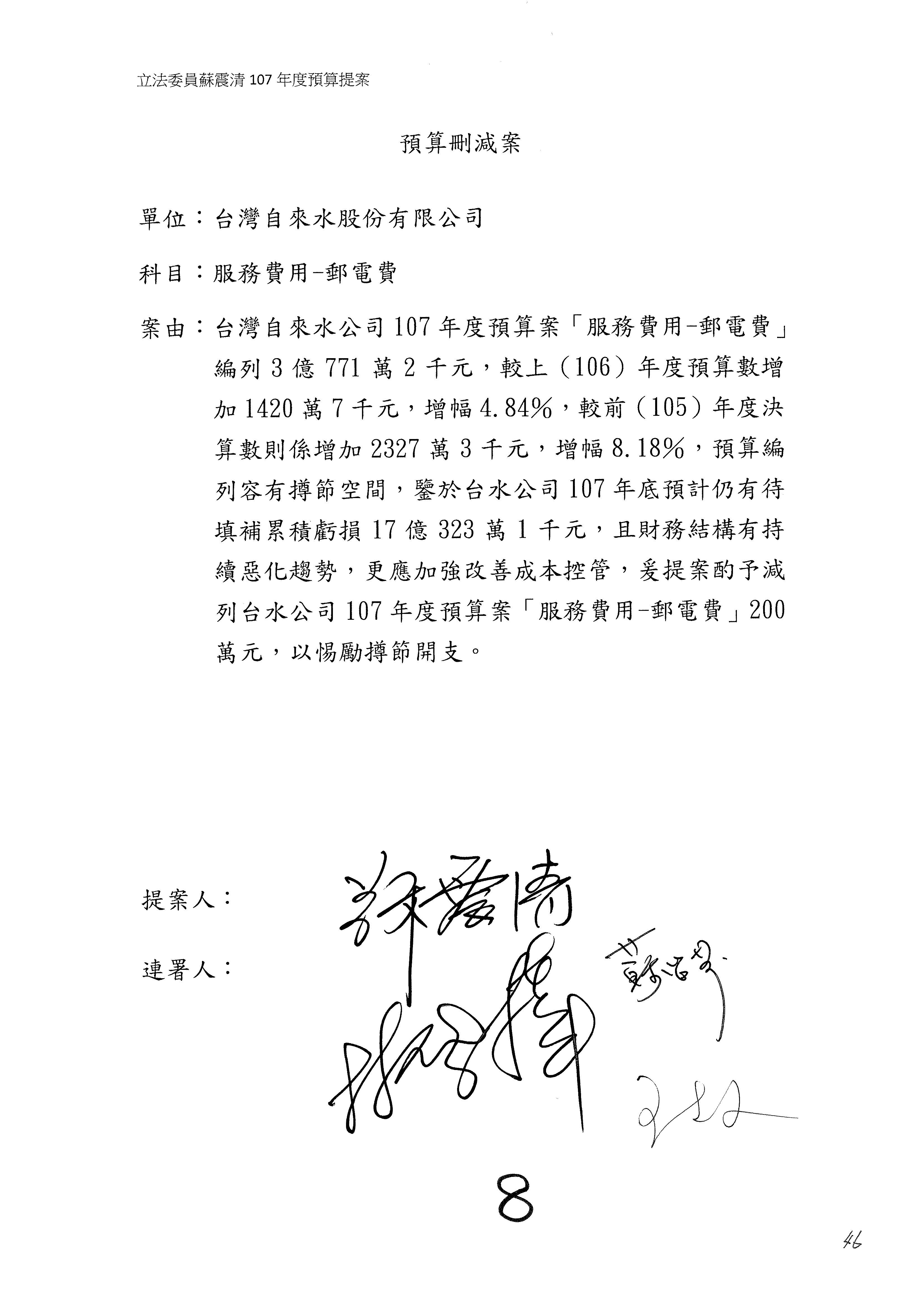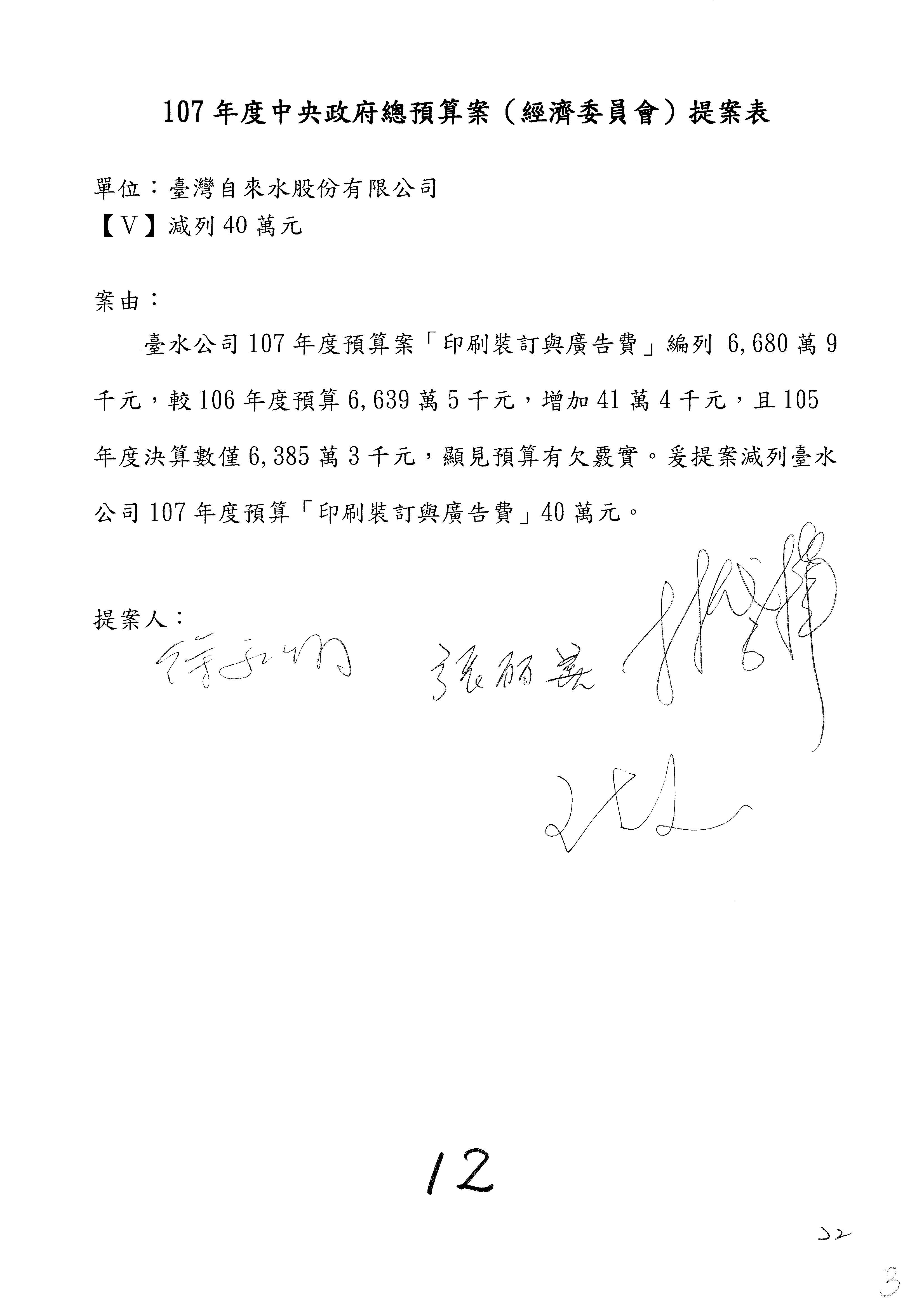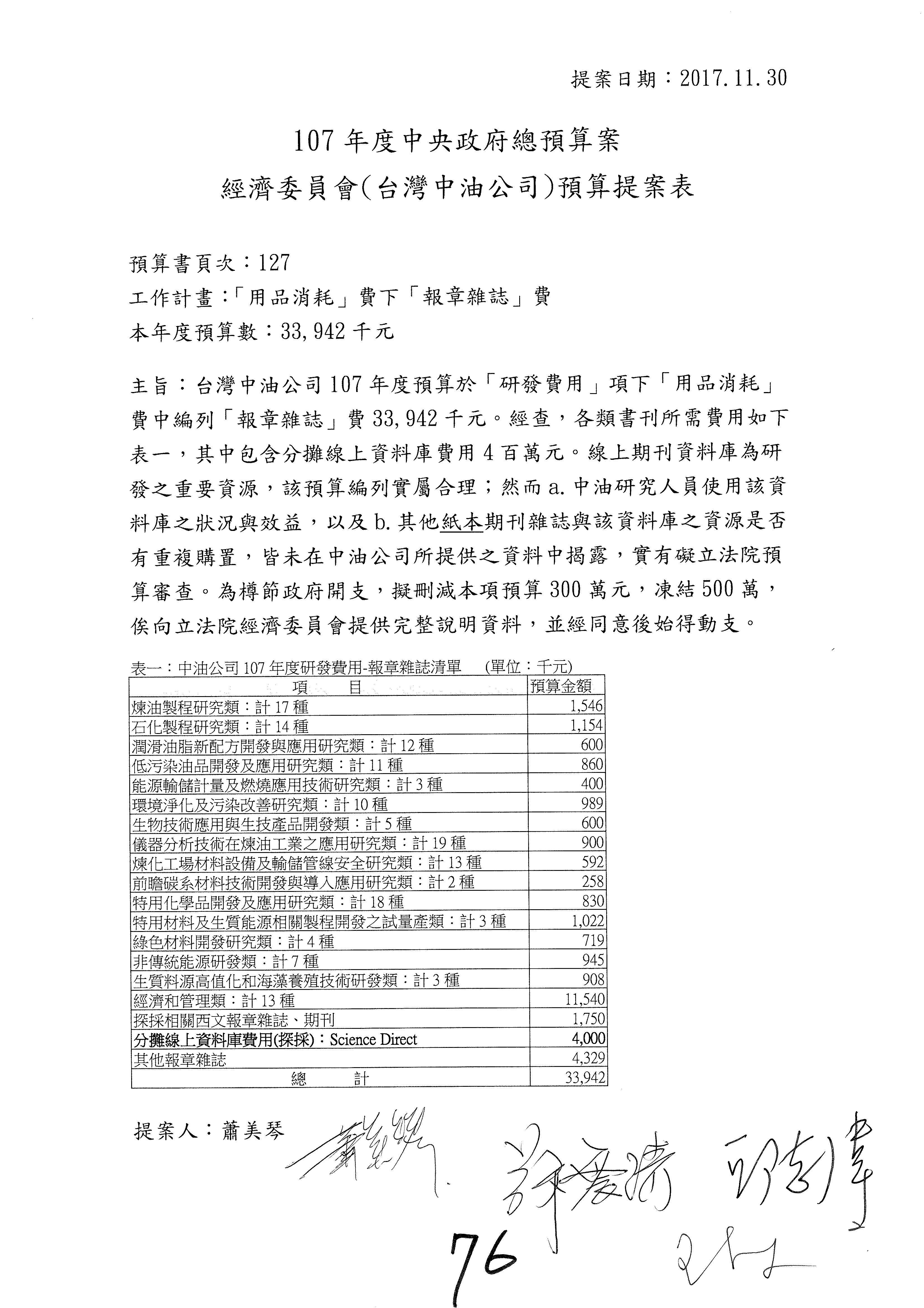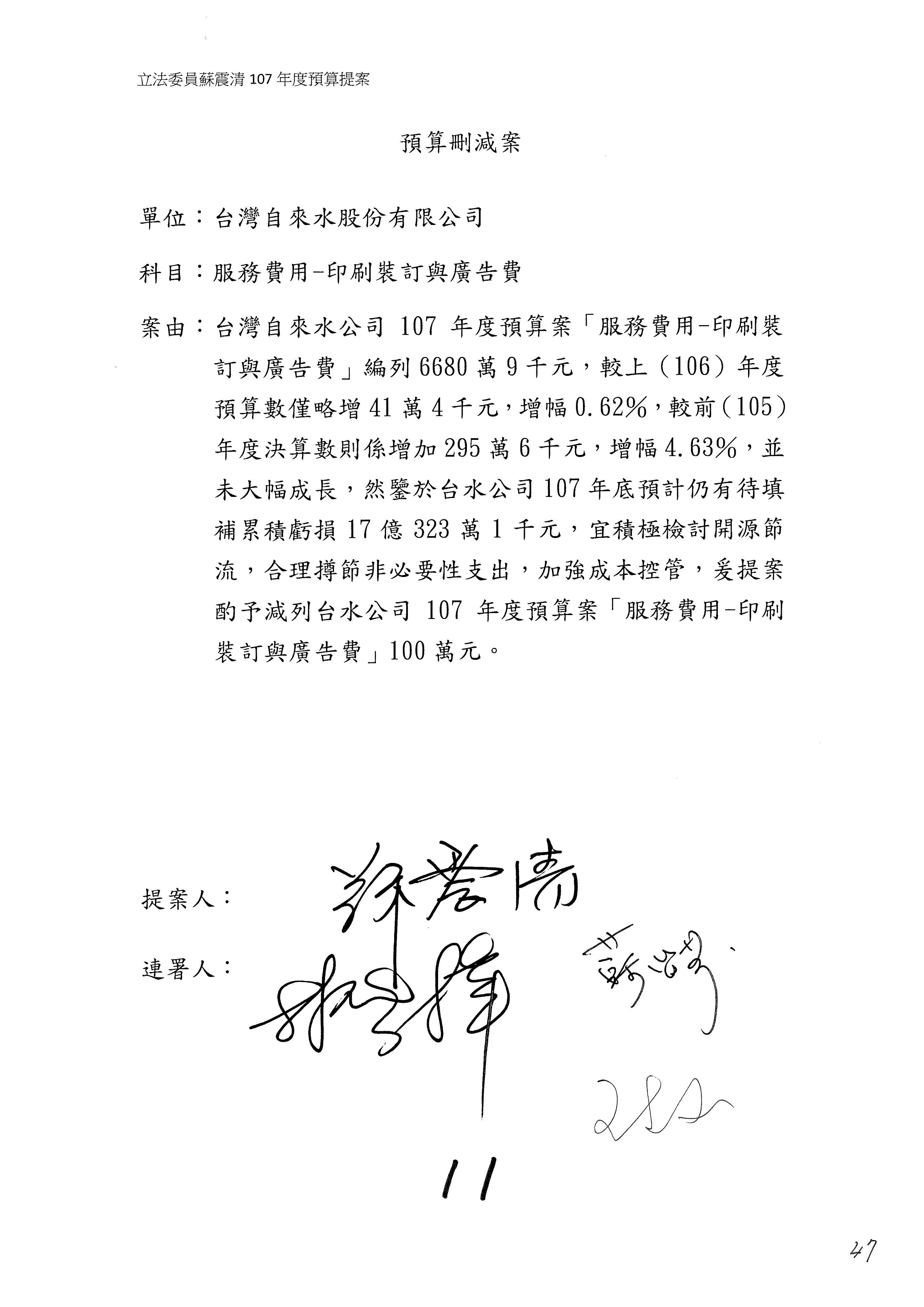 蕭委員美琴:現在都在講求環保,所以你們是否可以減少紙本的印刷?對此,本席提案減列300萬元,蘇委員則是建議減列100萬元。