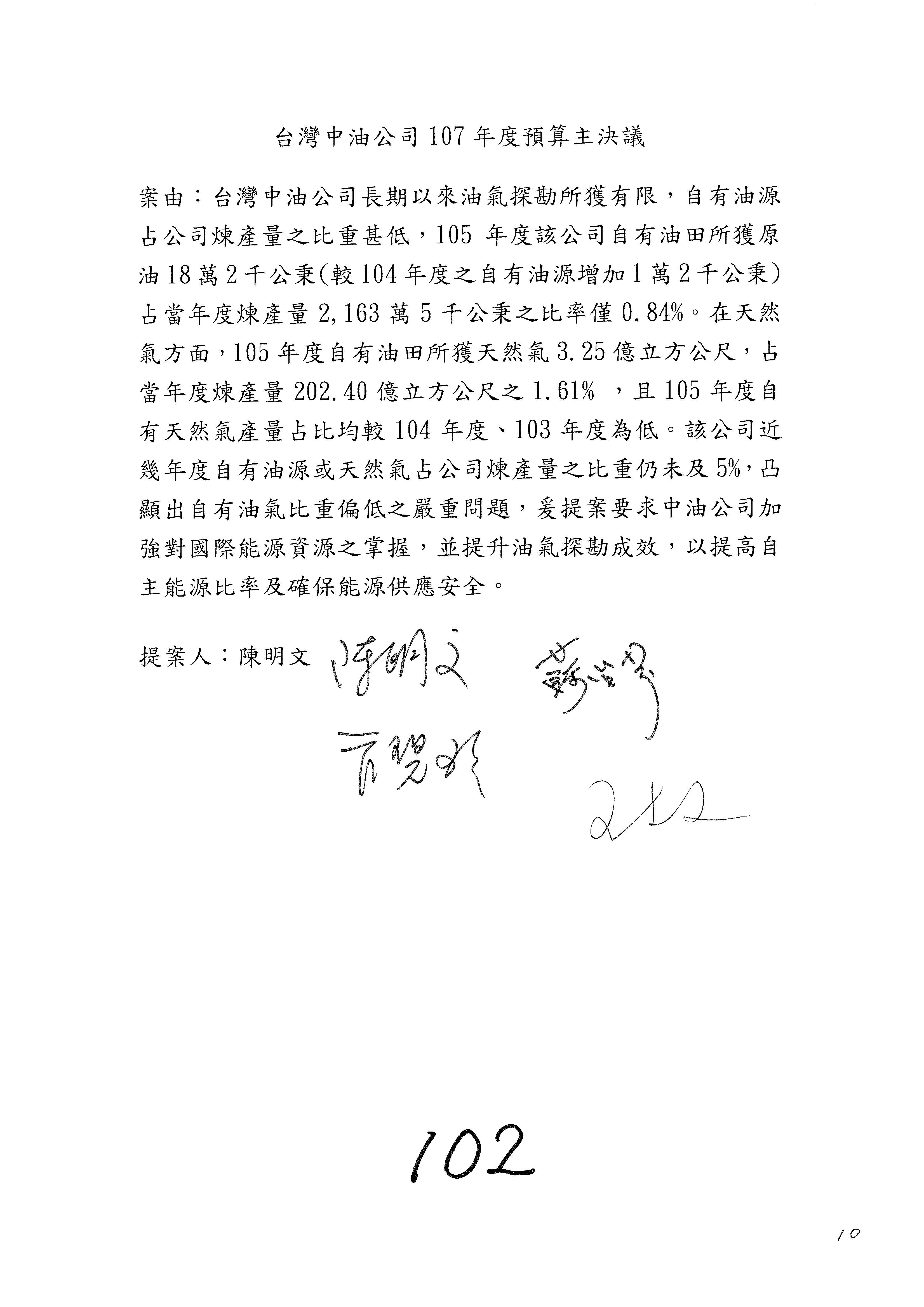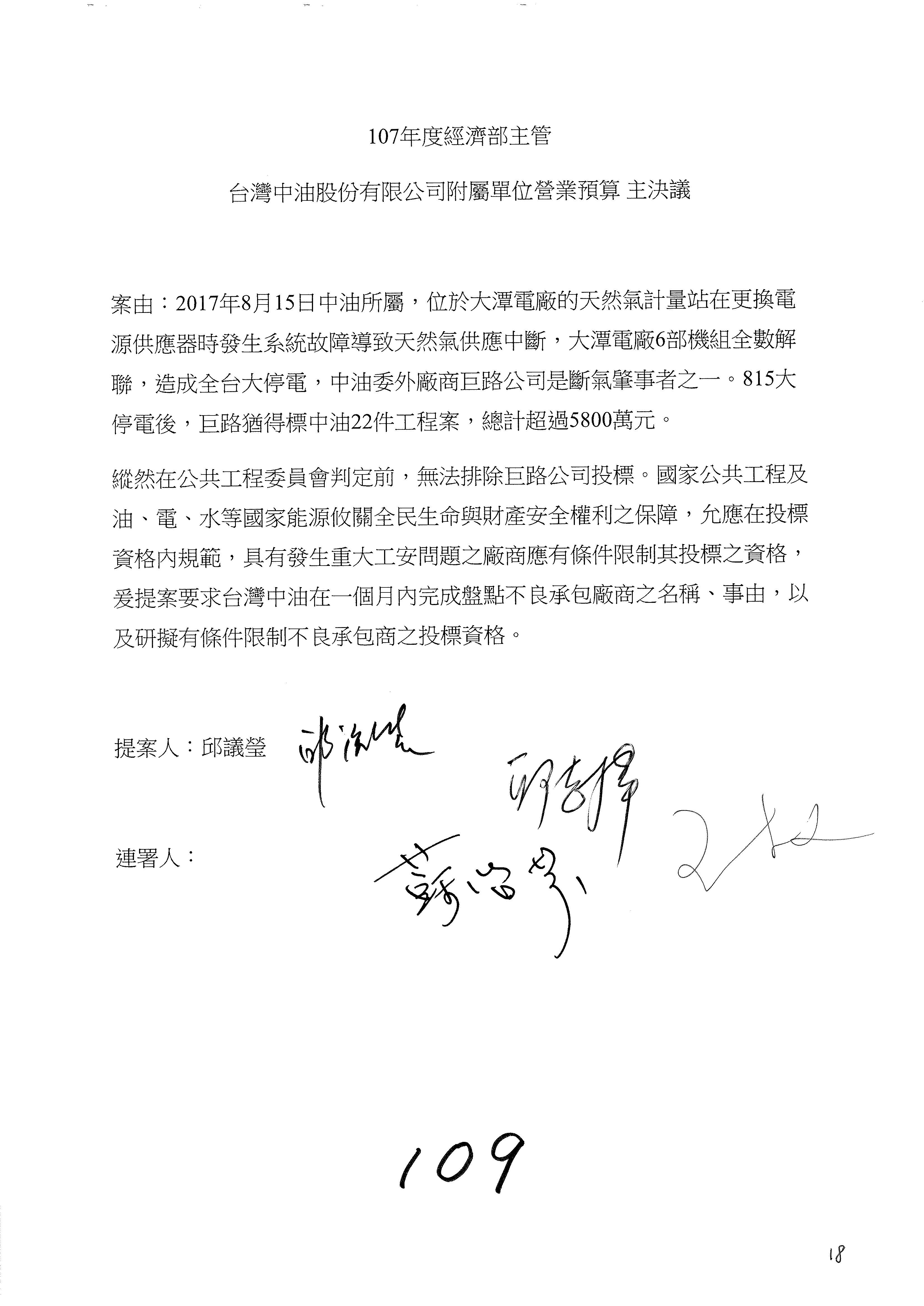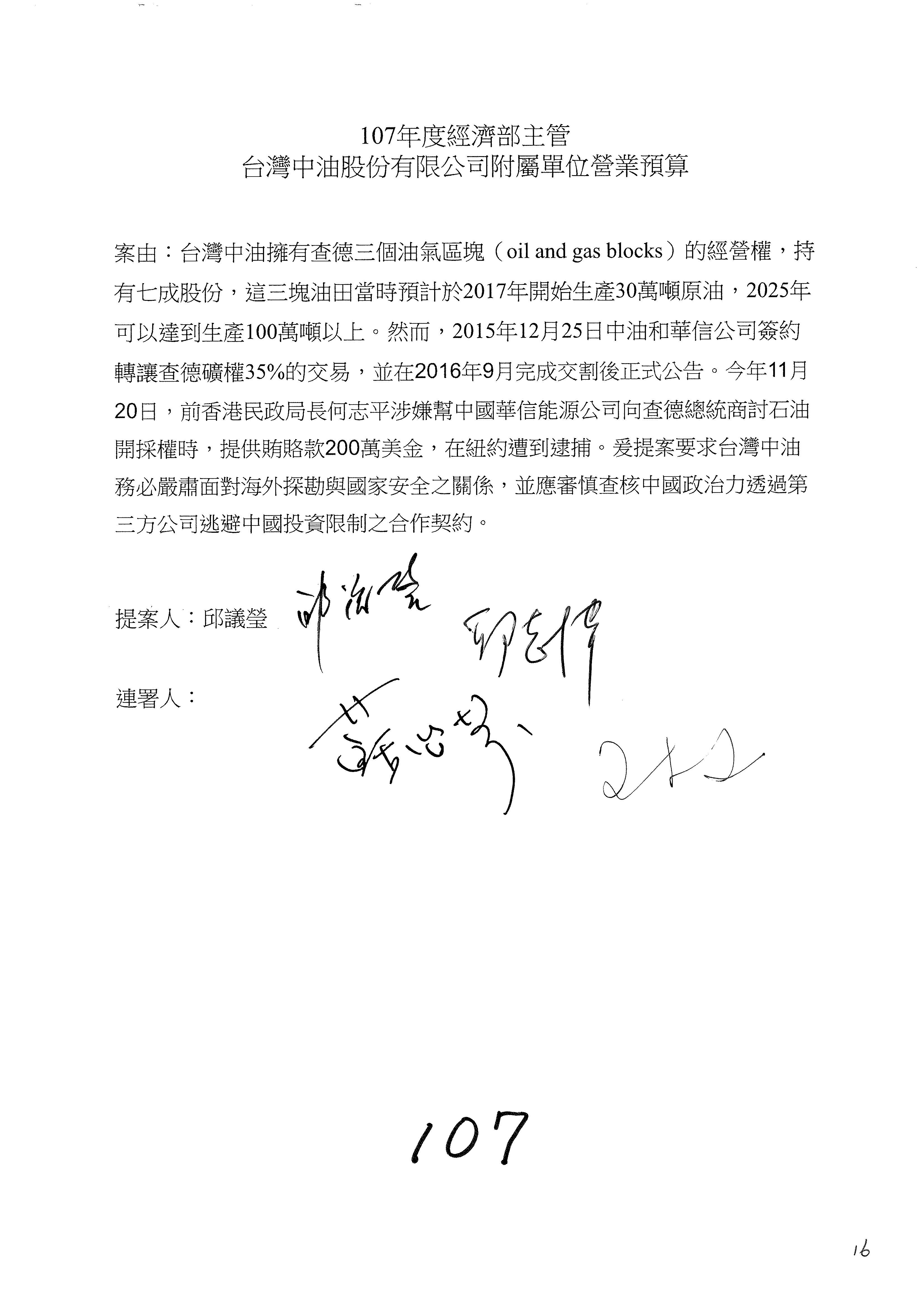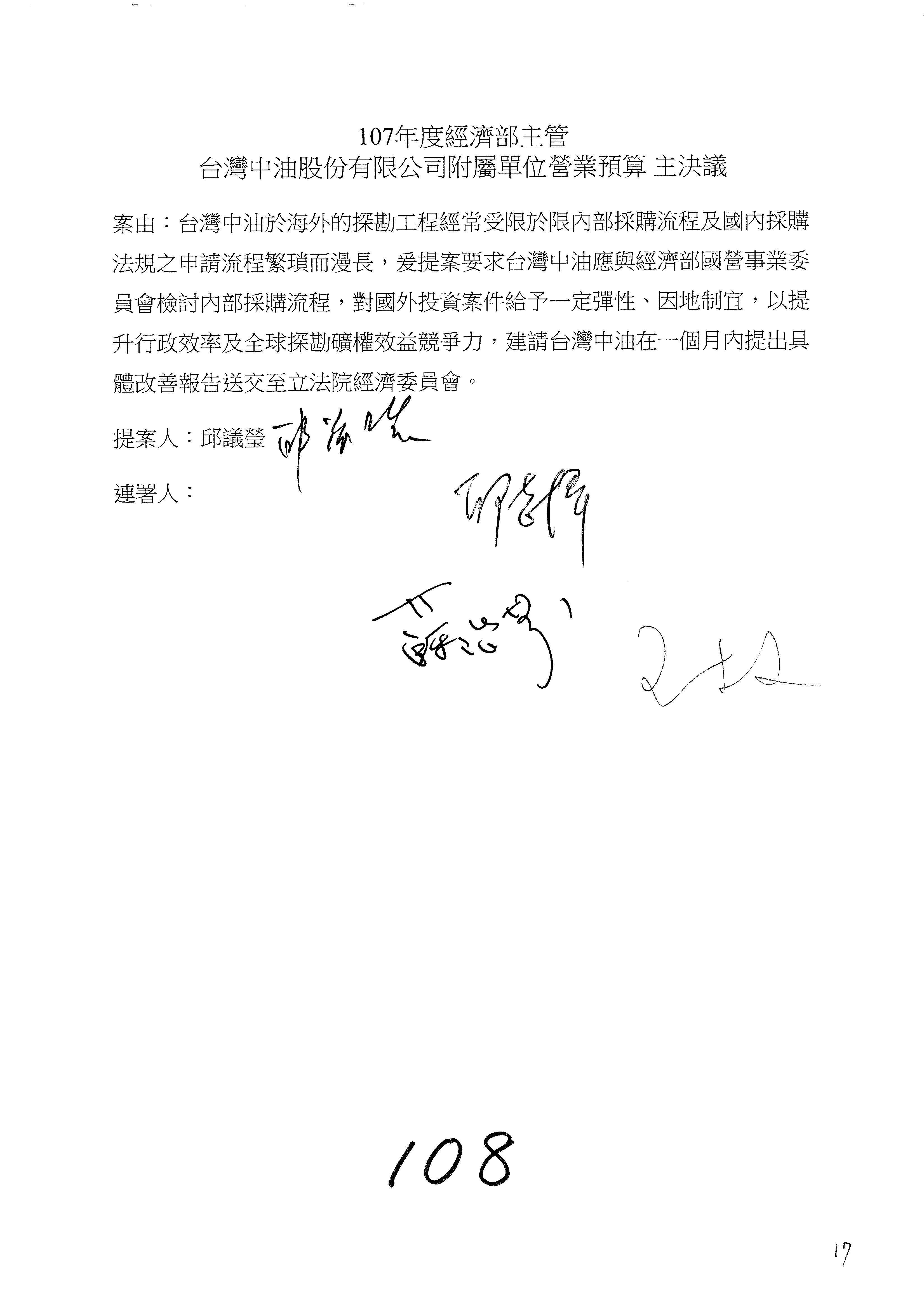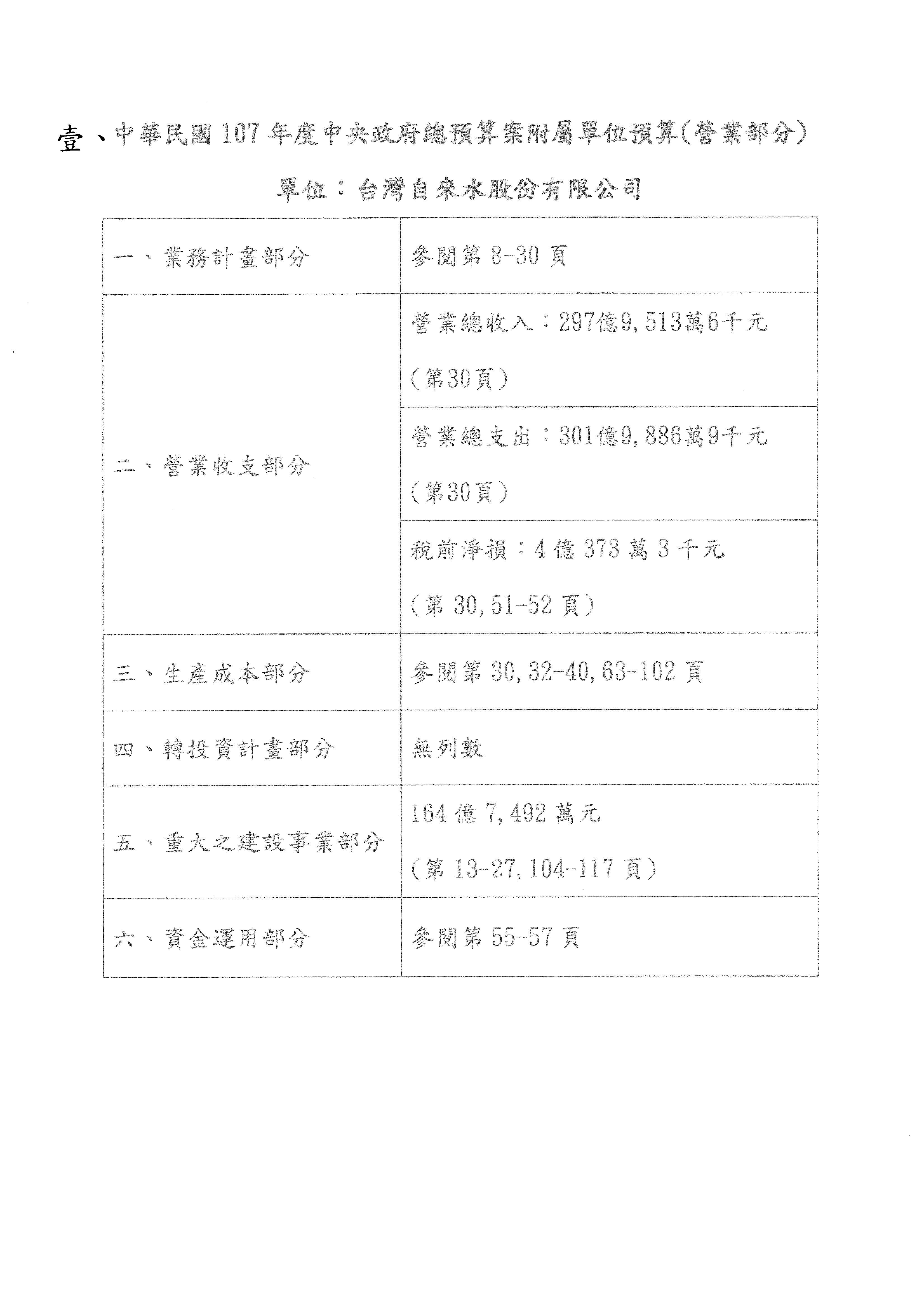 繼續審查107年度中央政府總預算案附屬單位預算營業部分關於經濟部主管:台灣自來水股份有限公司、台灣中油股份有限公司。