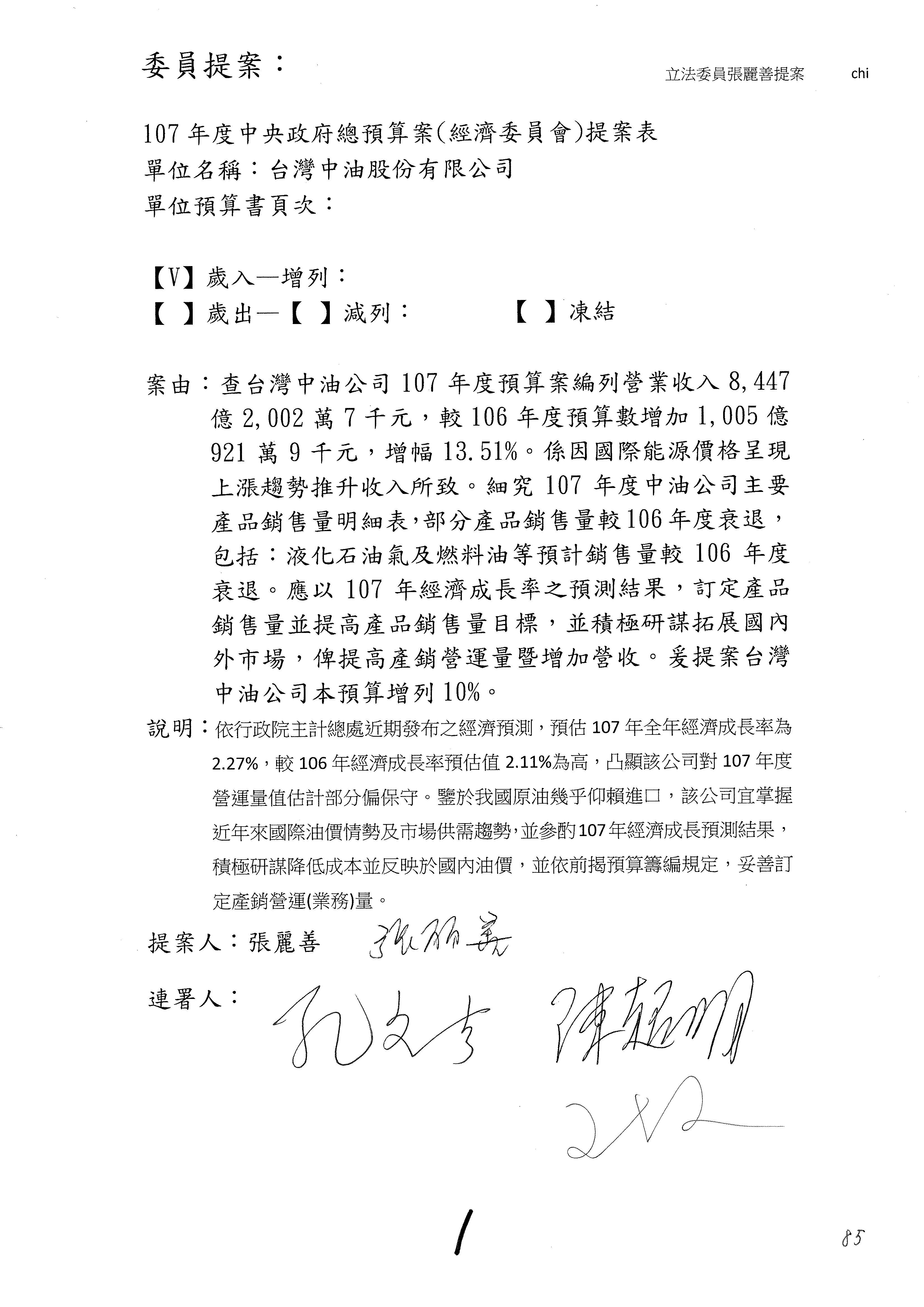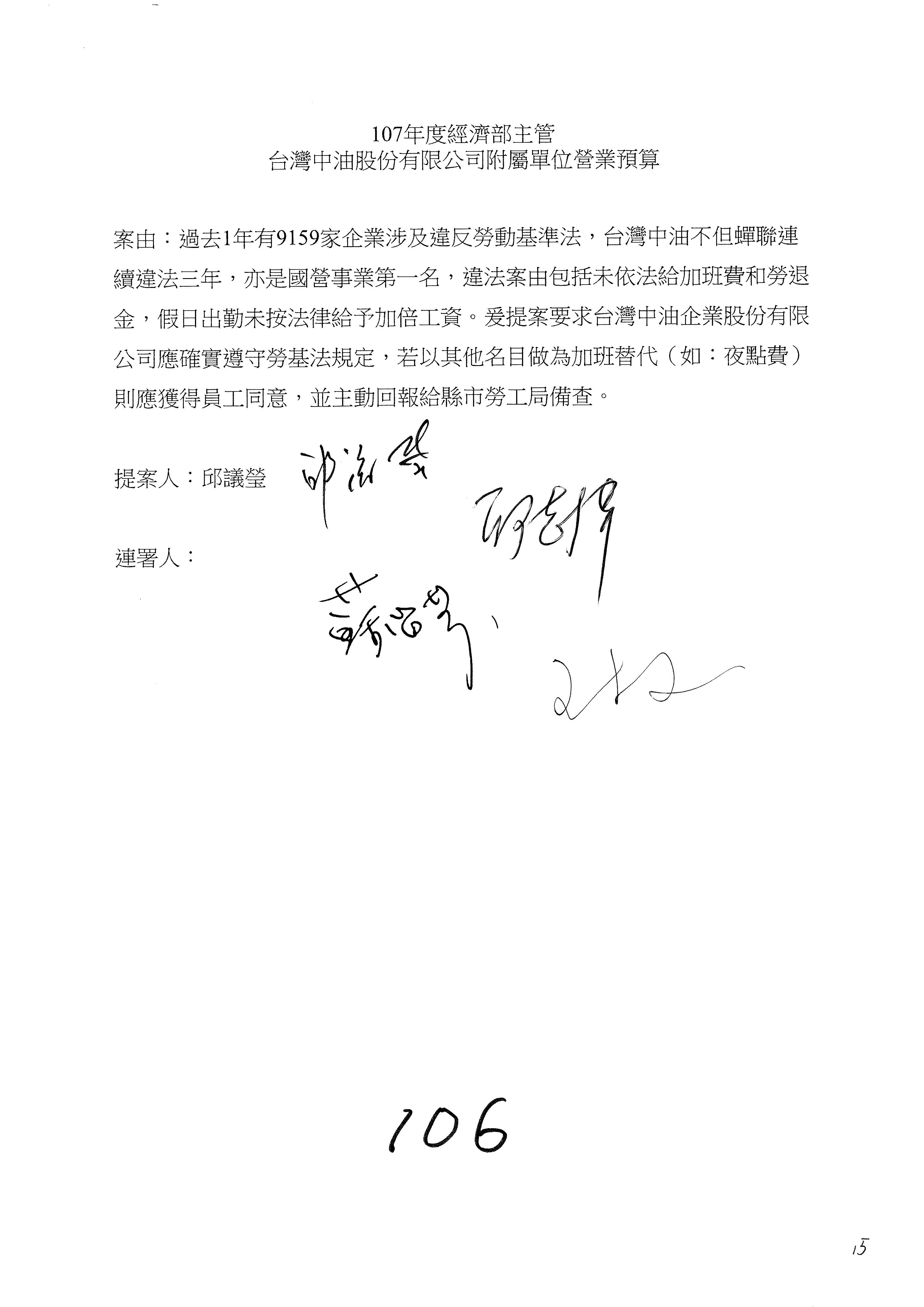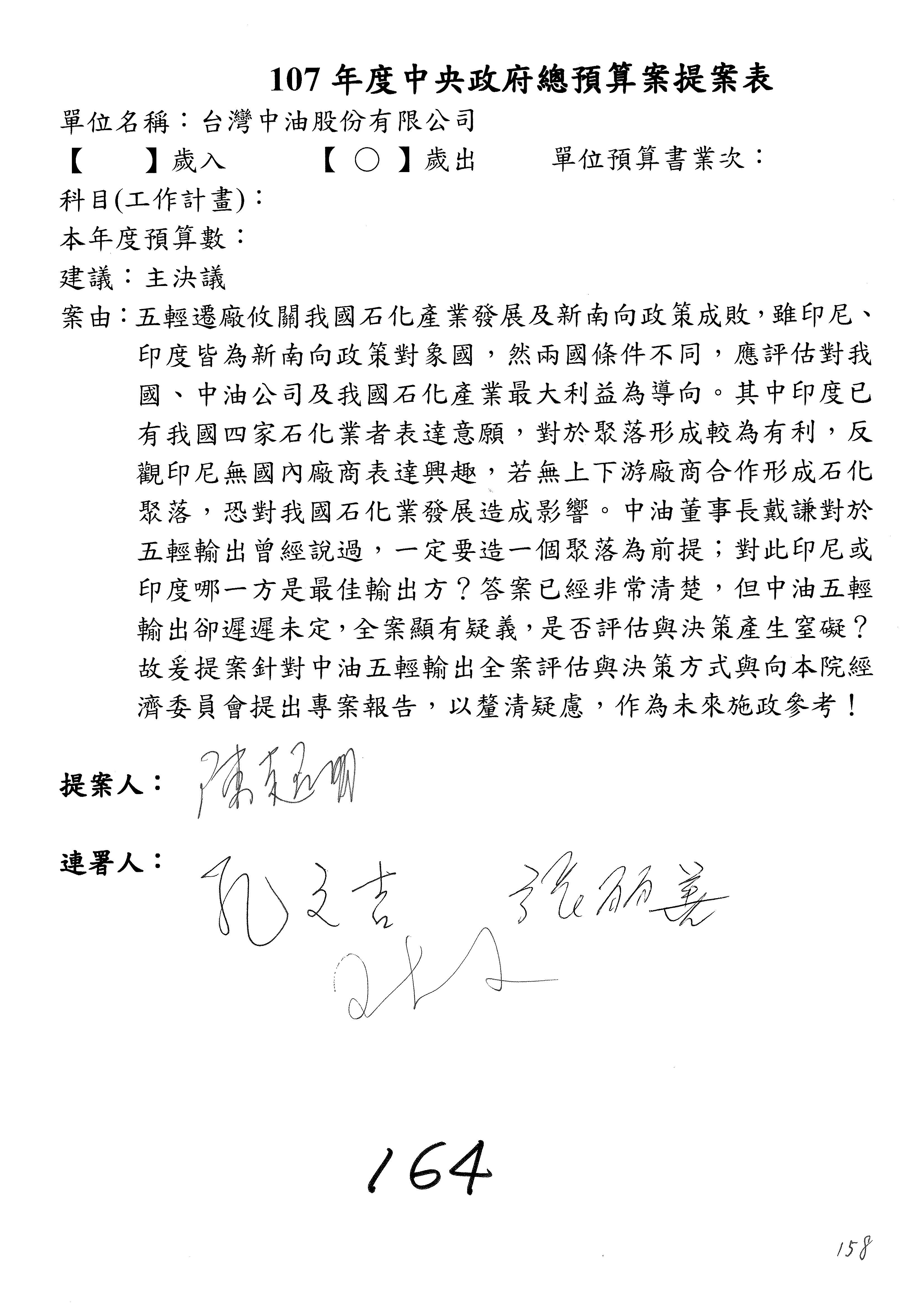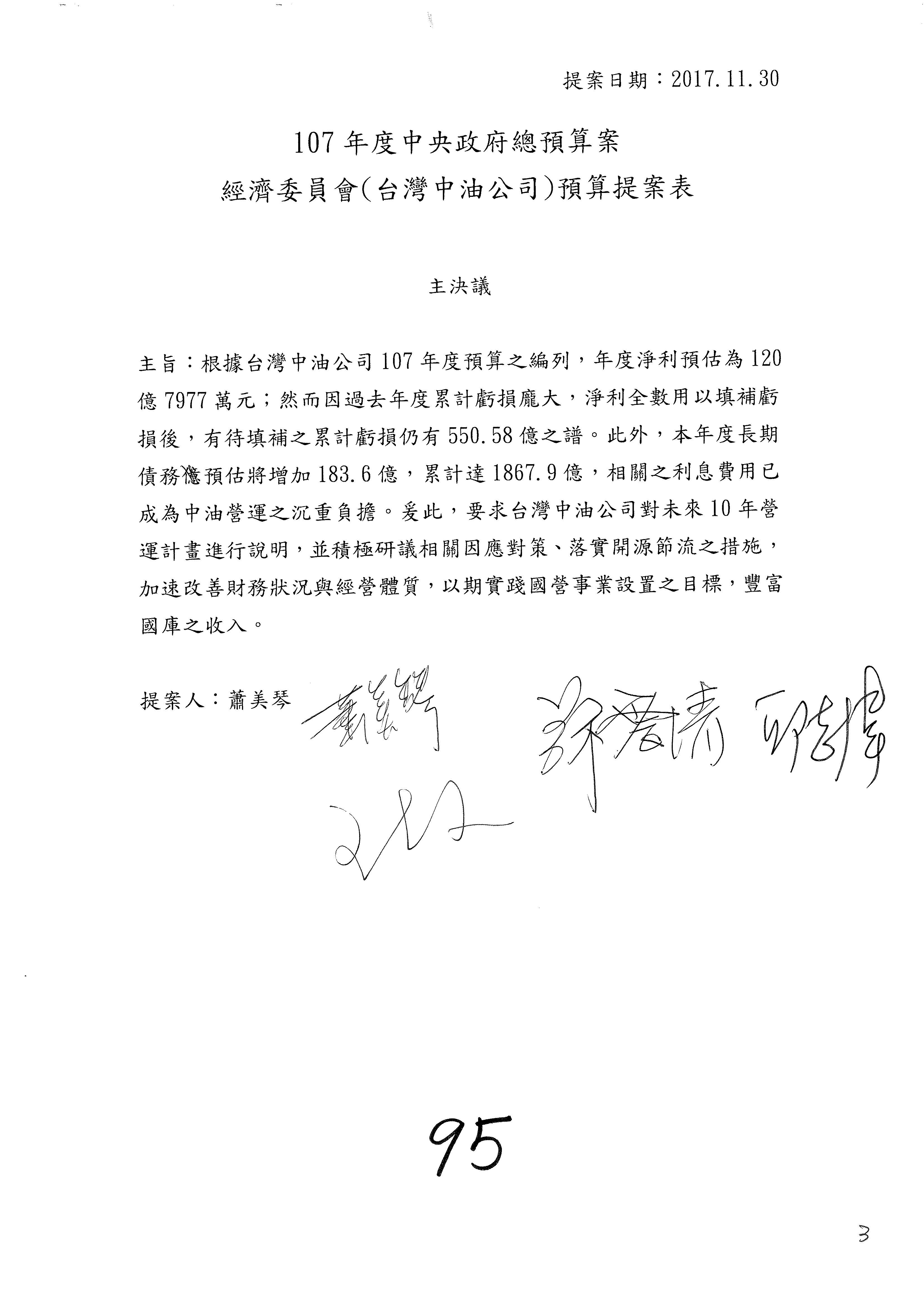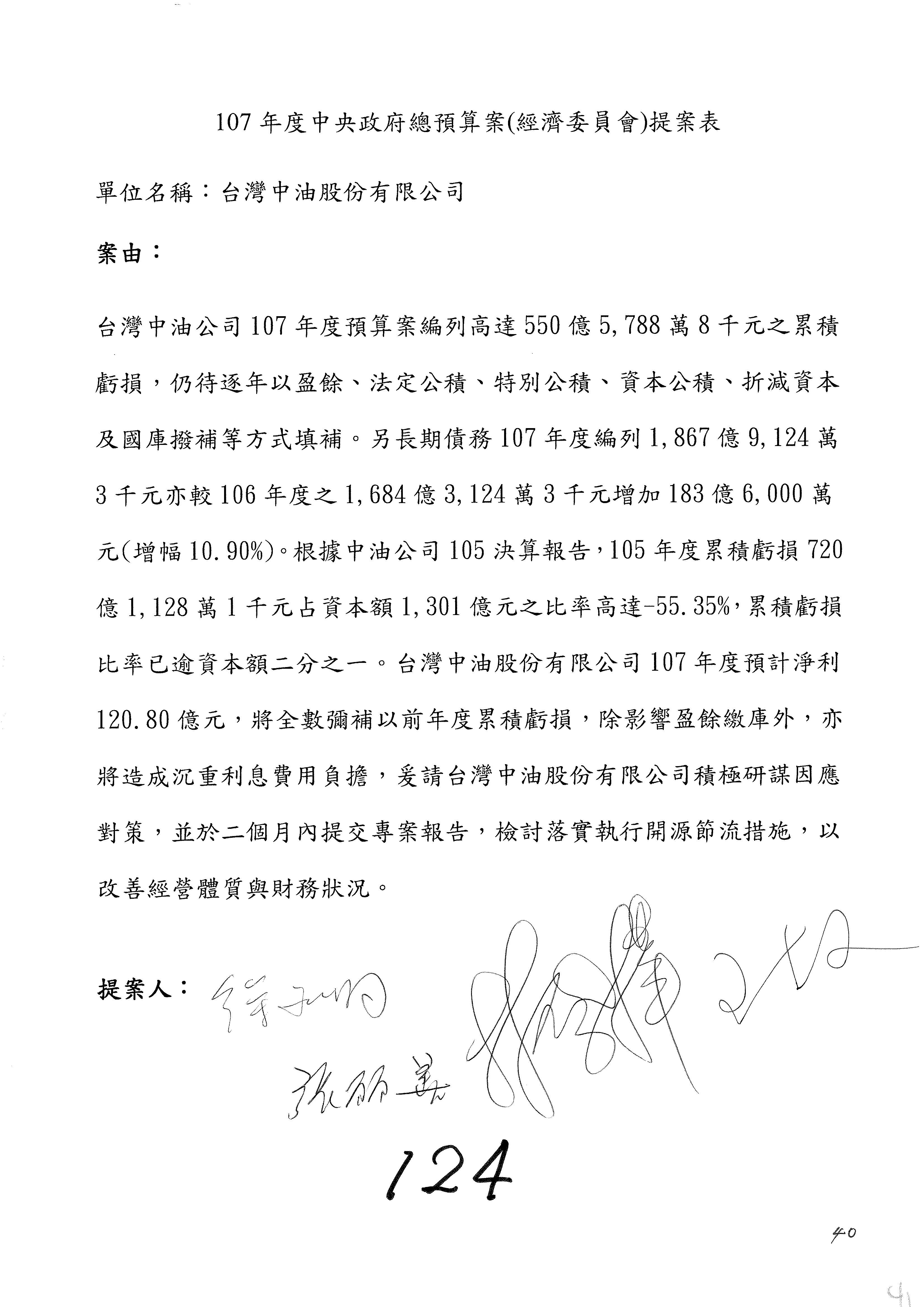 繼續審查107年度中央政府總預算案附屬單位預算營業部分關於經濟部主管:台灣自來水股份有限公司、台灣中油股份有限公司。