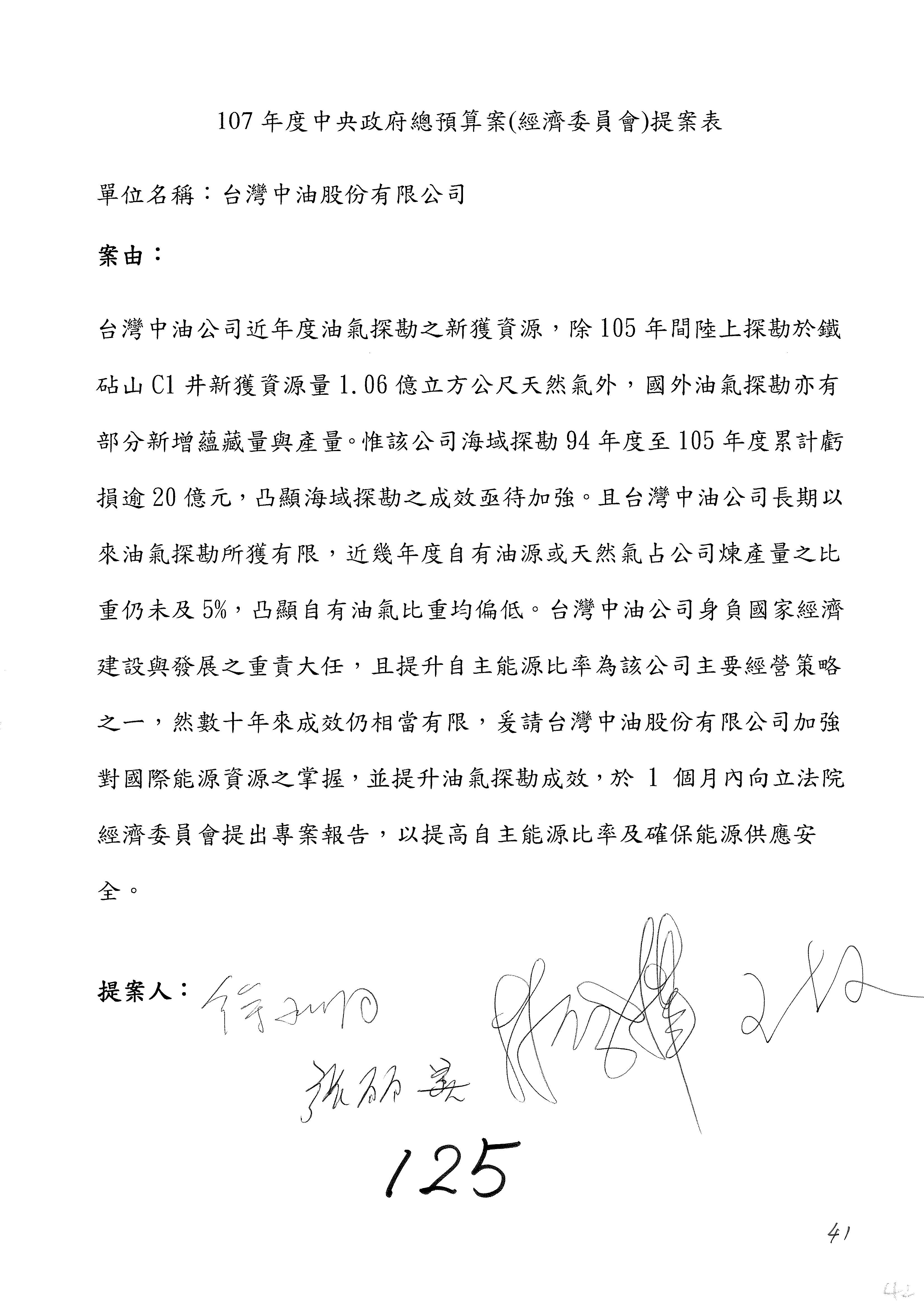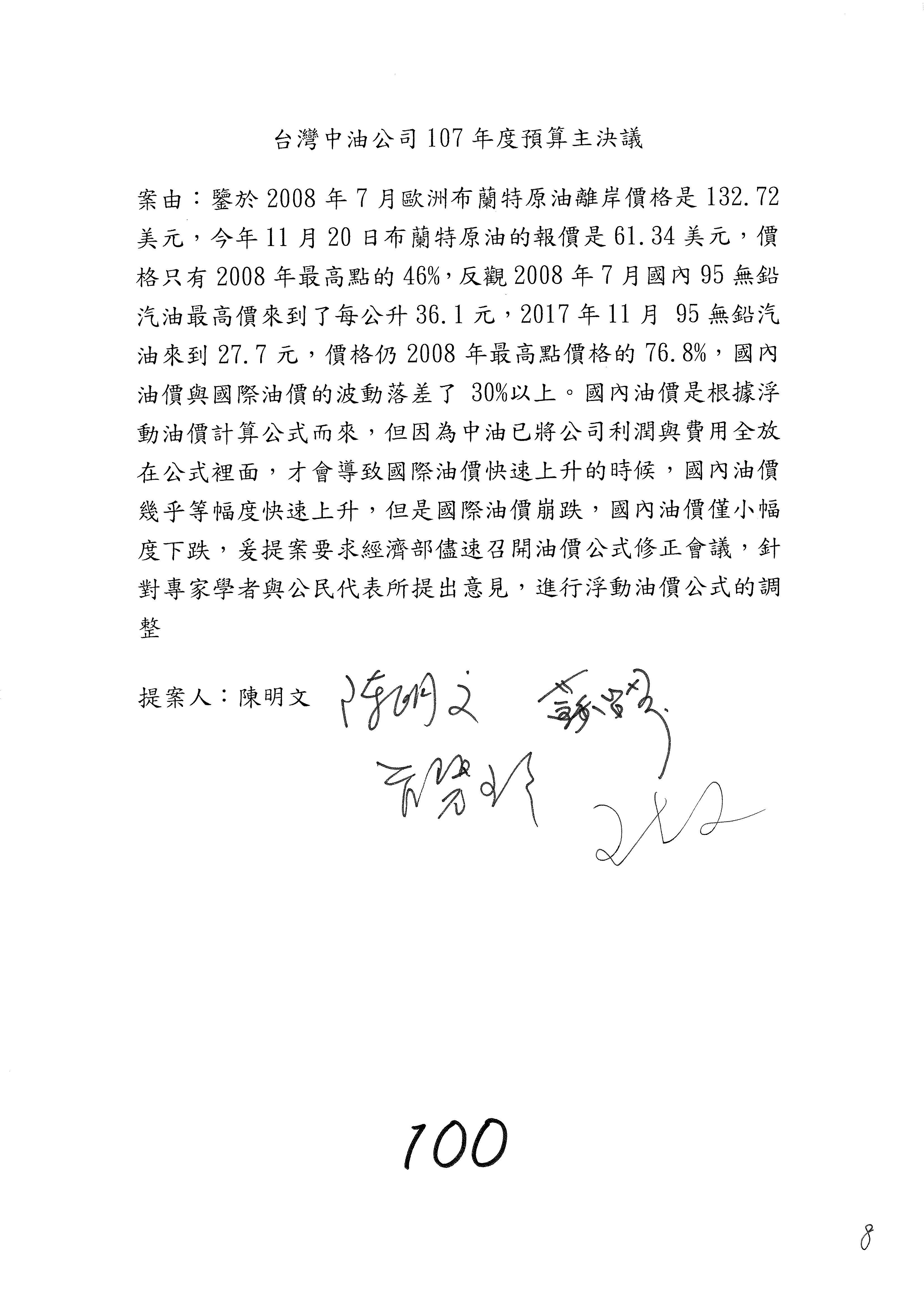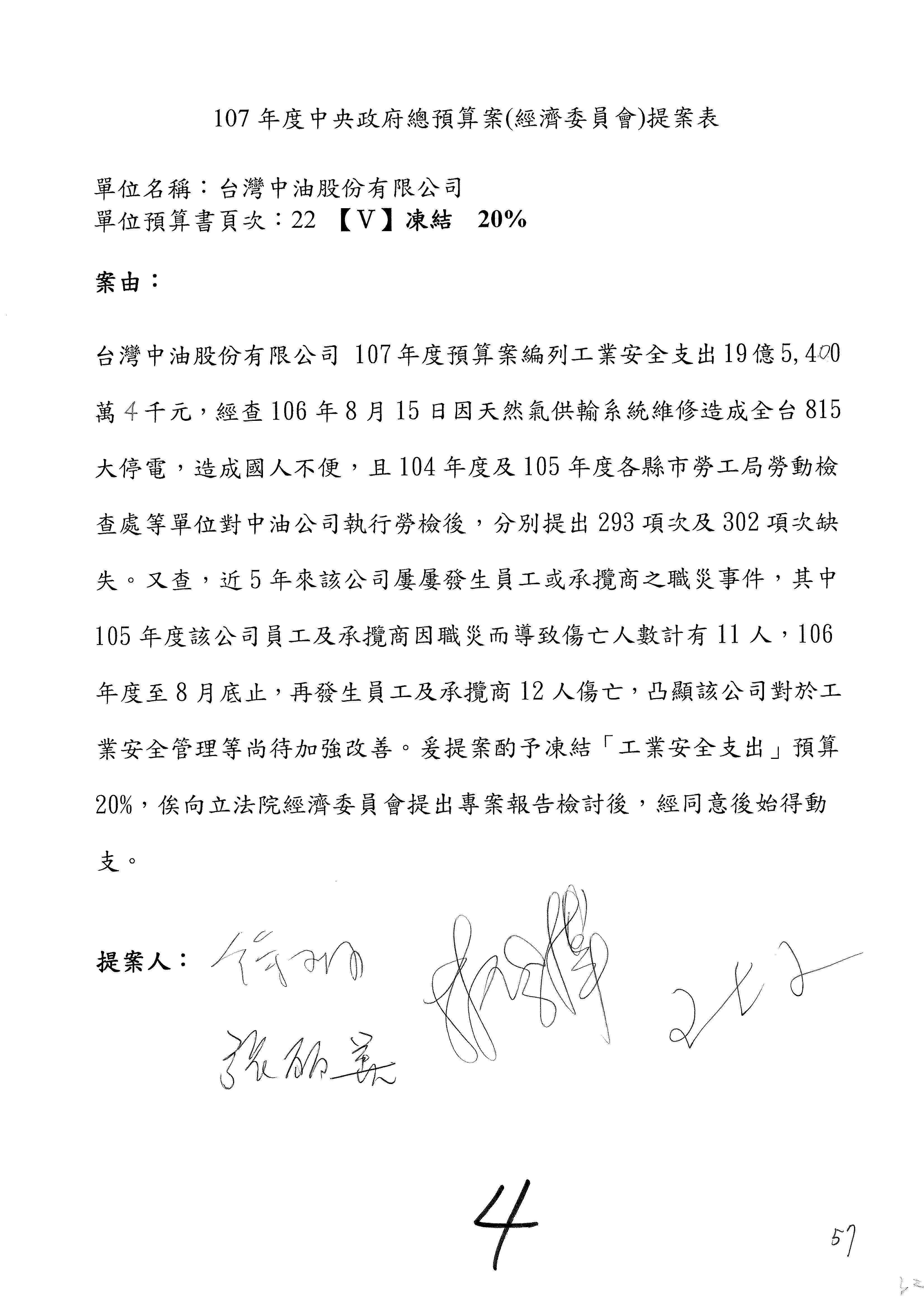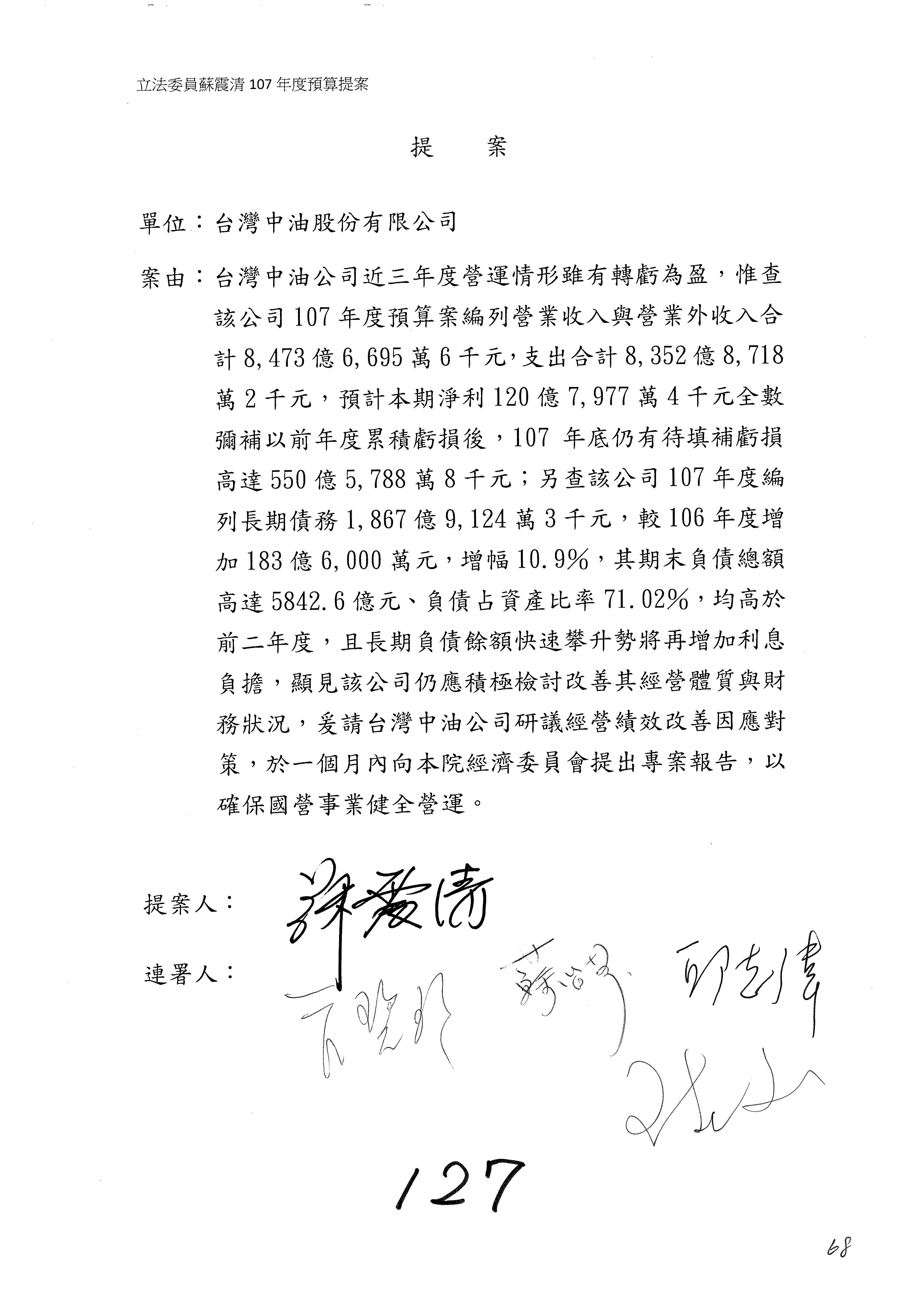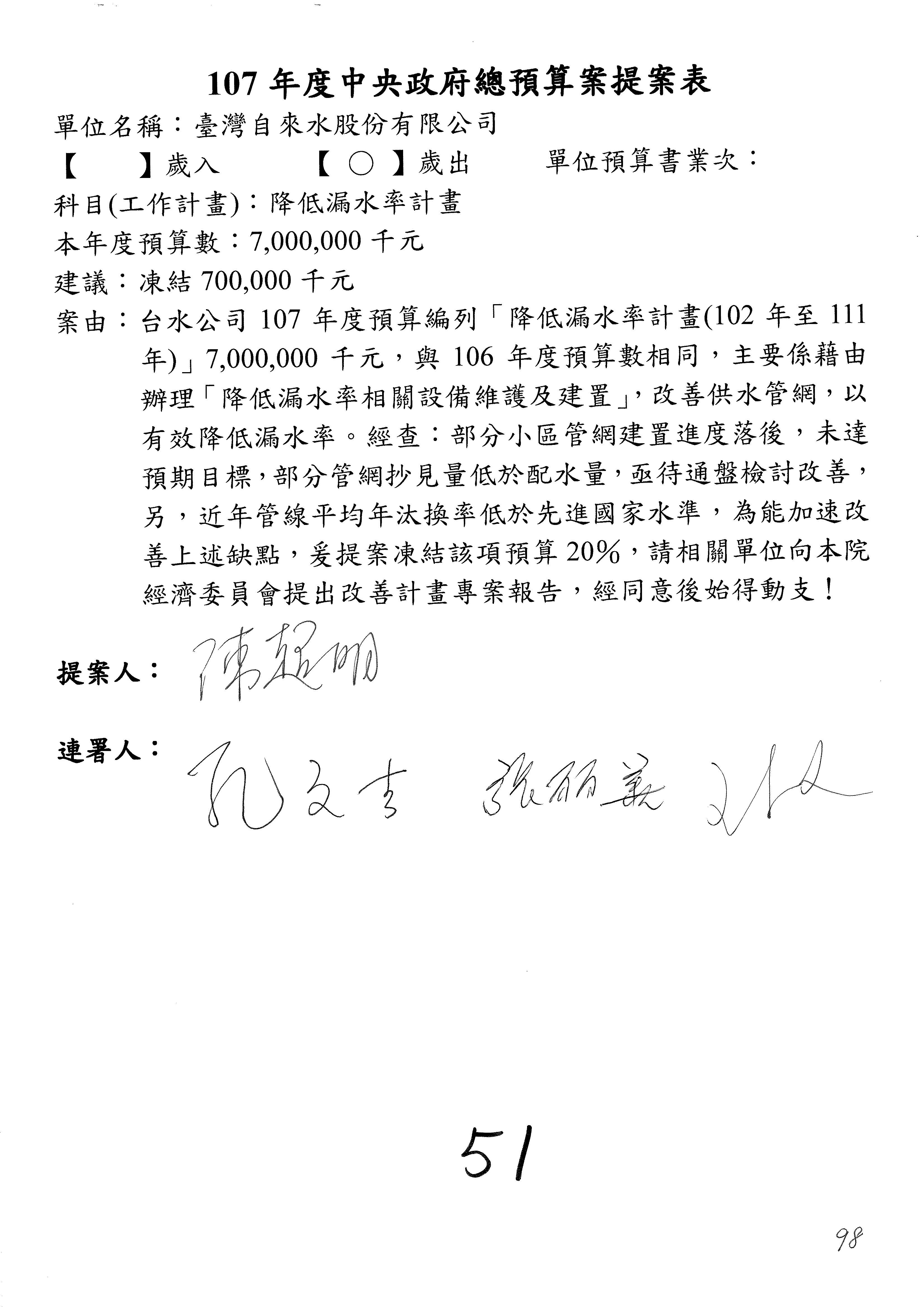 繼續審查107年度中央政府總預算案附屬單位預算營業部分關於經濟部主管:台灣自來水股份有限公司、台灣中油股份有限公司。