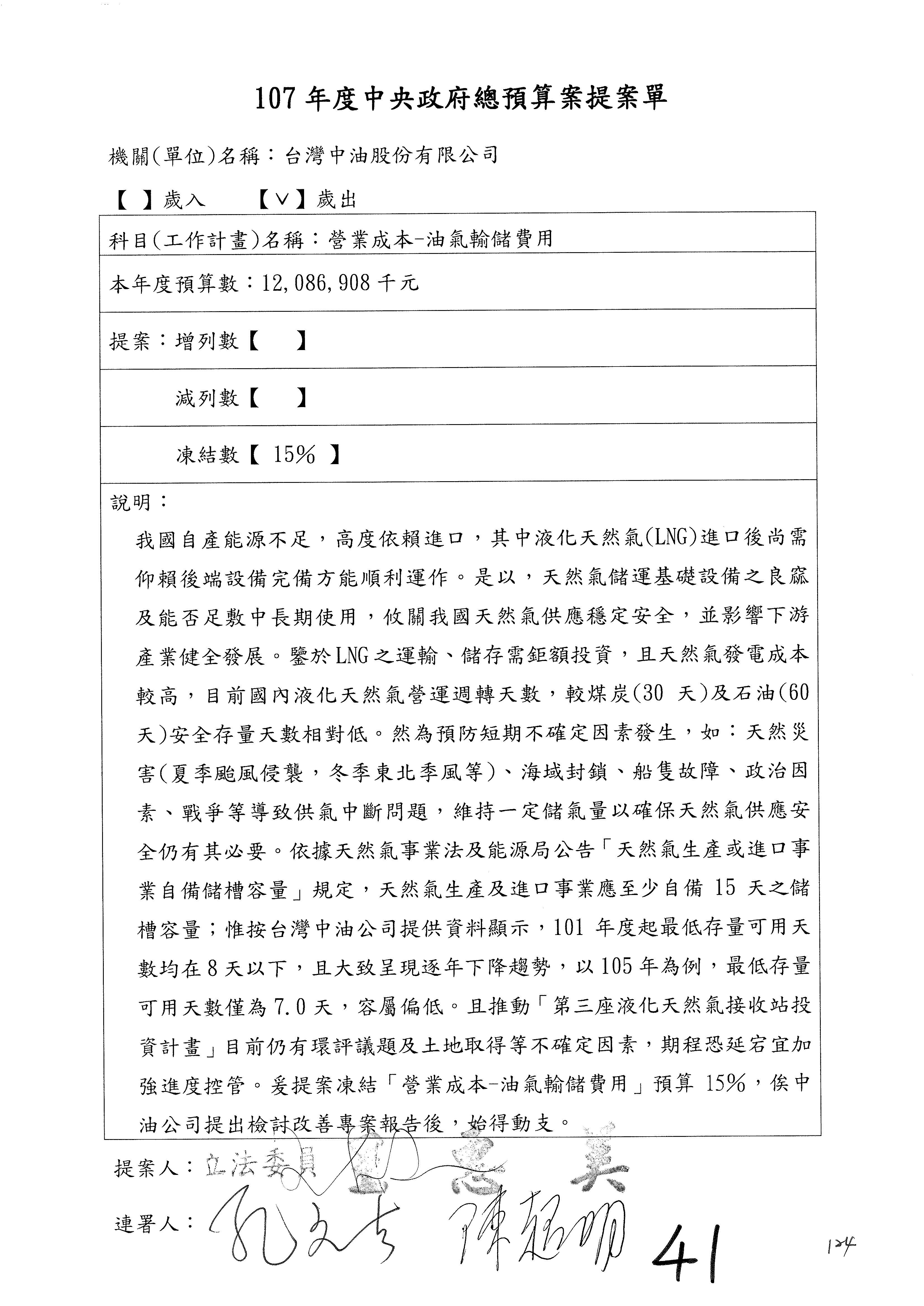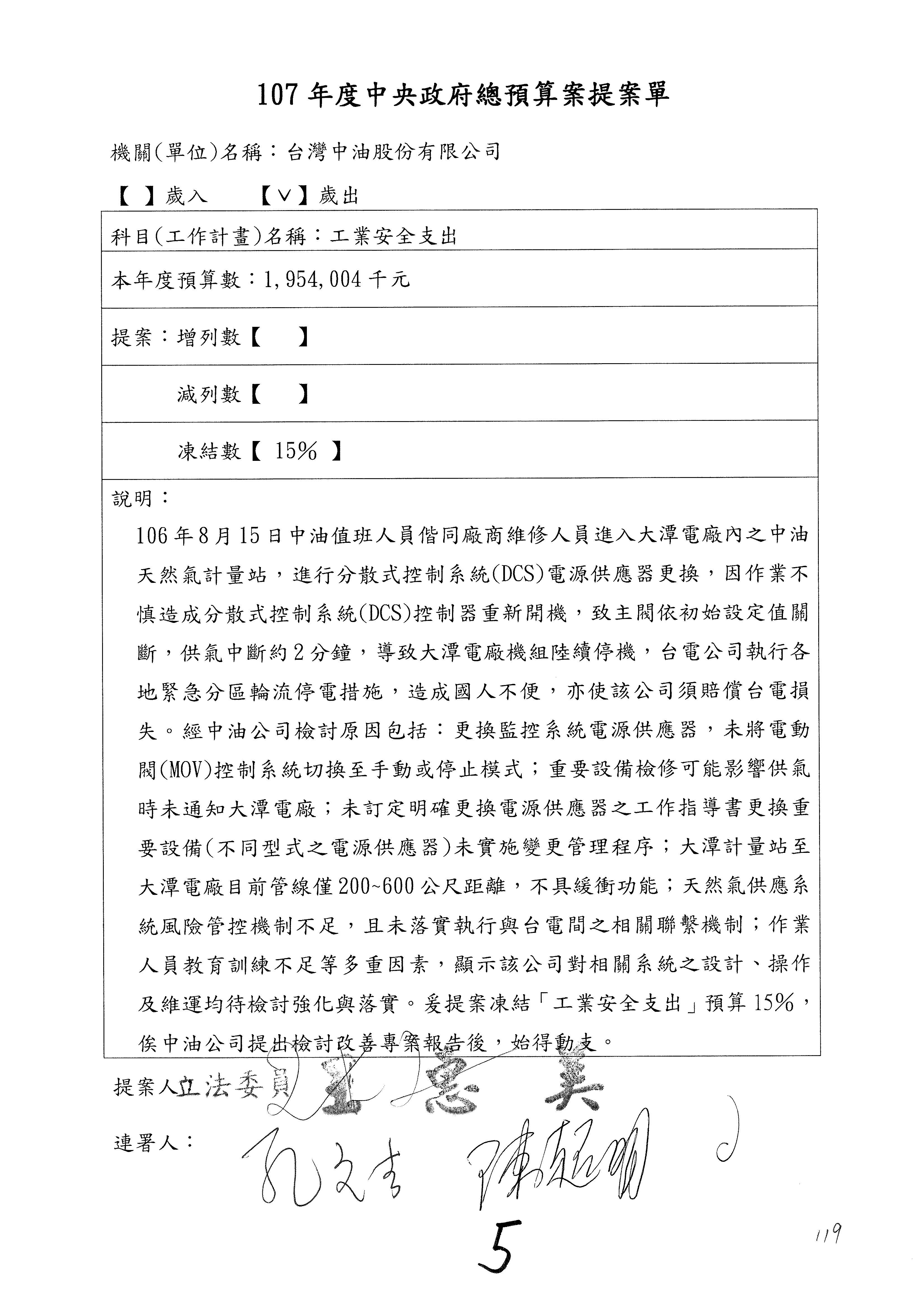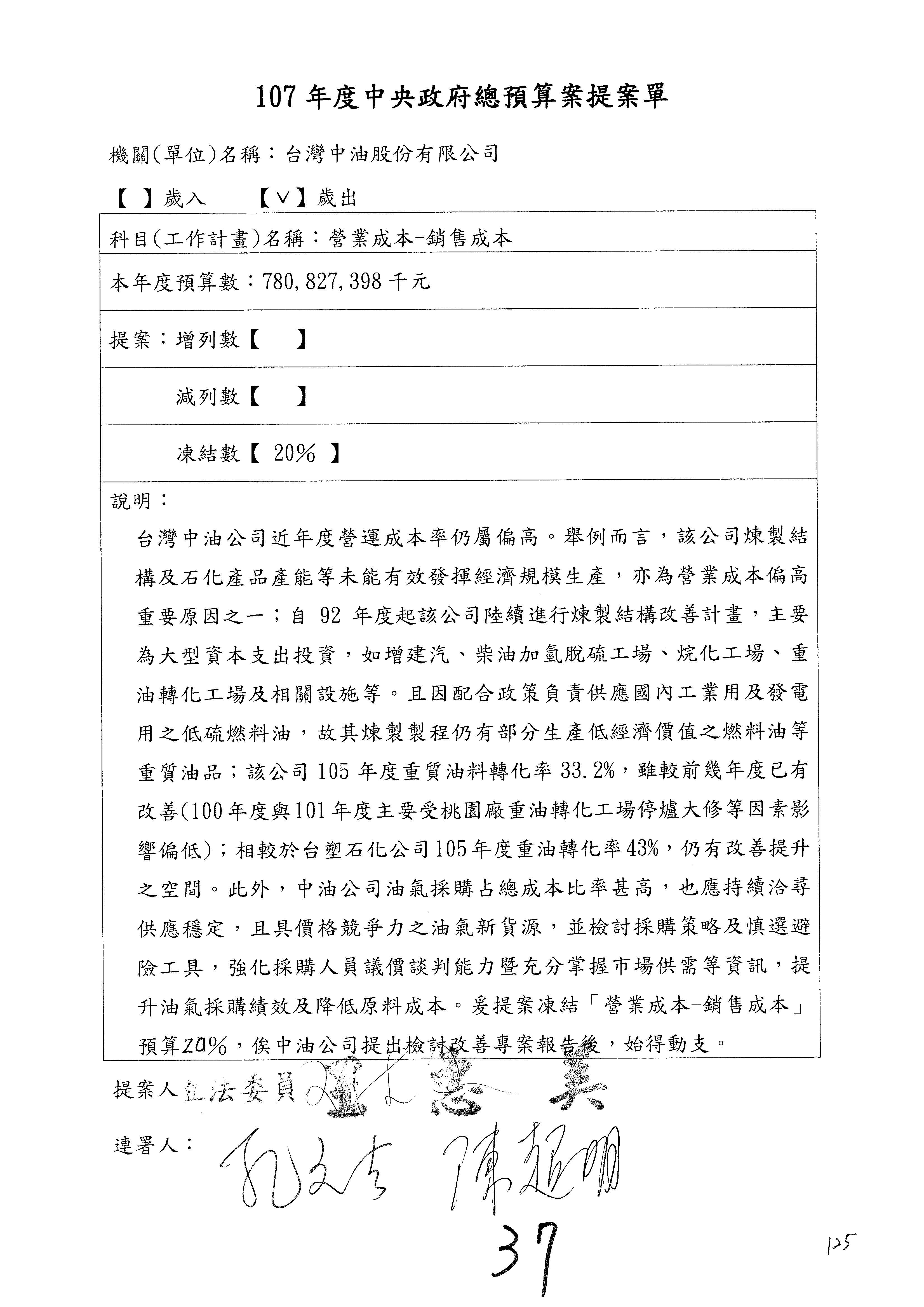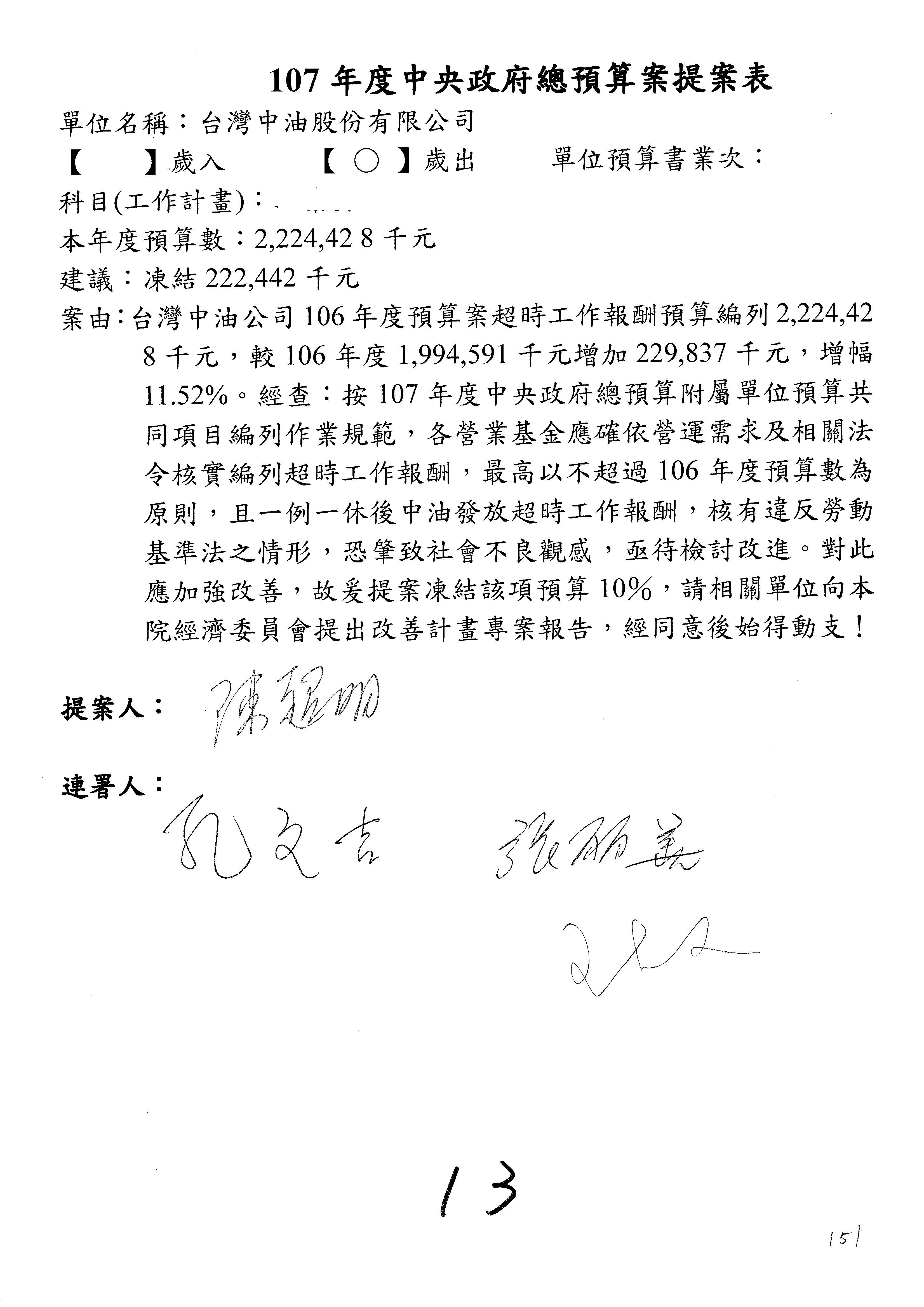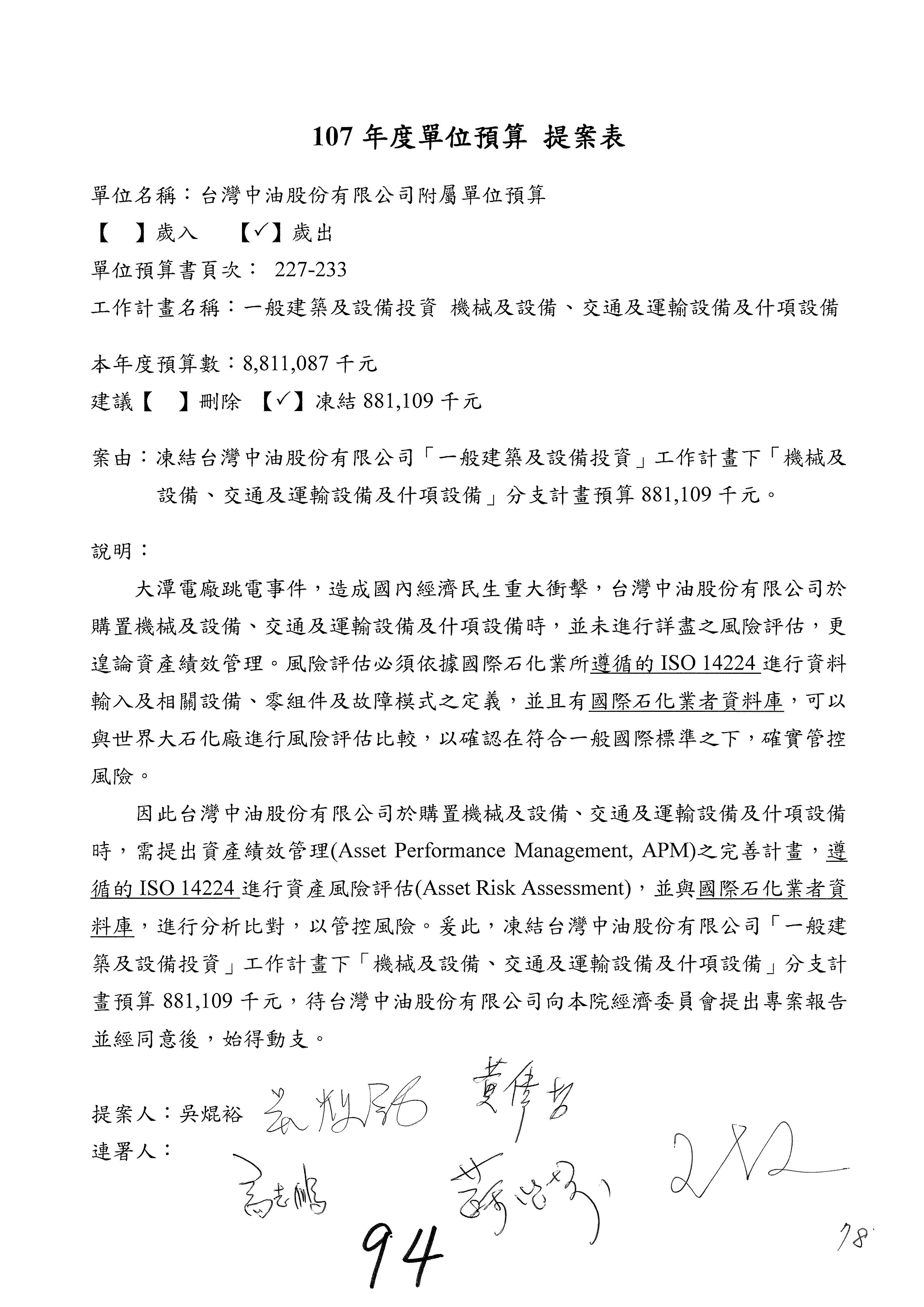 繼續審查107年度中央政府總預算案附屬單位預算營業部分關於經濟部主管:台灣自來水股份有限公司、台灣中油股份有限公司。