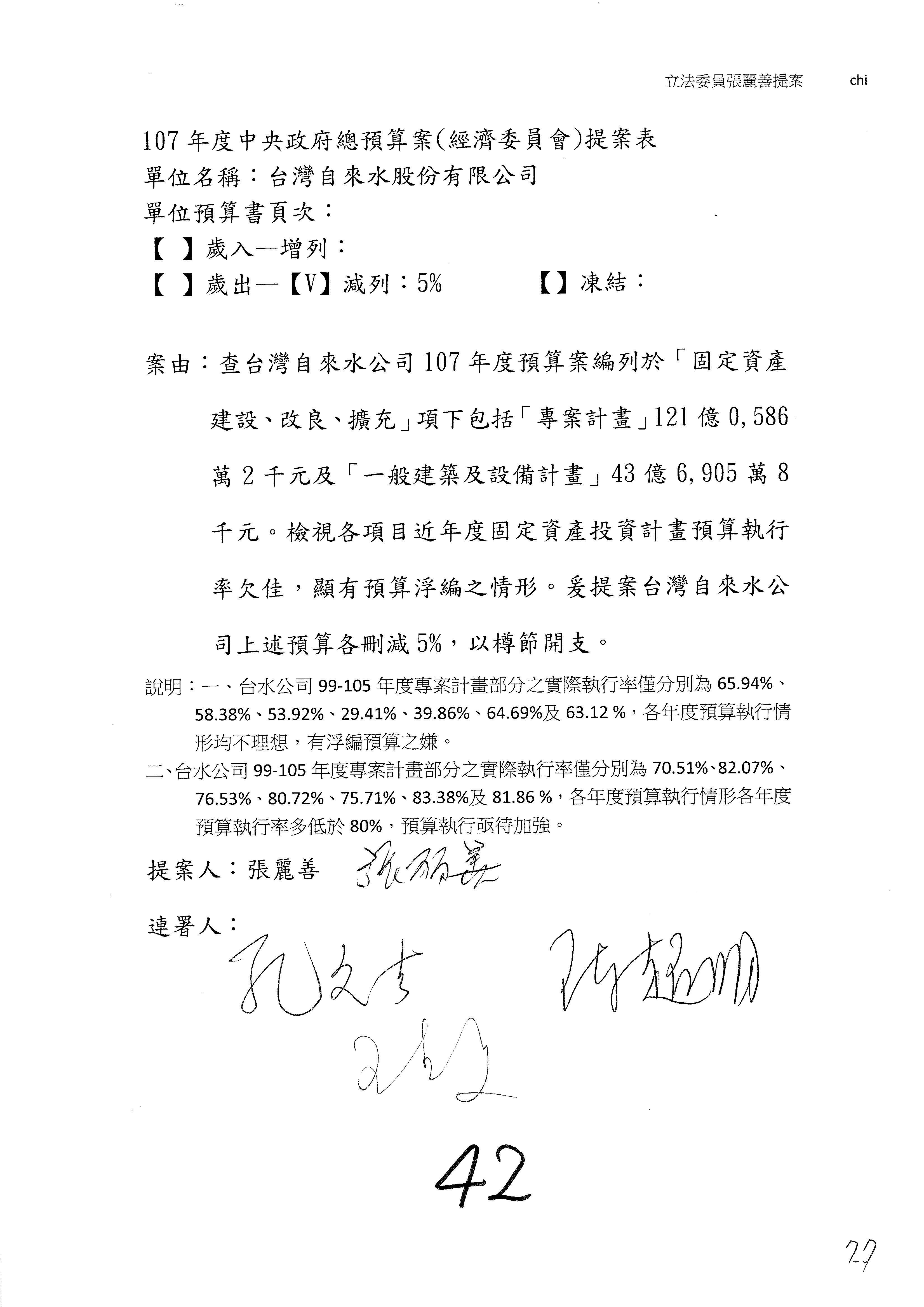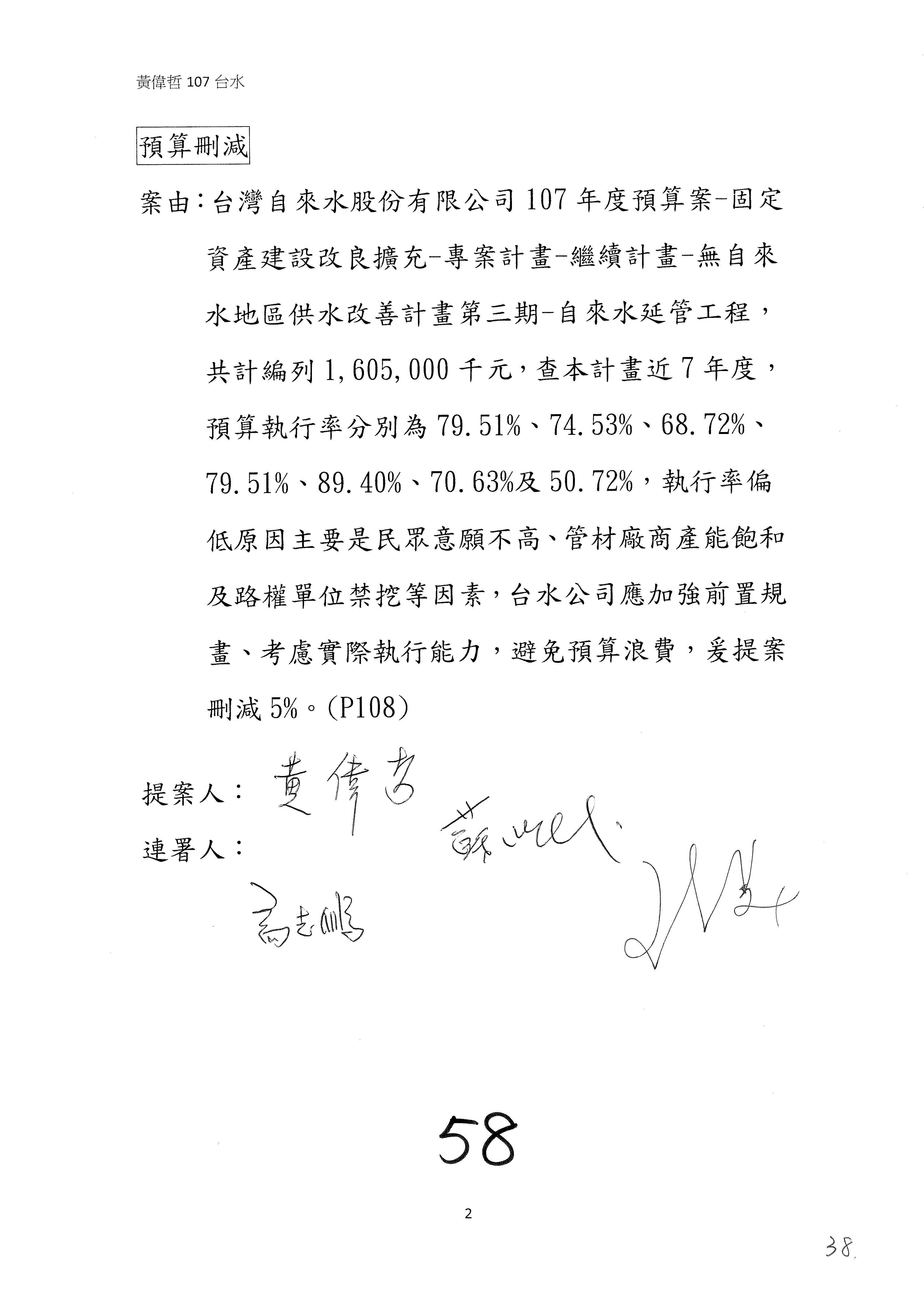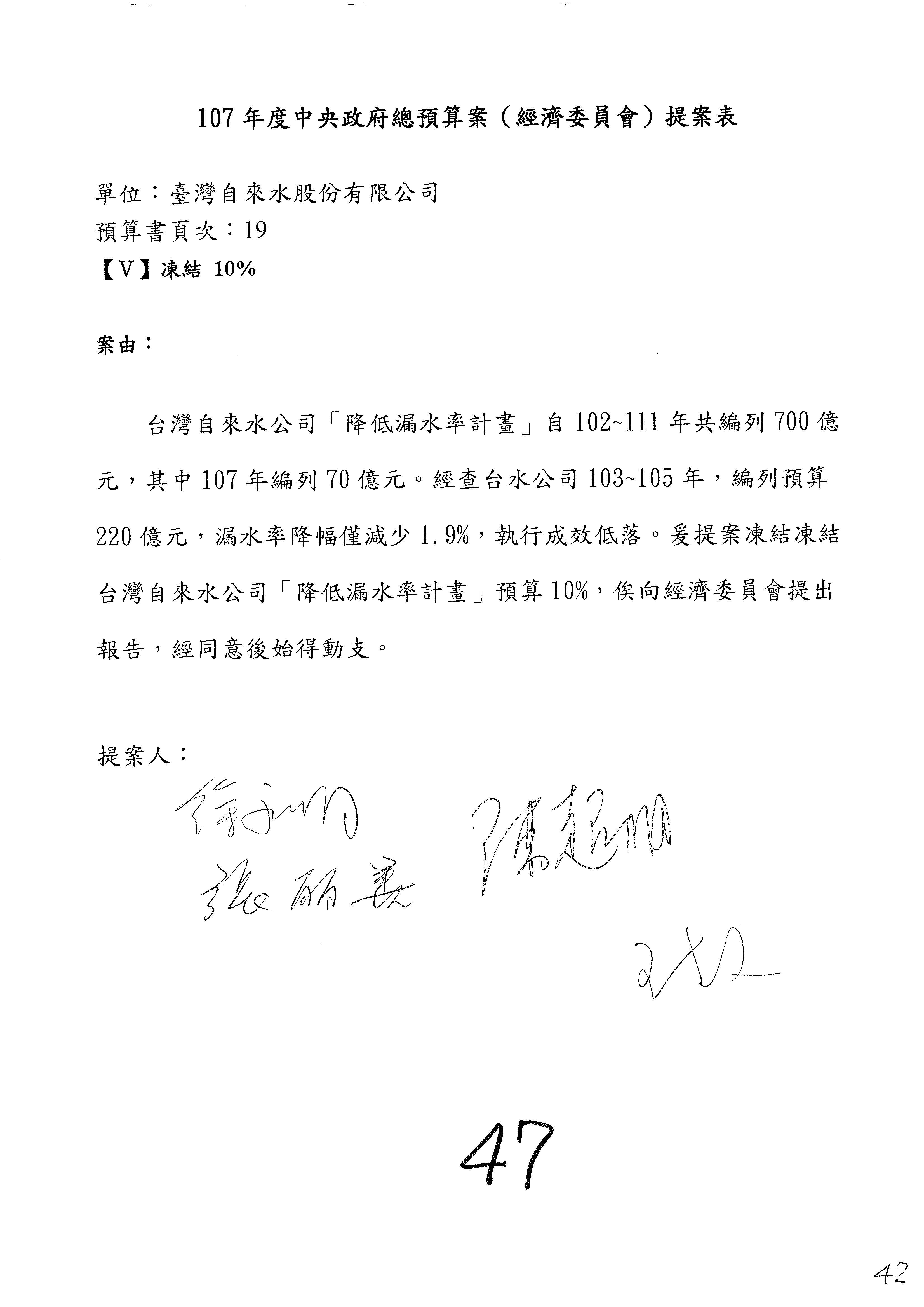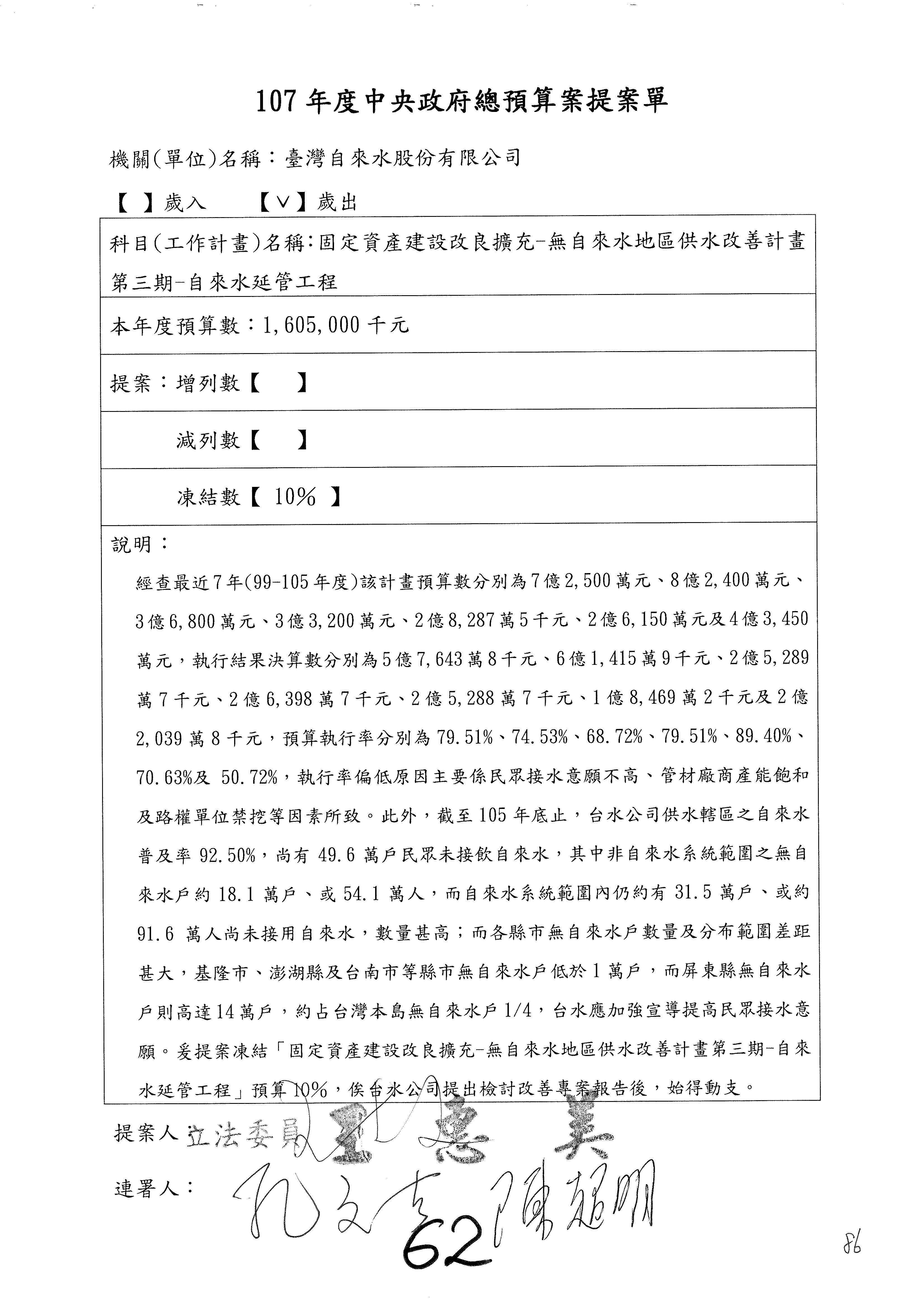 重大之建設事業部分:第42案至第65案併案處理,處理情形如下─通過無自來水地區不予減列外,重大之建設事業部分減列1億元,以上科目均自行調整。