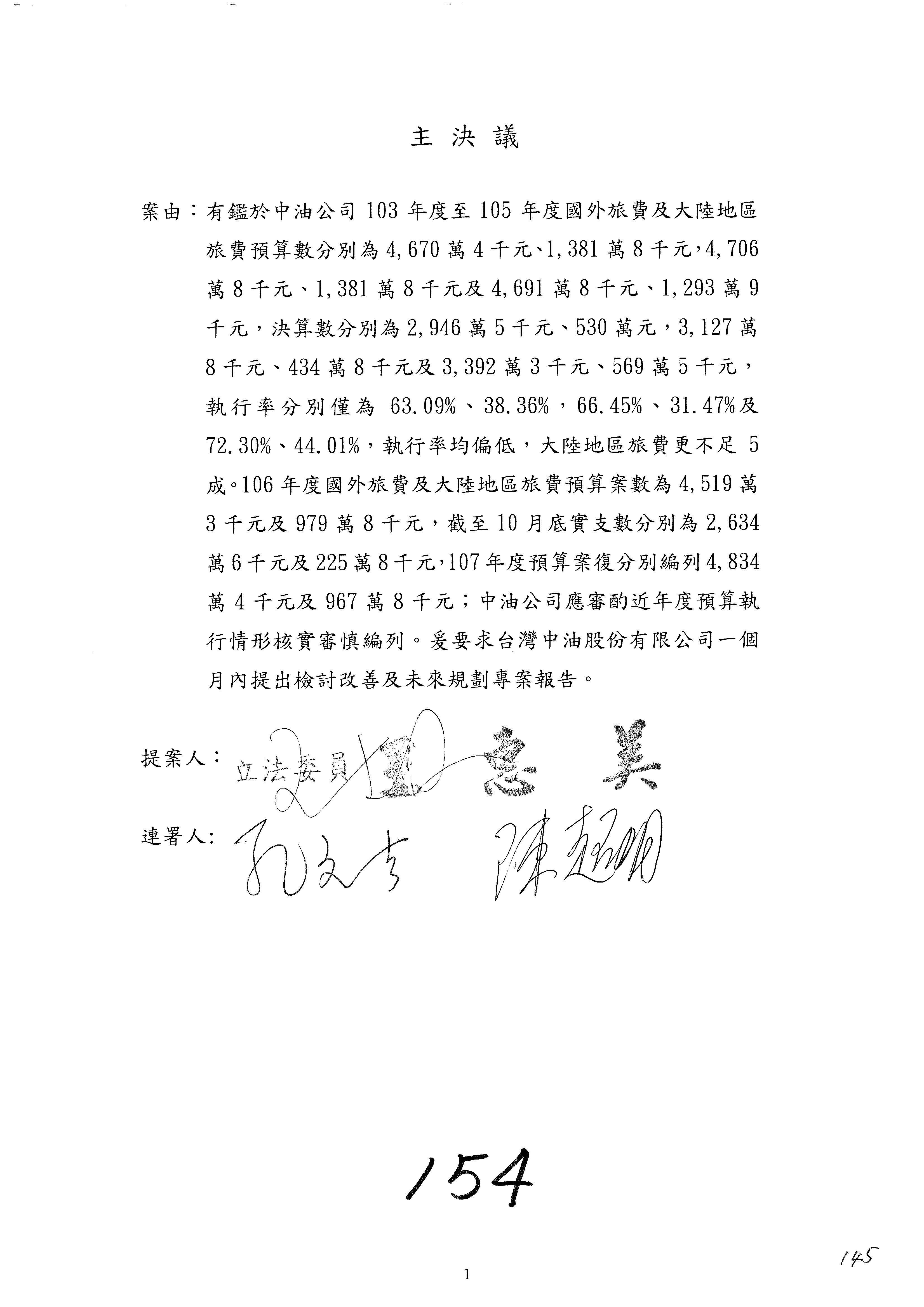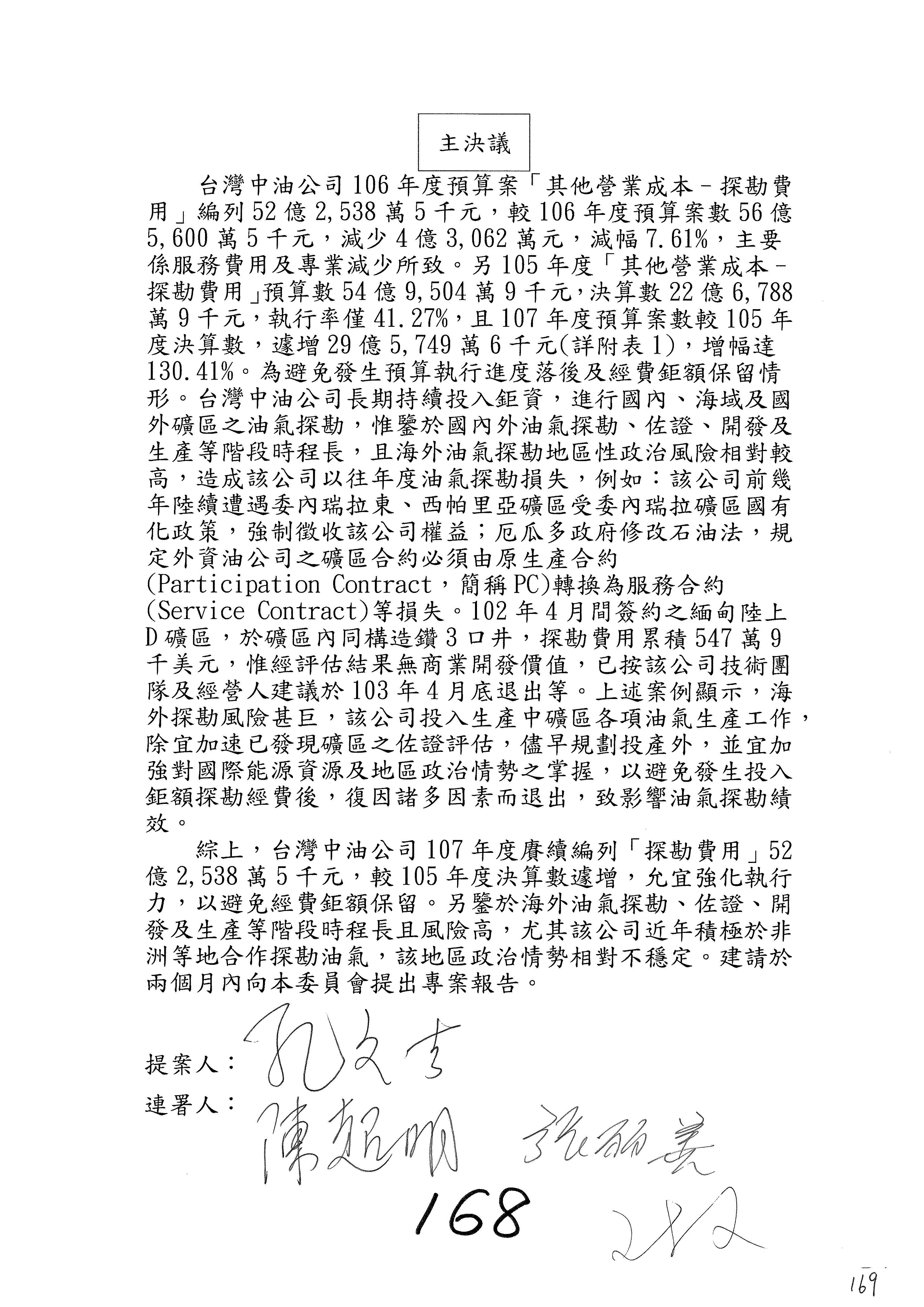 主席:台水公司及中油公司的預算已於11月30日完成詢答,今天和明天要進行審查,審查程序如下:依據預算法第五十條及相關規定,照業務計畫、營業收支、生產成本、轉投資計畫、重大之建設事業、資金運用部分逐項審查。現在請議事人員宣讀審查項目及委員提案,宣讀完畢後進行協商。