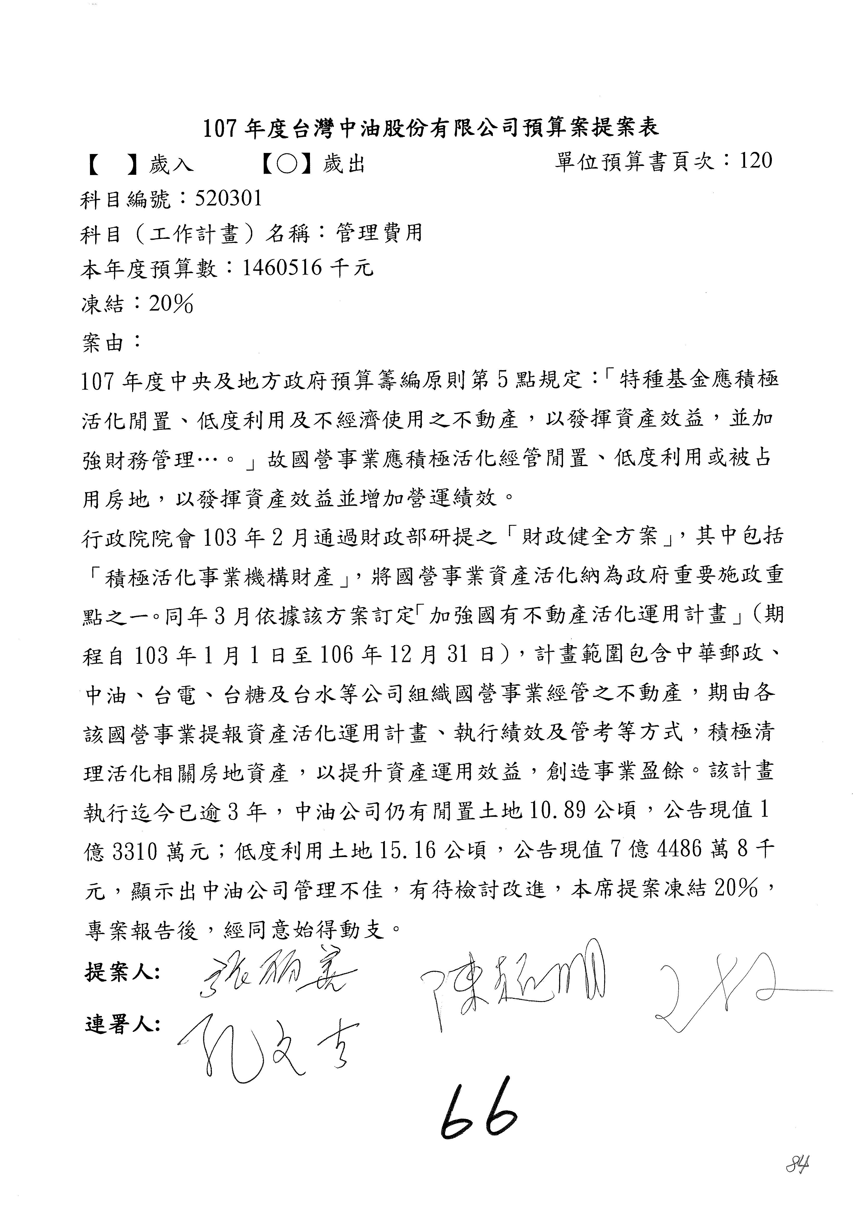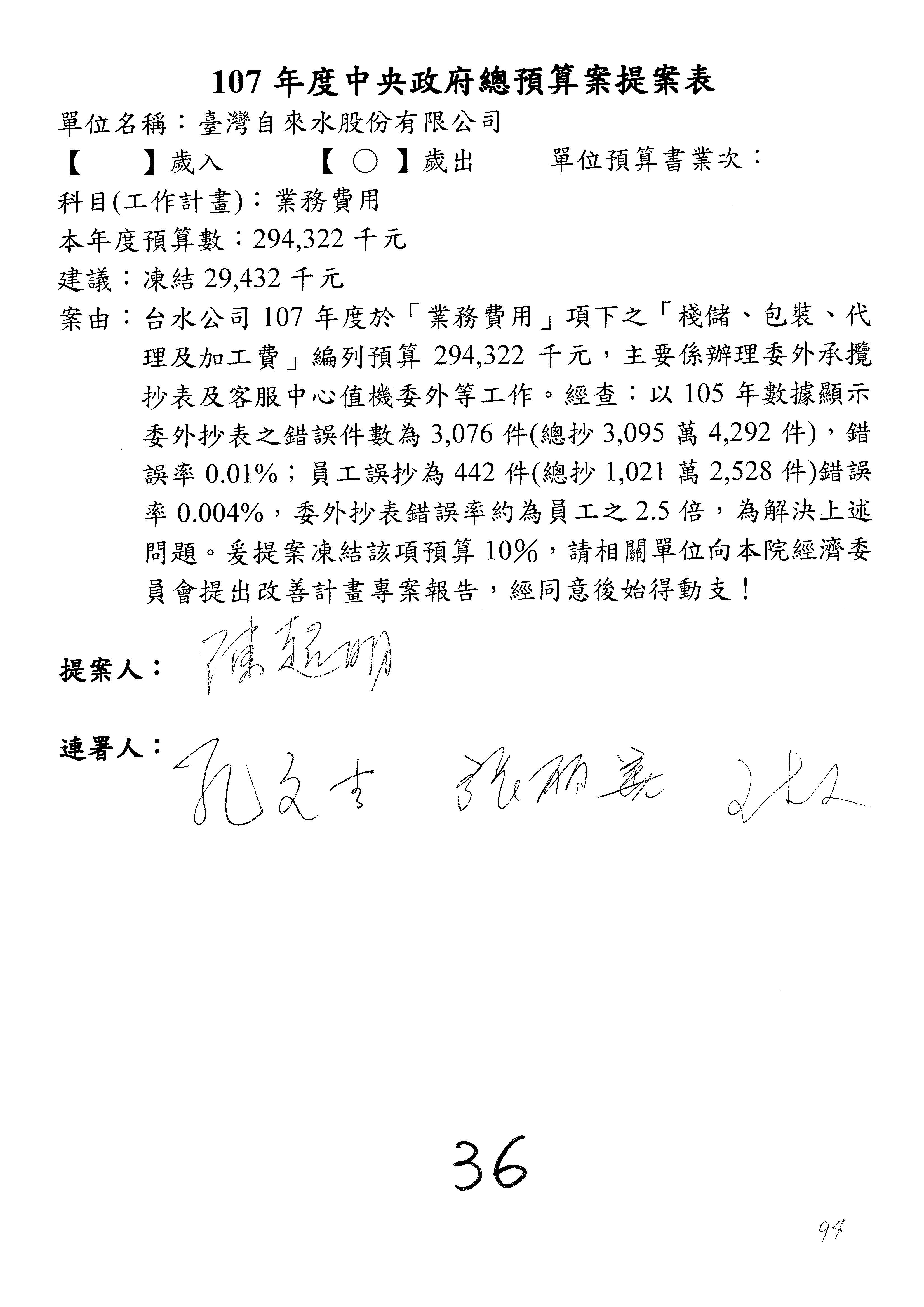 營業總支出部分:第5案,預算照列;第6案至第16案第2項併案處理,處理情形如下─通過服務費用─水電費─動力費減列1,035萬6,000元、通過服務費用─印刷裝訂與廣告費減列200萬元,其餘預算照列;第16案第3項至第19案併案處理,通過材料及用品費凍結5%,提出書面報告後始得動支,另作成決議1案;第20案至第22案併案處理,第20案照案通過,租金與利息減列200萬元;第23案至第33案併案處理,通過營業成本凍結1,000萬元,提出書面報告後始得動支;第34案至第36案併案處理,通過凍結業務費用3,000萬元,提出書面報告後始得動支;第37案,通過凍結管理費用2,000萬元,提出書面報告後始得動支;第38案至第40案併案處理,預算照列;第41案,預算照列。