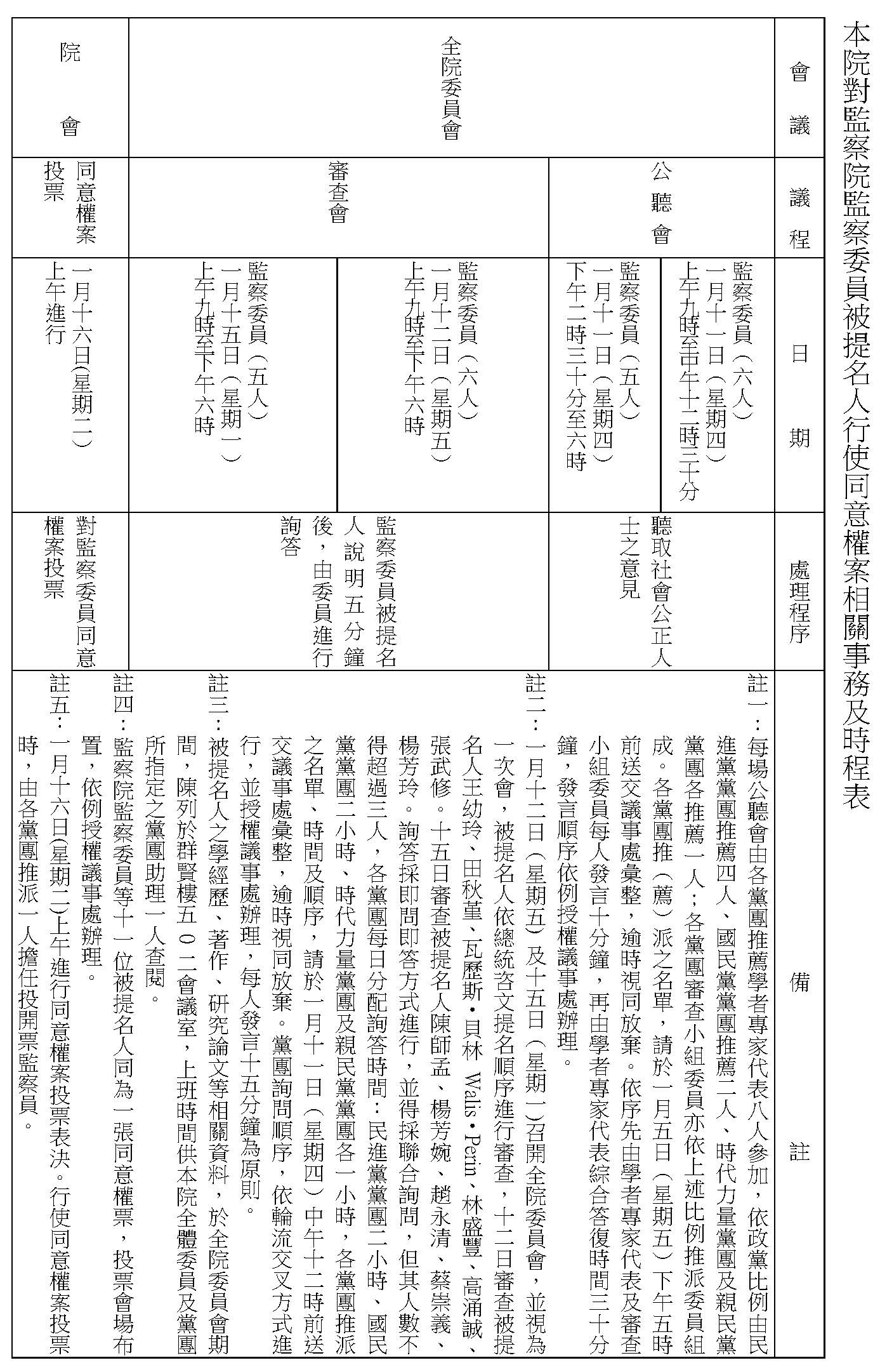 二、1月12日(星期五)及1月15日(星期一)召開全院委員會,並視為一次會,審查監察委員被提名人,詢答採即問即答方式進行,並得採聯合詢問,但其人數不得超過3人,各黨團每日分配詢答時間:民進黨黨團2小時、國民黨黨團2小時、時代力量黨團及親民黨黨團各1小時。各黨團推派之名單、時間及順序,請於1月11日(星期四)中午12時前送交議事處彙整,逾時視同放棄。審查完畢後,於1月16日(星期二)院會上午進行監察委員同意權案投票表決。(同意權相關事務及時程如附件)