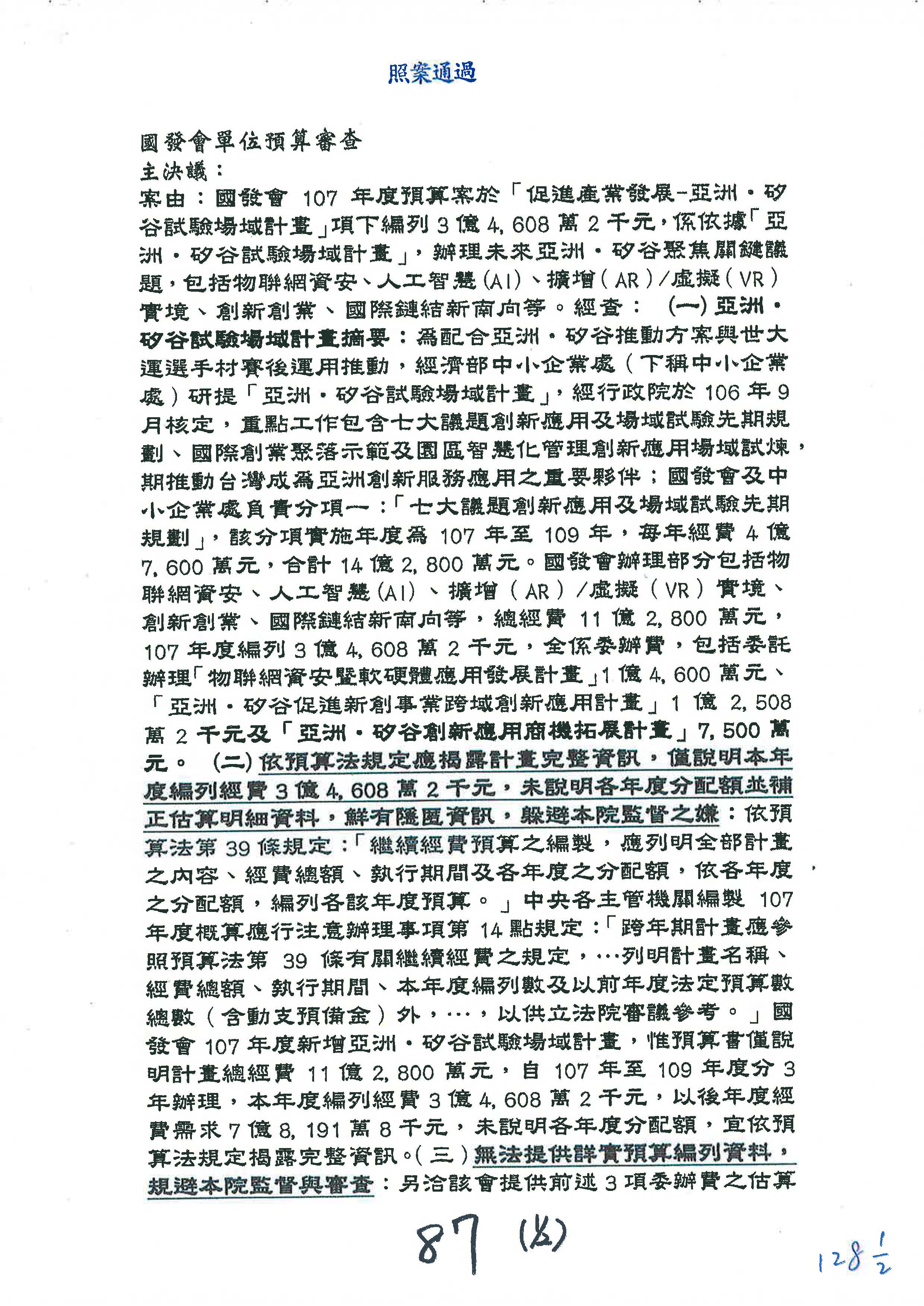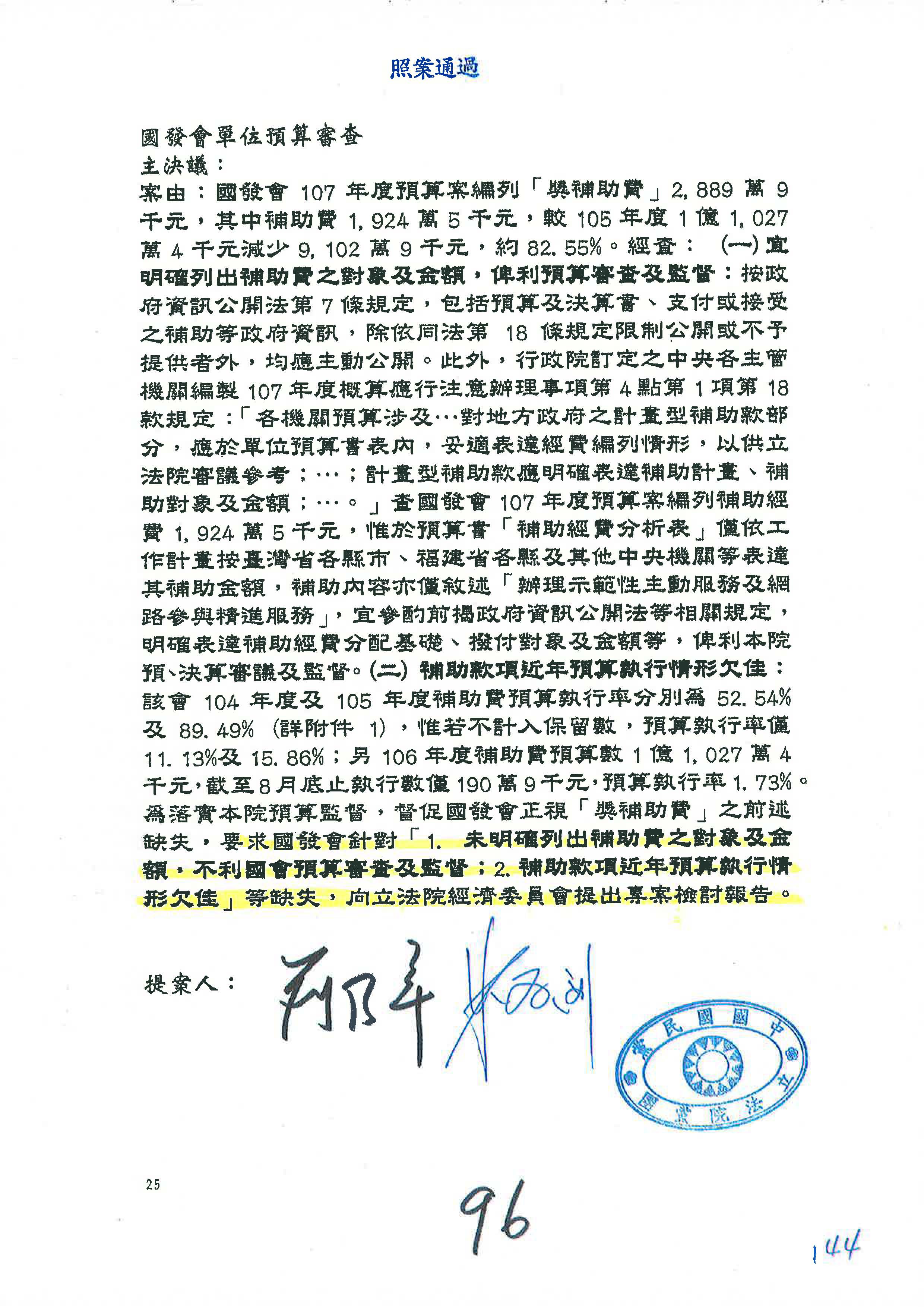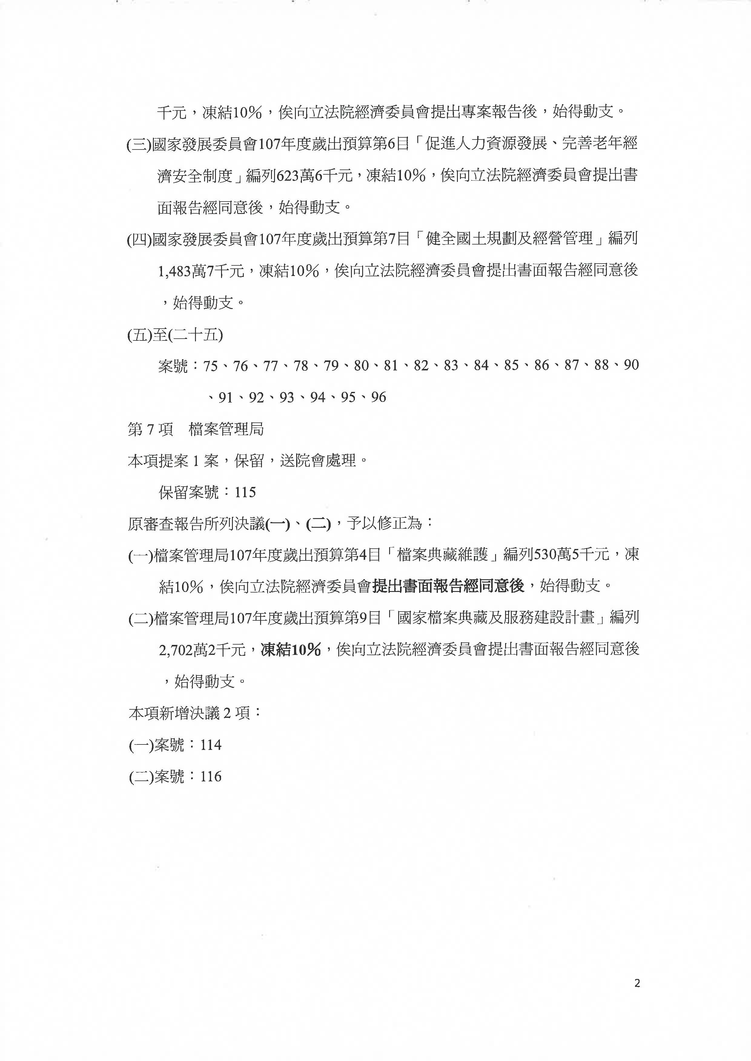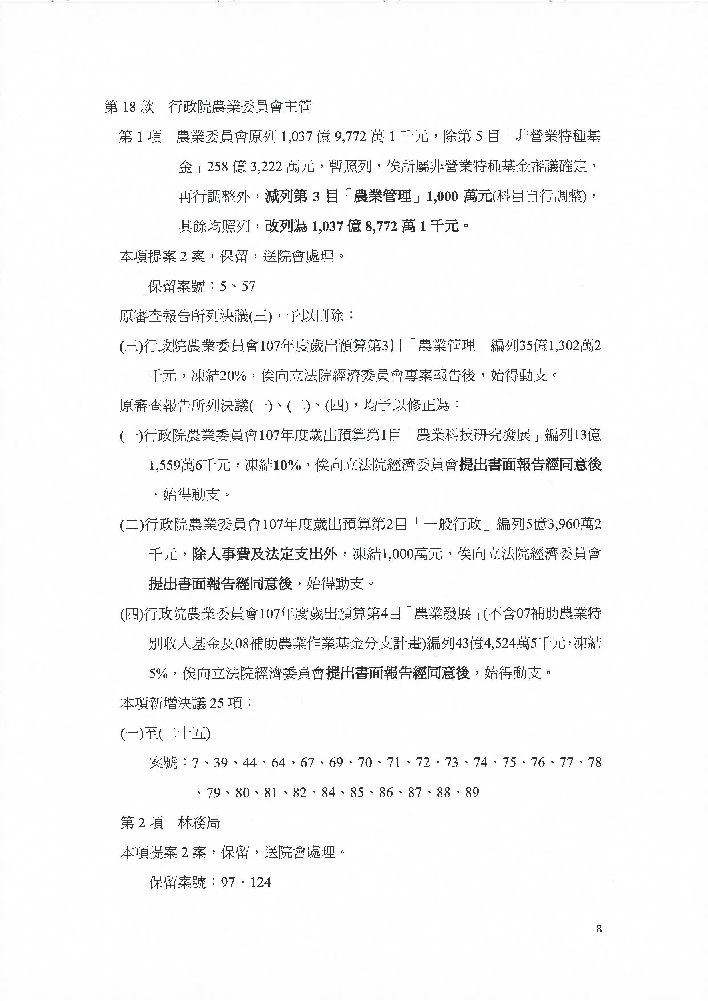 主席:報告院會,財政委員會審查部分除保留部分外,其餘均照協商結論通過。