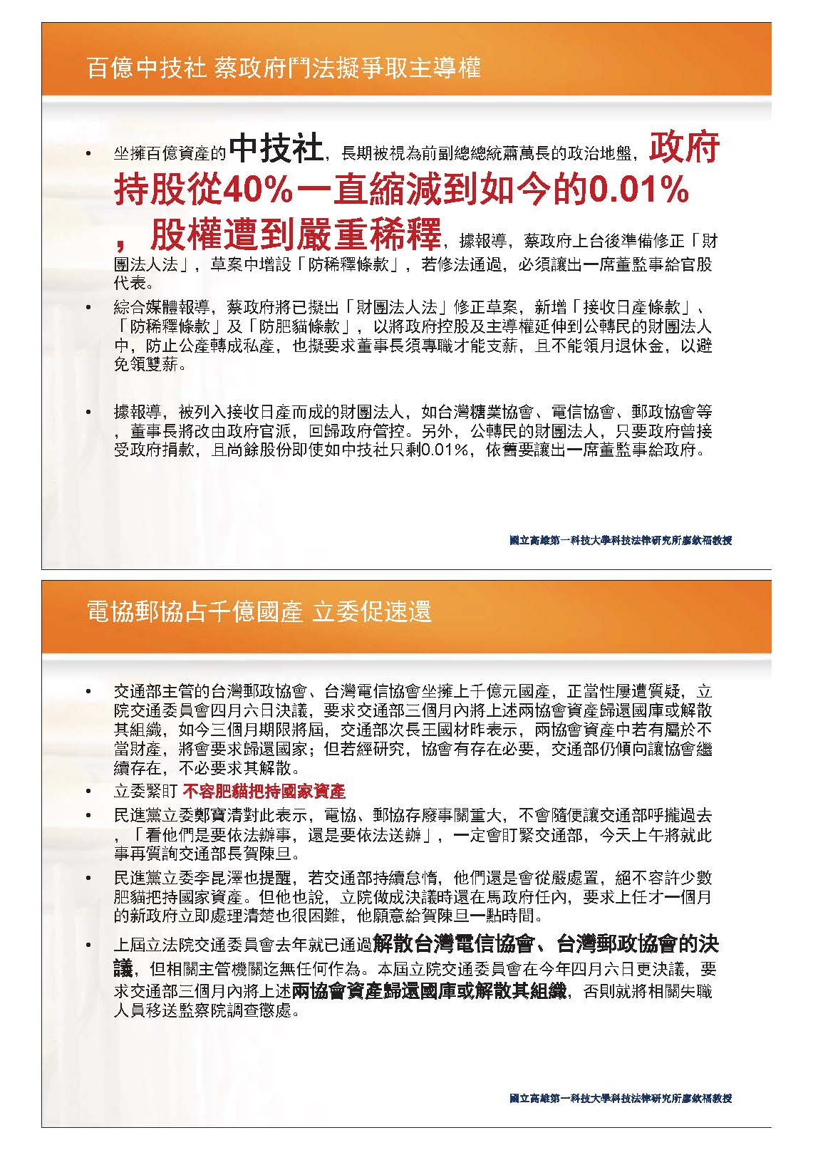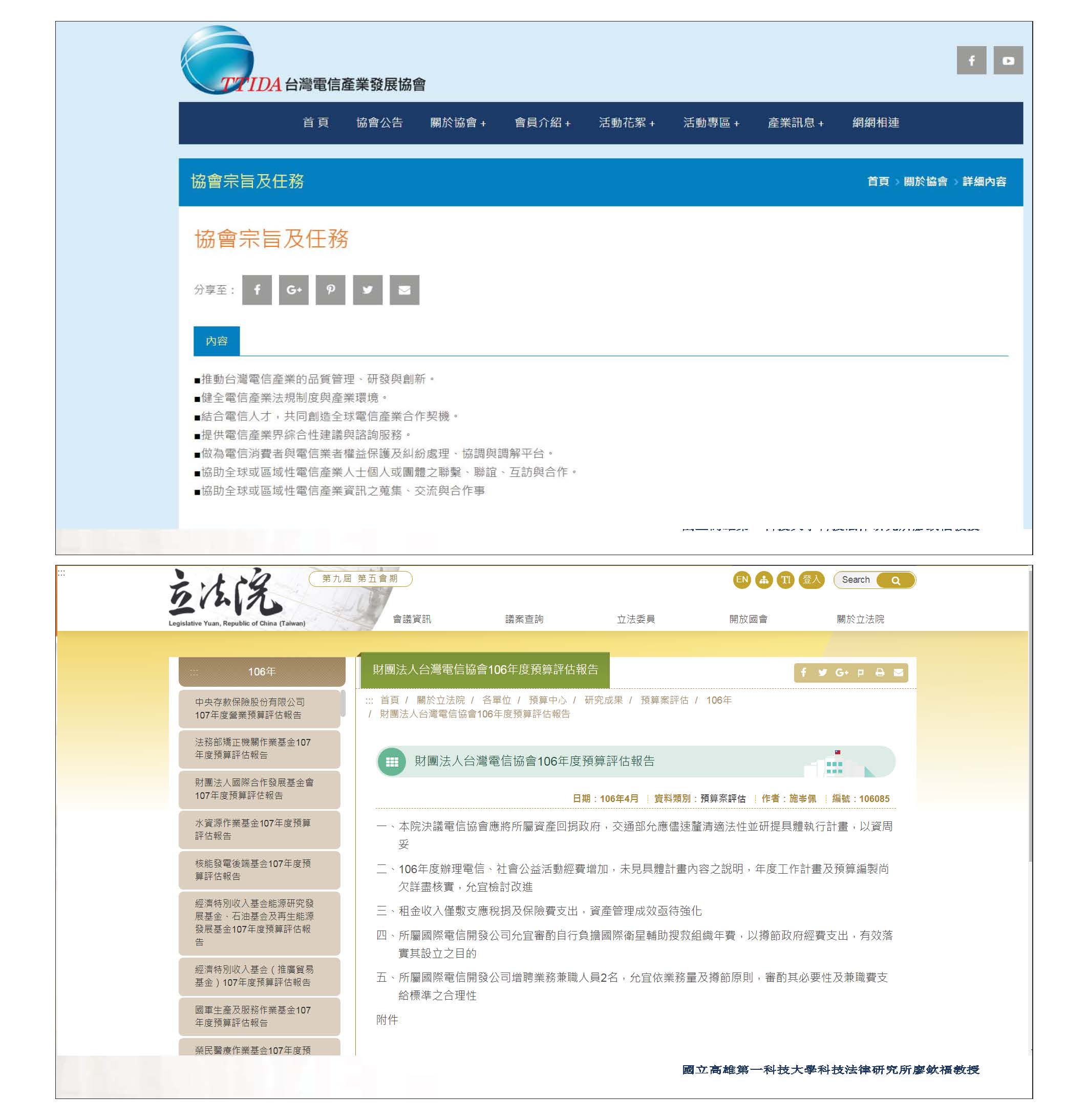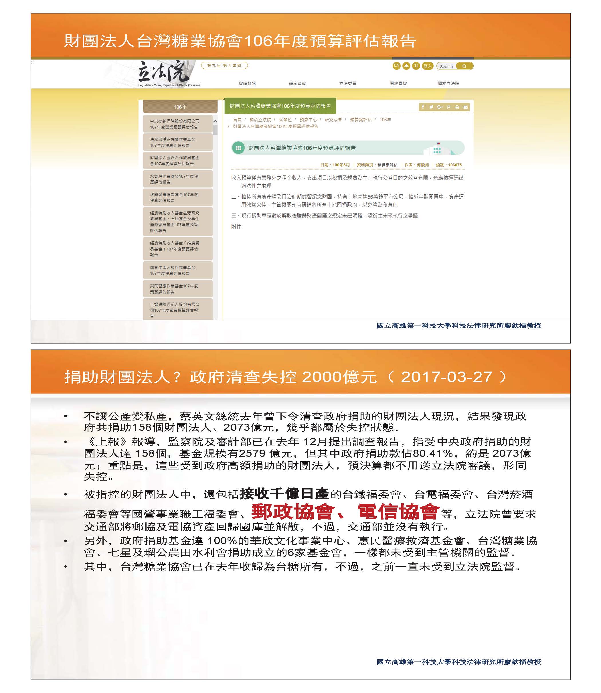 今天我主要是想要談公設財團法人,這部分也有學者提出其經費是來自於政府單位的捐助,當然有些部分他們可能不用受到公務員相關法規的限制,但過去也常被人家批評,因為可能在預算上受到的監督不夠,也會被批評是酬庸的養老院、迴避政府監督手套等等。事實上立法院在106年也針對糖協提出預算評估報告,這只是其中一項要跟各位談的點。而到目前為止,經過清查發現,政府總共捐助158個財團法人,金額高達2,000多億元,但就有人討論事實上這部分並沒有受到一定的控制,目前討論比較多的比如郵政協會、電信協會等等,另外一個案例就是各位也很熟悉的中技社,政府的持股從過去的40%一直稀釋到現在的0.01%,被質疑股權遭到嚴重稀釋,而所謂的電協、郵協等底下的財產,就國有財產的部分也非常非常多,上次立法院也提出應該解散這兩個單位,並將其財產回歸到國家,因為它也是民國四十幾年接收日治時期的兩個協會的資產。我看到的新聞是目前為止交通部針對這個部分還是一直擺著,沒有做後續的處理;另外還有一個類似單位是「台灣電信產業發展協會」,簡報上有提到它的協會宗旨,立法院的預算評估報告中,也有針對這一塊提出一些討論。