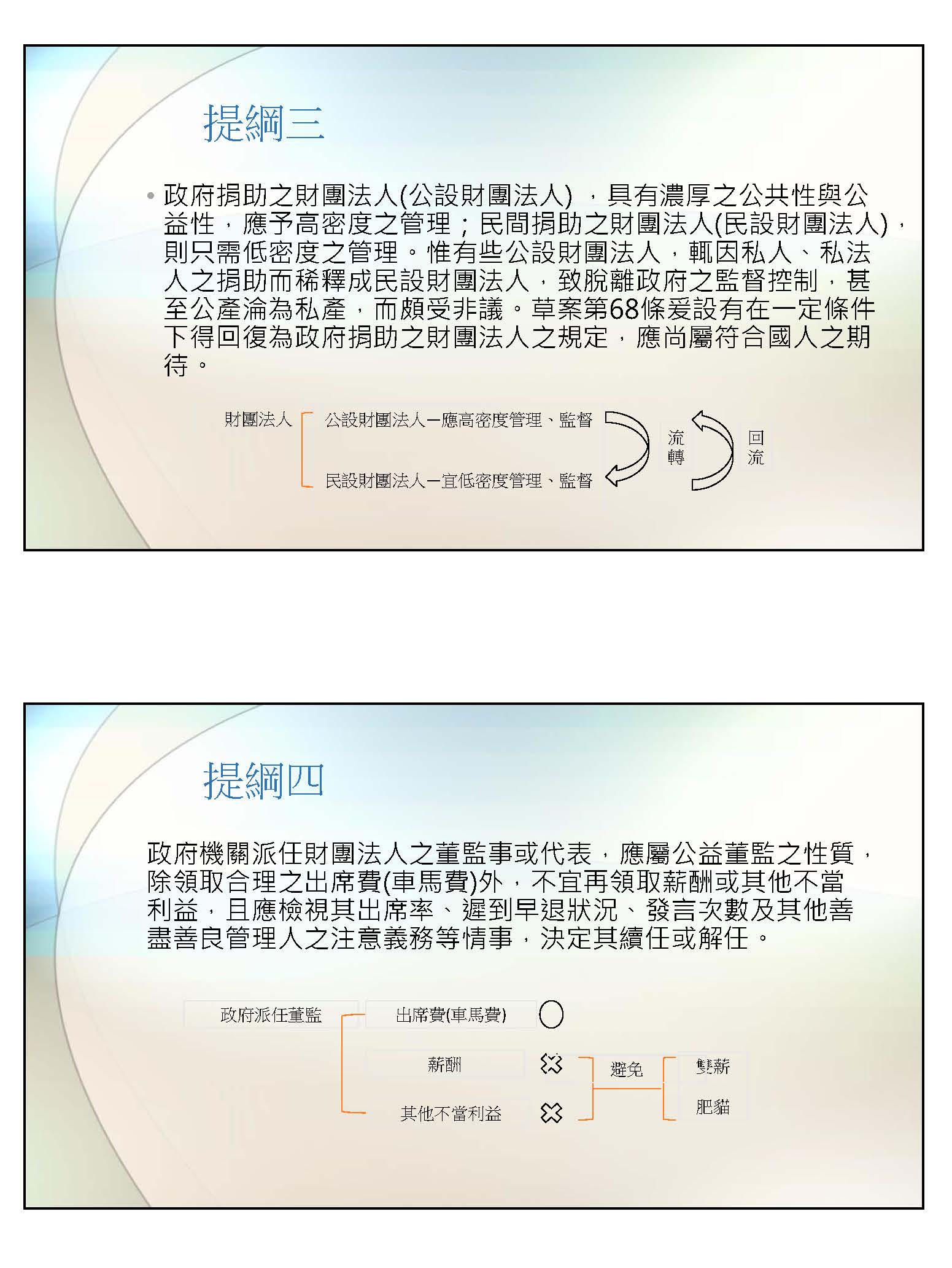 提綱三是有關政府捐助和民間捐助之財團法人的問題,大家事實上也肯定對於公設(即政府捐助)的財團法人應該進行密度比較高的監管,對於民間設立的財團法人,則基於私法自治的基本態度,應該做比較低密度的管理。這是沒錯的,但是公設財團法人往往因私人或私法人的捐助,而使政府股權所占比例越來越低,甚至淪為私人設立的財團法人,在這種情況之下,一則可以避免高度監督,再則就會變成公產私用,這是被大家非難最多的地方。為了儘量避免這些政府當時基於一定公共利益所成立的財團法人淪為私人利用的工具,在它流過去之後,應該設法讓它有回流或回復的機制。我想這個機制也設了一些條件,並不是全部都回復,因為有些也會因時空轉變而必須做一些轉型,所以應該是在一定條件之下去做回復的功能。