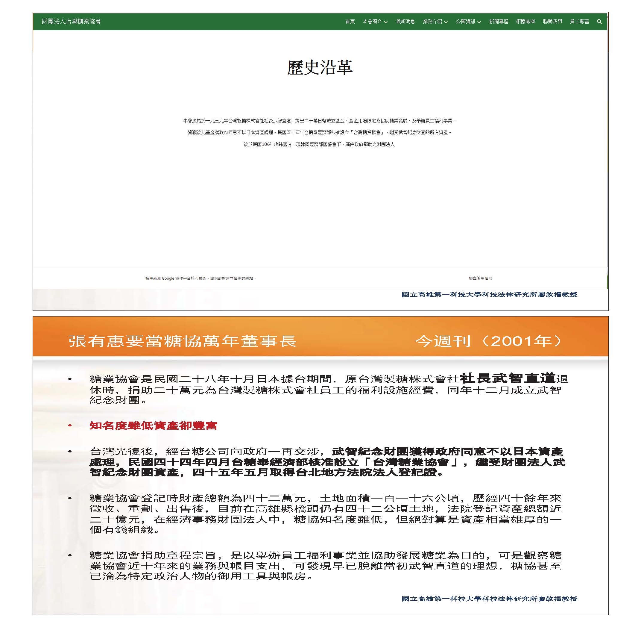 有個財團法人叫做「台灣糖業協會」,這是它的網頁,如果各位點進去可以看到它的沿革,它是一九三九年日治時期當時所成立的,就這麼短短一句話。我們再將時間倒回2001年看一則新聞,各位滿熟悉的,當時的糖協是日本原台灣製糖株式會社社長武智直道捐贈的,民國44年當時政府同意不以日本資產處理,所以既受這樣一個資產而成立這個財團法人。不過這件事後來引發很多爭議,各位也很熟悉,因為在民國89年,當時的張有惠先生把董事跟董事長任命權由過去的台糖改成糖協董事會本身。當時的經濟部認為此舉可能圖利特定人士,不過這一份名單事實上也沒有再改變,後來糖協就變成一個私人機構,但是針對外界的批評,他們也認為修改捐助章程沒有抵觸法律,所有的程序也都符合法律規定。