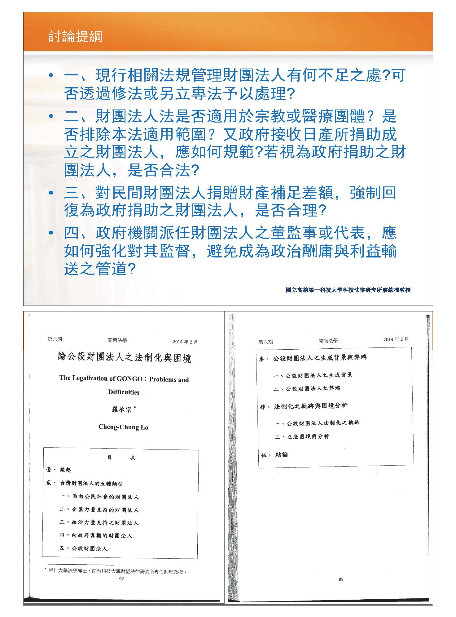 以上是我舉的簡單的例子,接下來跟各位談今天的4個提綱。第一個要提到的是現行相關法規管理財團法人有何不足之處。我們知道法律系學生一開始讀民法時會讀到財團法人,只有短短幾個條文,當時學生在讀時不覺得它很重要,但是這一塊事實上很多規範不足,我覺得光有民法是不夠的,應訂立專法,對此我想大家應該沒有意見。