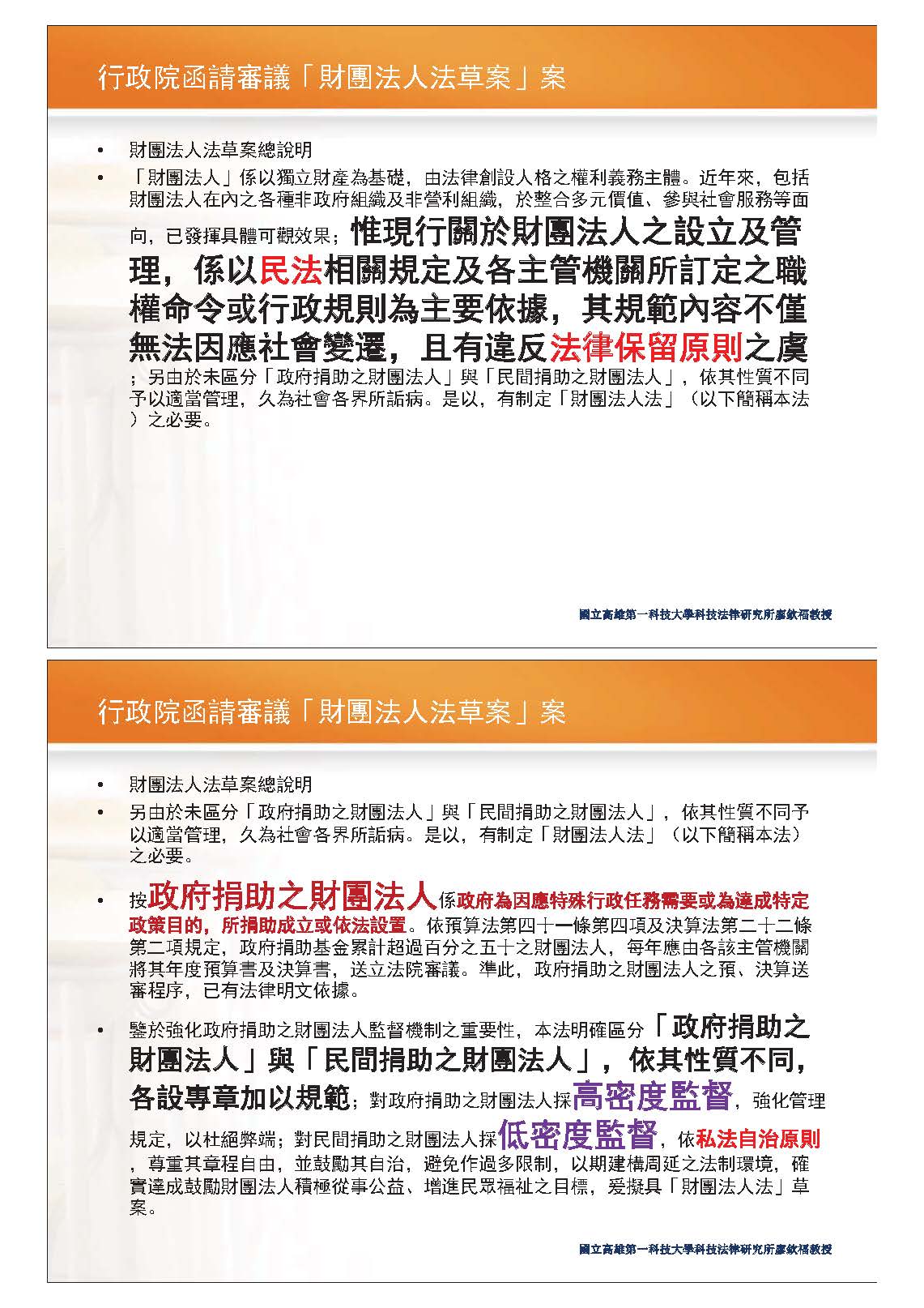 接下來,我主要針對兩個法案版本討論,第一個是時代力量的版本,他們也認為財團法人的設置在民法的規定非常不夠,過去大概都是主管機關用職權命令,事實上可能不夠而且違背法律保留;另外,行政院版大概也是一樣,我覺得這部分應該要符合法律保留的規定。另外,我們一直談到政府捐助之財團法人跟民間捐助之財團法人,我覺得應該將它們分開,一個應該是高密度的監督,因為錢來自於政府,如果是民間的部分,基於私法自治,則應該做比較低密度的監督,這個部分我也同意。