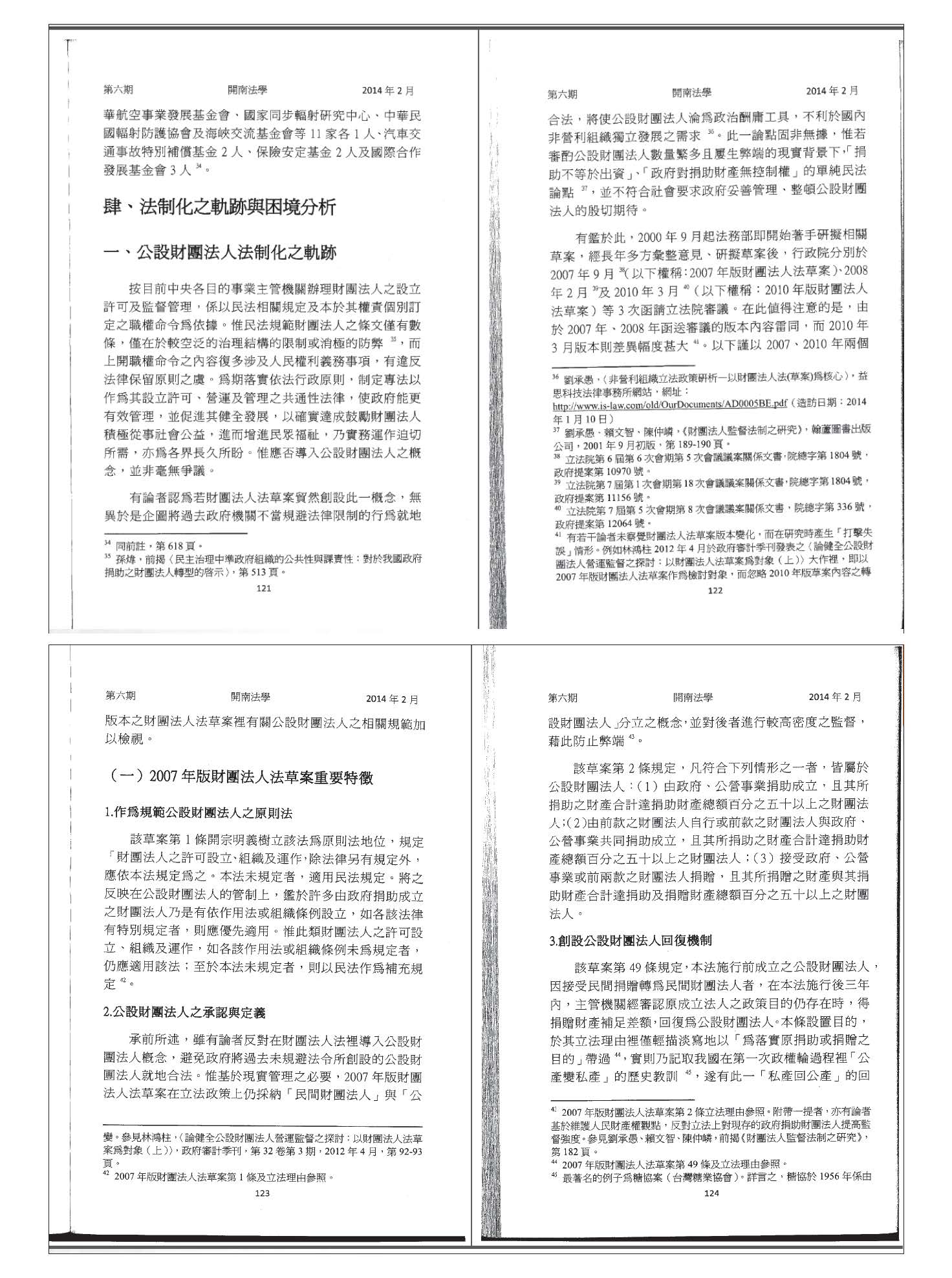 另外,有關財團法人法這部法律,目前的規範內容應該可以說燦然大備。首先,比較特別的地方就是把民間捐助的財產法人與政府捐助的財團法人兩者加以分開,這個可以說是非常必要的。因為民間捐助的財團法人都是一些熱心、有關公益或是要推動一些具有公共利益目的的事務,以民間的力量來進行投入,如果太過於高密度的管制,事實上並不恰當。但是政府捐助的財團法人則是政府為了某些目的的實現,以財團法人的形態去成立一個團體,以實現某些政府不方便直接出面的事情。既然是政府捐助的財團法人,其財產當然屬於政府的預算等等,當然也必須要接受高密度的監督。同時,其公共性必須要維持,而且要能夠真正達到政府當時設置這個財團法人的目的。